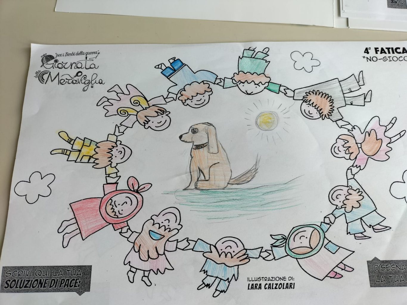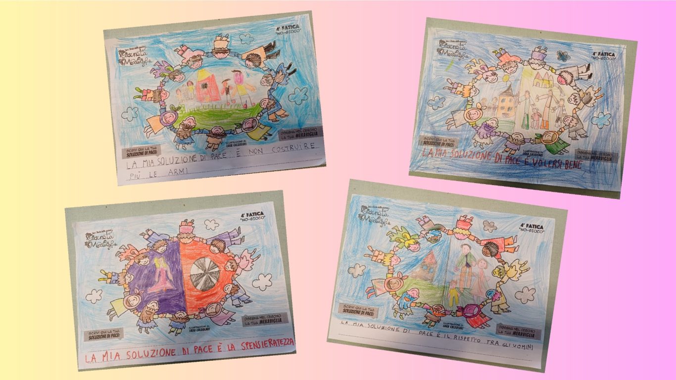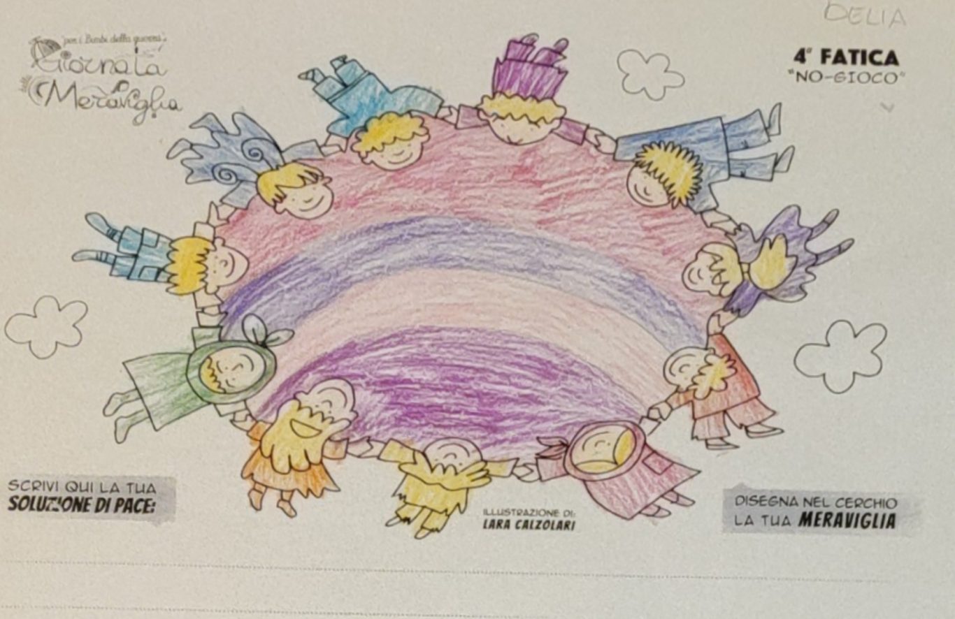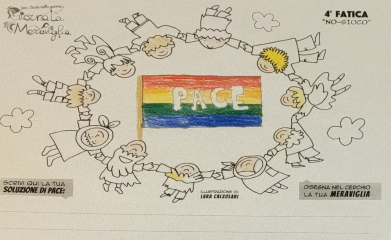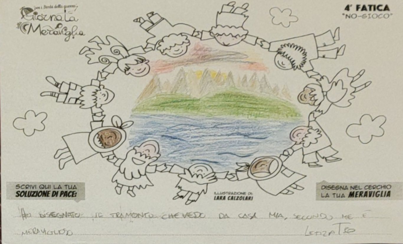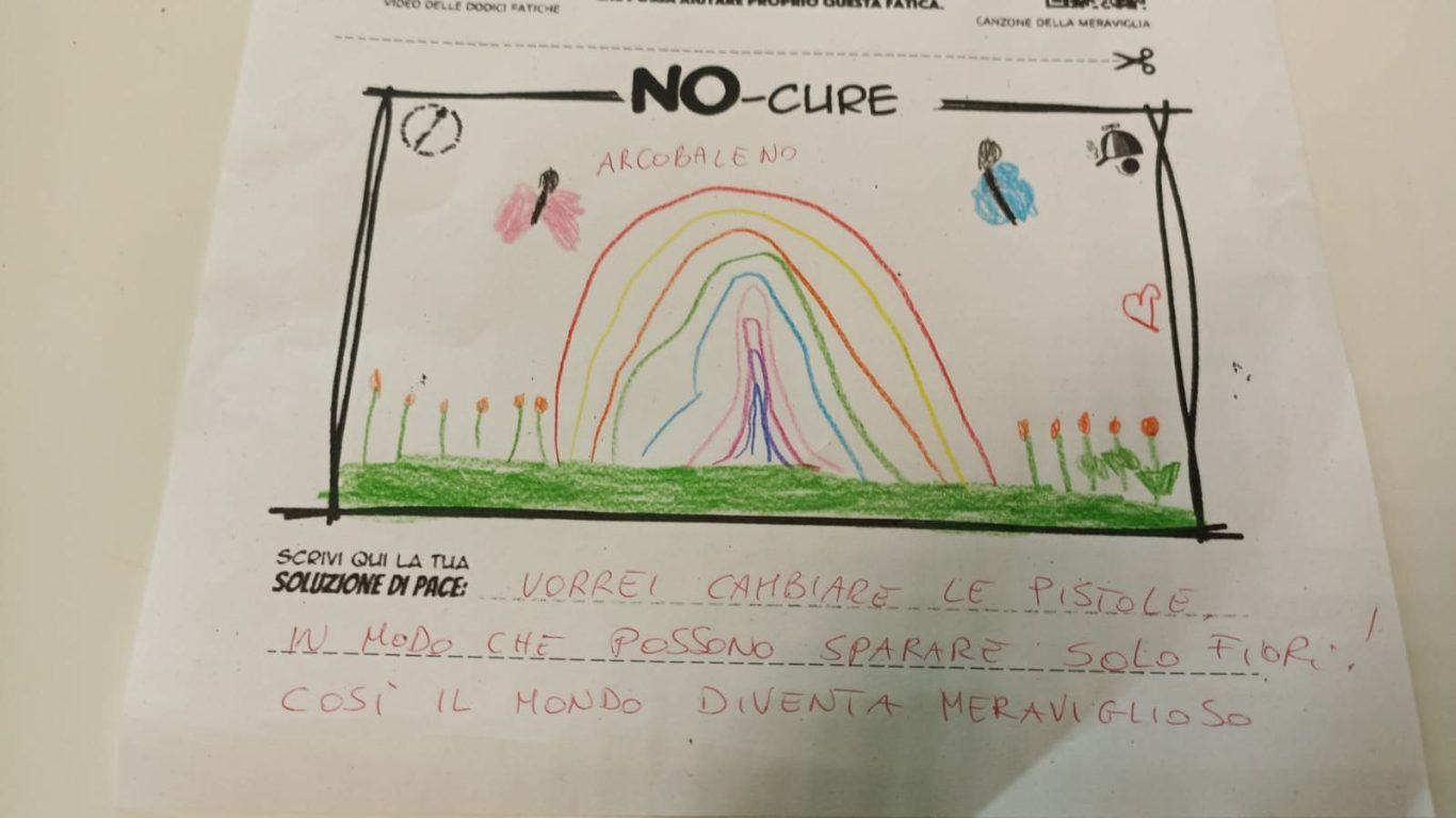 L’opera di sensibilizzazione si si esprime concretamente con la creazione di un DISEGNO DELLA MERAVIGLIA che andrà ad aiutare una delle 12 fatiche. Allo stesso modo chiederemo a tutti i partecipanti di andare a scrivere una “Soluzione di Pace” che possa aiutare anch’essa una delle 12 fatiche dei Bambini della guerra.