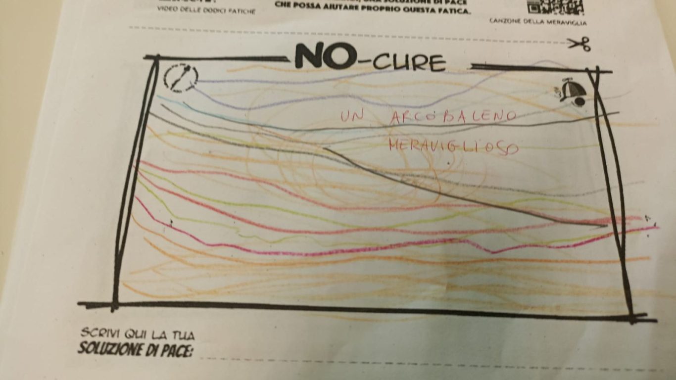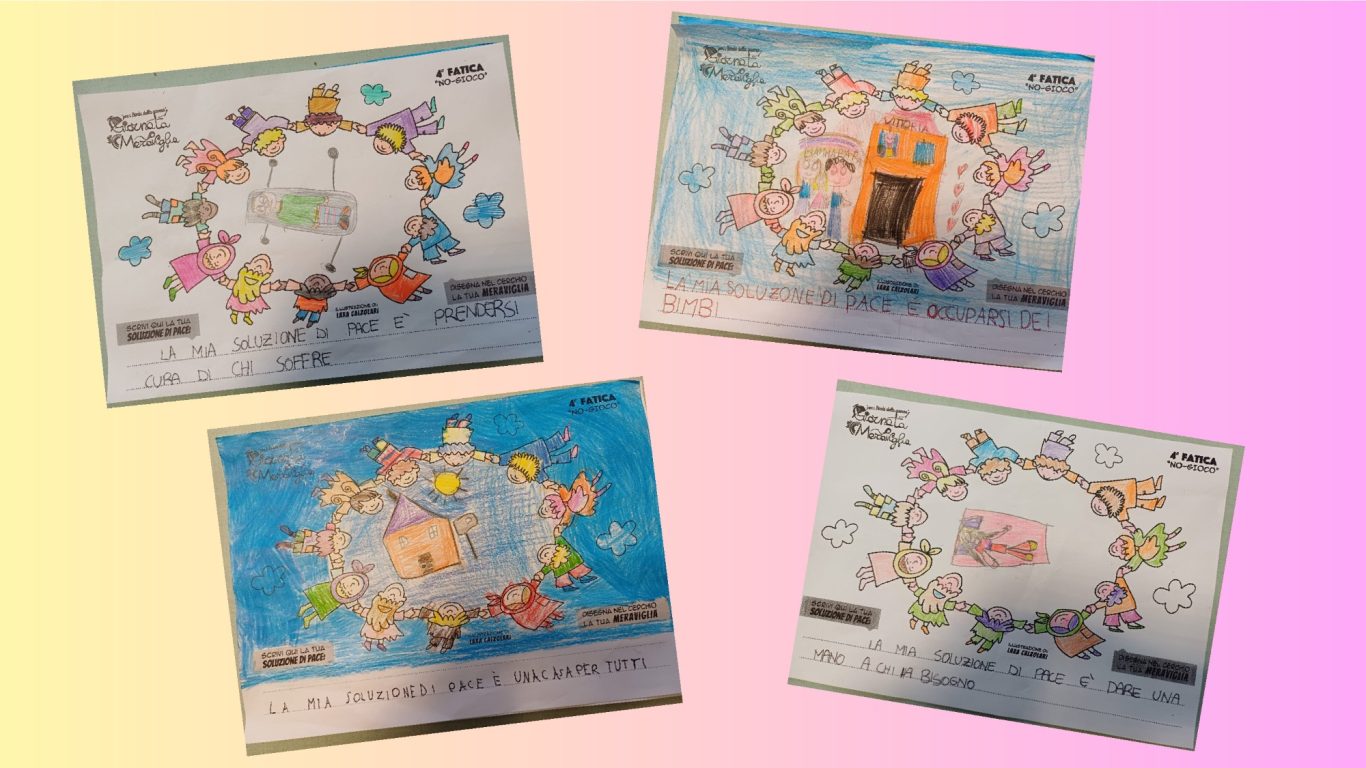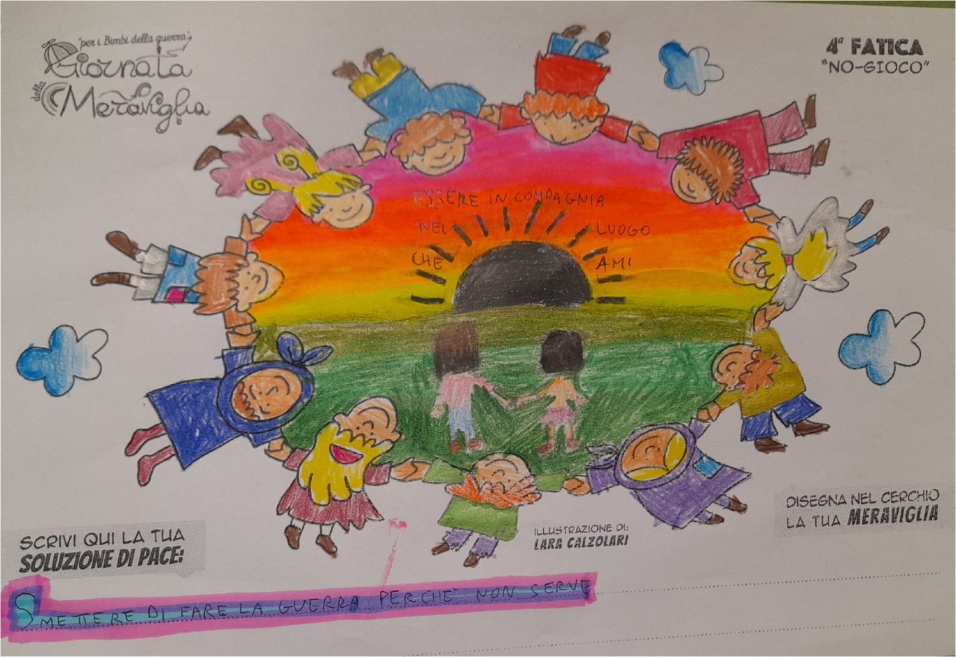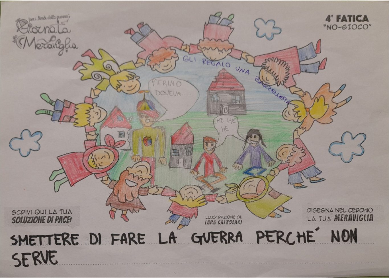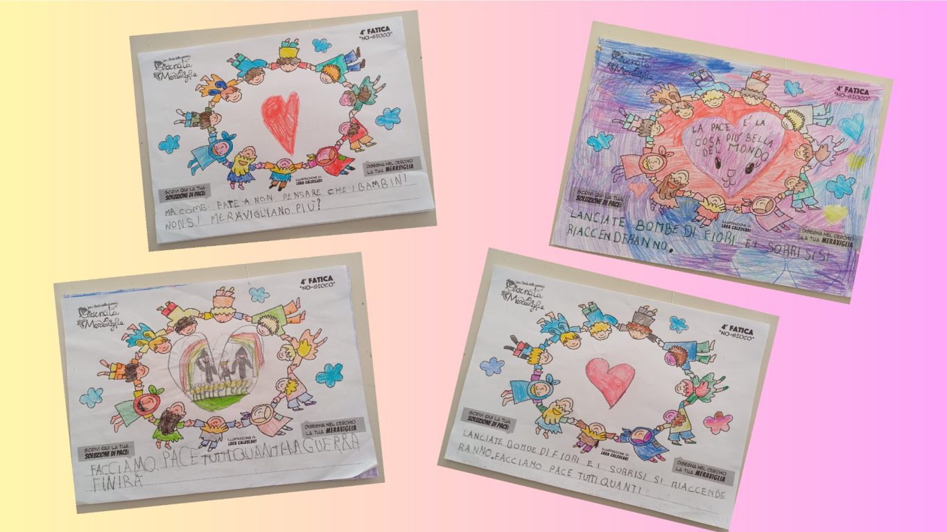 L’opera di sensibilizzazione si si esprime concretamente con la creazione di un DISEGNO DELLA MERAVIGLIA che andrà ad aiutare una delle 12 fatiche. Allo stesso modo chiederemo a tutti i partecipanti di andare a scrivere una “Soluzione di Pace” che possa aiutare anch’essa una delle 12 fatiche dei Bambini della guerra.