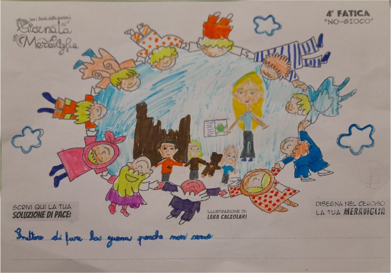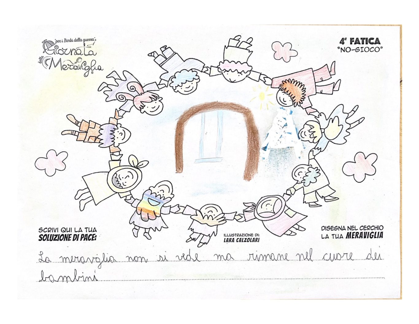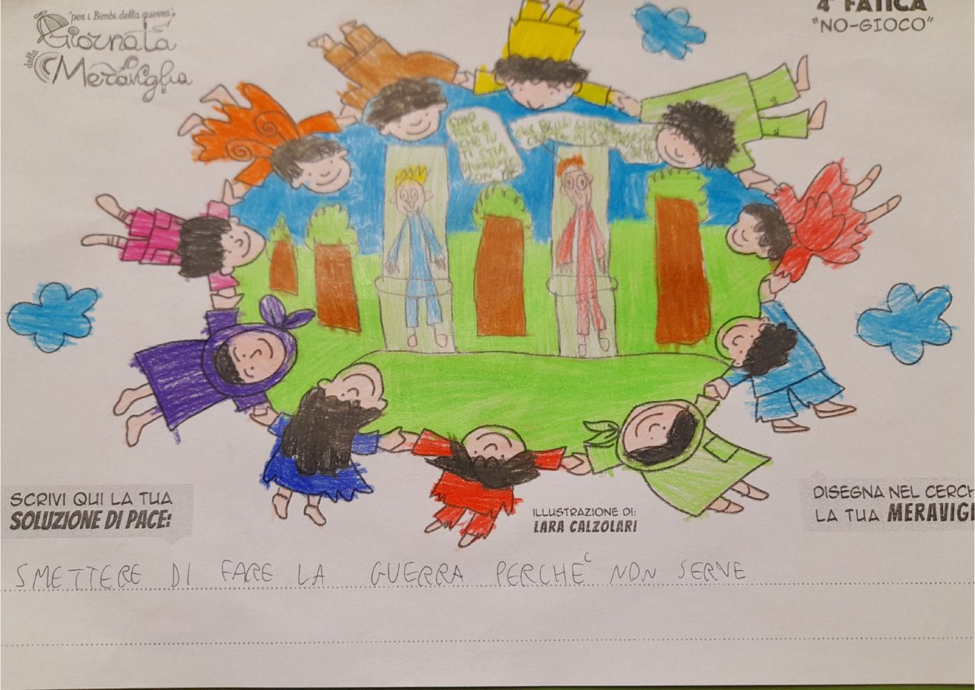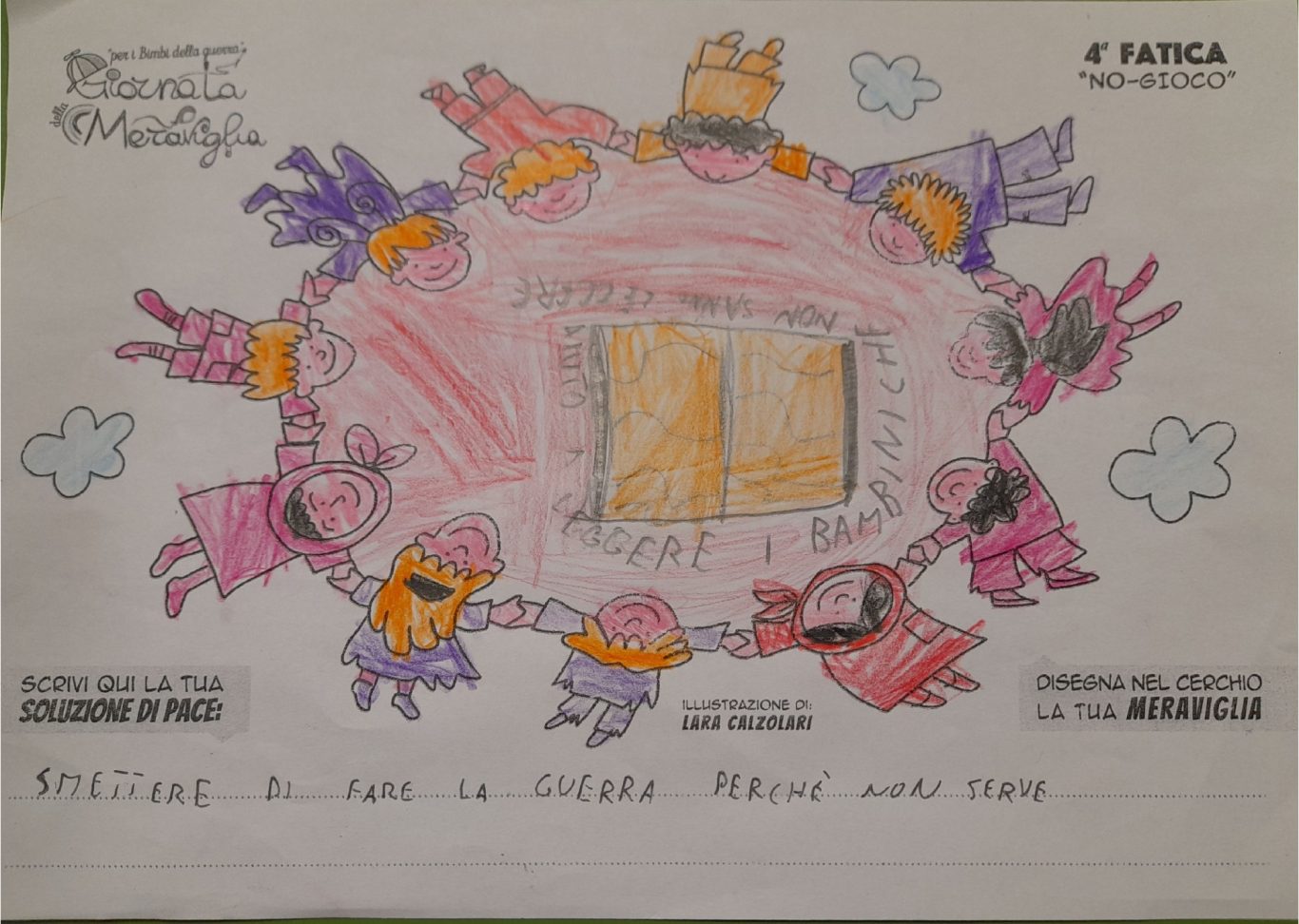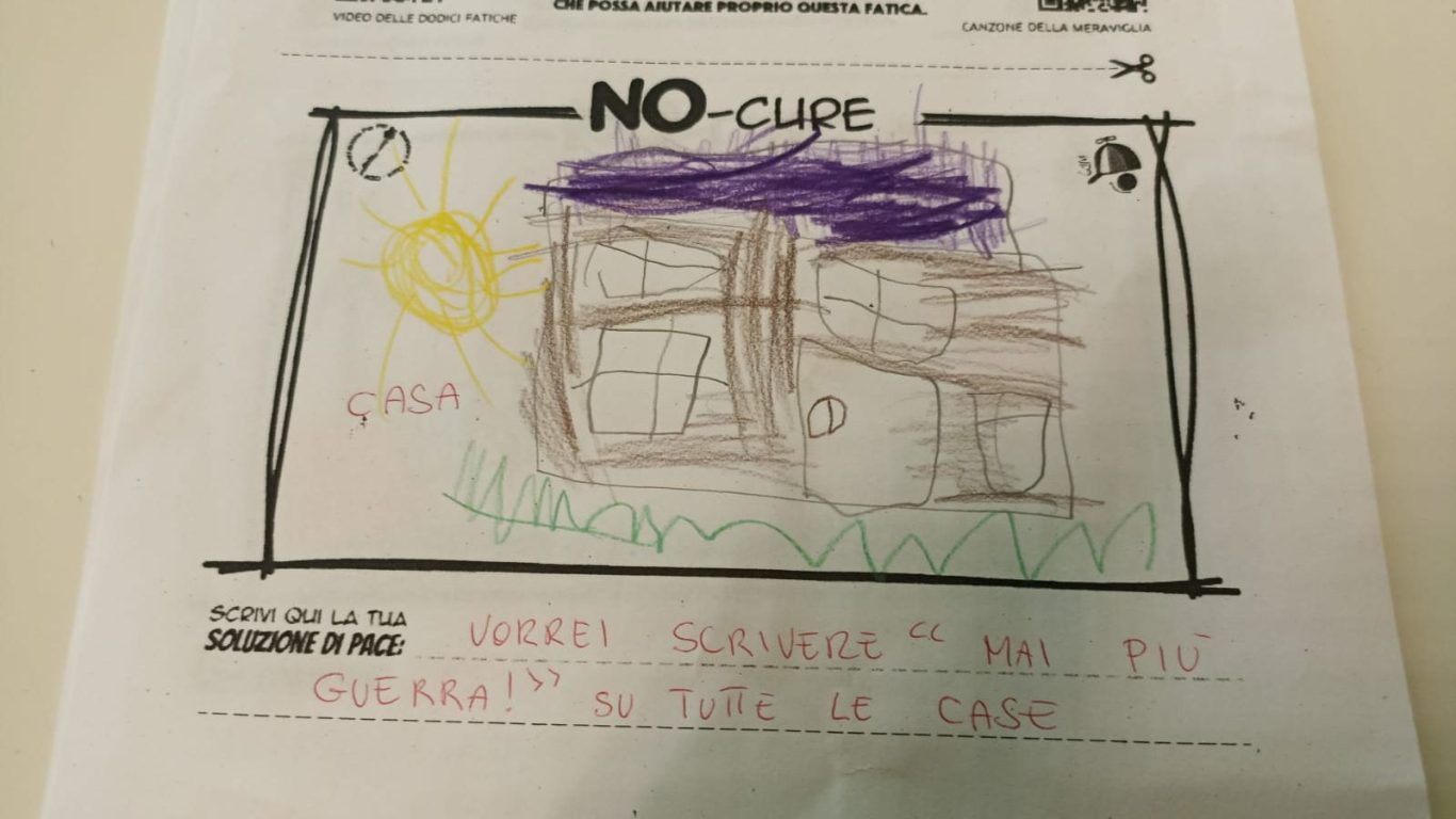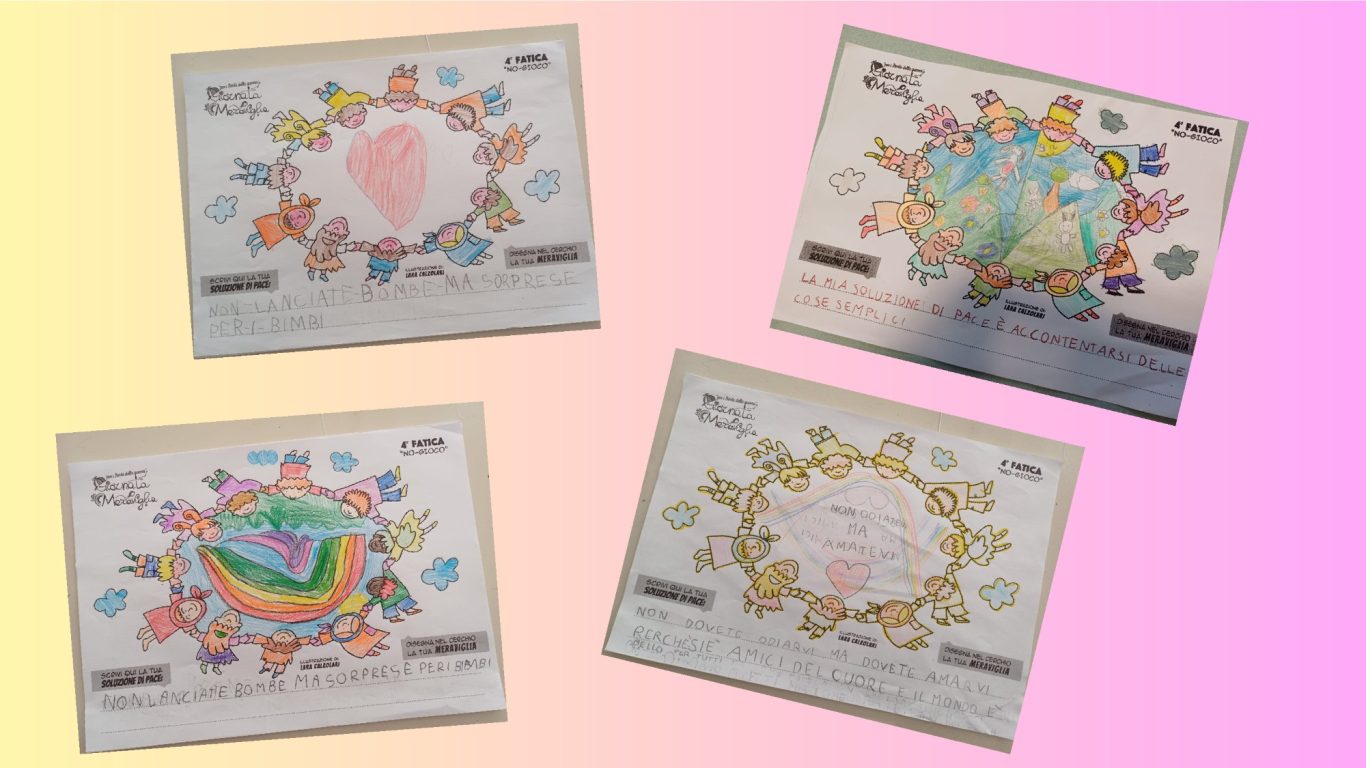 L’opera di sensibilizzazione si si esprime concretamente con la creazione di un DISEGNO DELLA MERAVIGLIA che andrà ad aiutare una delle 12 fatiche. Allo stesso modo chiederemo a tutti i partecipanti di andare a scrivere una “Soluzione di Pace” che possa aiutare anch’essa una delle 12 fatiche dei Bambini della guerra.