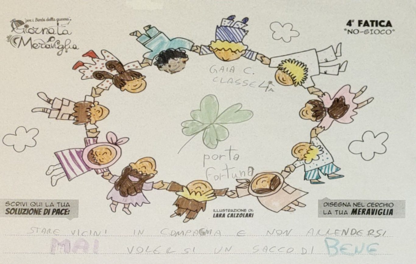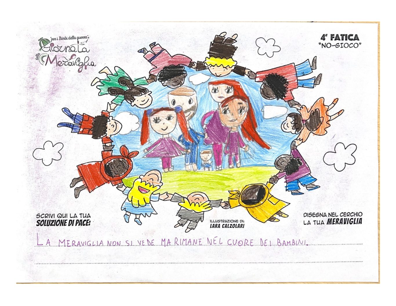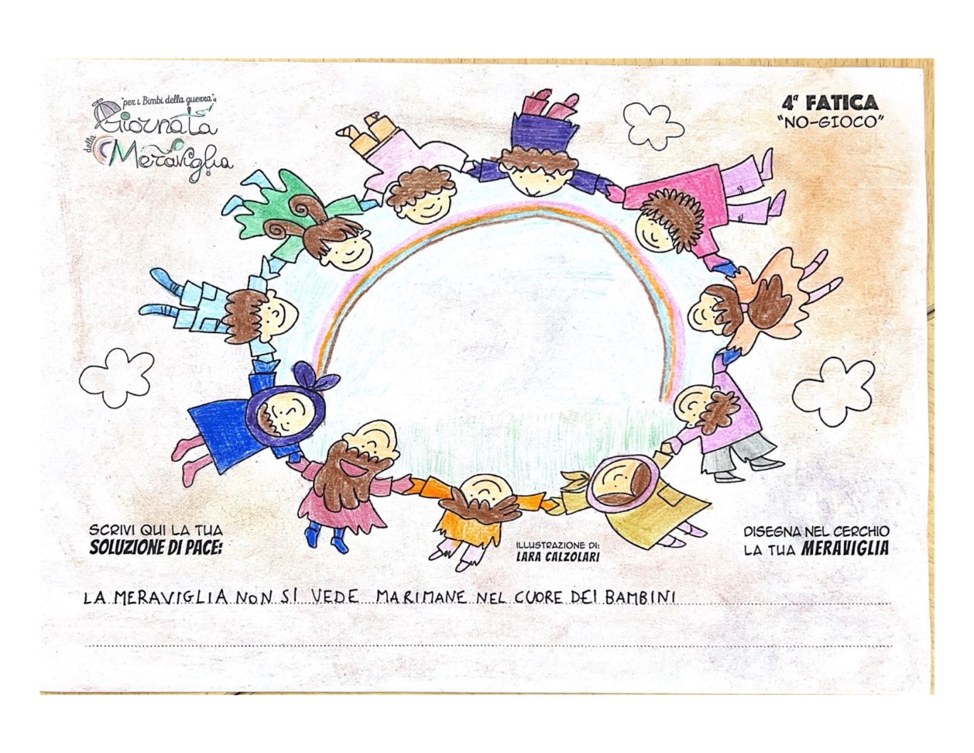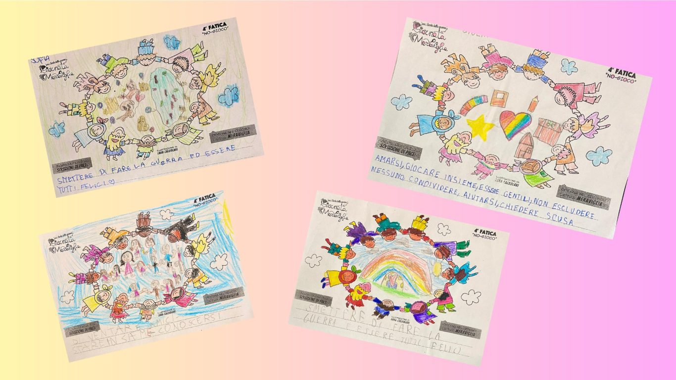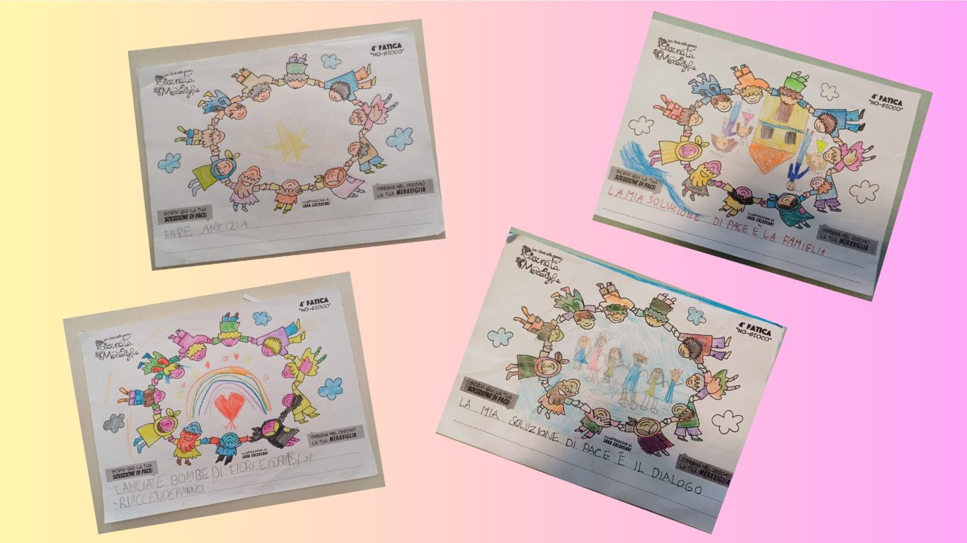 L’opera di sensibilizzazione si si esprime concretamente con la creazione di un DISEGNO DELLA MERAVIGLIA che andrà ad aiutare una delle 12 fatiche. Allo stesso modo chiederemo a tutti i partecipanti di andare a scrivere una “Soluzione di Pace” che possa aiutare anch’essa una delle 12 fatiche dei Bambini della guerra.