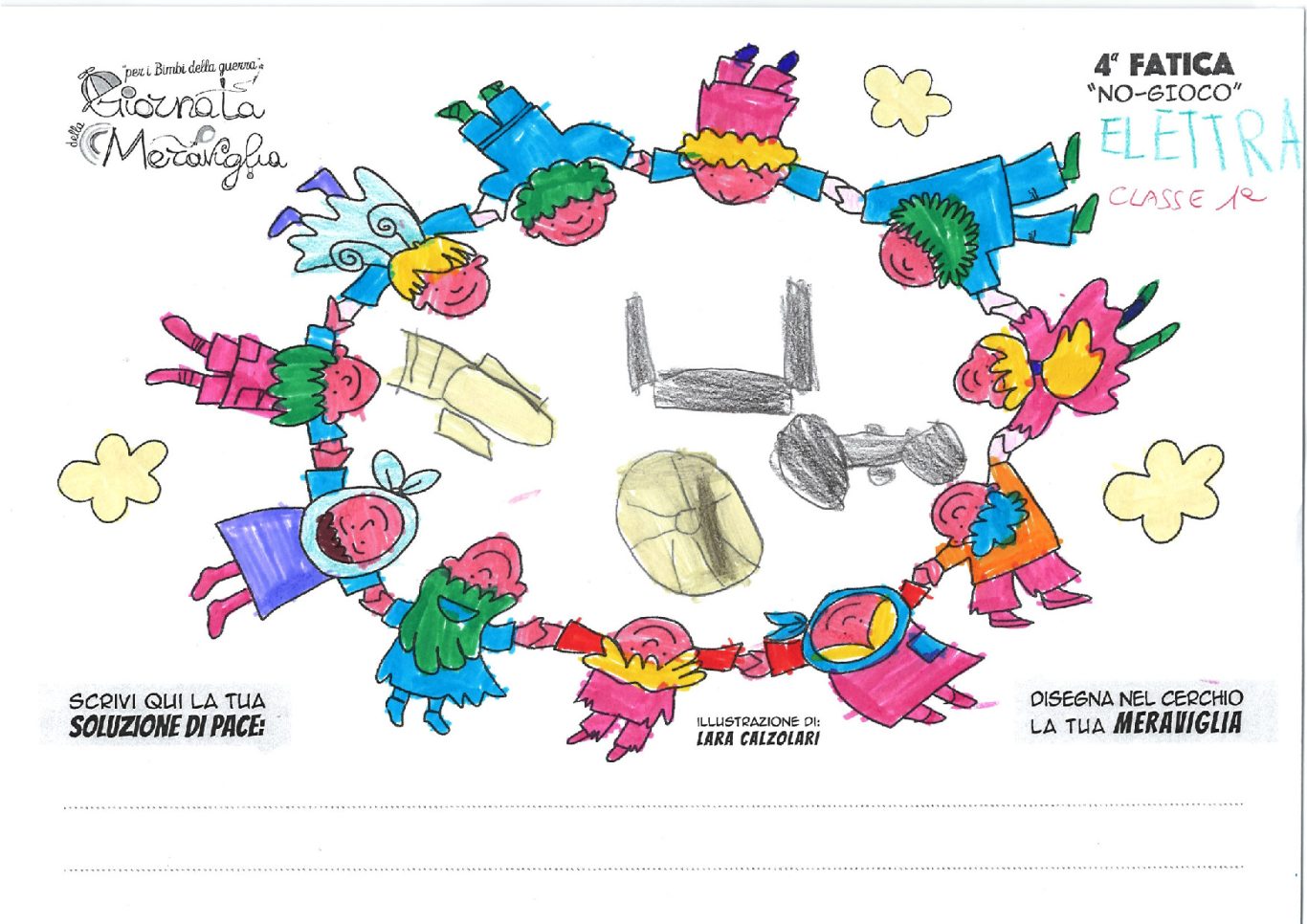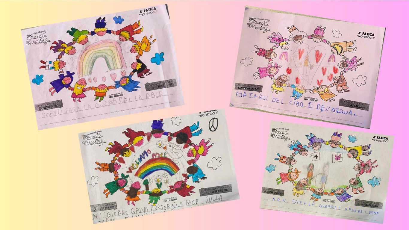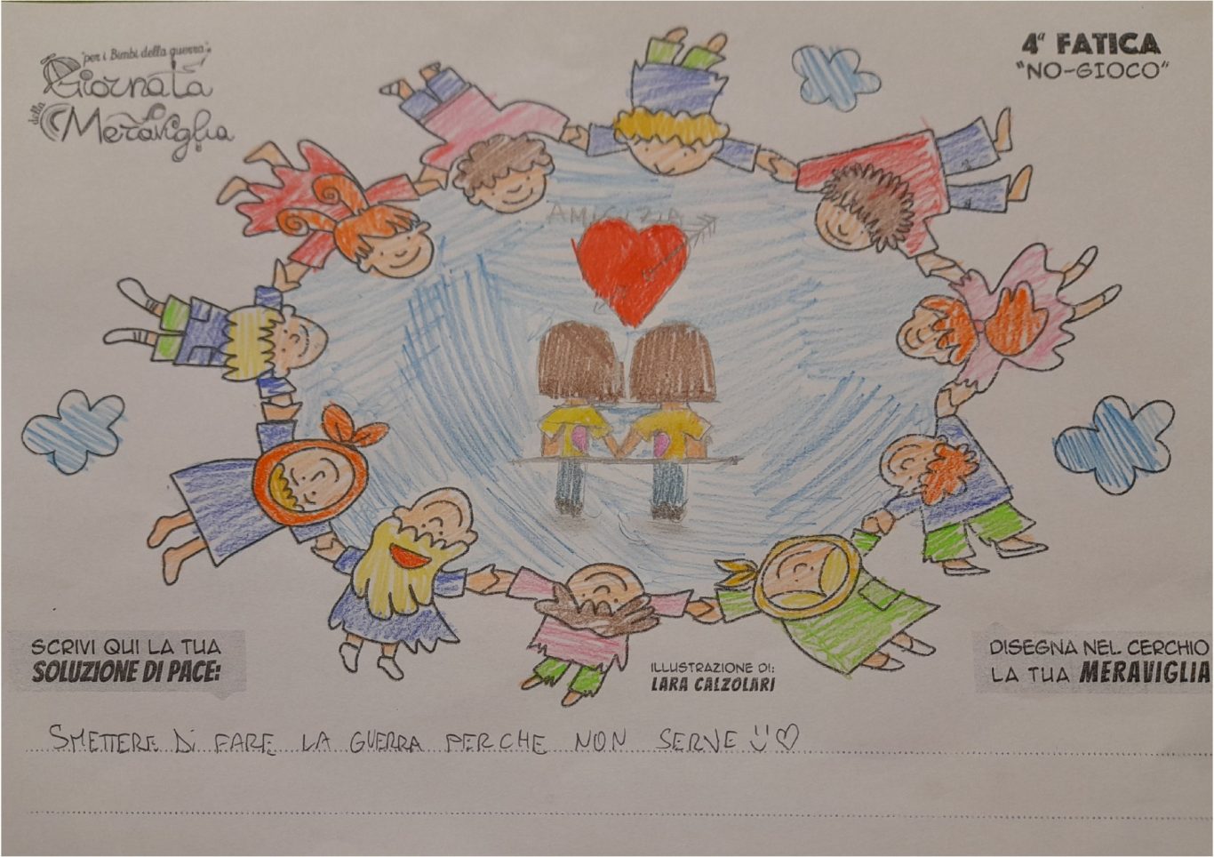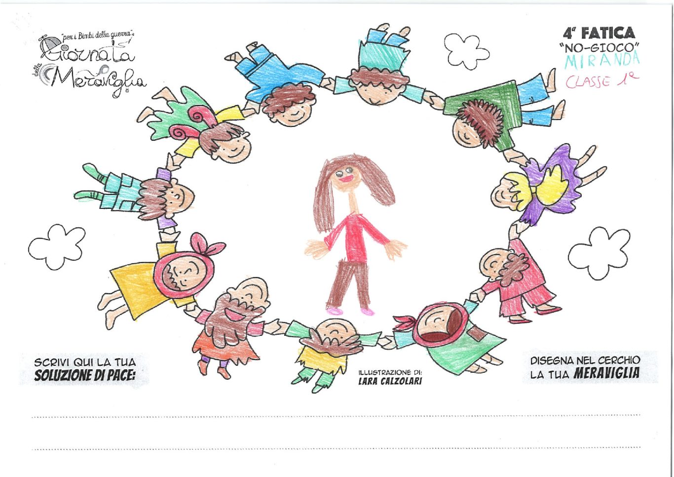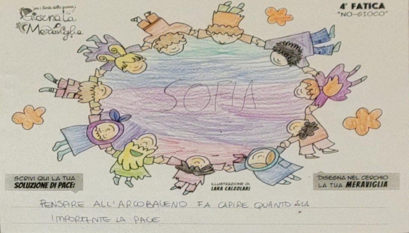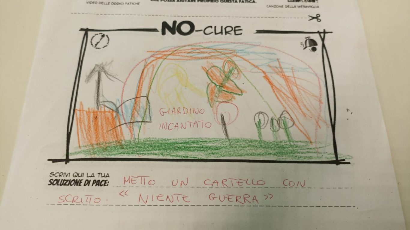 L’opera di sensibilizzazione si si esprime concretamente con la creazione di un DISEGNO DELLA MERAVIGLIA che andrà ad aiutare una delle 12 fatiche. Allo stesso modo chiederemo a tutti i partecipanti di andare a scrivere una “Soluzione di Pace” che possa aiutare anch’essa una delle 12 fatiche dei Bambini della guerra.