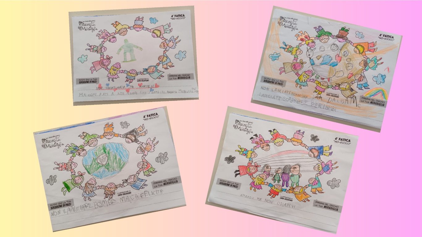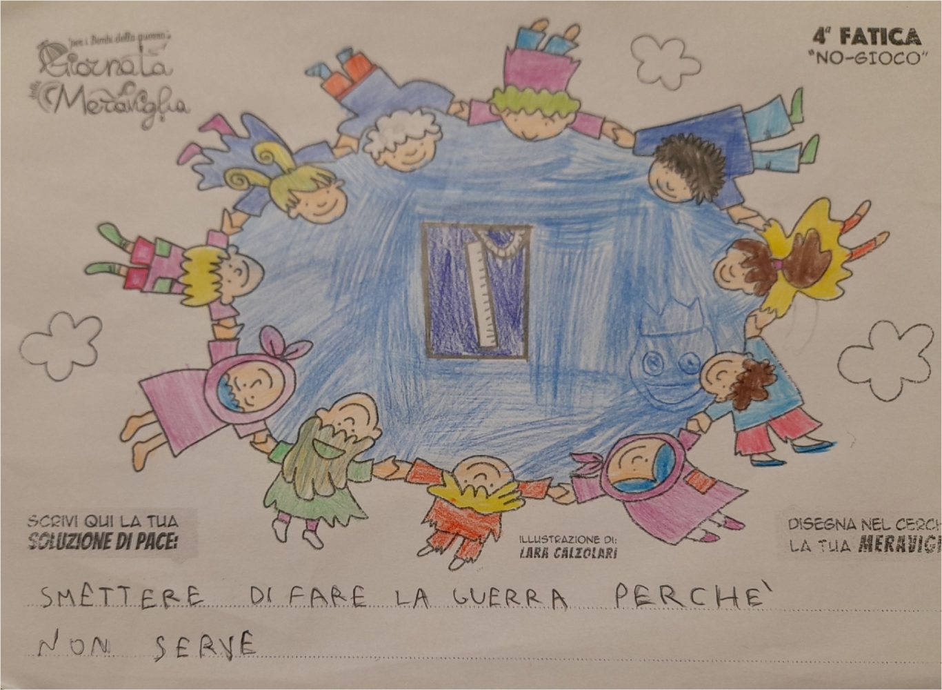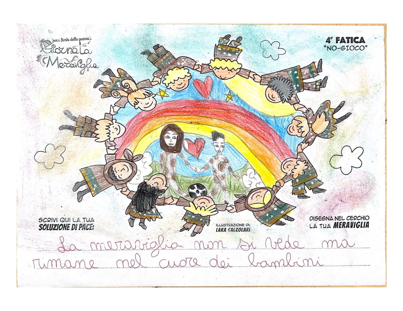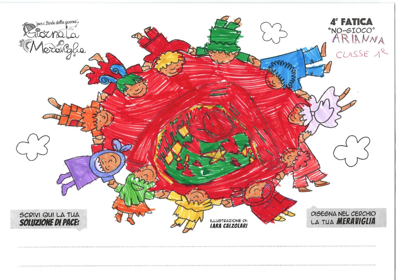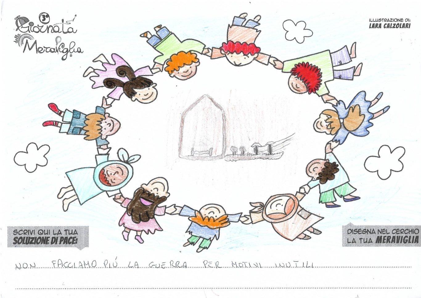 L’opera di sensibilizzazione si si esprime concretamente con la creazione di un DISEGNO DELLA MERAVIGLIA che andrà ad aiutare una delle 12 fatiche. Allo stesso modo chiederemo a tutti i partecipanti di andare a scrivere una “Soluzione di Pace” che possa aiutare anch’essa una delle 12 fatiche dei Bambini della guerra.