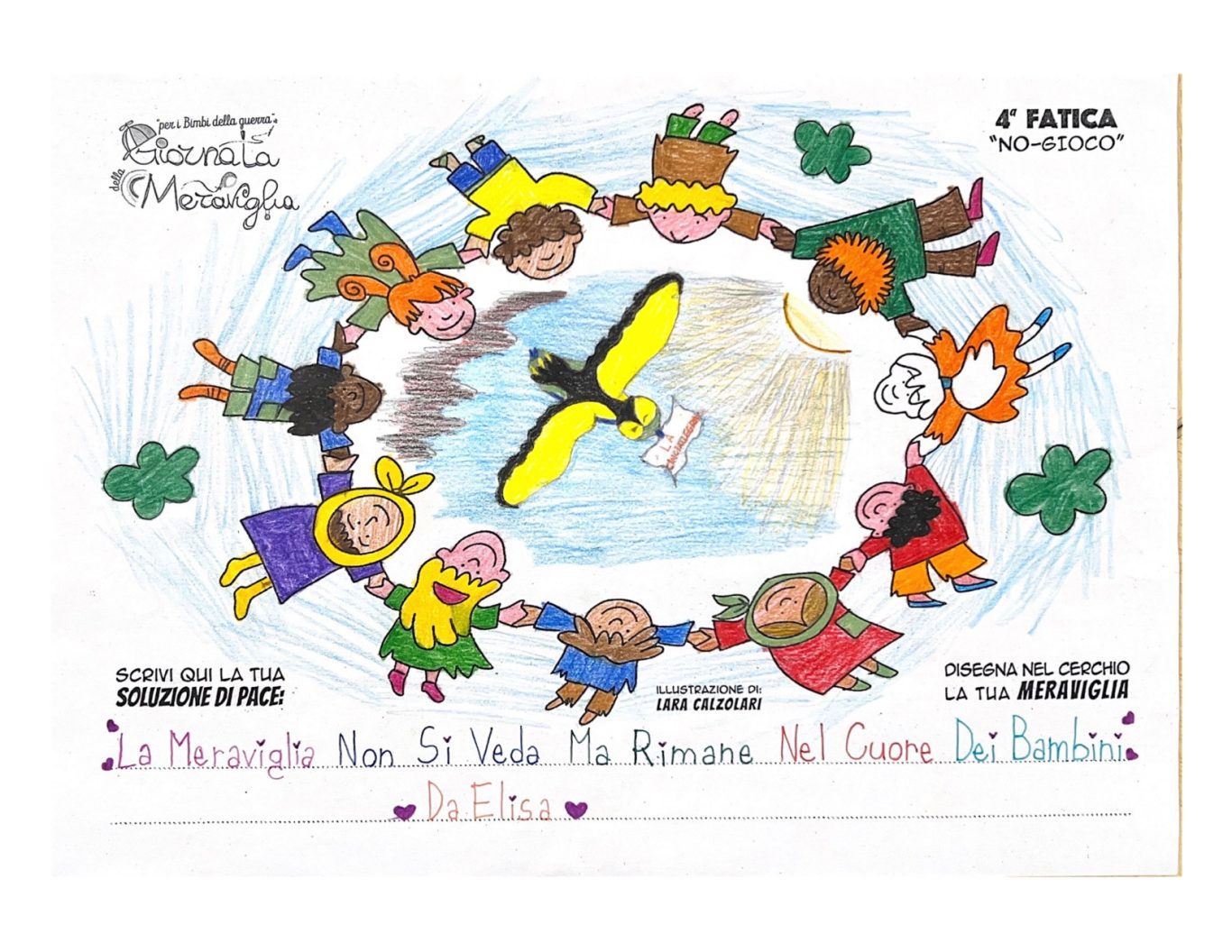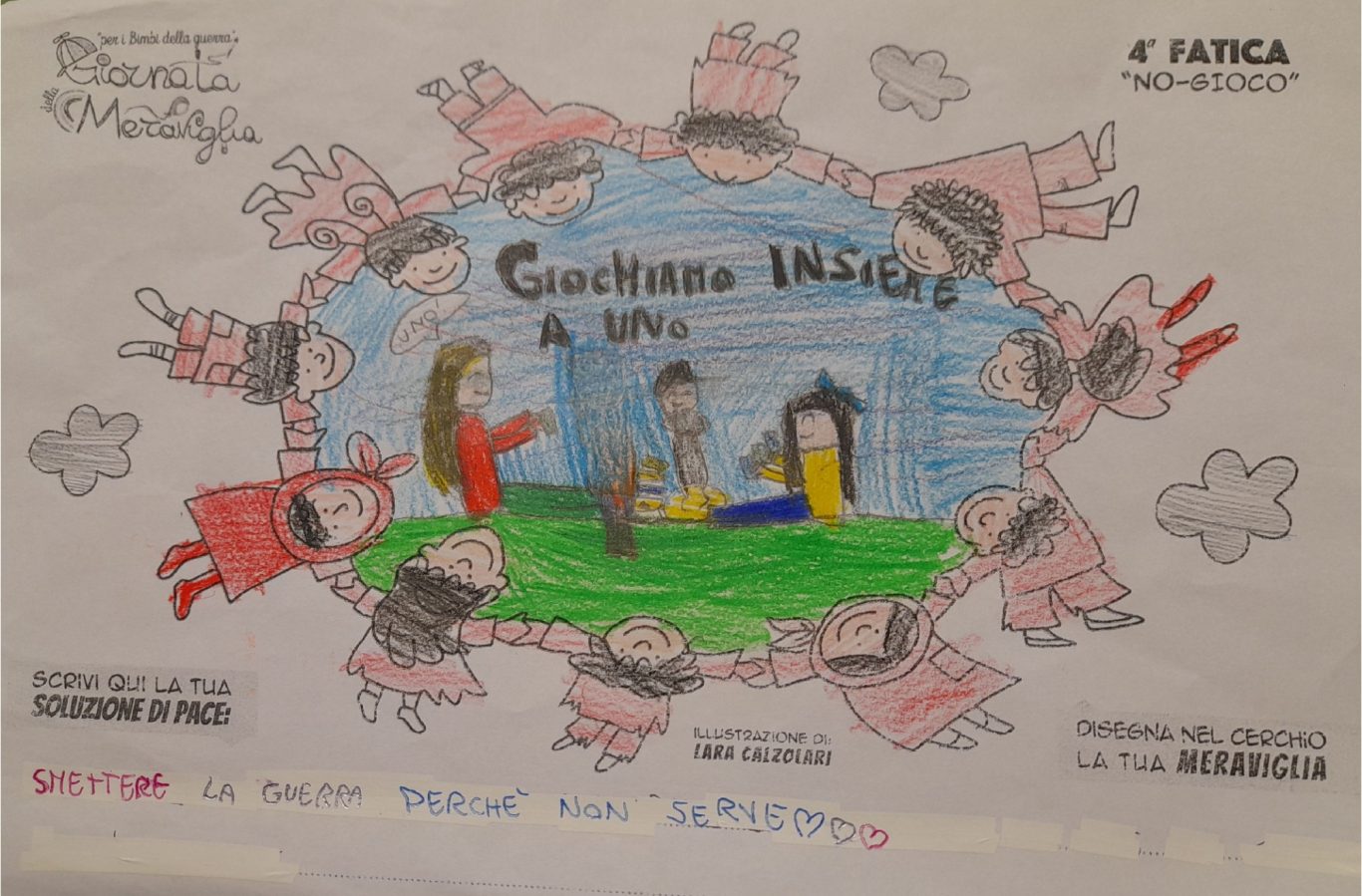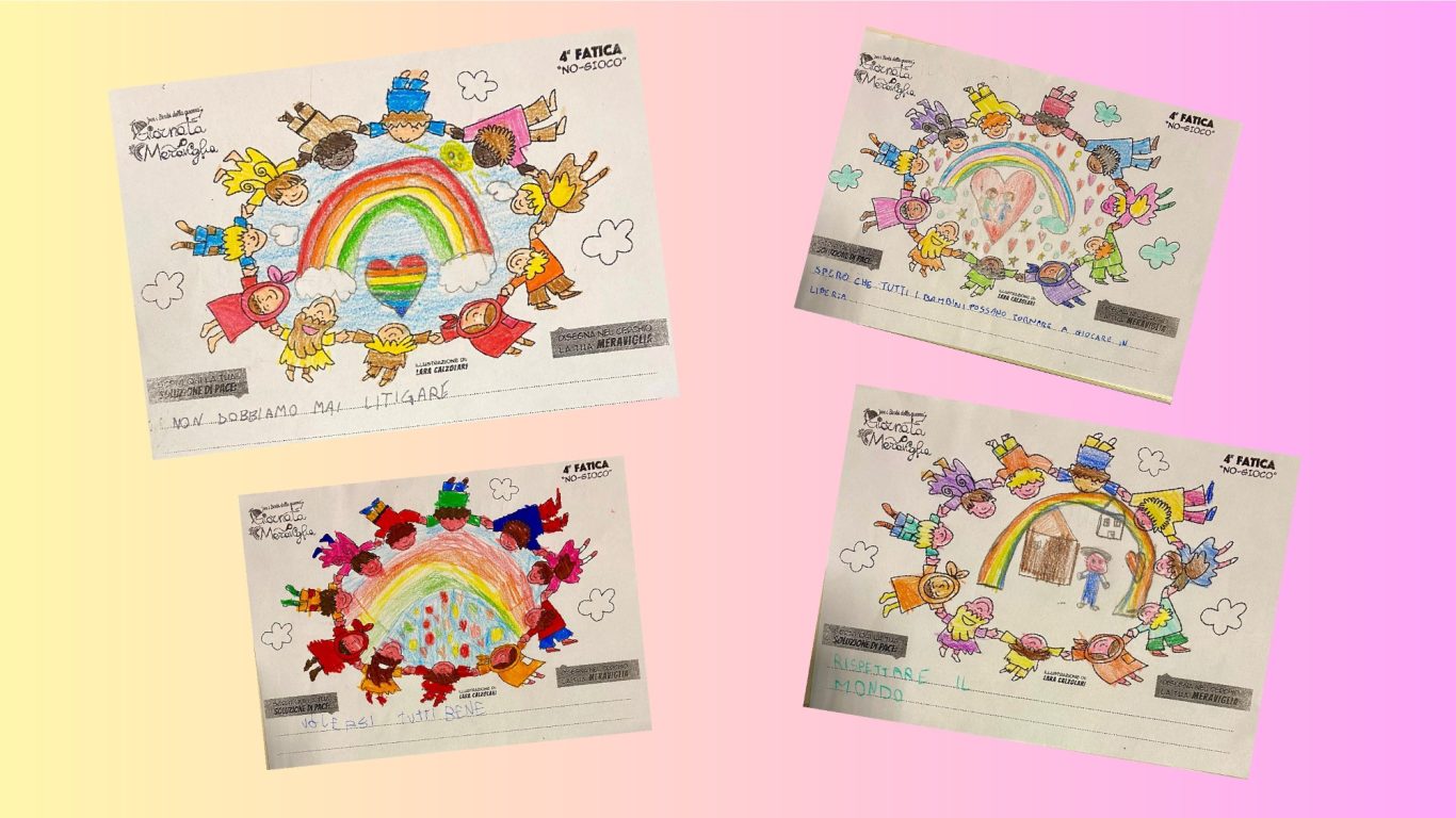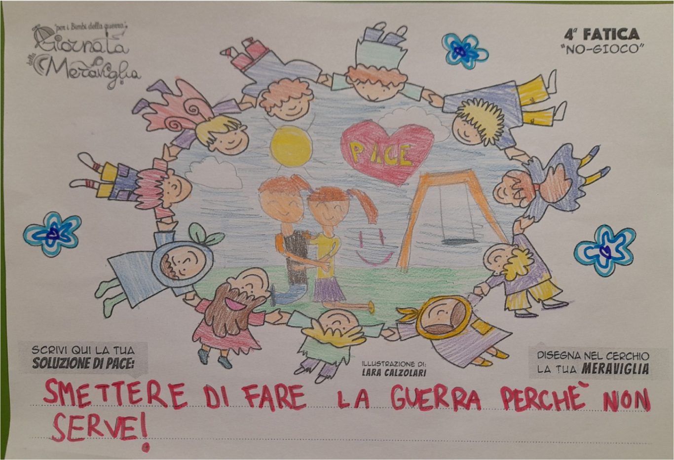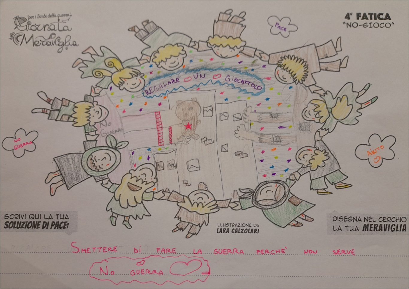 L’opera di sensibilizzazione si si esprime concretamente con la creazione di un DISEGNO DELLA MERAVIGLIA che andrà ad aiutare una delle 12 fatiche. Allo stesso modo chiederemo a tutti i partecipanti di andare a scrivere una “Soluzione di Pace” che possa aiutare anch’essa una delle 12 fatiche dei Bambini della guerra.