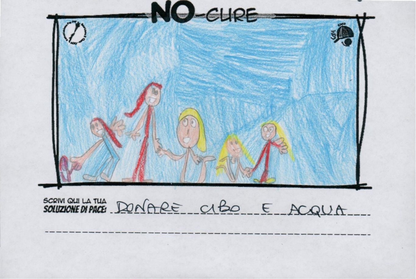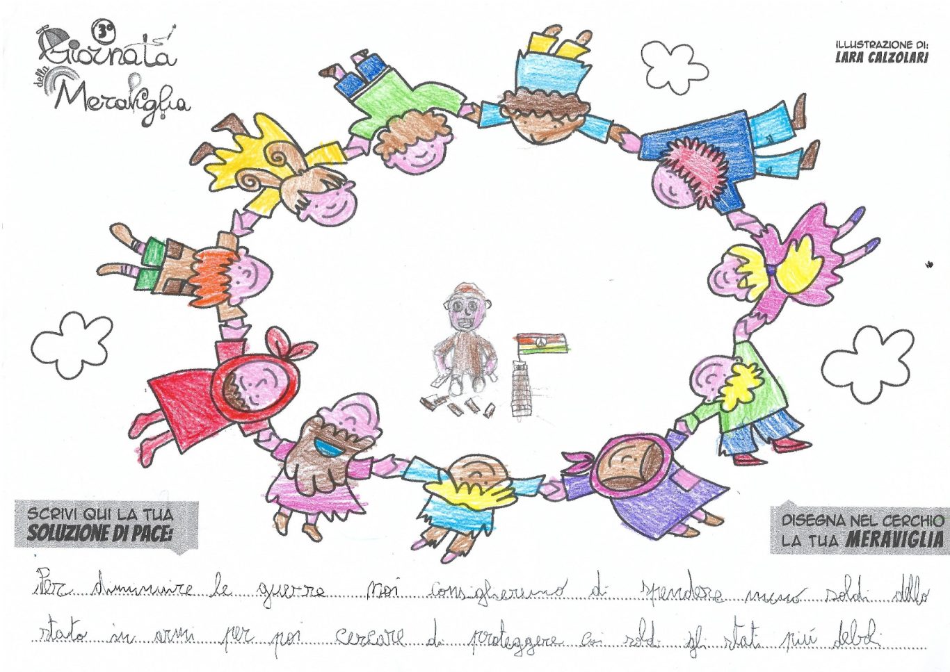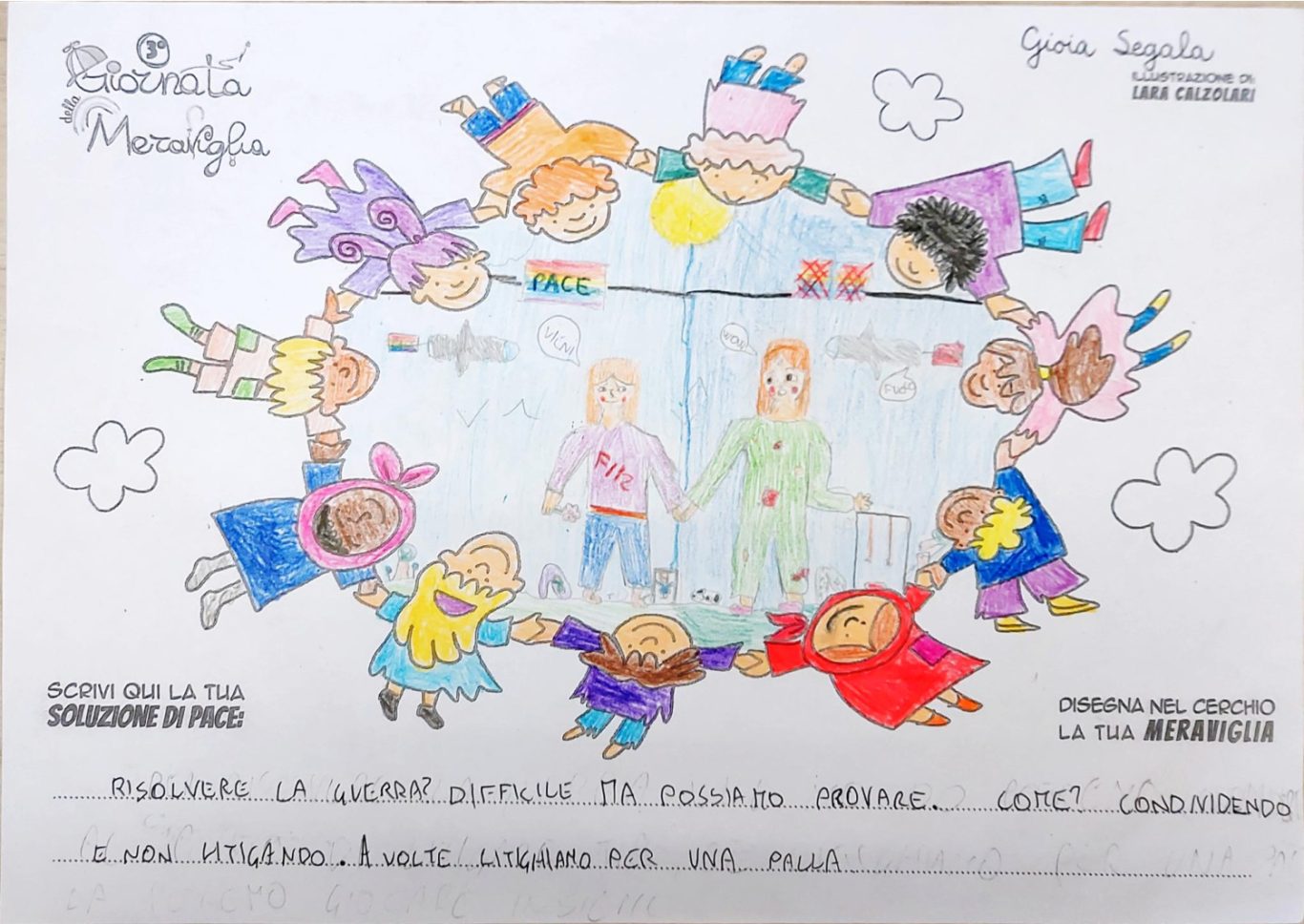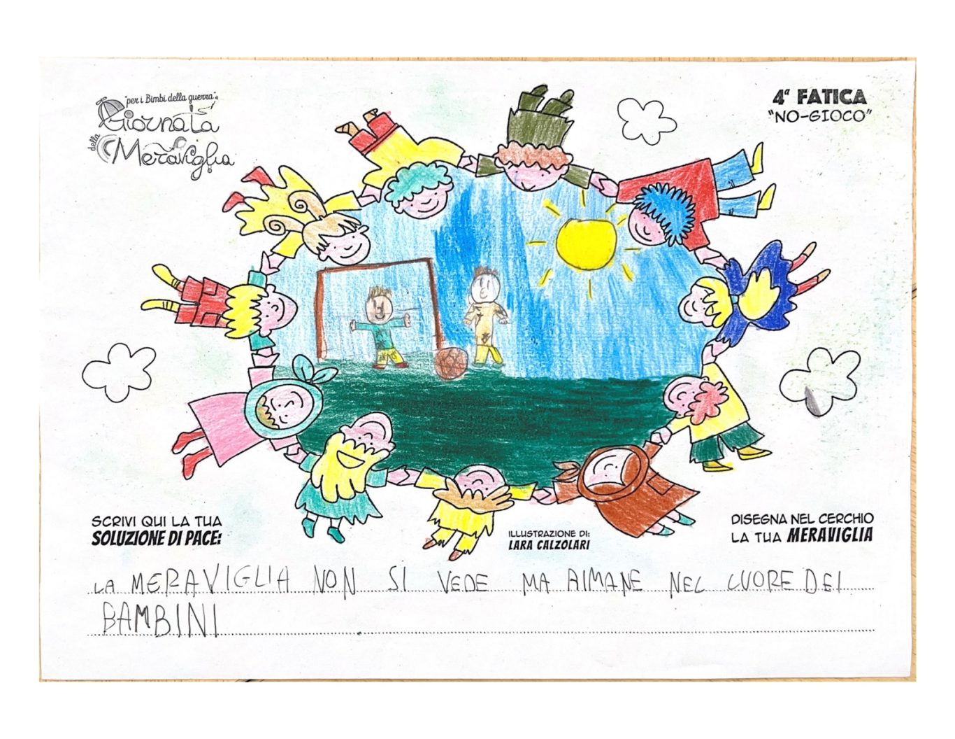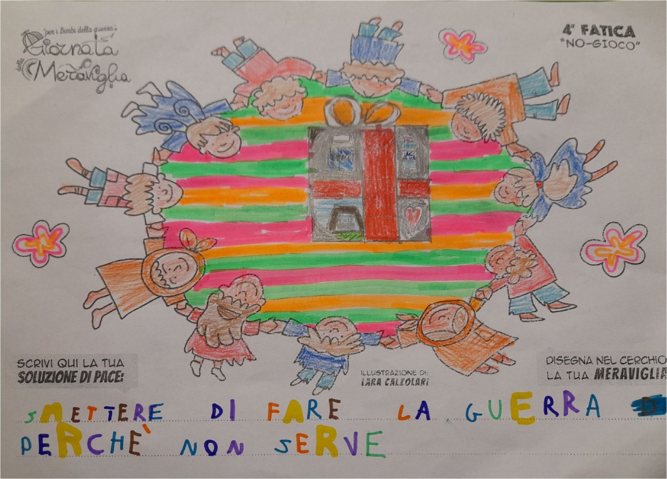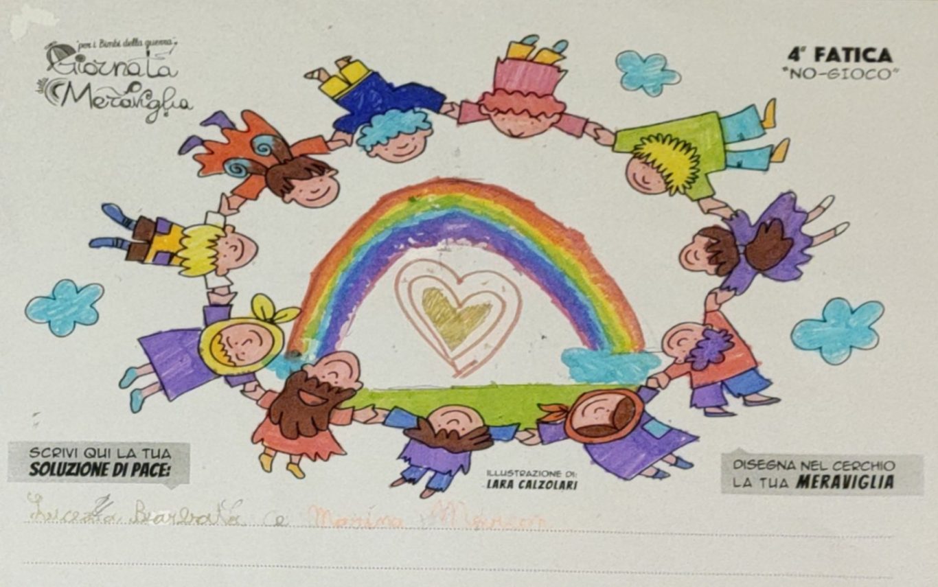 L’opera di sensibilizzazione si si esprime concretamente con la creazione di un DISEGNO DELLA MERAVIGLIA che andrà ad aiutare una delle 12 fatiche. Allo stesso modo chiederemo a tutti i partecipanti di andare a scrivere una “Soluzione di Pace” che possa aiutare anch’essa una delle 12 fatiche dei Bambini della guerra.