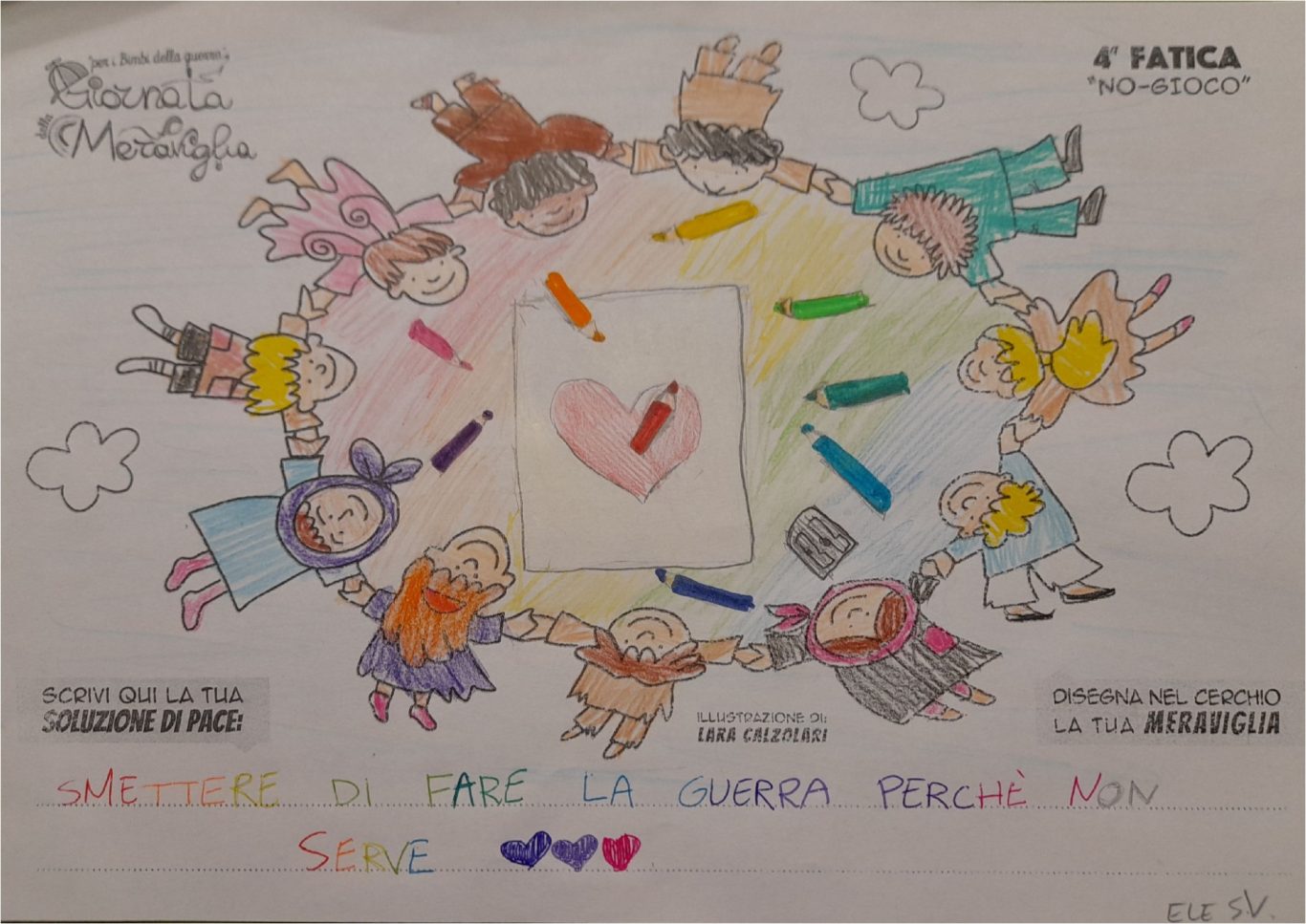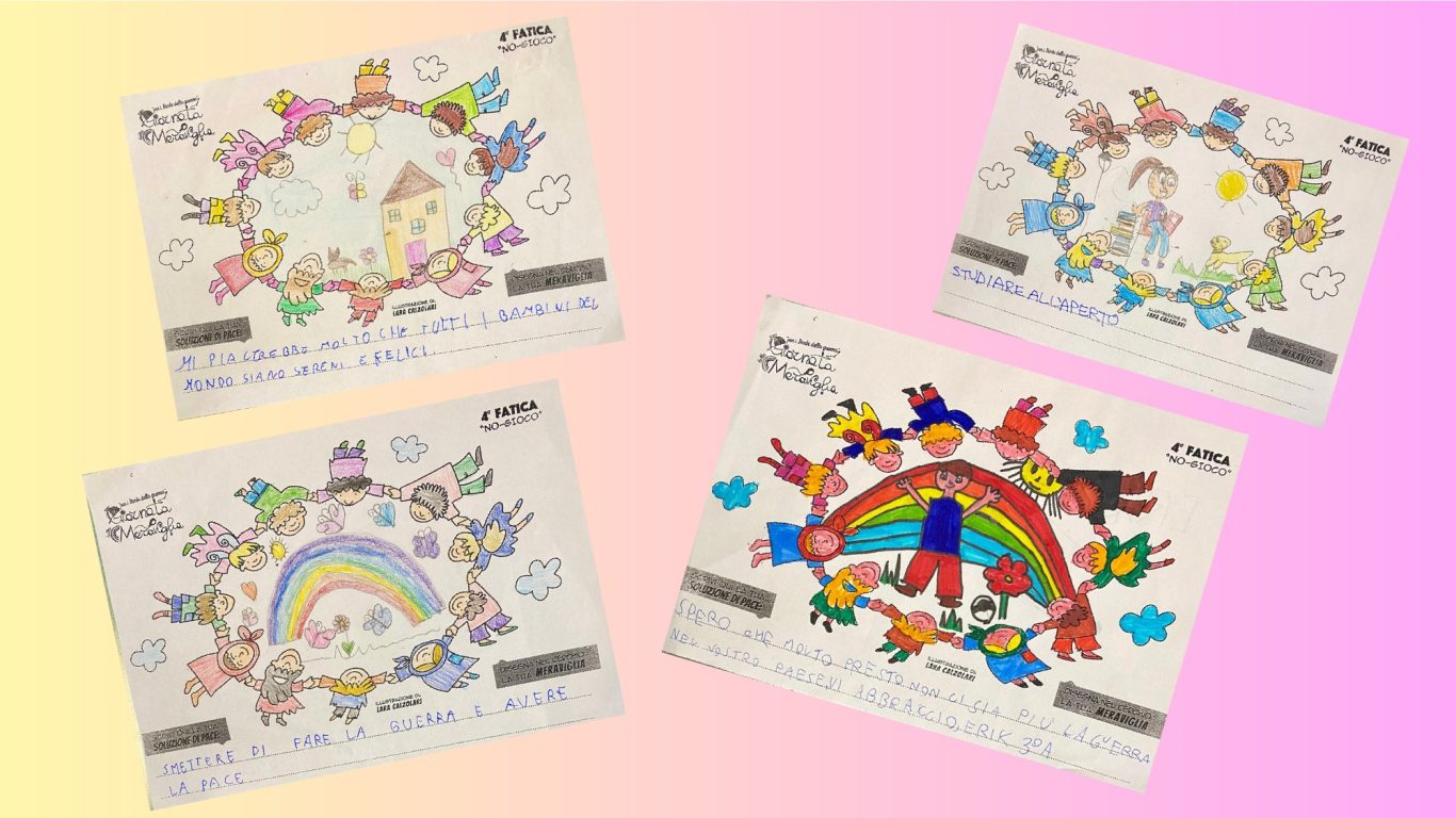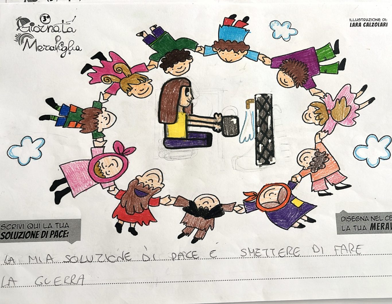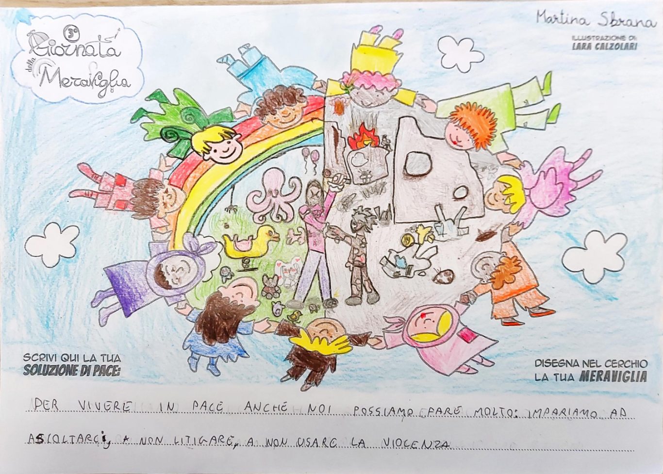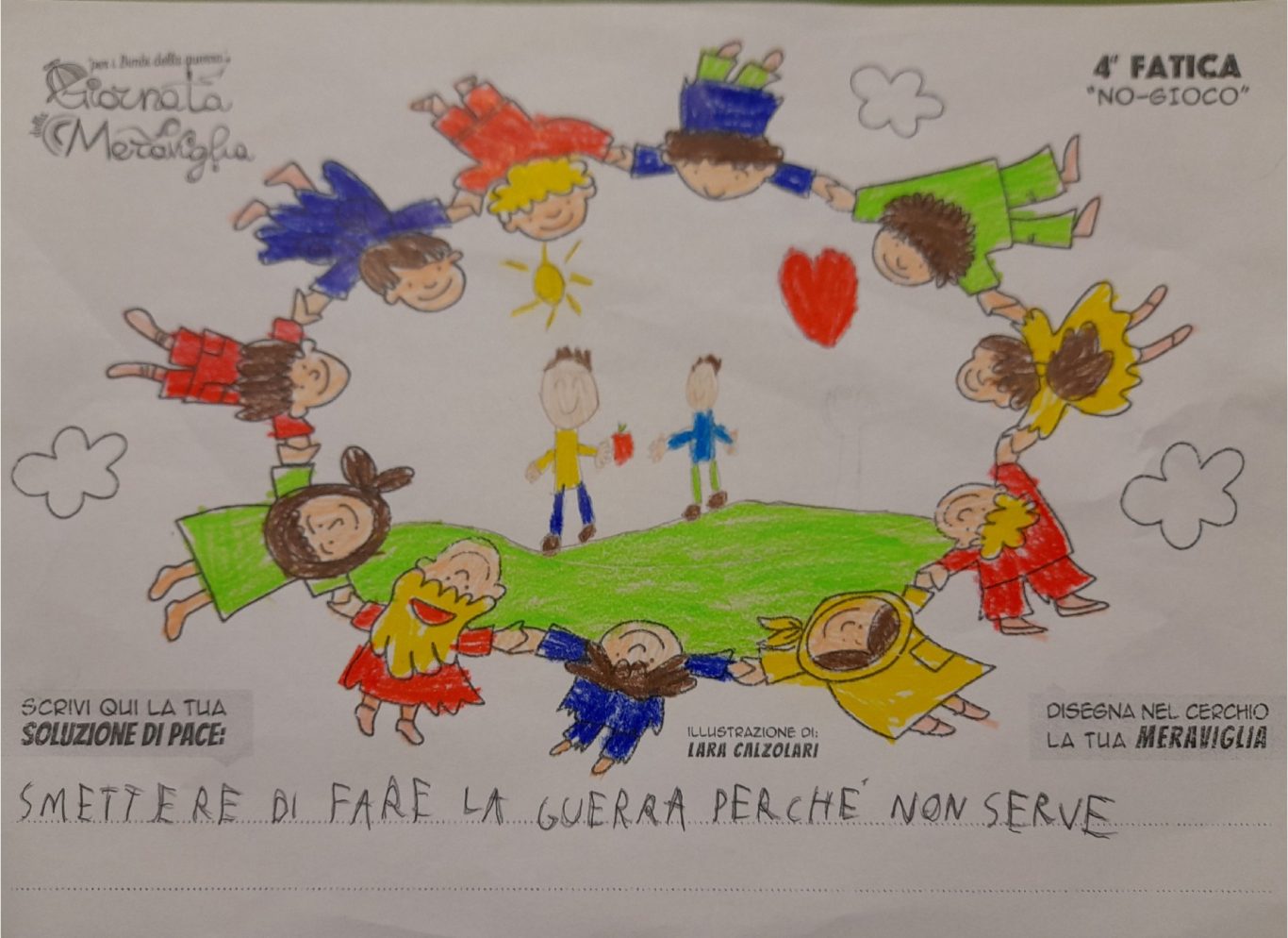 L’opera di sensibilizzazione si si esprime concretamente con la creazione di un DISEGNO DELLA MERAVIGLIA che andrà ad aiutare una delle 12 fatiche. Allo stesso modo chiederemo a tutti i partecipanti di andare a scrivere una “Soluzione di Pace” che possa aiutare anch’essa una delle 12 fatiche dei Bambini della guerra.