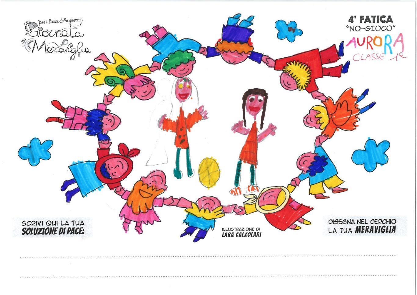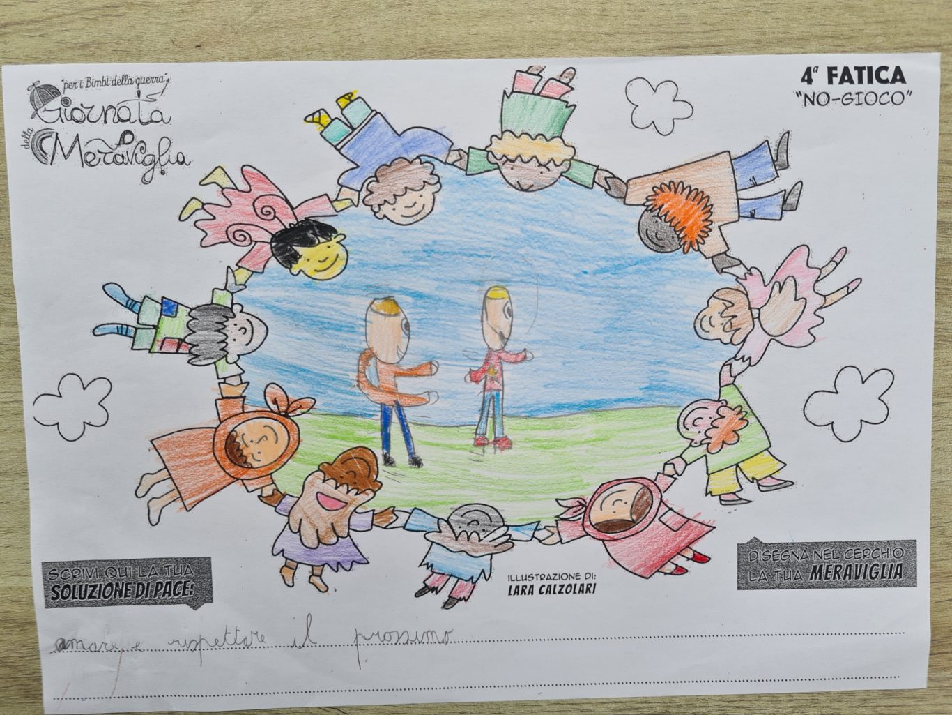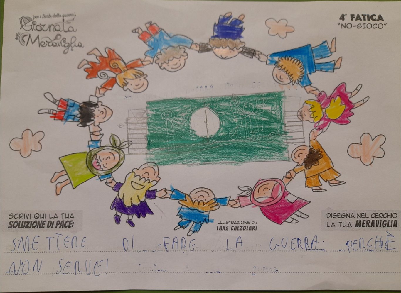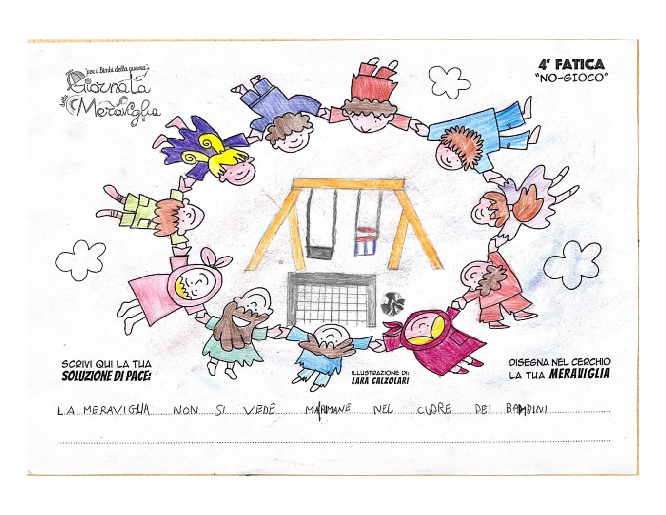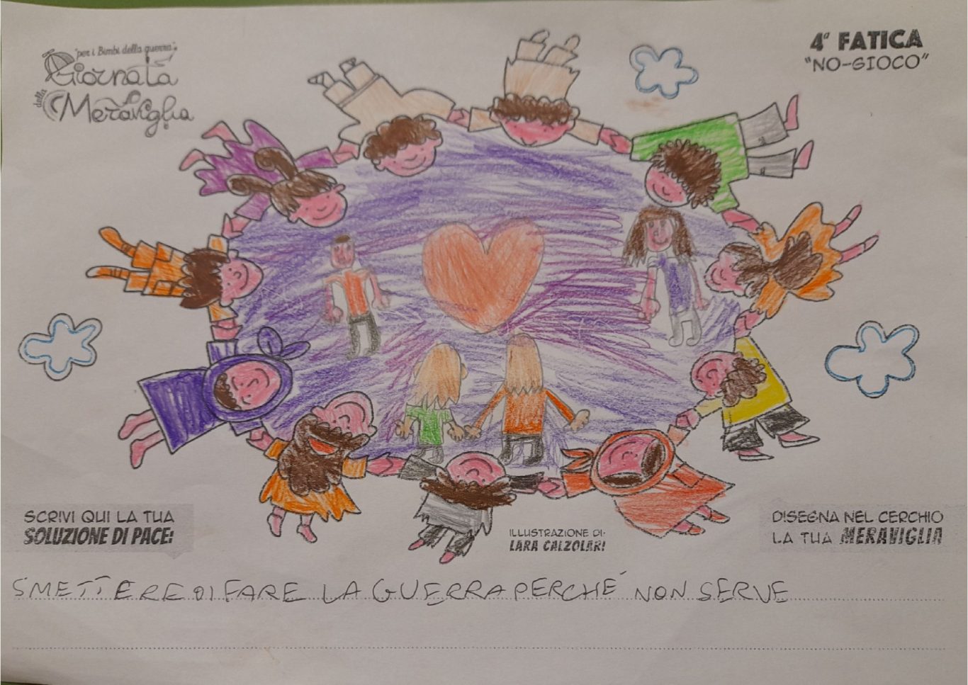 L’opera di sensibilizzazione si si esprime concretamente con la creazione di un DISEGNO DELLA MERAVIGLIA che andrà ad aiutare una delle 12 fatiche. Allo stesso modo chiederemo a tutti i partecipanti di andare a scrivere una “Soluzione di Pace” che possa aiutare anch’essa una delle 12 fatiche dei Bambini della guerra.