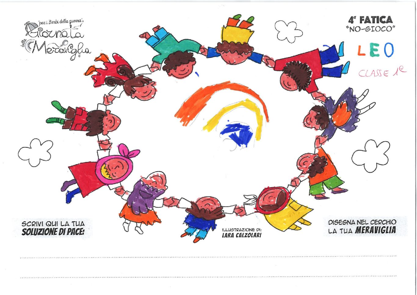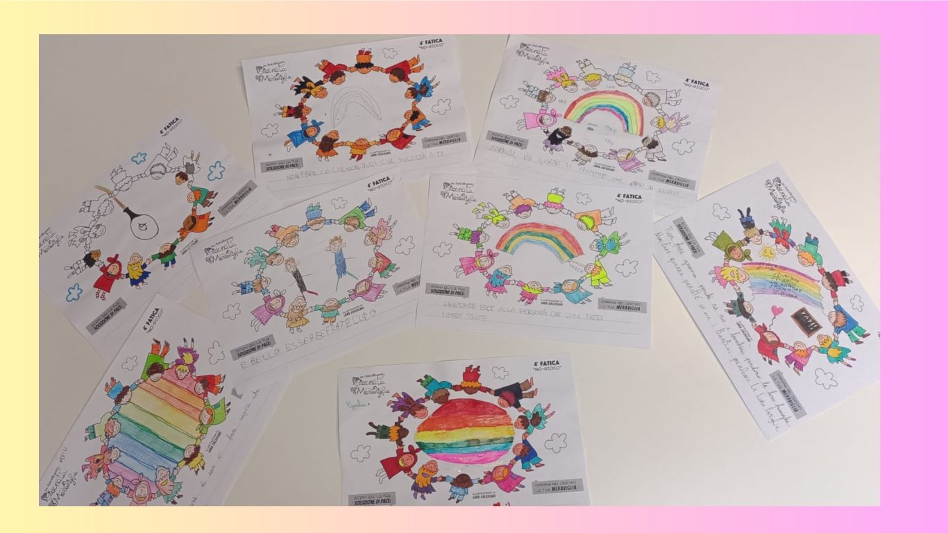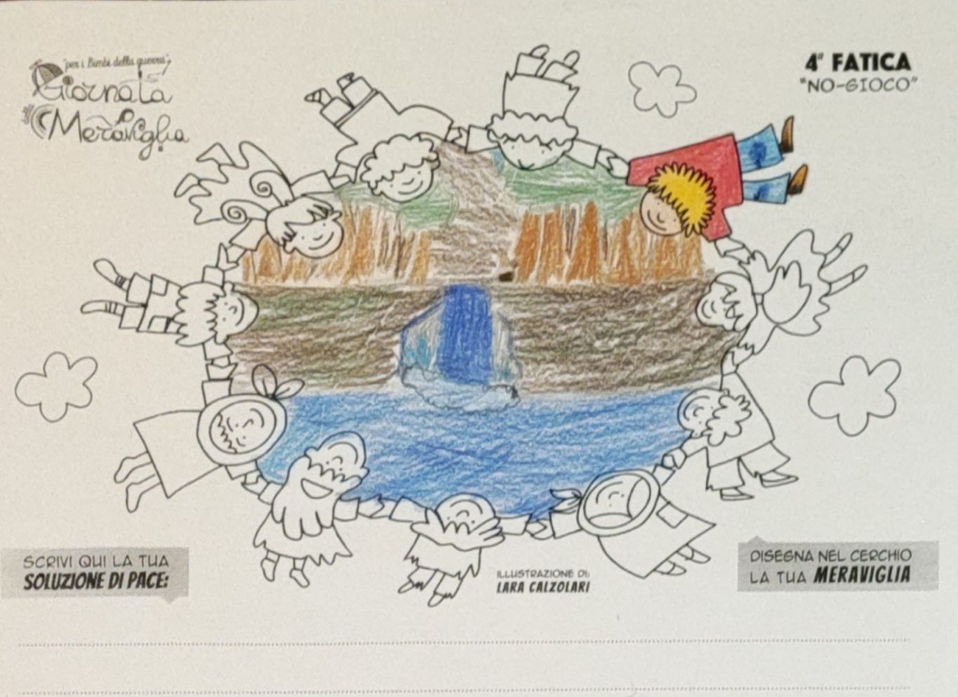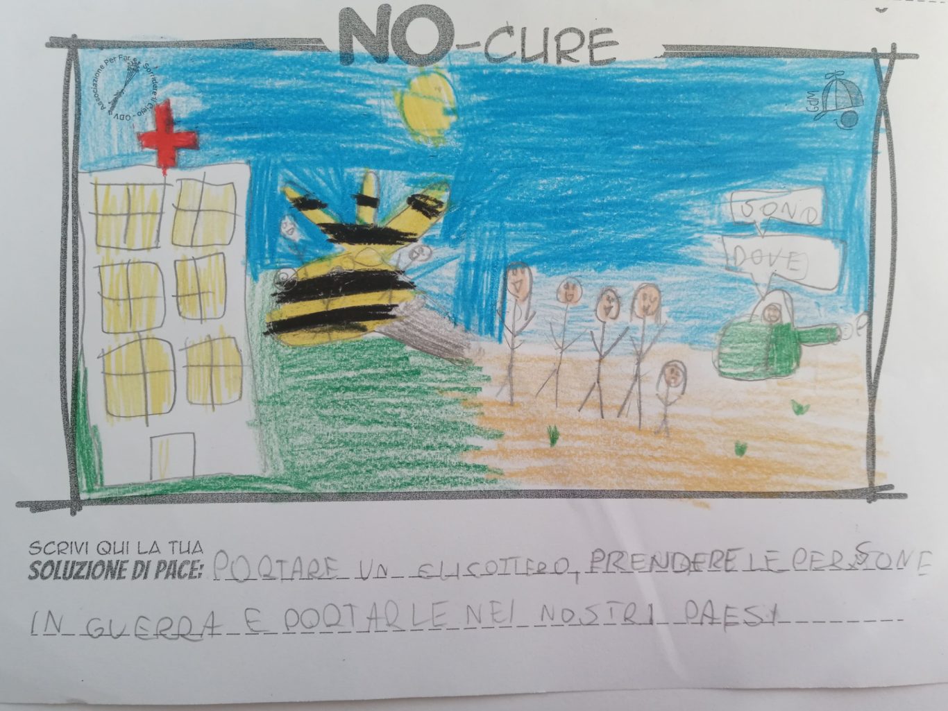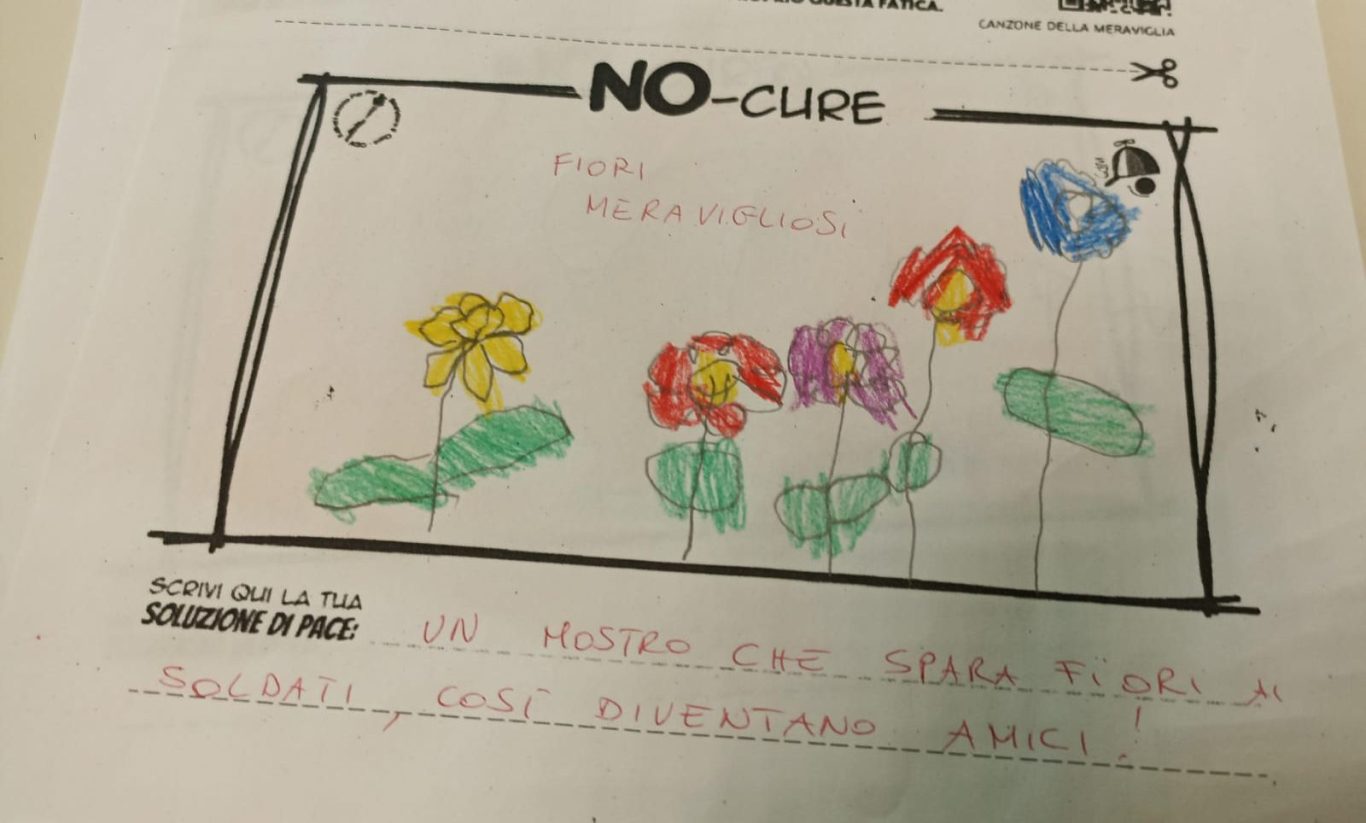 L’opera di sensibilizzazione si si esprime concretamente con la creazione di un DISEGNO DELLA MERAVIGLIA che andrà ad aiutare una delle 12 fatiche. Allo stesso modo chiederemo a tutti i partecipanti di andare a scrivere una “Soluzione di Pace” che possa aiutare anch’essa una delle 12 fatiche dei Bambini della guerra.