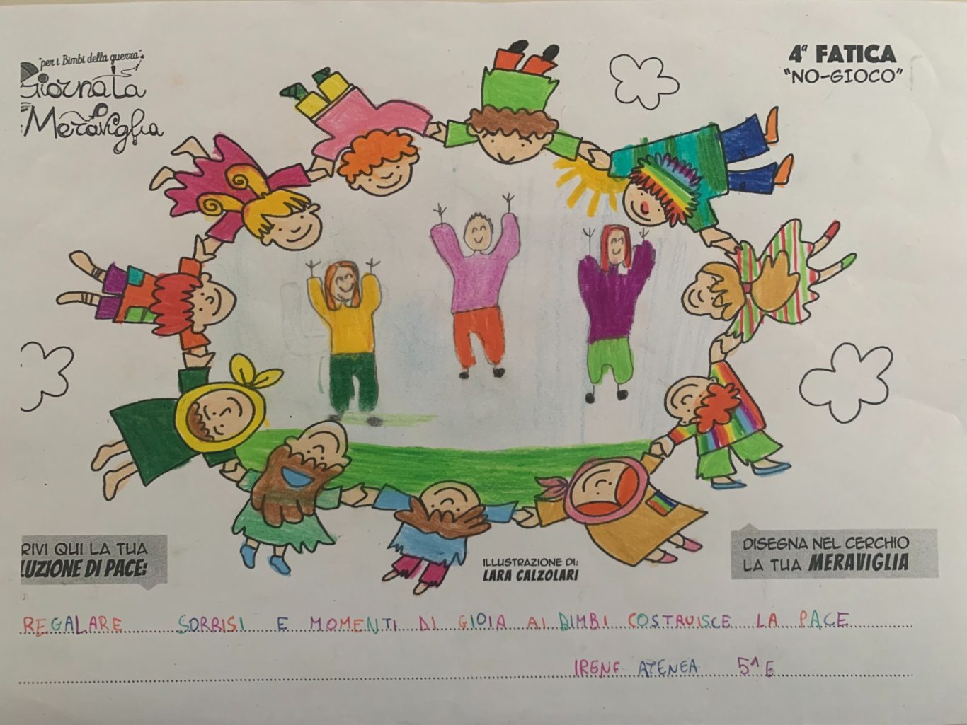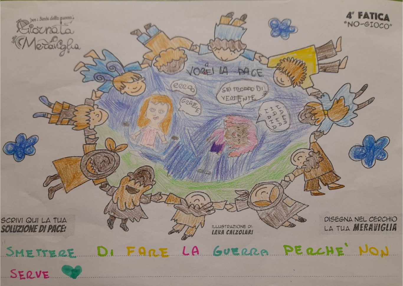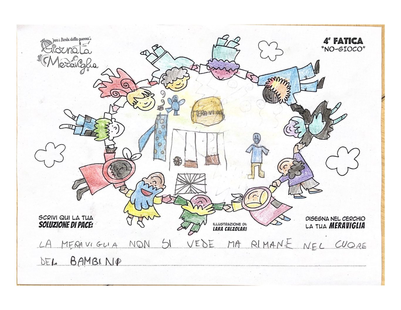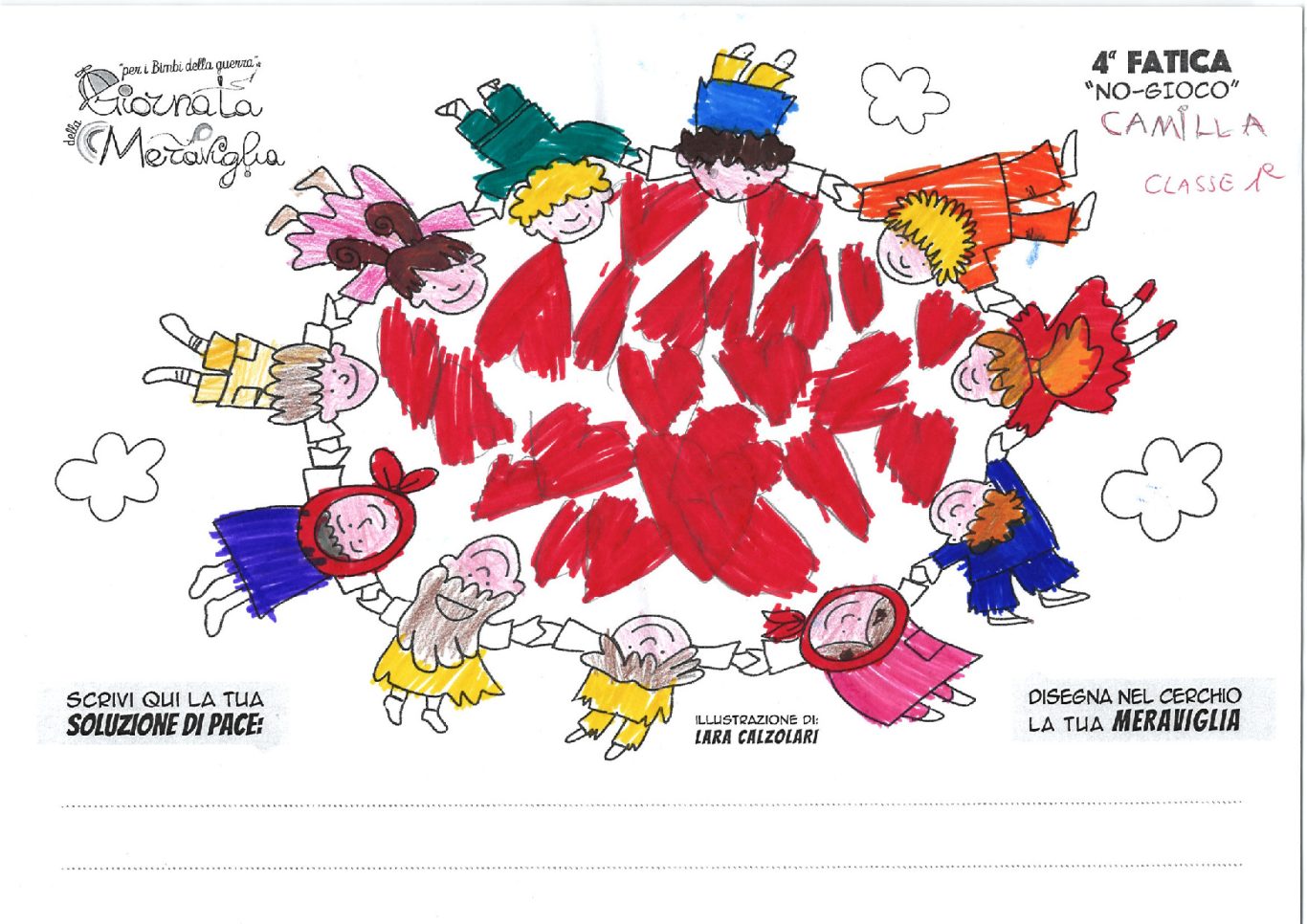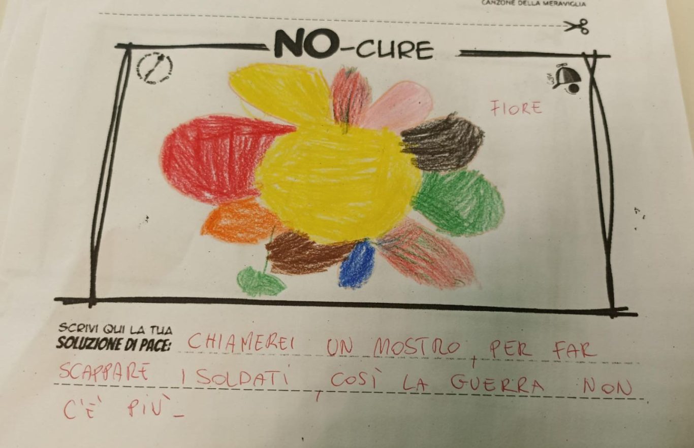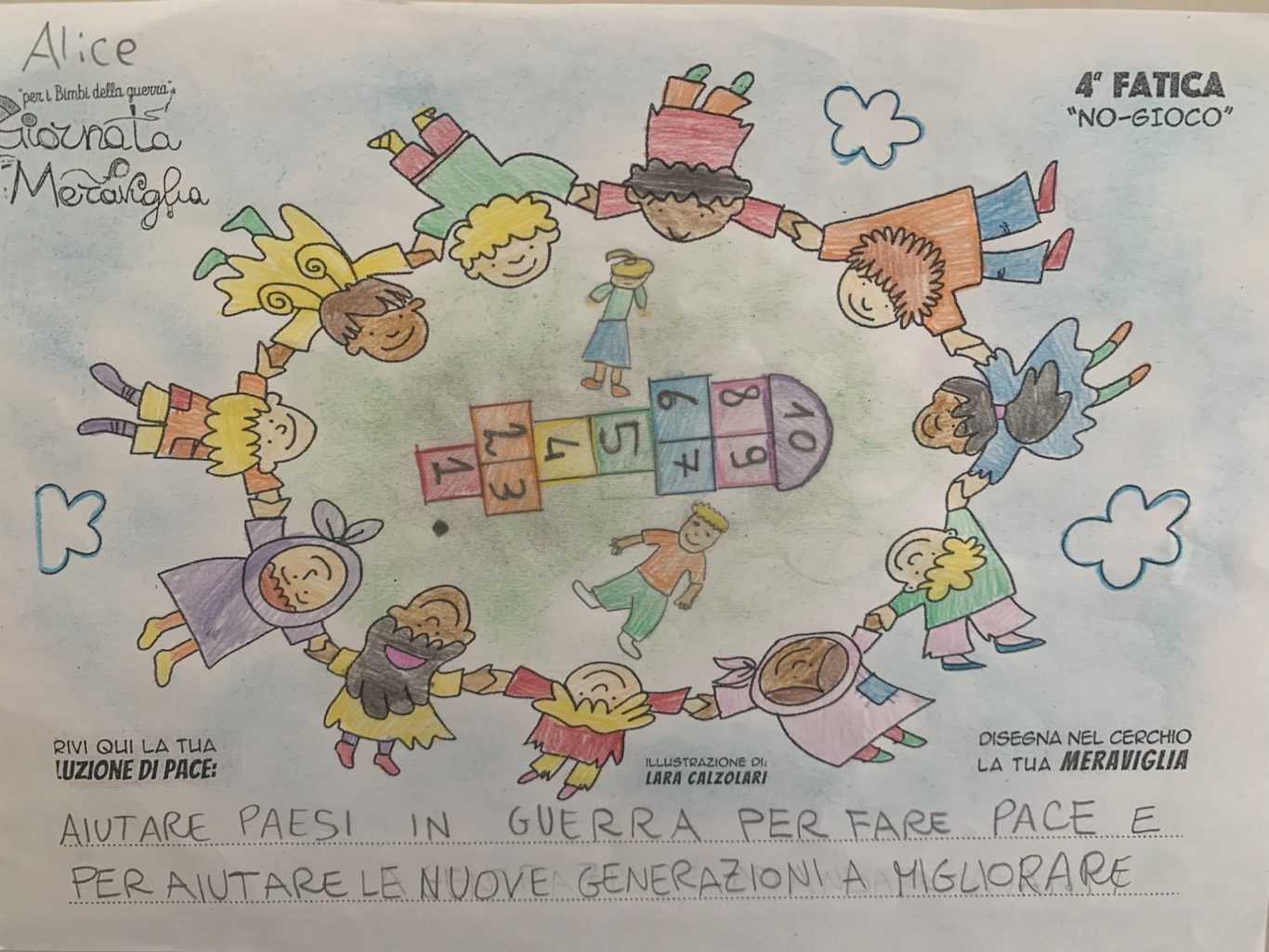 L’opera di sensibilizzazione si si esprime concretamente con la creazione di un DISEGNO DELLA MERAVIGLIA che andrà ad aiutare una delle 12 fatiche. Allo stesso modo chiederemo a tutti i partecipanti di andare a scrivere una “Soluzione di Pace” che possa aiutare anch’essa una delle 12 fatiche dei Bambini della guerra.