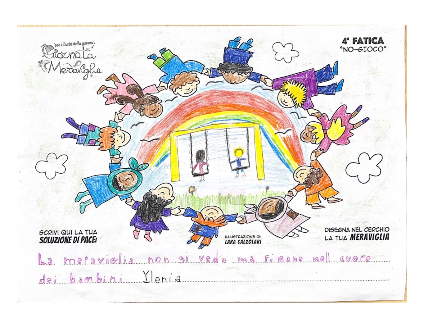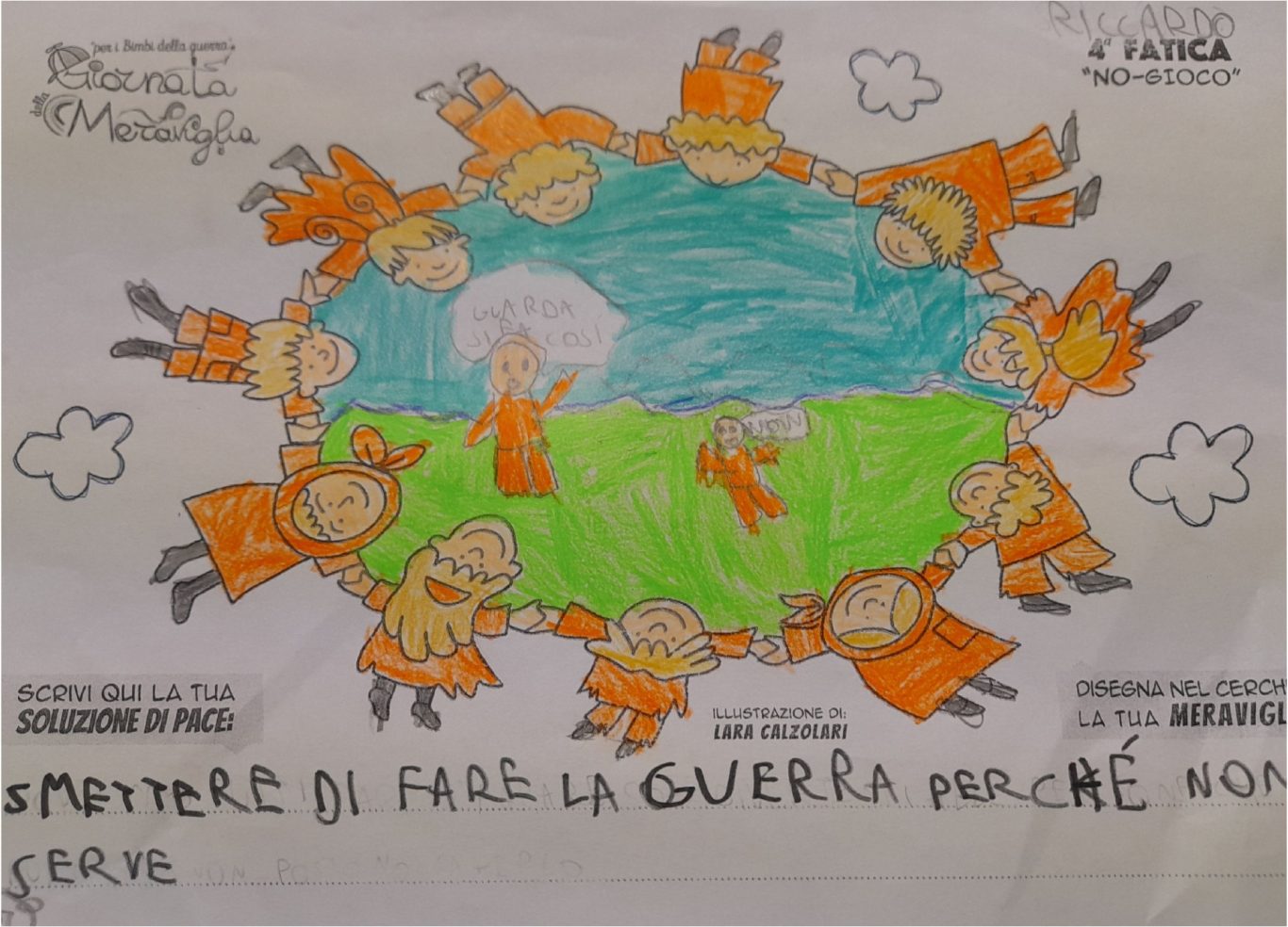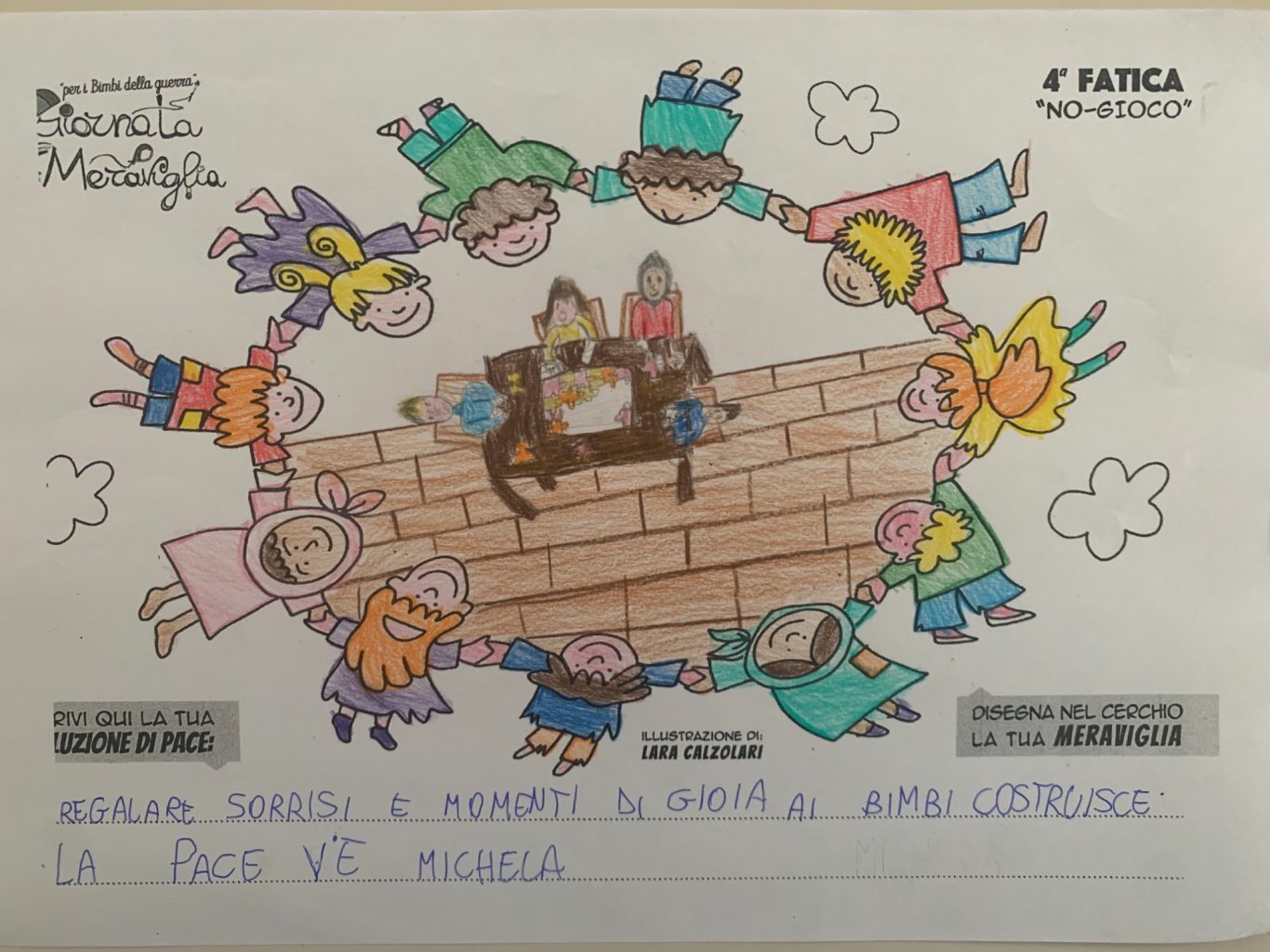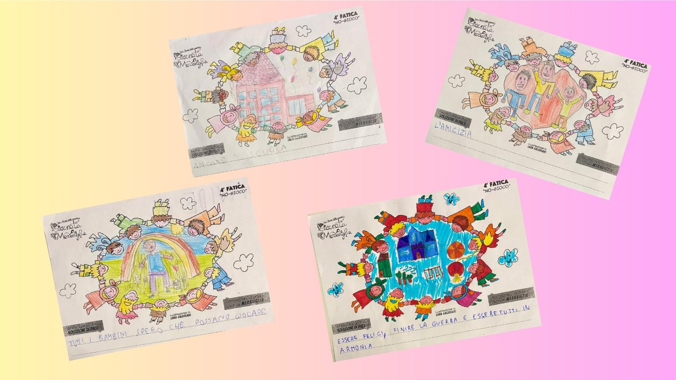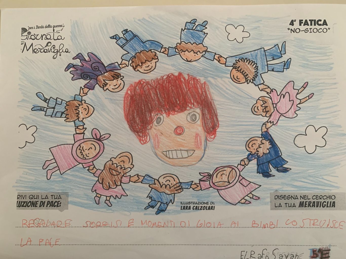 L’opera di sensibilizzazione si si esprime concretamente con la creazione di un DISEGNO DELLA MERAVIGLIA che andrà ad aiutare una delle 12 fatiche. Allo stesso modo chiederemo a tutti i partecipanti di andare a scrivere una “Soluzione di Pace” che possa aiutare anch’essa una delle 12 fatiche dei Bambini della guerra.
