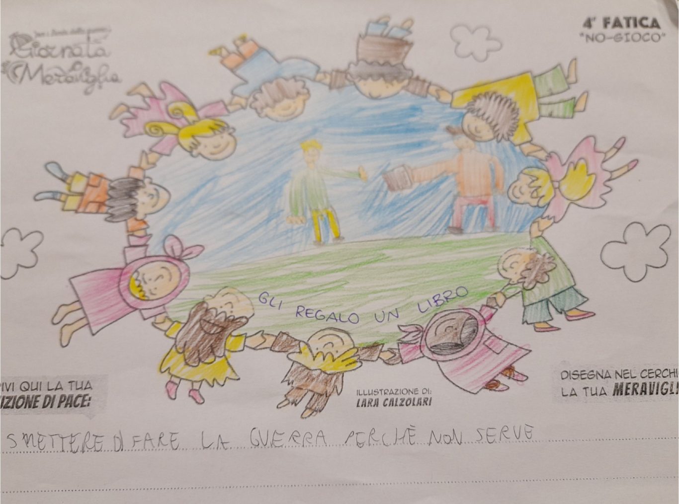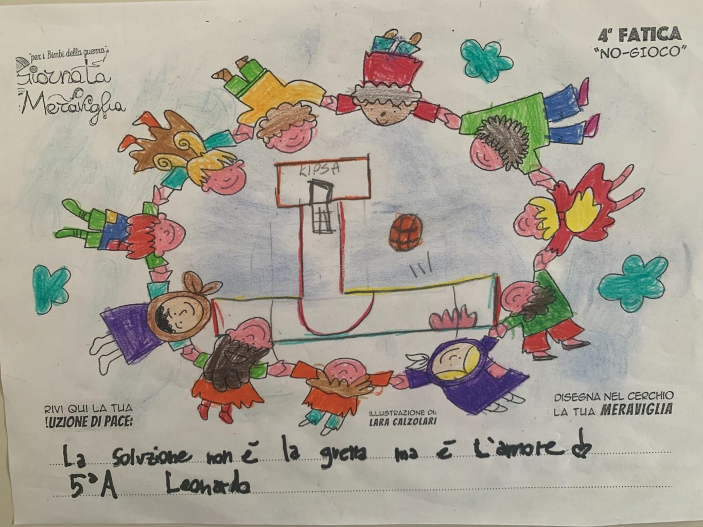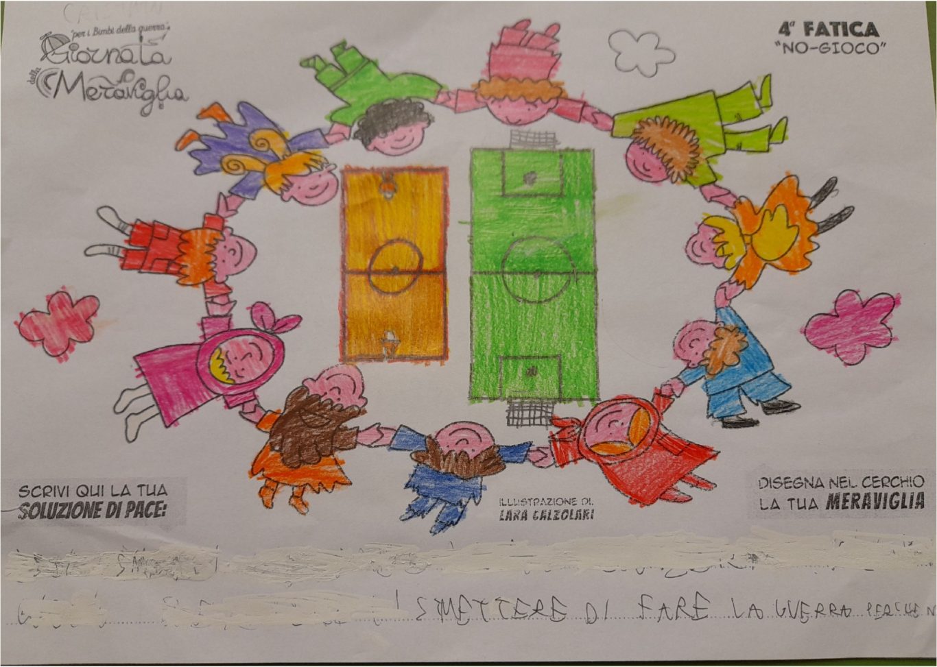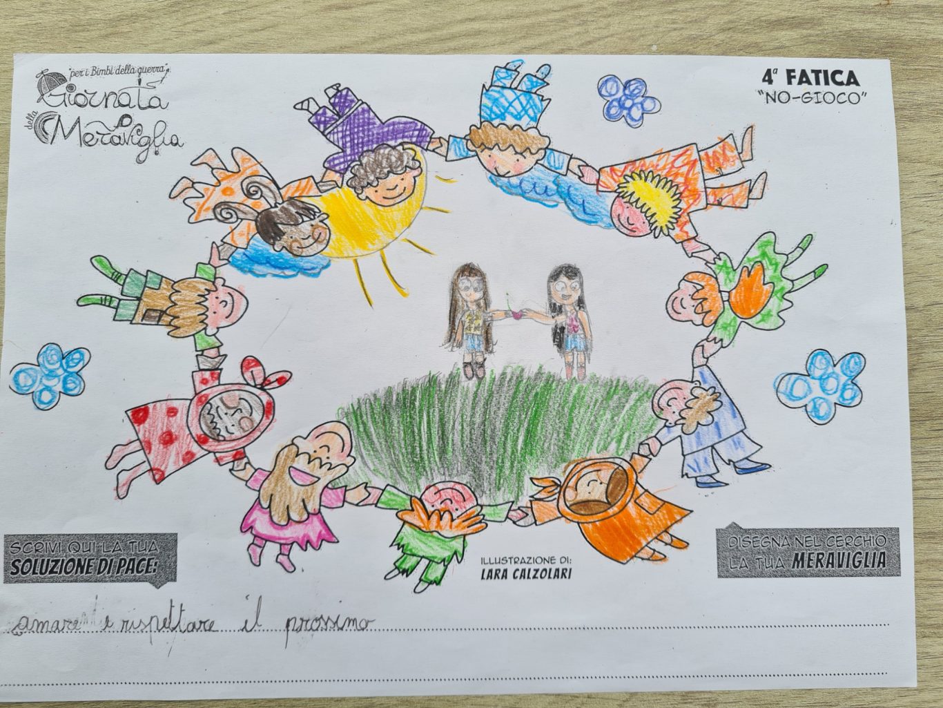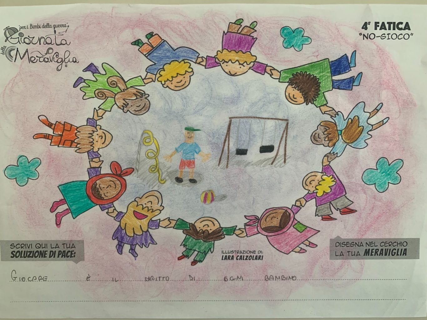 L’opera di sensibilizzazione si si esprime concretamente con la creazione di un DISEGNO DELLA MERAVIGLIA che andrà ad aiutare una delle 12 fatiche. Allo stesso modo chiederemo a tutti i partecipanti di andare a scrivere una “Soluzione di Pace” che possa aiutare anch’essa una delle 12 fatiche dei Bambini della guerra.