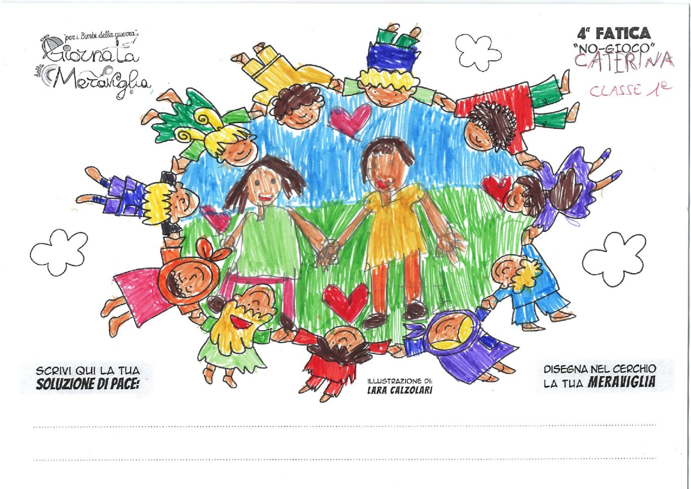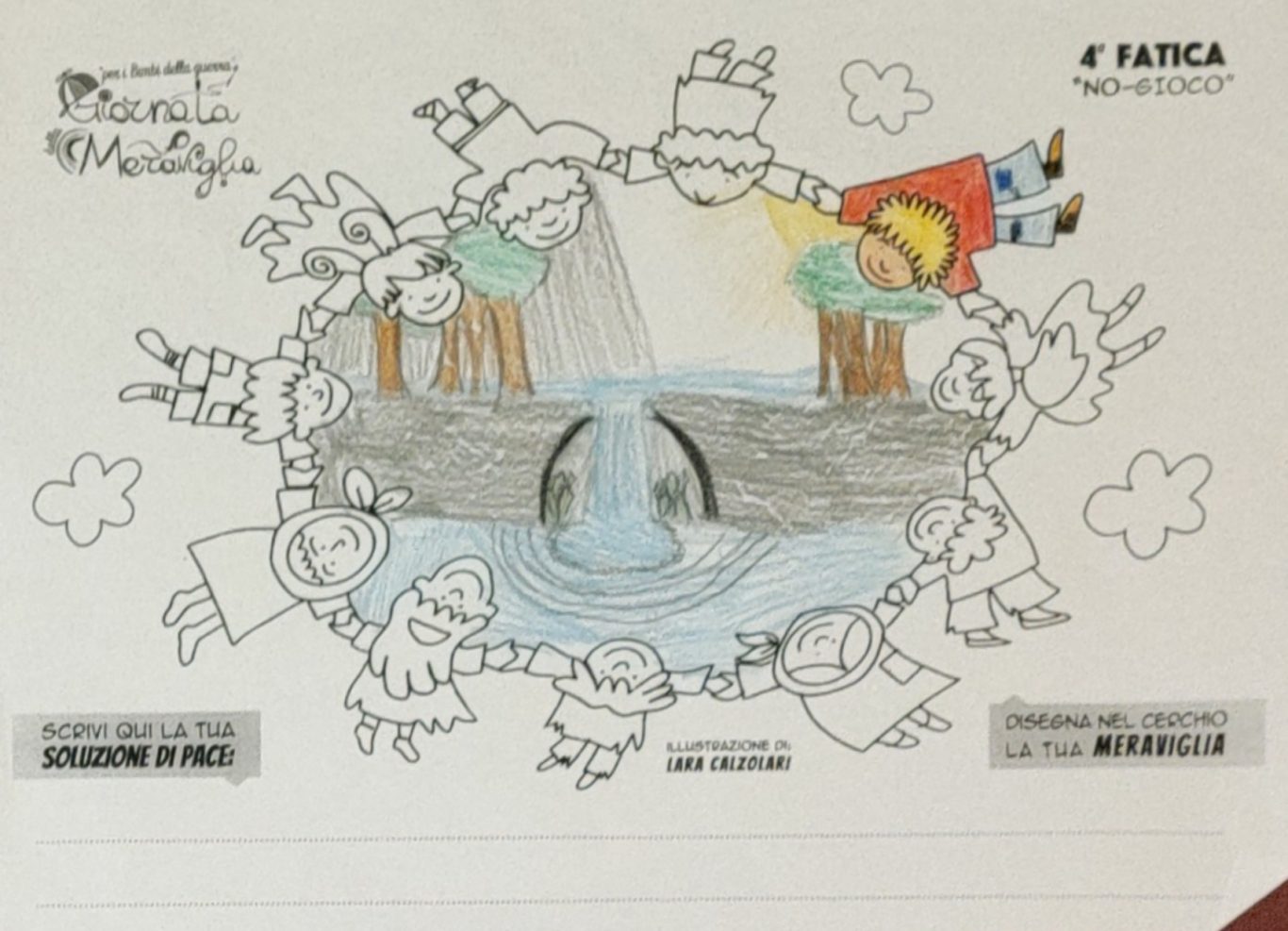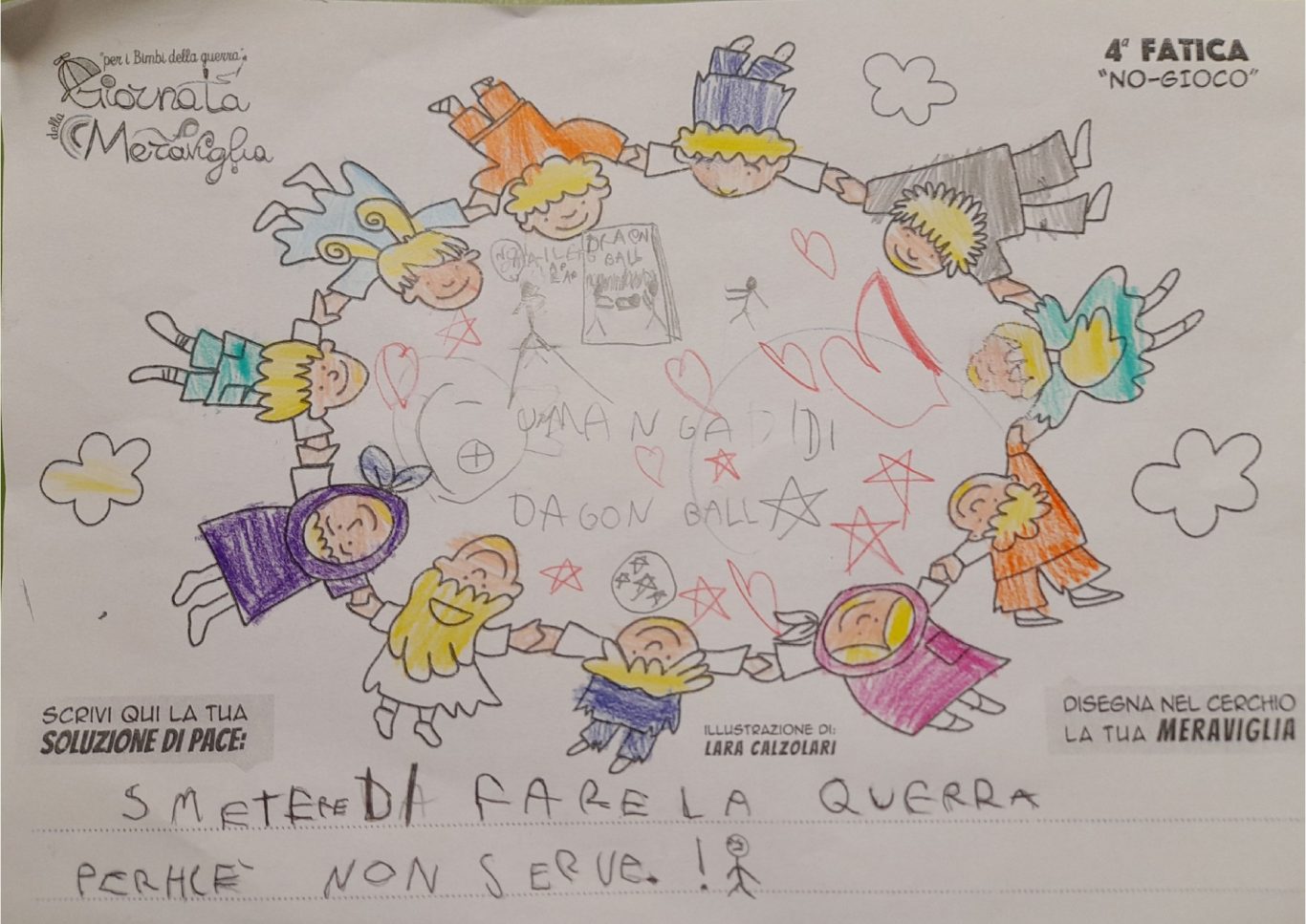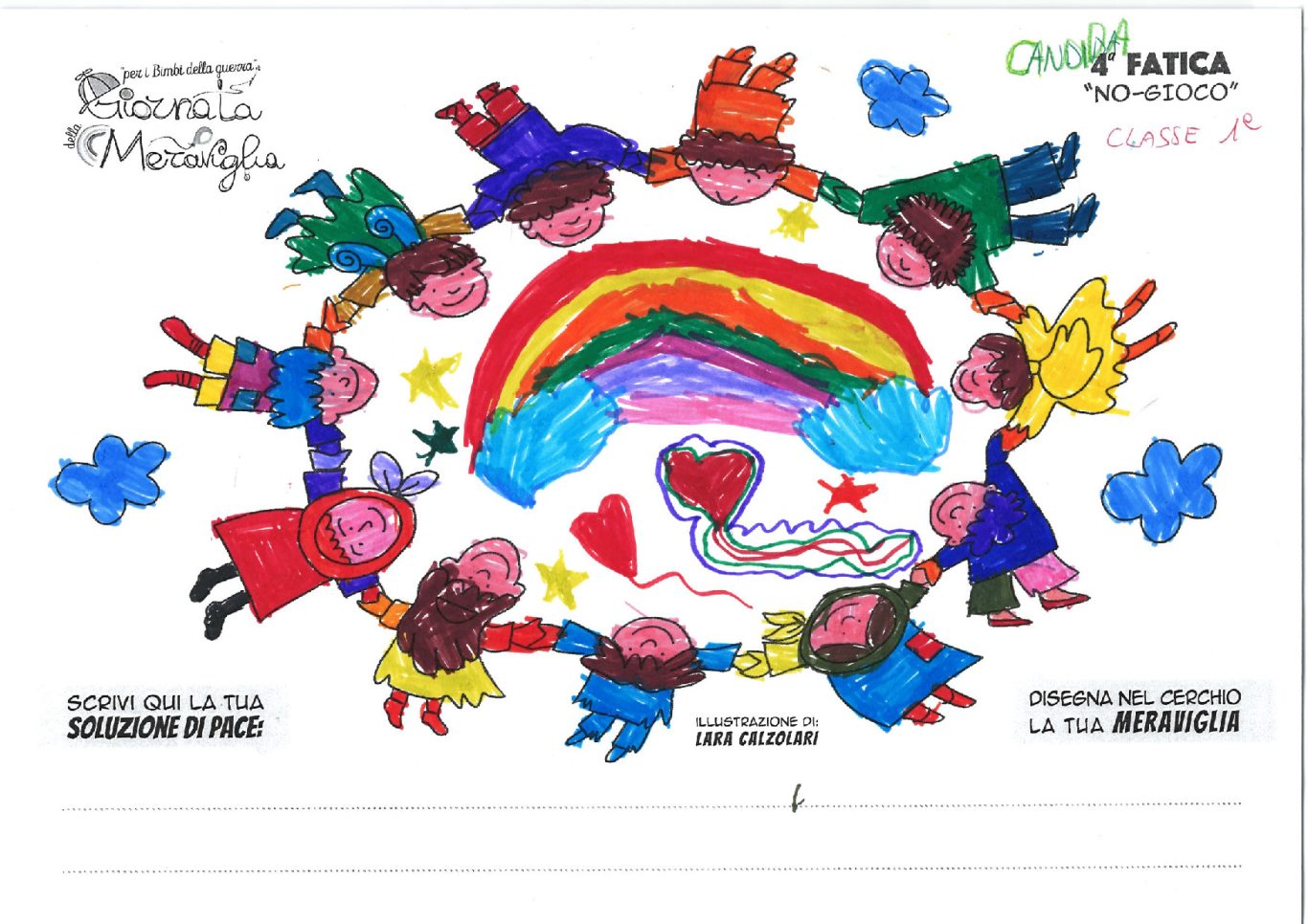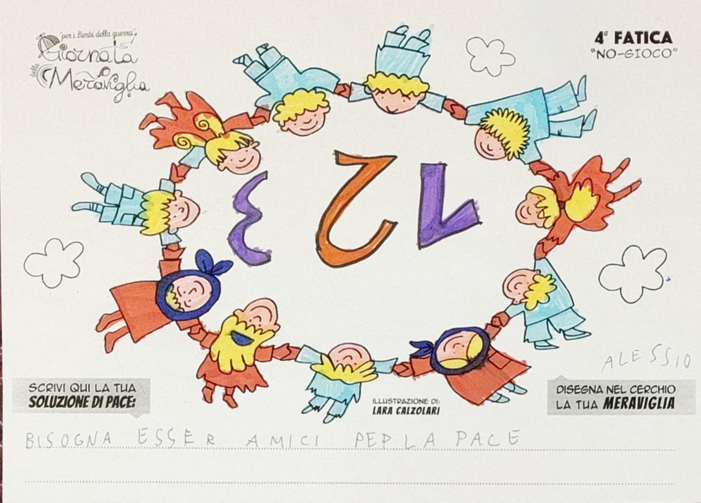 L’opera di sensibilizzazione si si esprime concretamente con la creazione di un DISEGNO DELLA MERAVIGLIA che andrà ad aiutare una delle 12 fatiche. Allo stesso modo chiederemo a tutti i partecipanti di andare a scrivere una “Soluzione di Pace” che possa aiutare anch’essa una delle 12 fatiche dei Bambini della guerra.