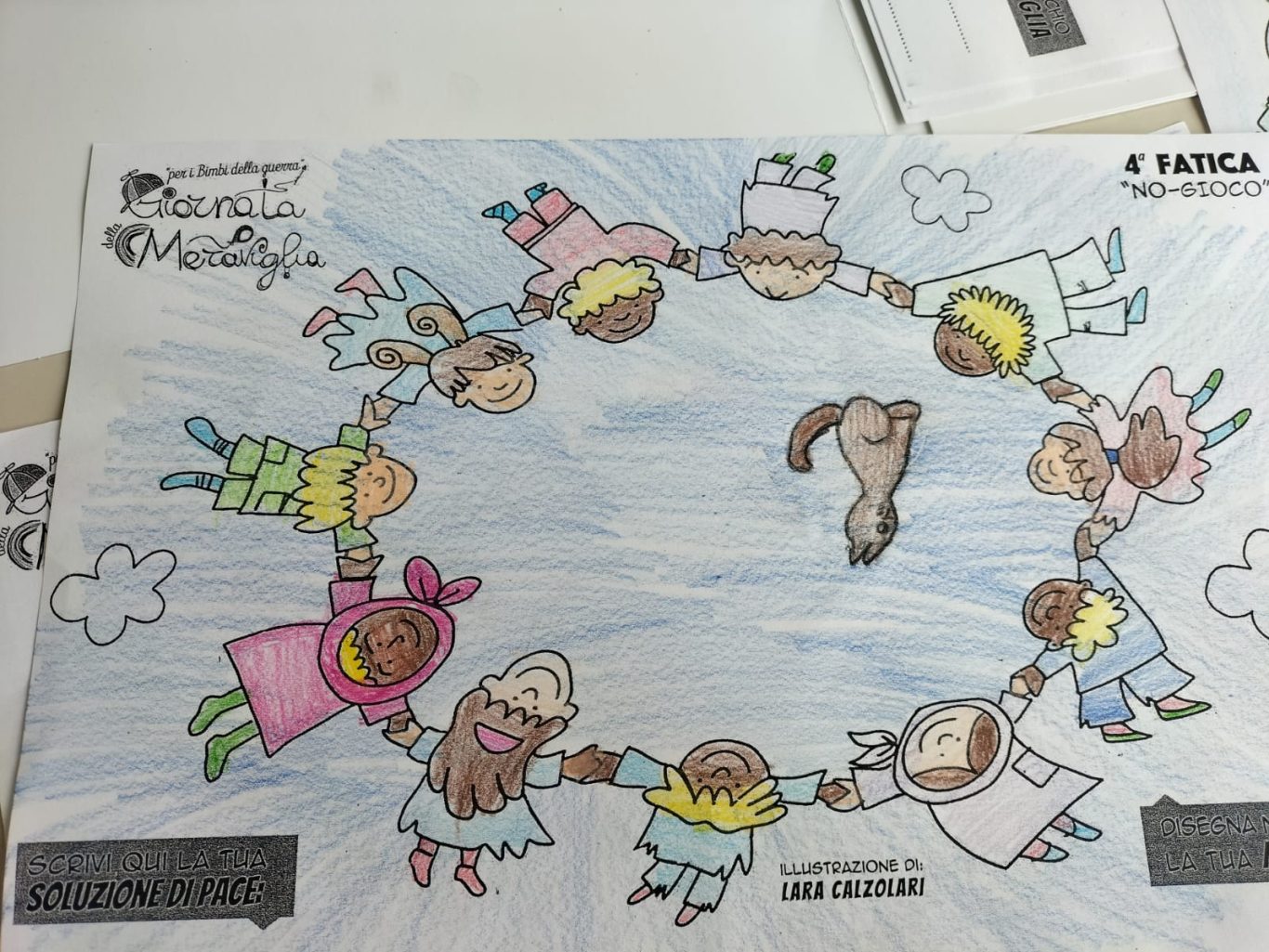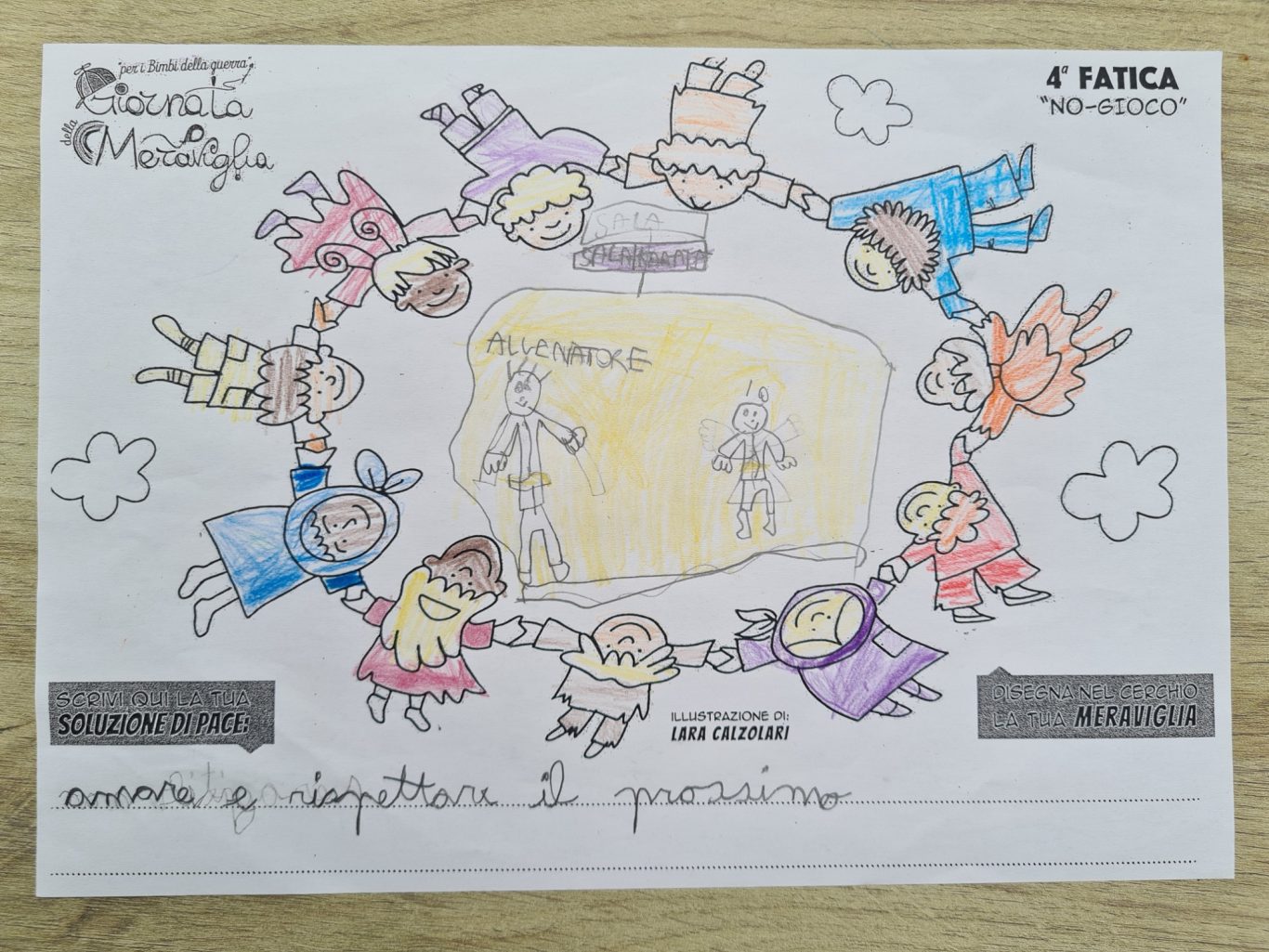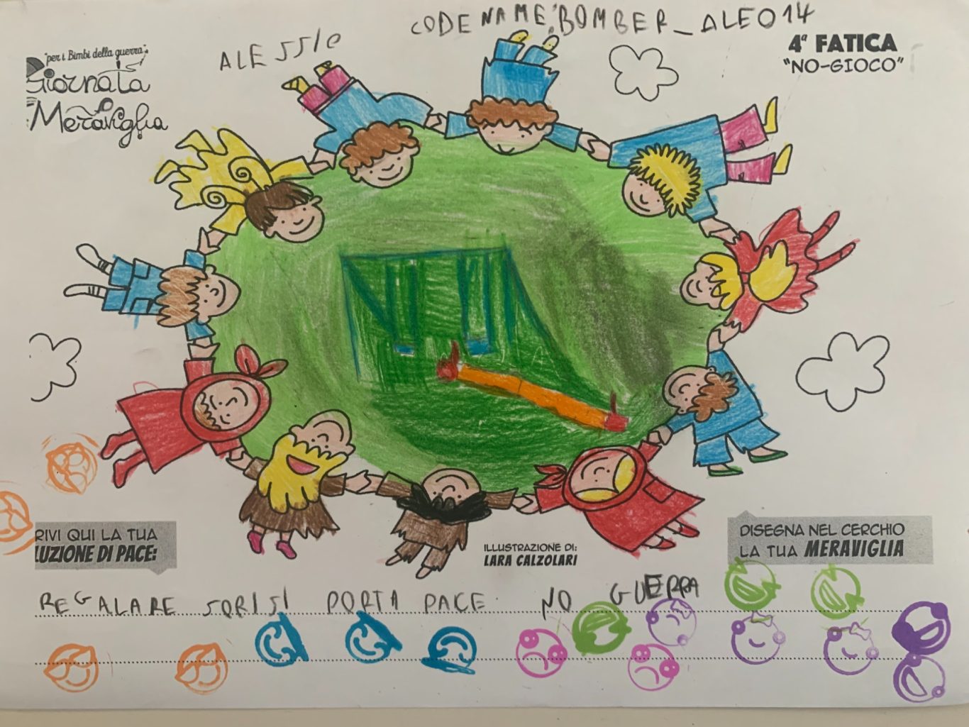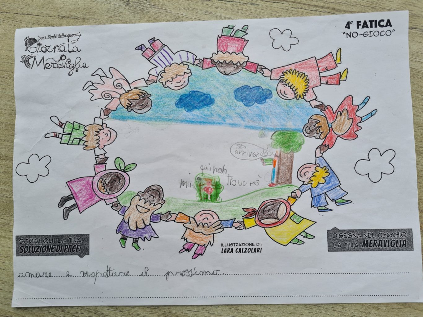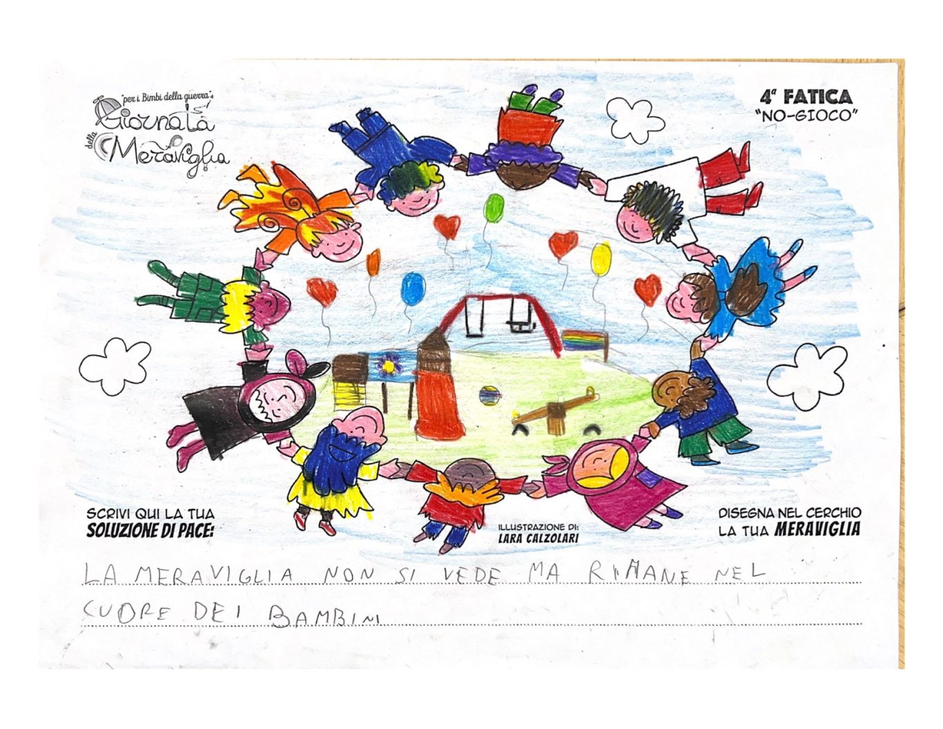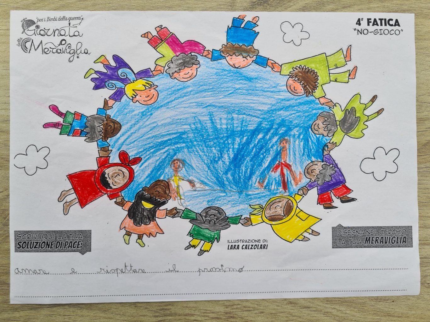L’opera di sensibilizzazione si si esprime concretamente con la creazione di un DISEGNO DELLA MERAVIGLIA che andrà ad aiutare una delle 12 fatiche. Allo stesso modo chiederemo a tutti i partecipanti di andare a scrivere una “Soluzione di Pace” che possa aiutare anch’essa una delle 12 fatiche dei Bambini della guerra.
