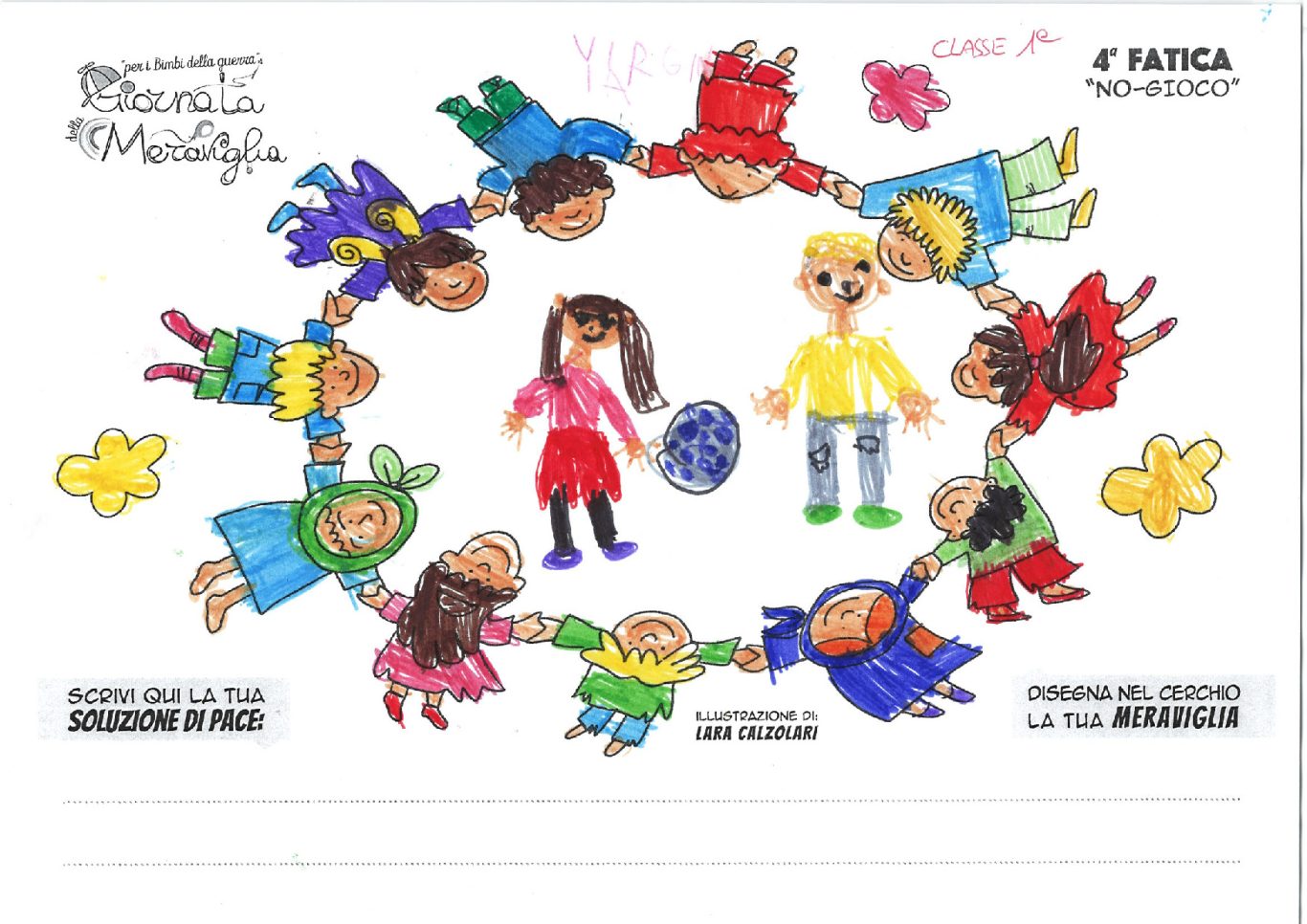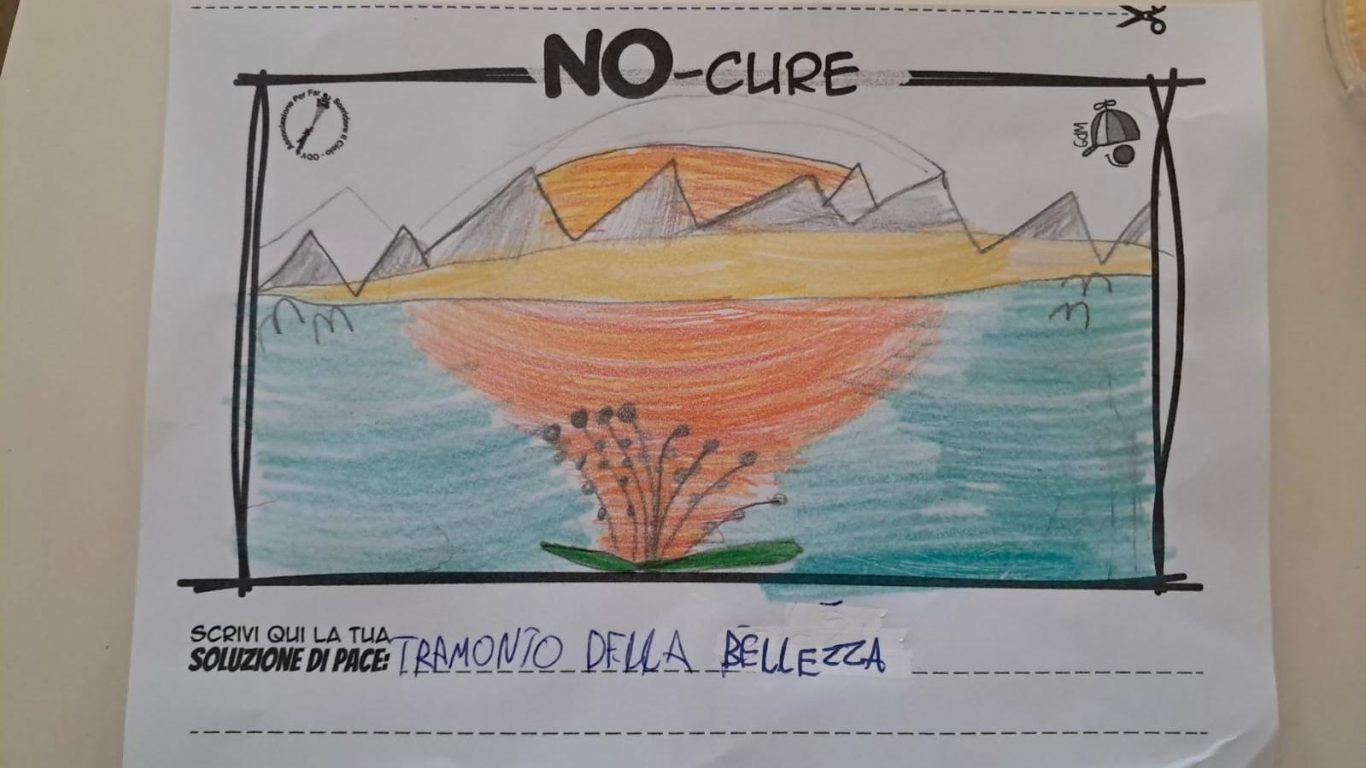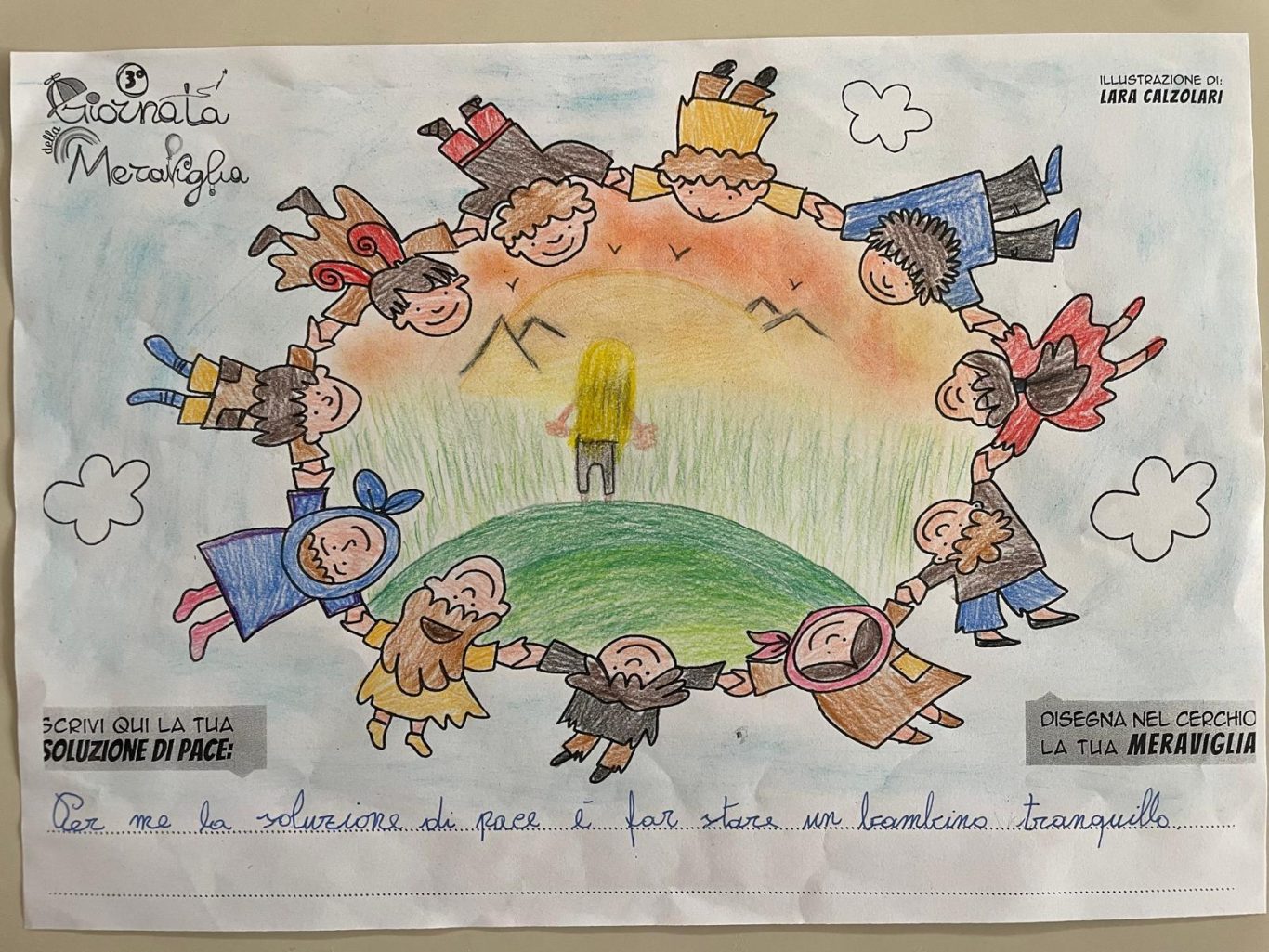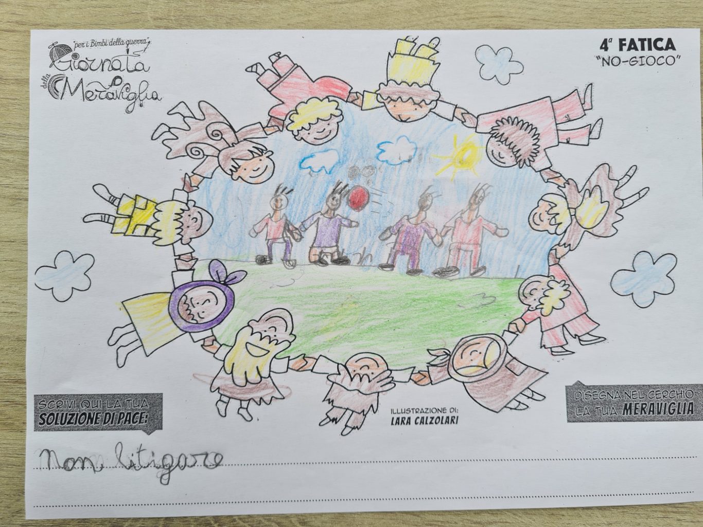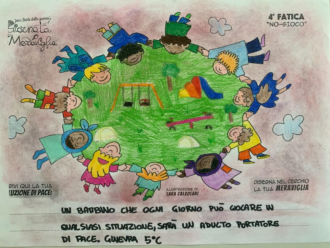 L’opera di sensibilizzazione si si esprime concretamente con la creazione di un DISEGNO DELLA MERAVIGLIA che andrà ad aiutare una delle 12 fatiche. Allo stesso modo chiederemo a tutti i partecipanti di andare a scrivere una “Soluzione di Pace” che possa aiutare anch’essa una delle 12 fatiche dei Bambini della guerra.