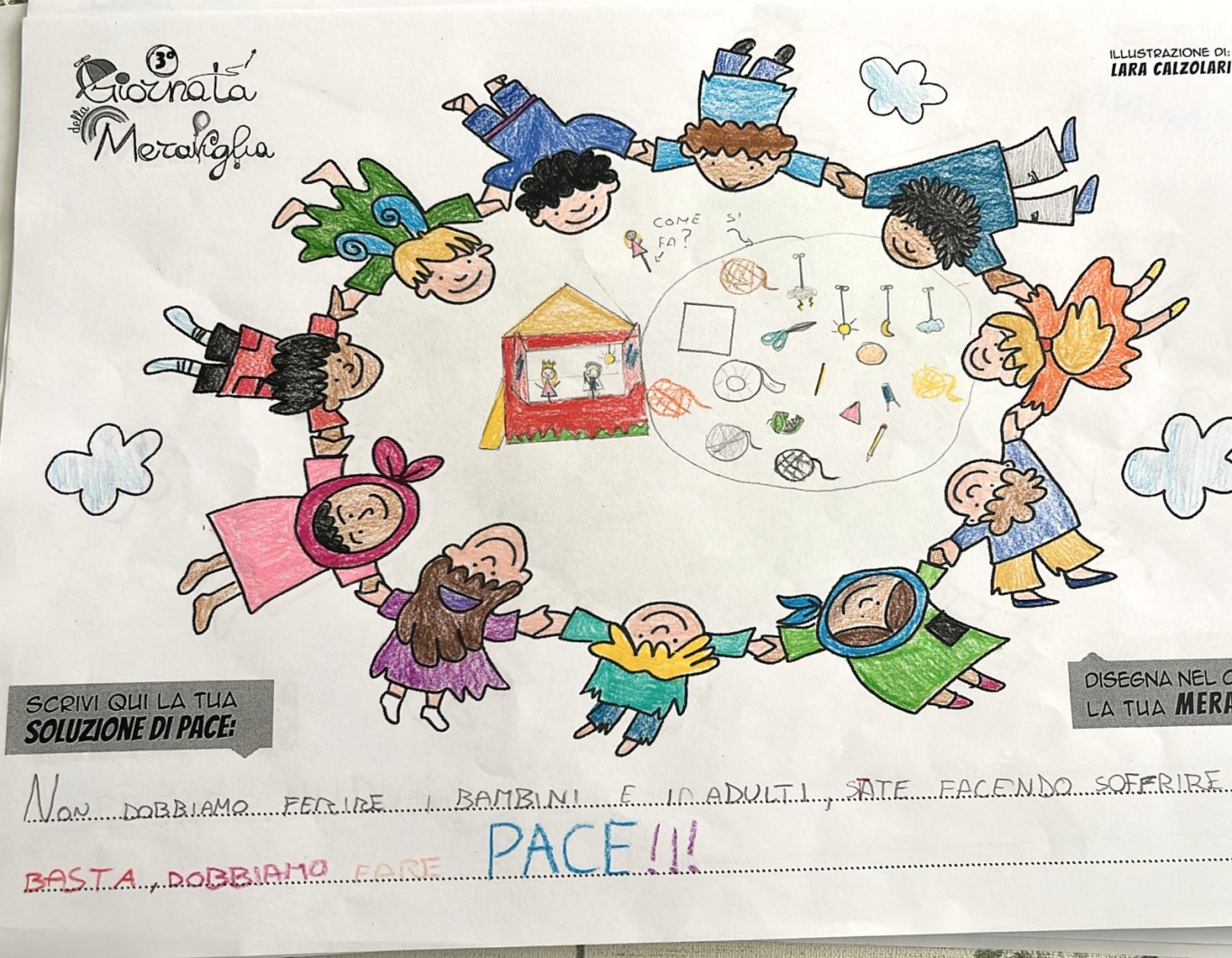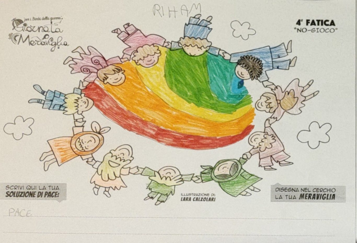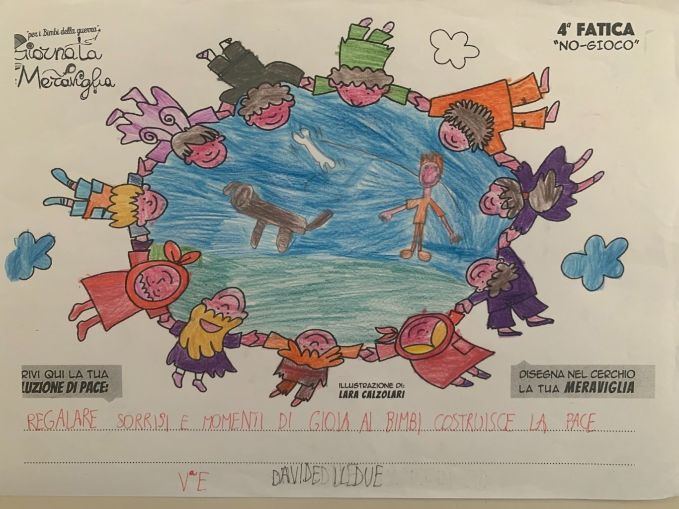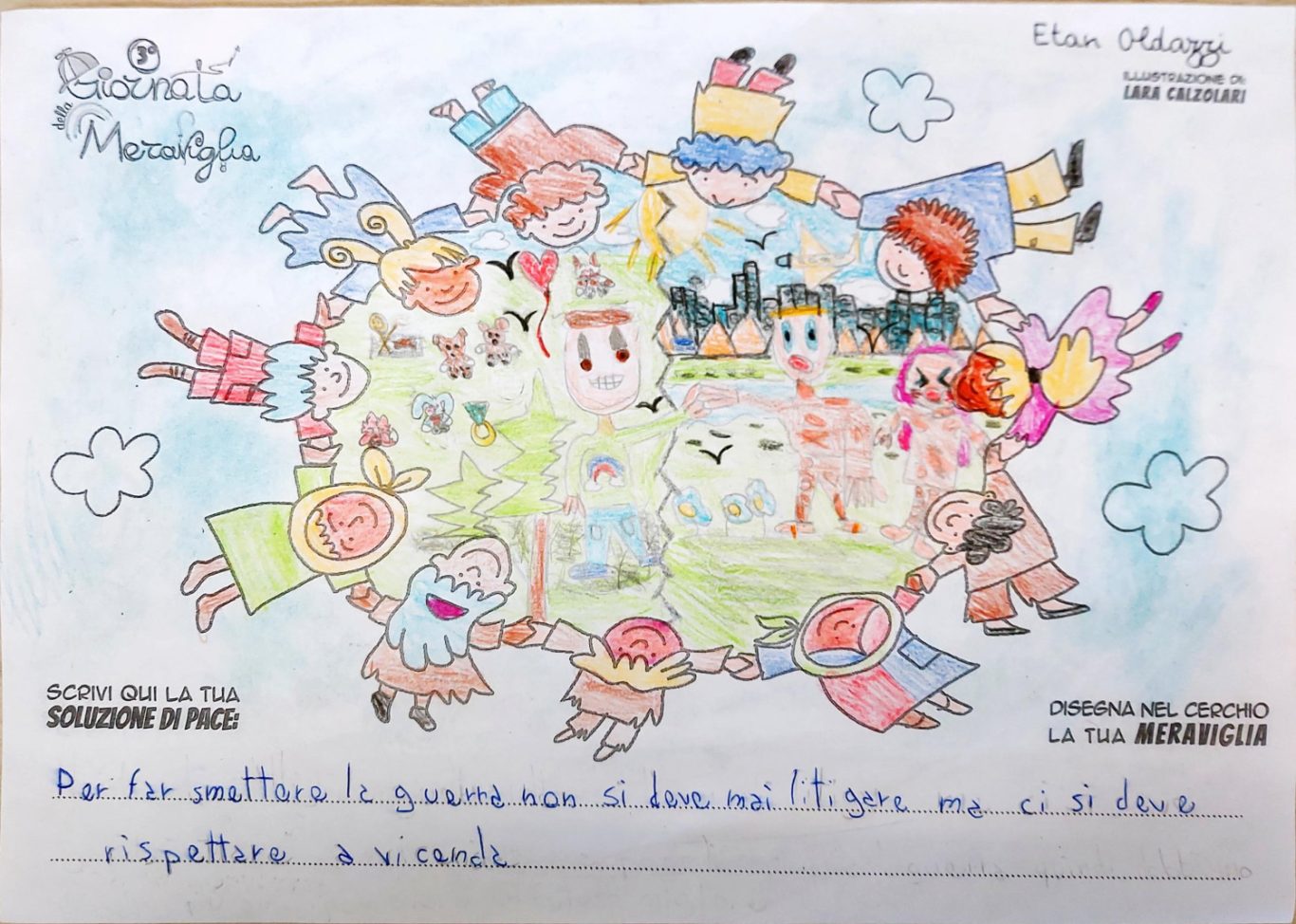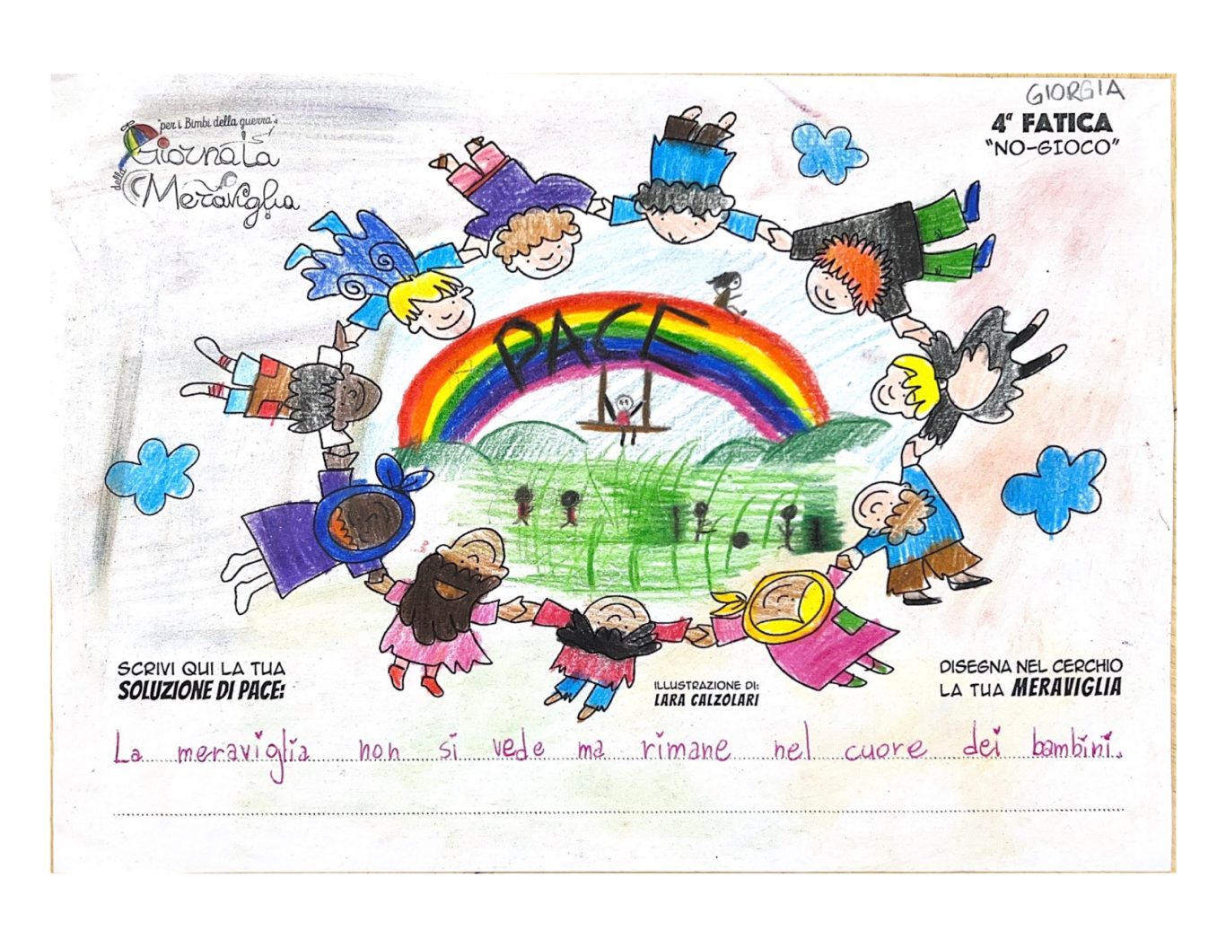 L’opera di sensibilizzazione si si esprime concretamente con la creazione di un DISEGNO DELLA MERAVIGLIA che andrà ad aiutare una delle 12 fatiche. Allo stesso modo chiederemo a tutti i partecipanti di andare a scrivere una “Soluzione di Pace” che possa aiutare anch’essa una delle 12 fatiche dei Bambini della guerra.