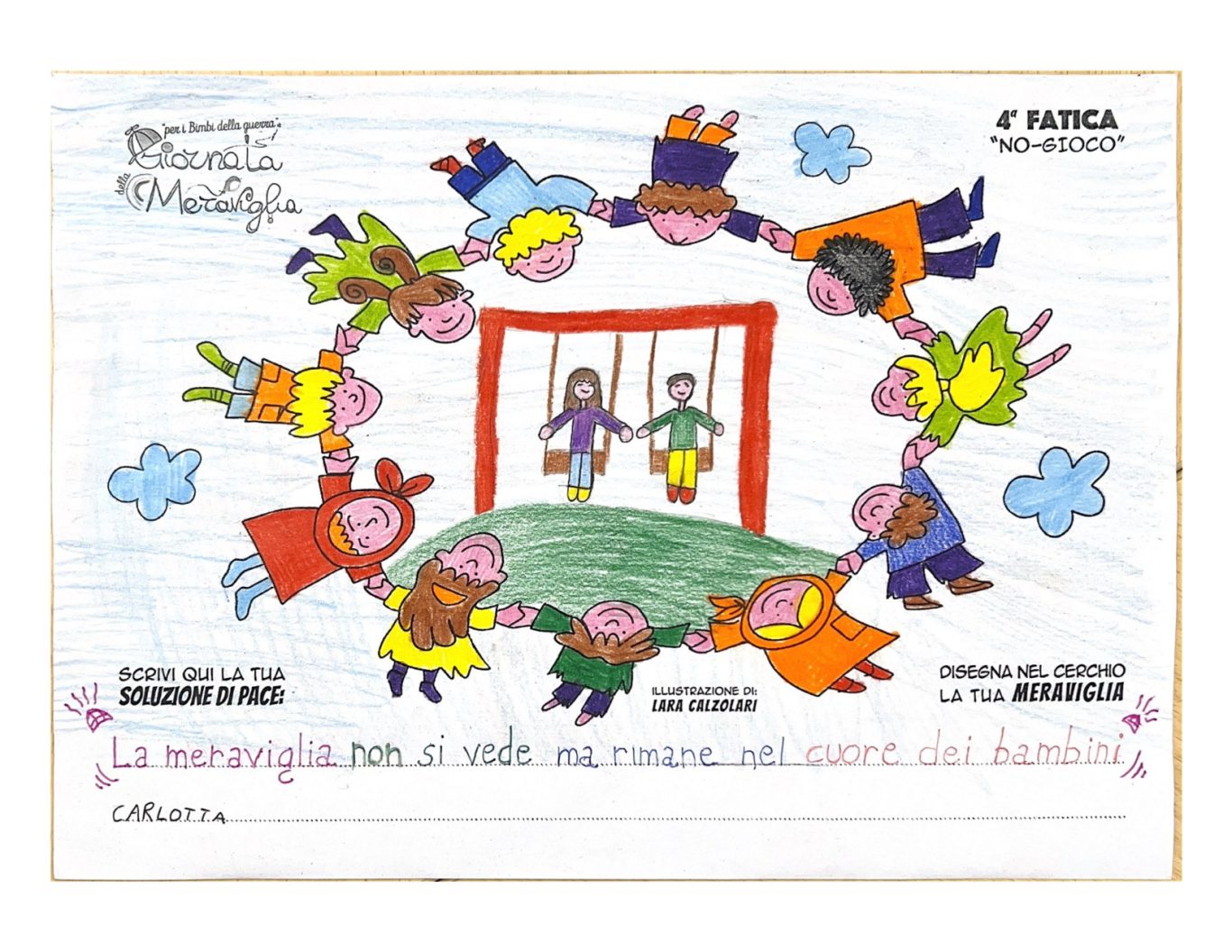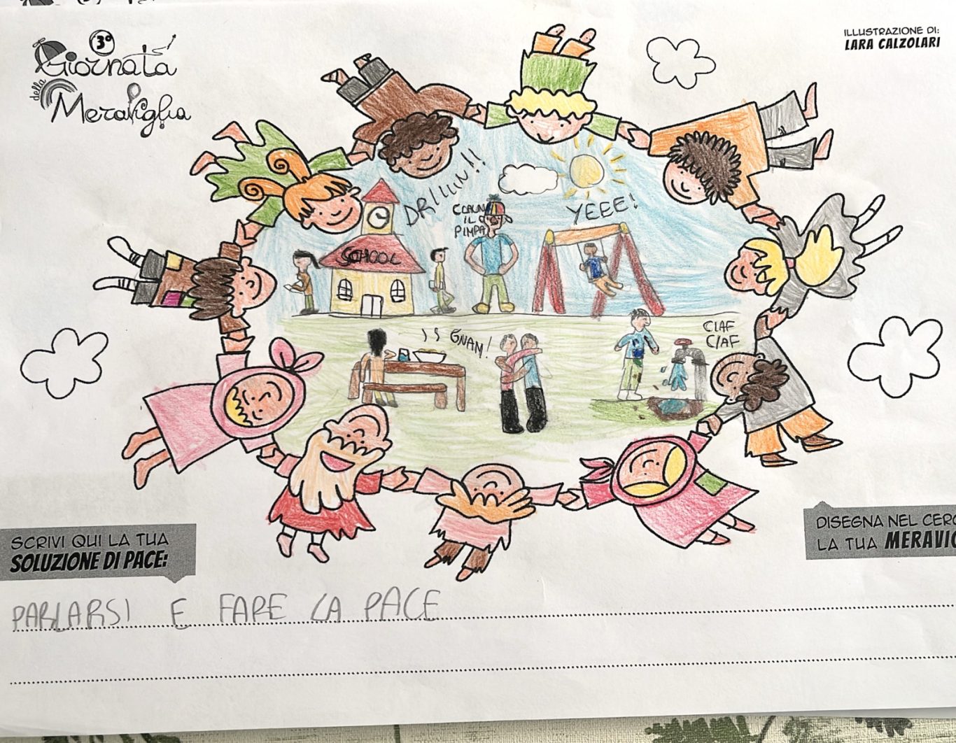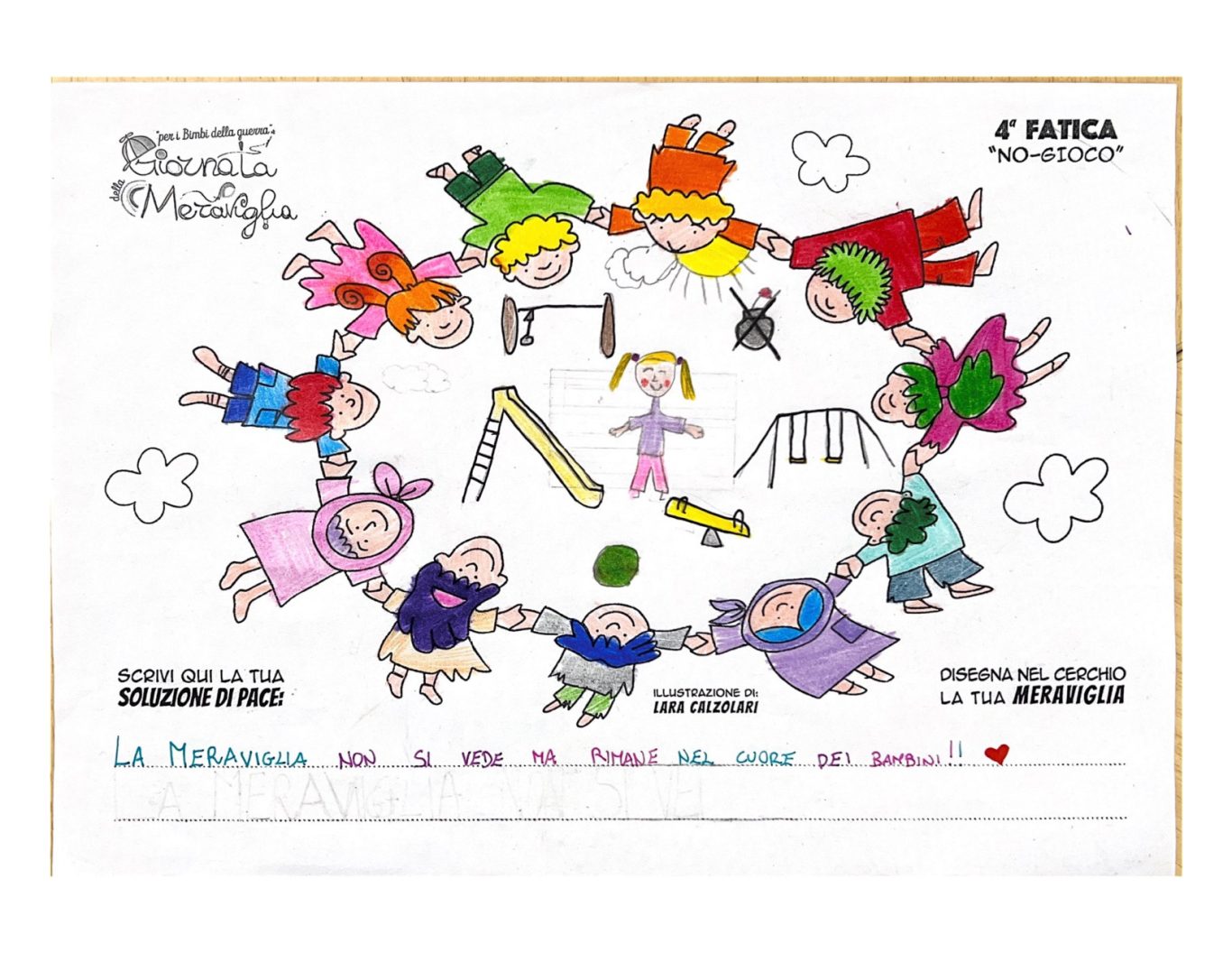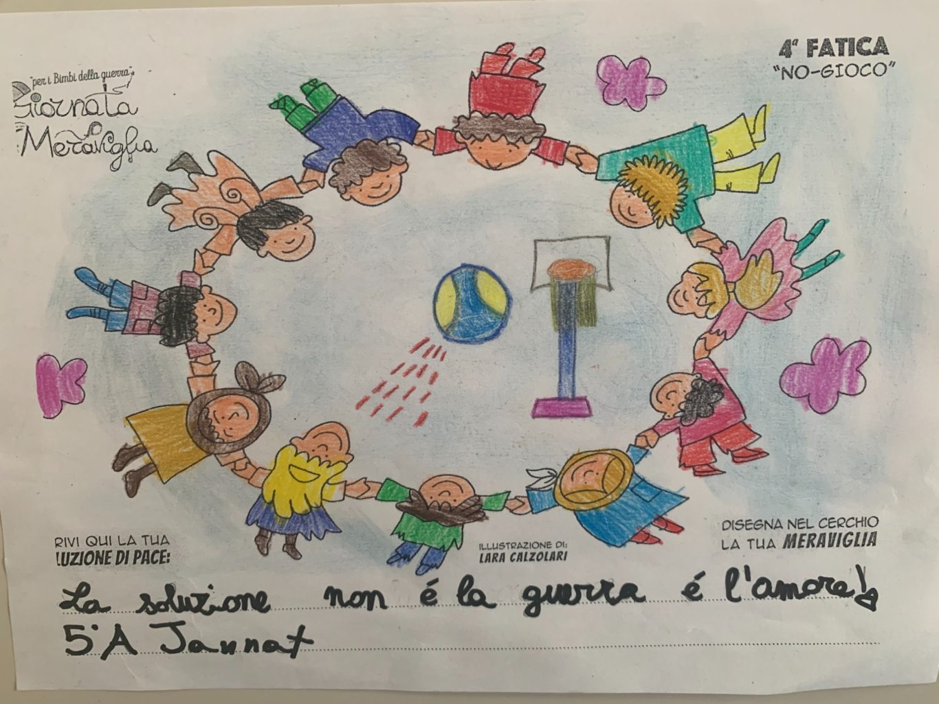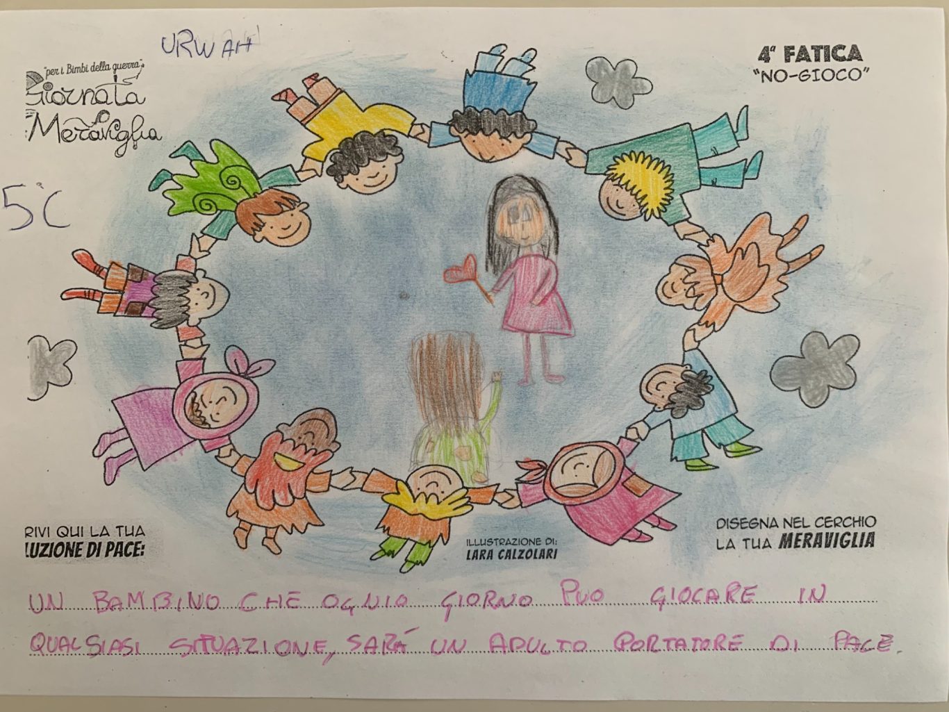 L’opera di sensibilizzazione si si esprime concretamente con la creazione di un DISEGNO DELLA MERAVIGLIA che andrà ad aiutare una delle 12 fatiche. Allo stesso modo chiederemo a tutti i partecipanti di andare a scrivere una “Soluzione di Pace” che possa aiutare anch’essa una delle 12 fatiche dei Bambini della guerra.