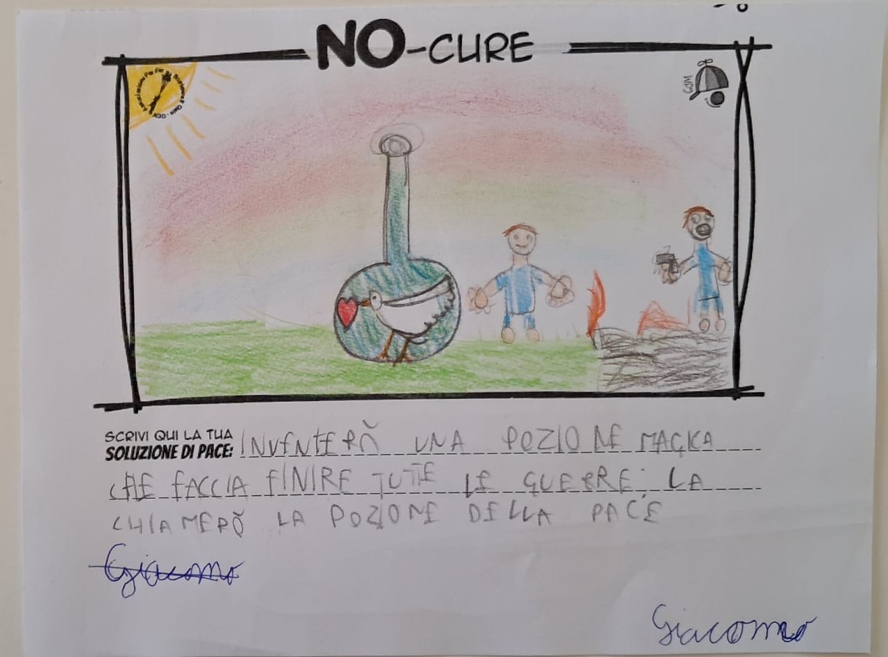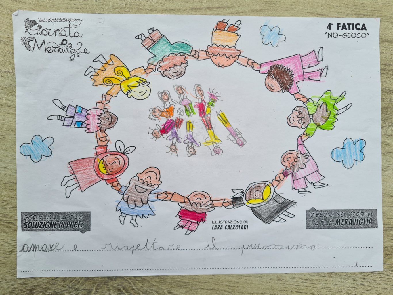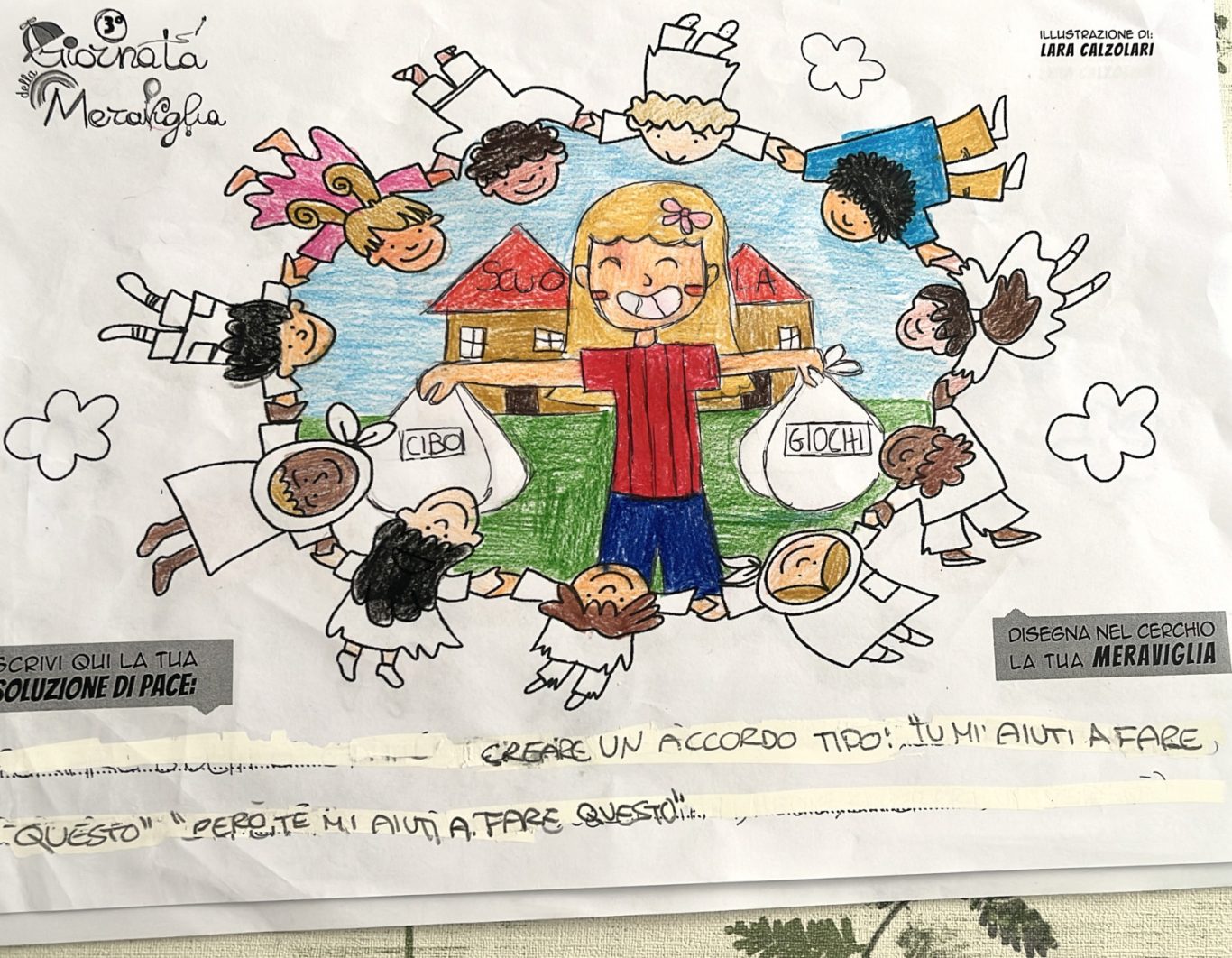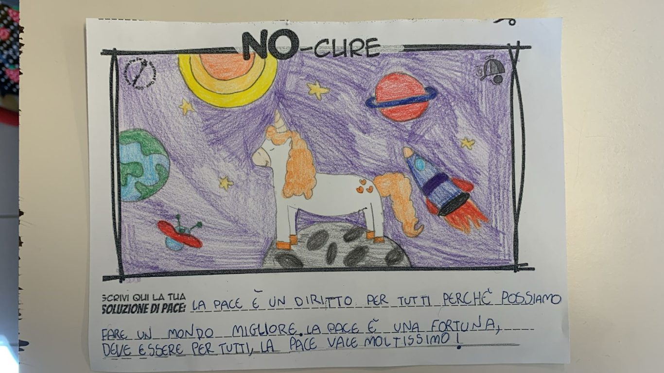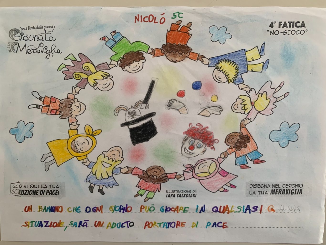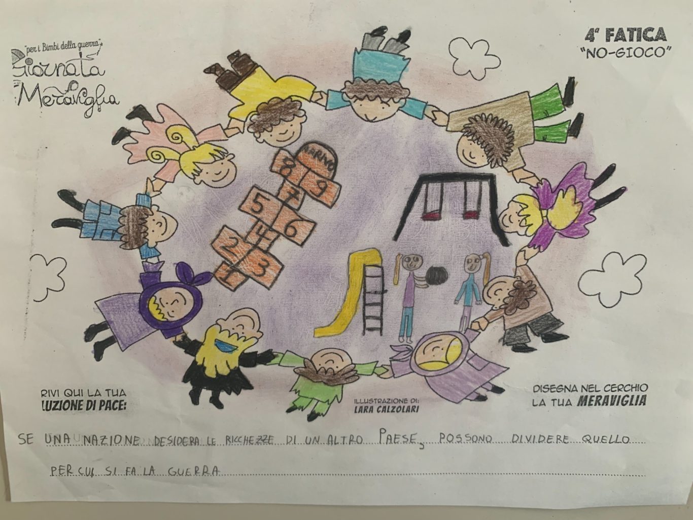 L’opera di sensibilizzazione si si esprime concretamente con la creazione di un DISEGNO DELLA MERAVIGLIA che andrà ad aiutare una delle 12 fatiche. Allo stesso modo chiederemo a tutti i partecipanti di andare a scrivere una “Soluzione di Pace” che possa aiutare anch’essa una delle 12 fatiche dei Bambini della guerra.
