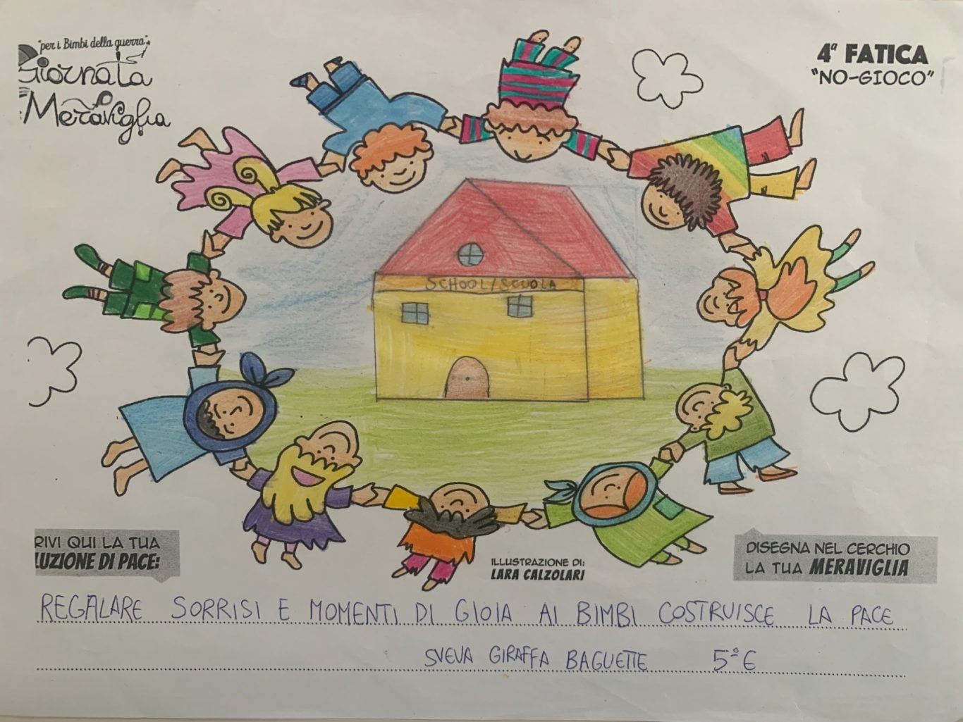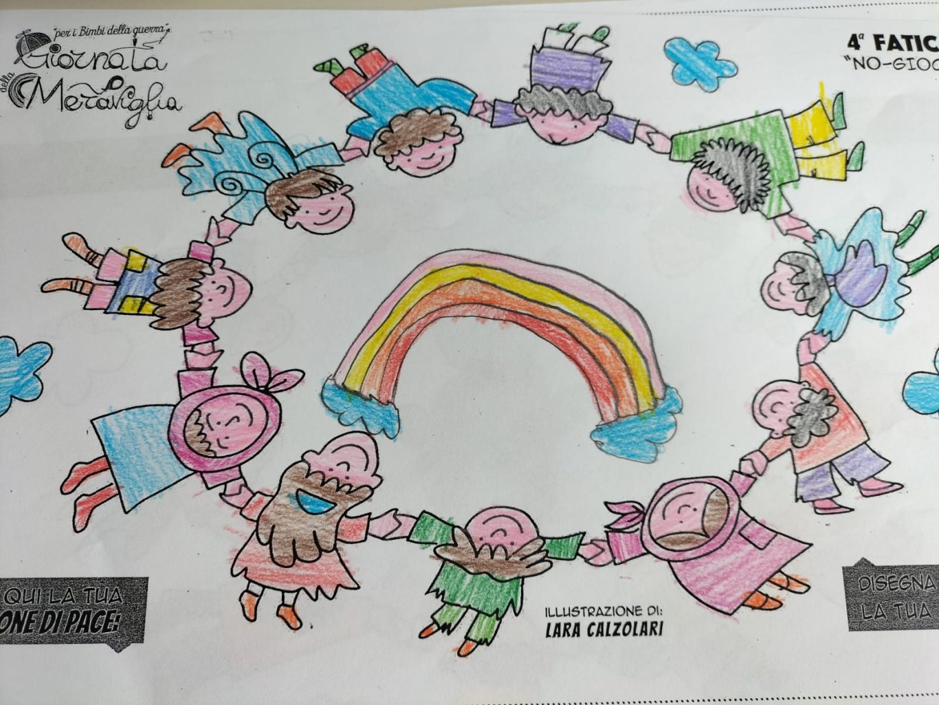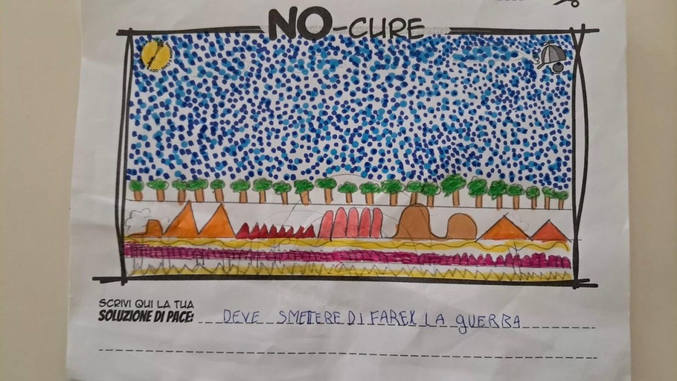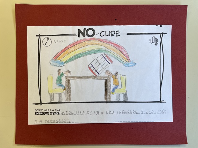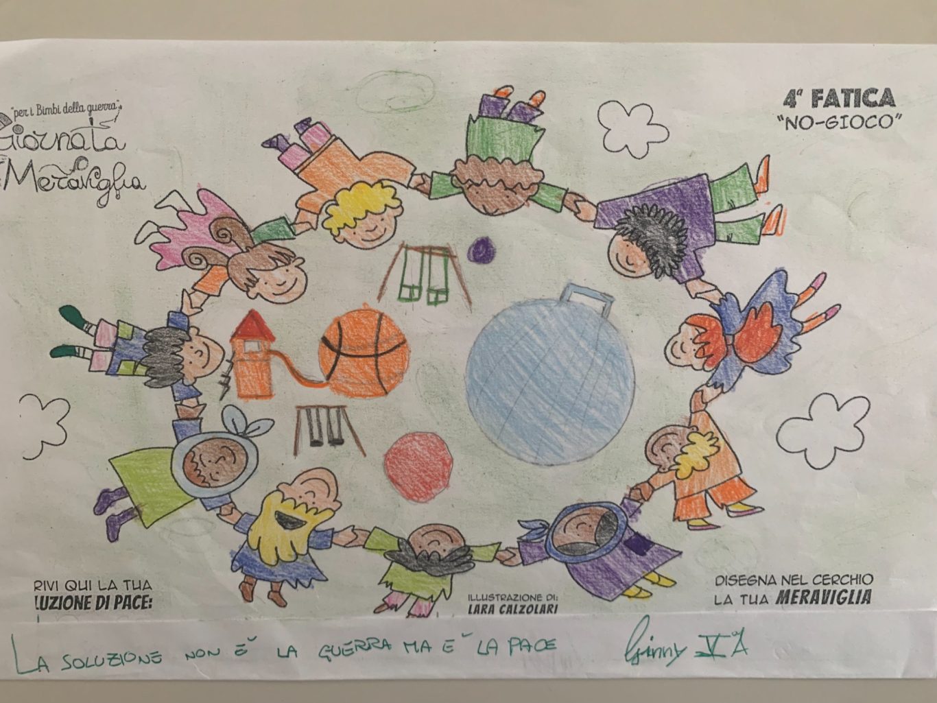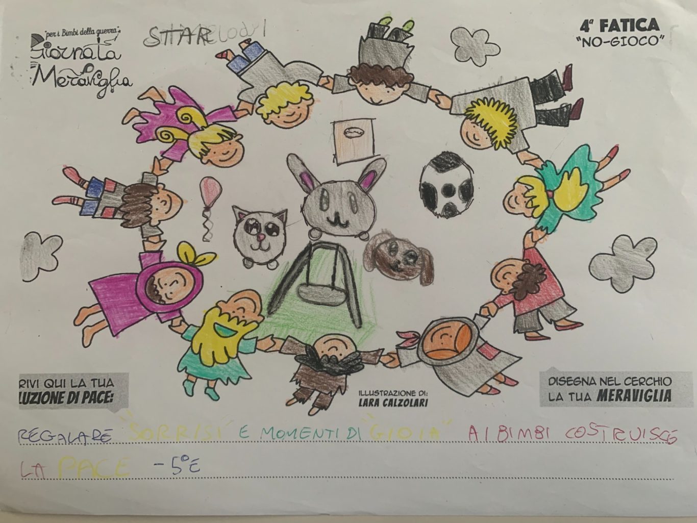 L’opera di sensibilizzazione si si esprime concretamente con la creazione di un DISEGNO DELLA MERAVIGLIA che andrà ad aiutare una delle 12 fatiche. Allo stesso modo chiederemo a tutti i partecipanti di andare a scrivere una “Soluzione di Pace” che possa aiutare anch’essa una delle 12 fatiche dei Bambini della guerra.