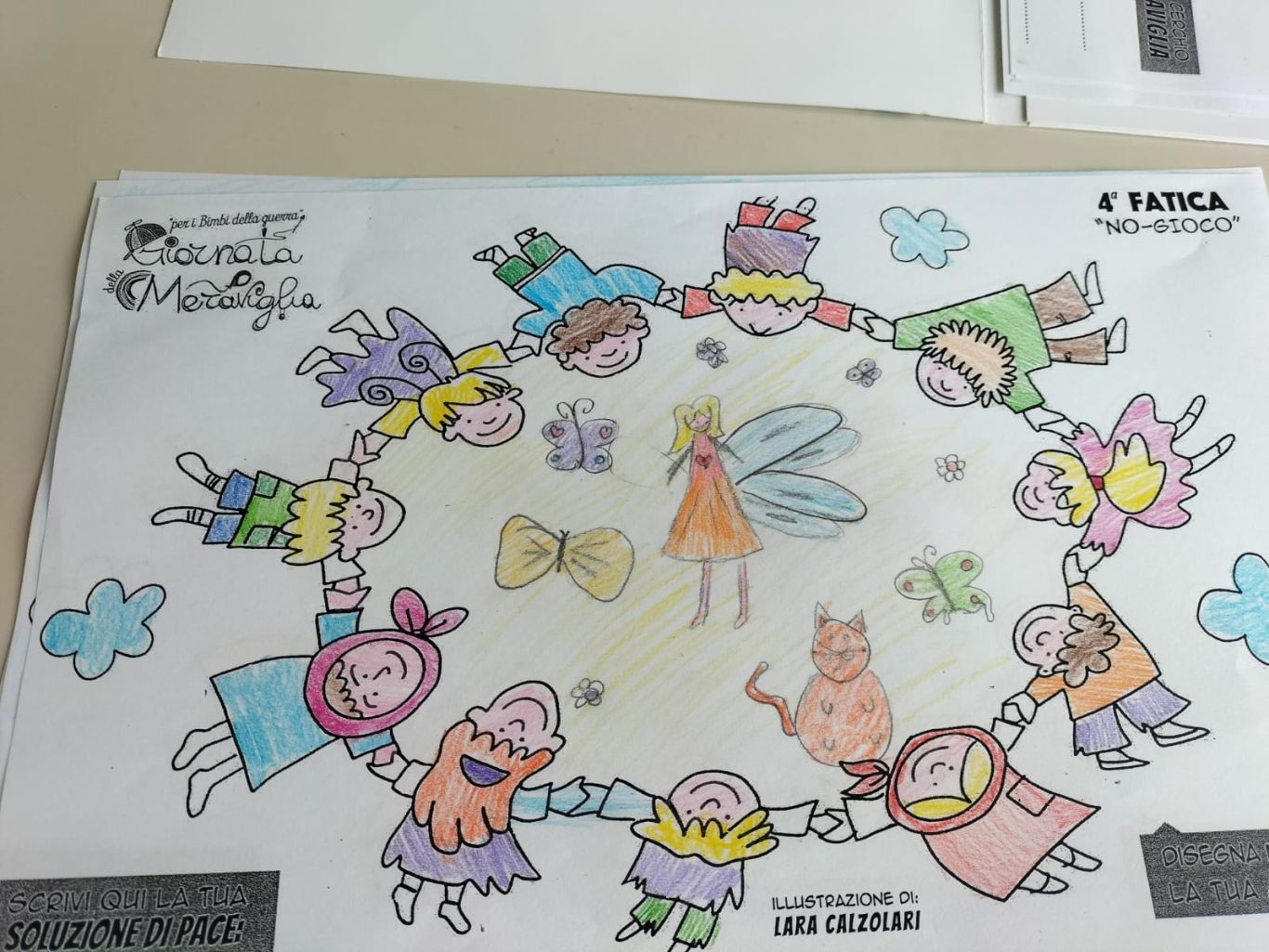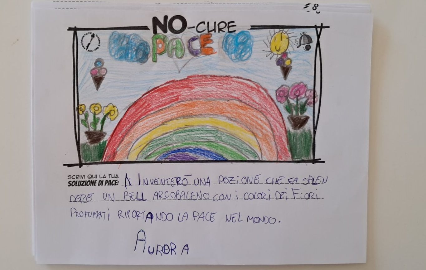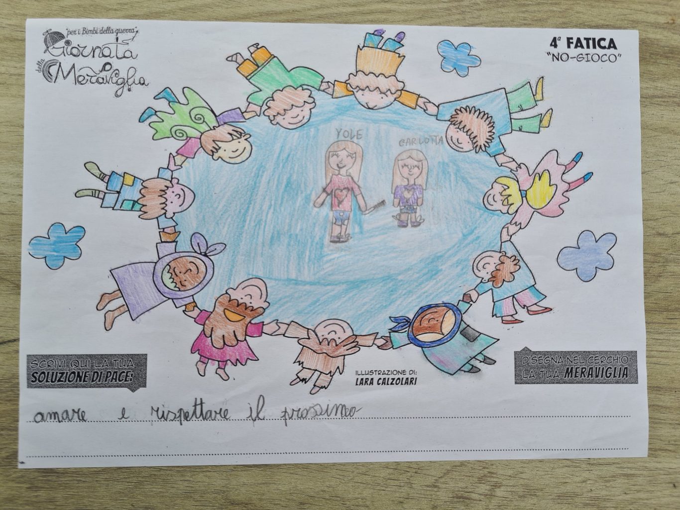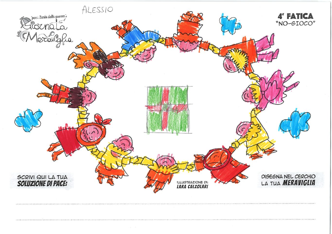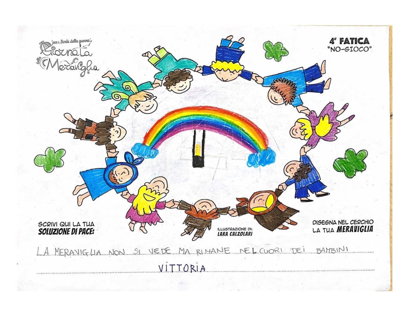 L’opera di sensibilizzazione si si esprime concretamente con la creazione di un DISEGNO DELLA MERAVIGLIA che andrà ad aiutare una delle 12 fatiche. Allo stesso modo chiederemo a tutti i partecipanti di andare a scrivere una “Soluzione di Pace” che possa aiutare anch’essa una delle 12 fatiche dei Bambini della guerra.