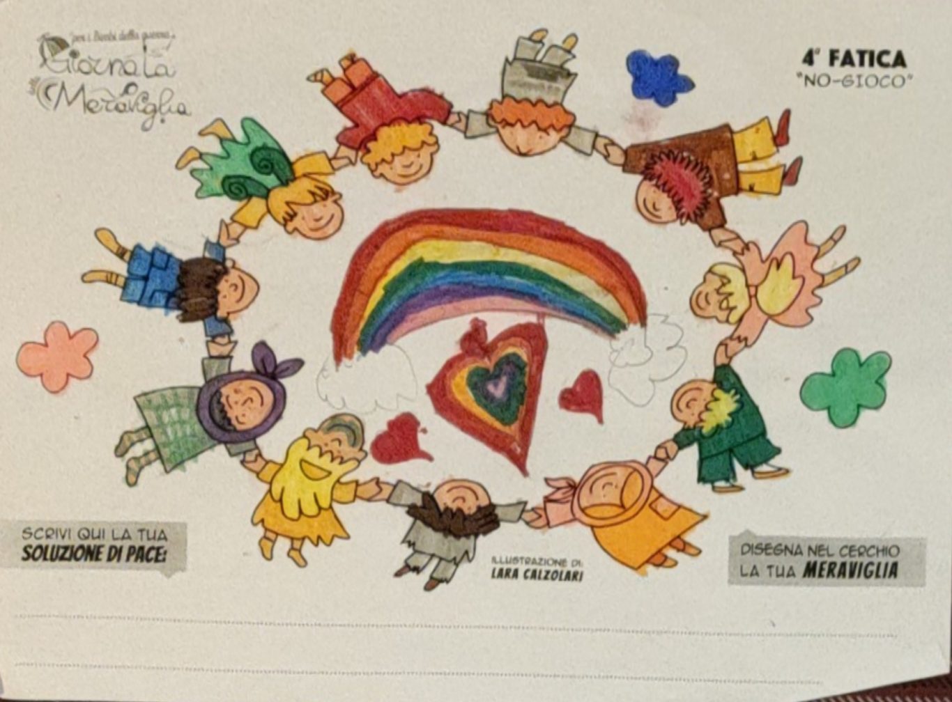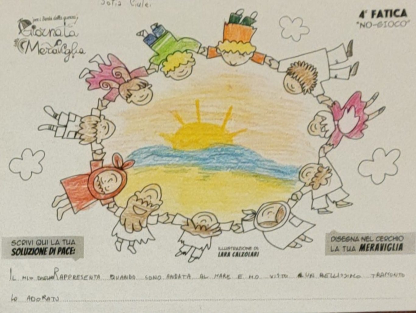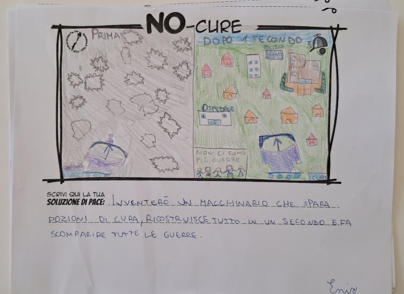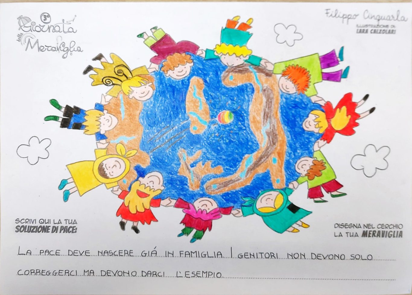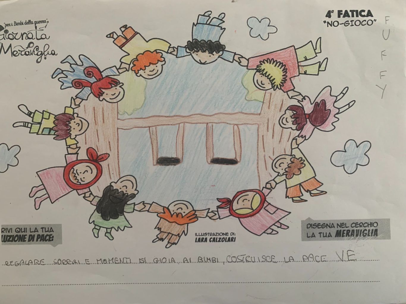 L’opera di sensibilizzazione si si esprime concretamente con la creazione di un DISEGNO DELLA MERAVIGLIA che andrà ad aiutare una delle 12 fatiche. Allo stesso modo chiederemo a tutti i partecipanti di andare a scrivere una “Soluzione di Pace” che possa aiutare anch’essa una delle 12 fatiche dei Bambini della guerra.