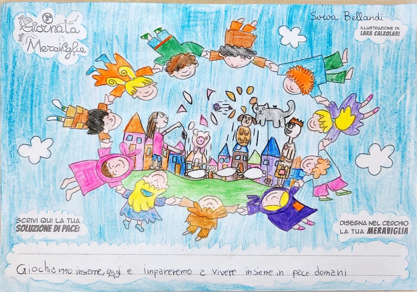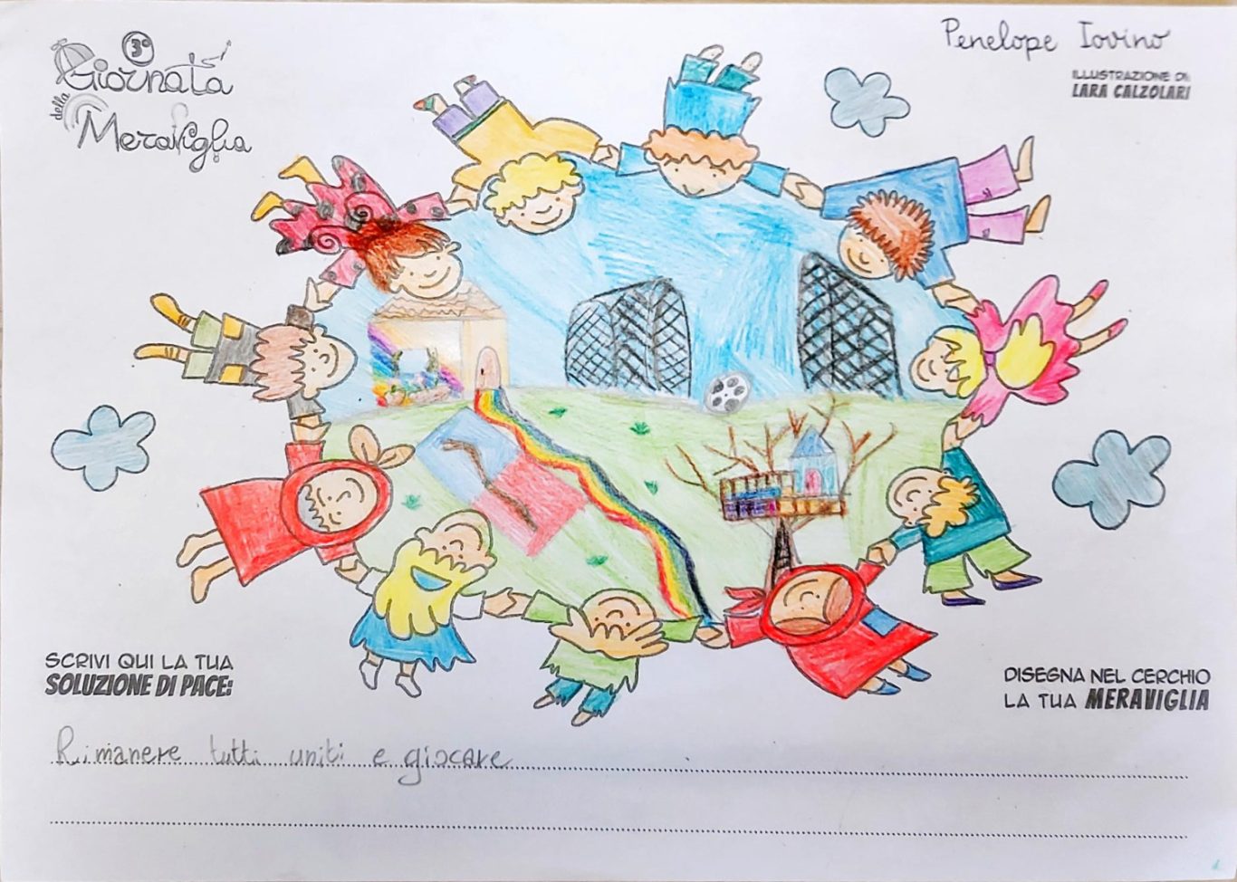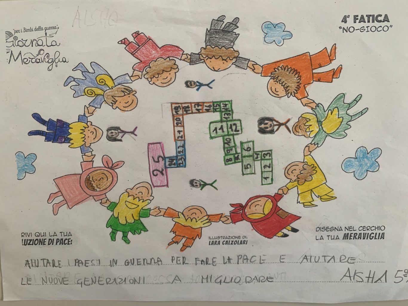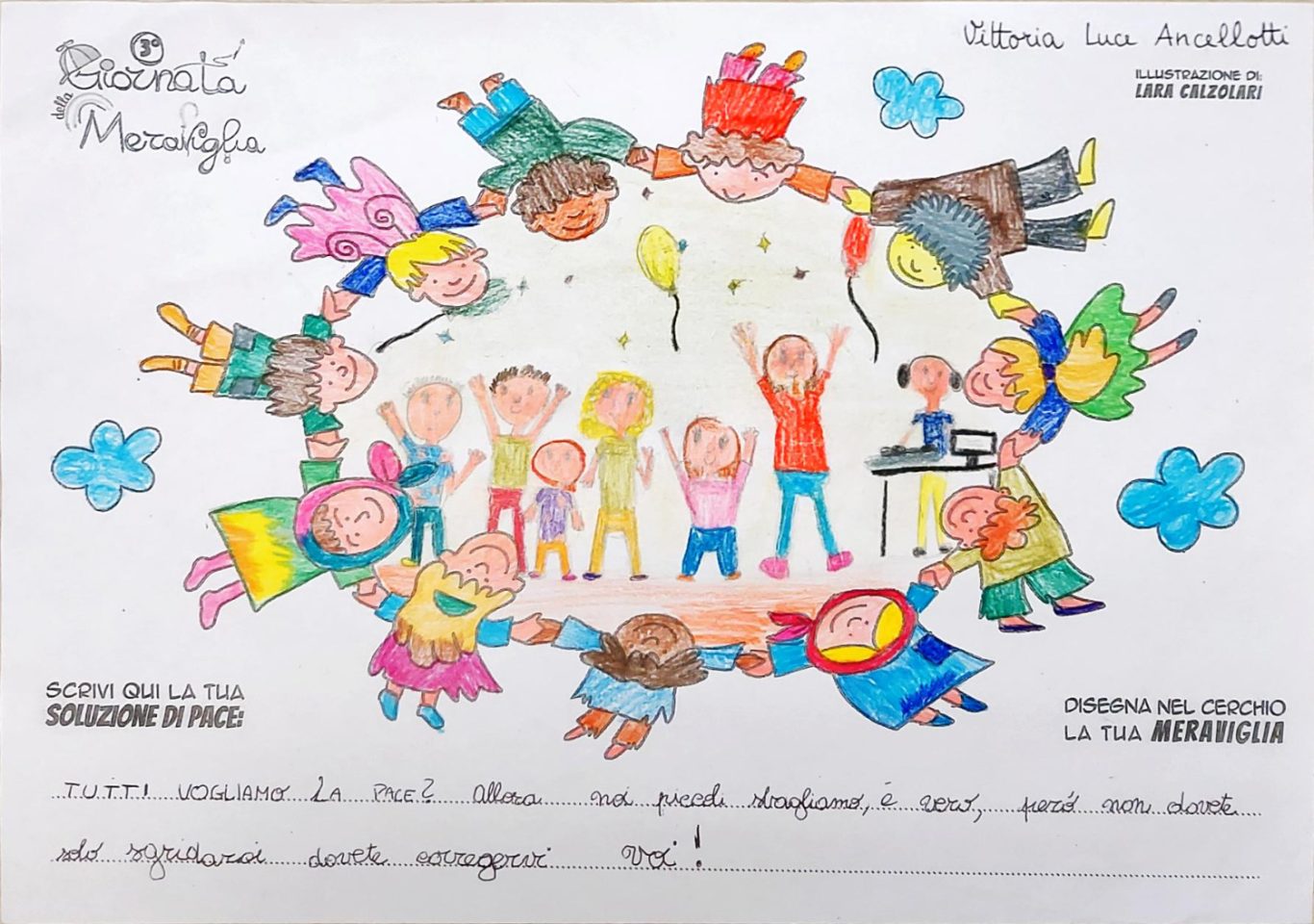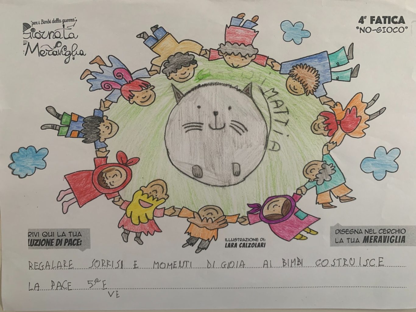 L’opera di sensibilizzazione si si esprime concretamente con la creazione di un DISEGNO DELLA MERAVIGLIA che andrà ad aiutare una delle 12 fatiche. Allo stesso modo chiederemo a tutti i partecipanti di andare a scrivere una “Soluzione di Pace” che possa aiutare anch’essa una delle 12 fatiche dei Bambini della guerra.