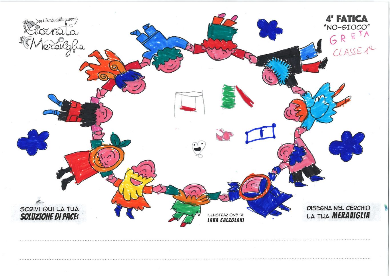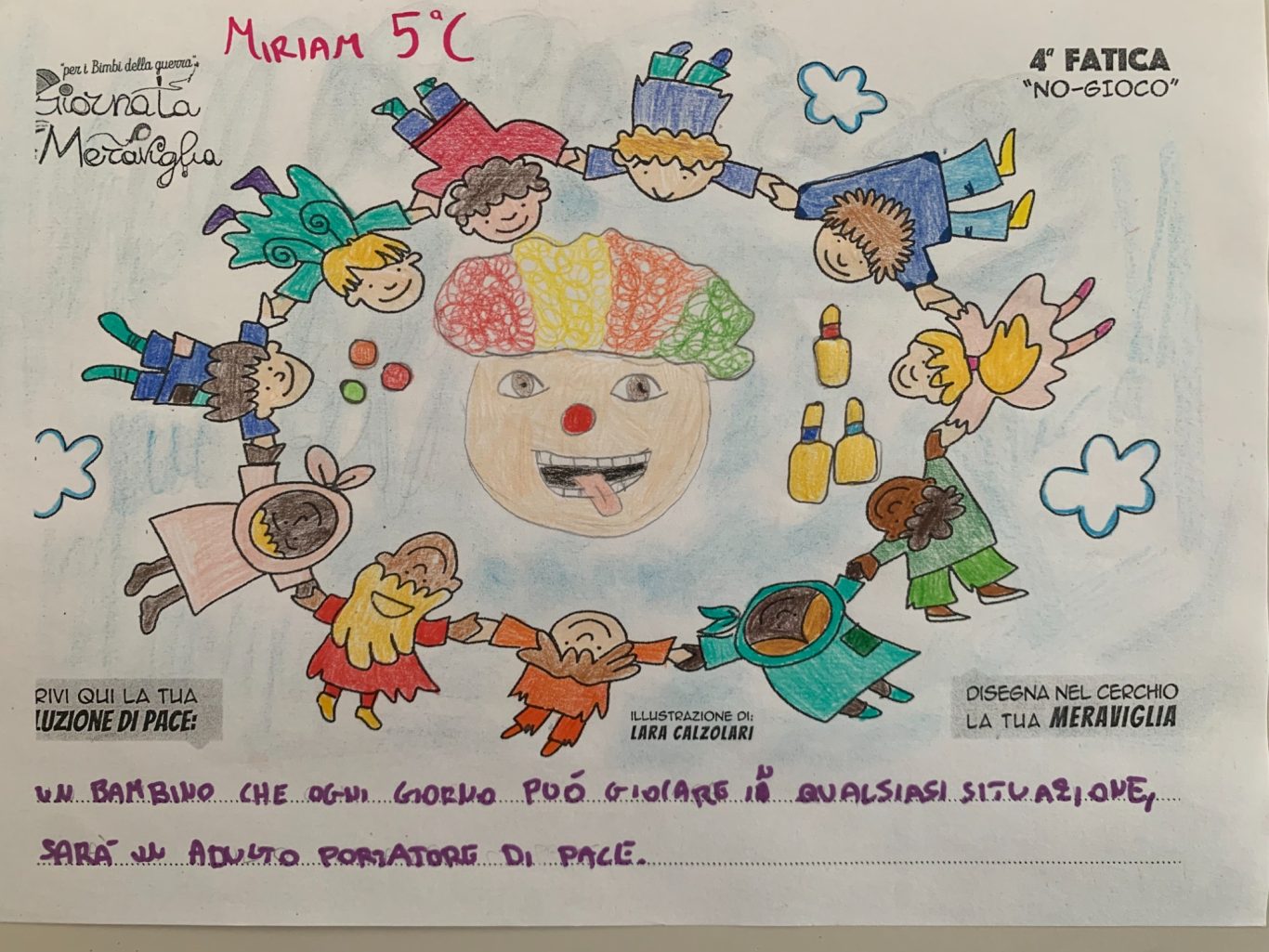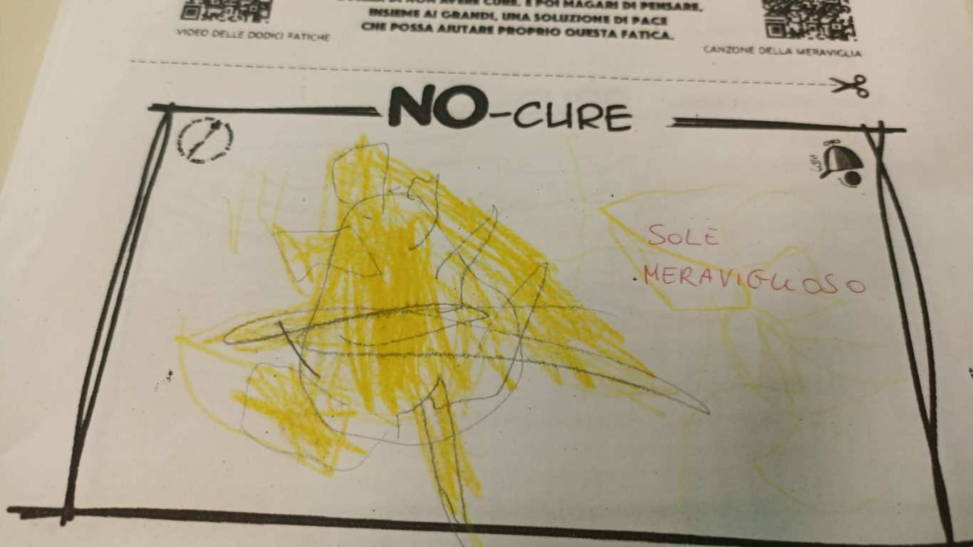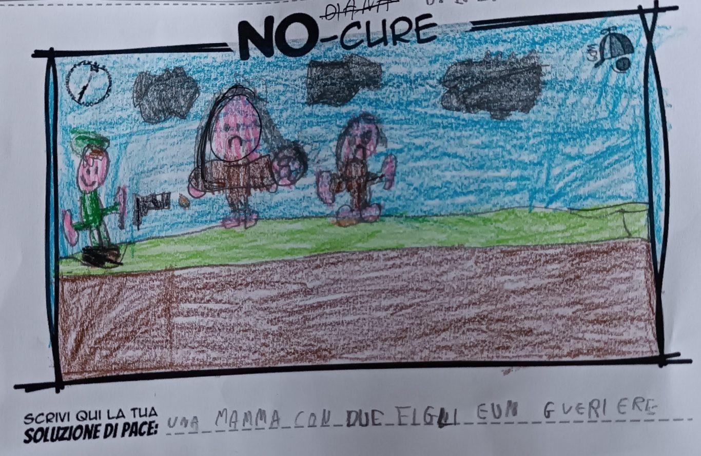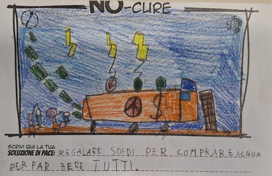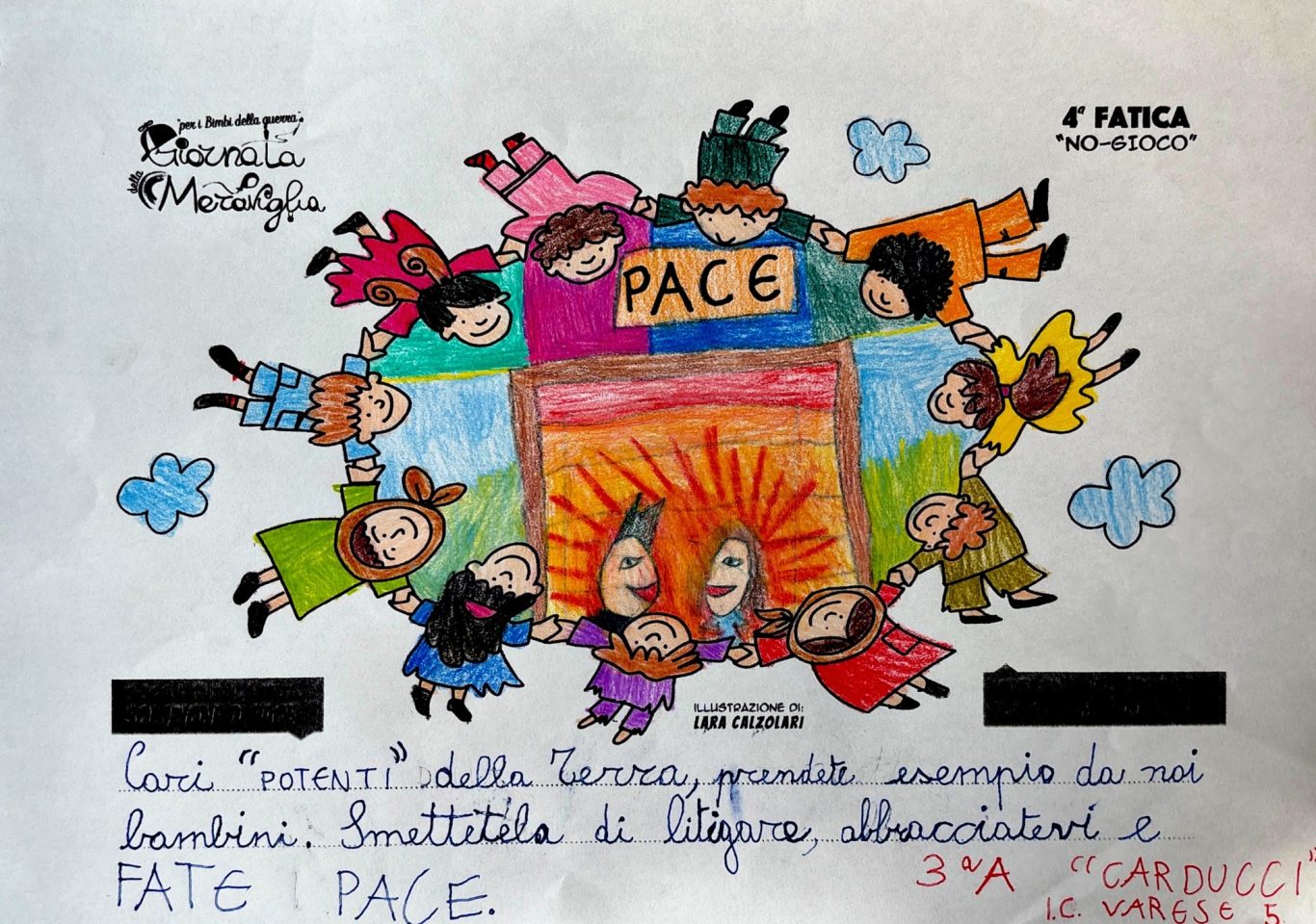 L’opera di sensibilizzazione si si esprime concretamente con la creazione di un DISEGNO DELLA MERAVIGLIA che andrà ad aiutare una delle 12 fatiche. Allo stesso modo chiederemo a tutti i partecipanti di andare a scrivere una “Soluzione di Pace” che possa aiutare anch’essa una delle 12 fatiche dei Bambini della guerra.