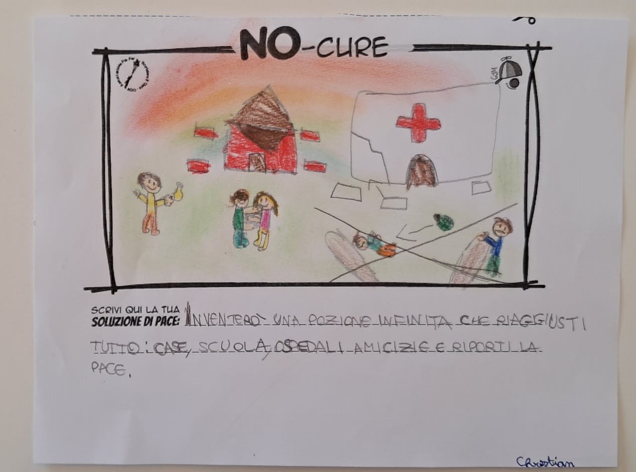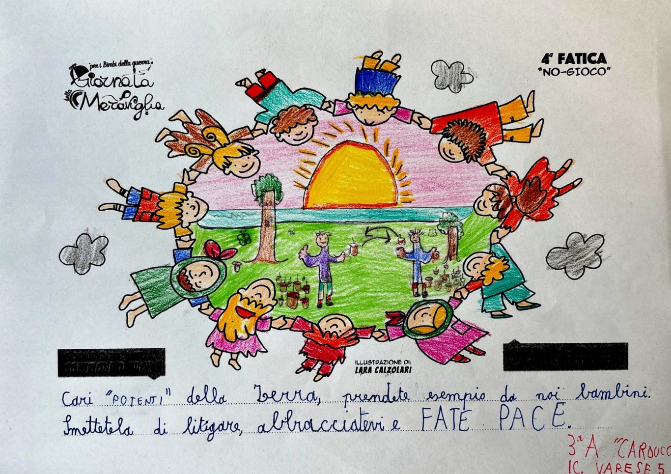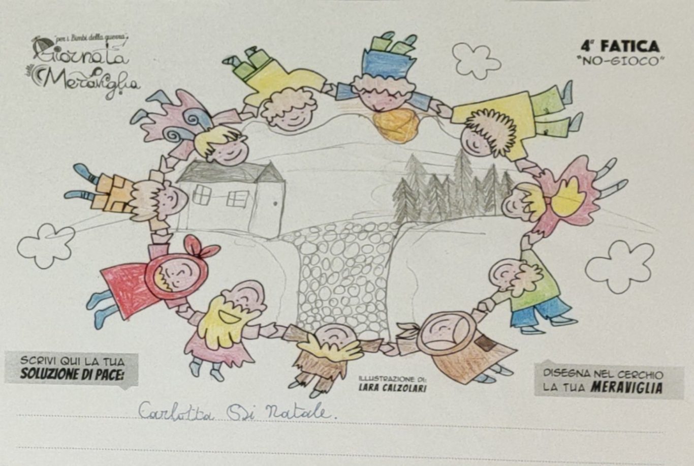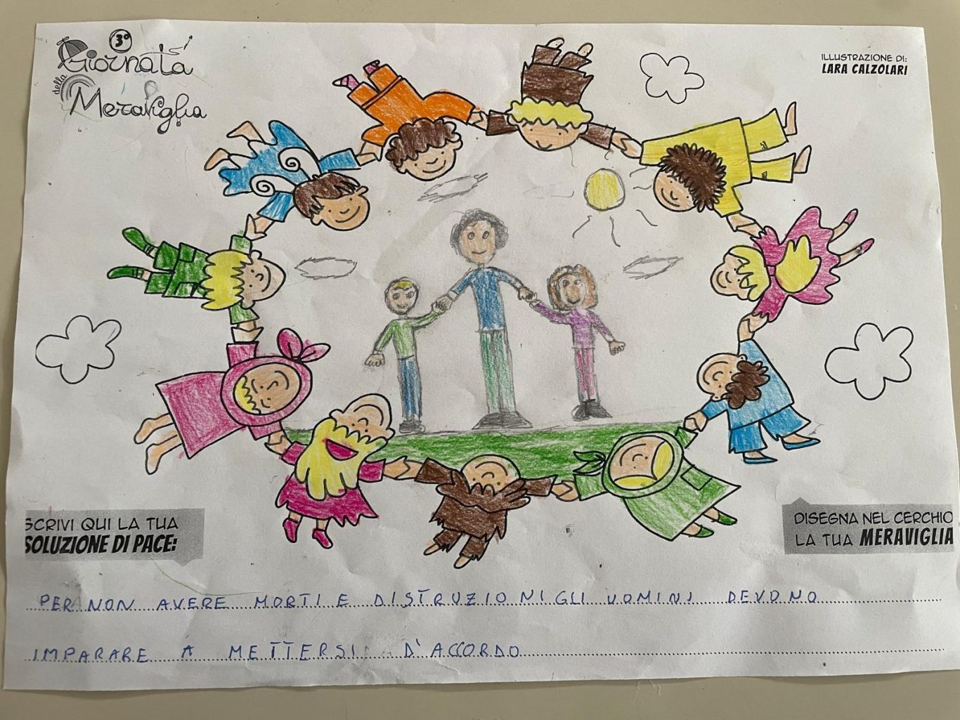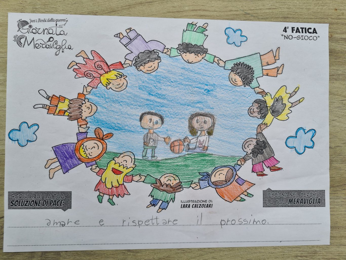 L’opera di sensibilizzazione si si esprime concretamente con la creazione di un DISEGNO DELLA MERAVIGLIA che andrà ad aiutare una delle 12 fatiche. Allo stesso modo chiederemo a tutti i partecipanti di andare a scrivere una “Soluzione di Pace” che possa aiutare anch’essa una delle 12 fatiche dei Bambini della guerra.