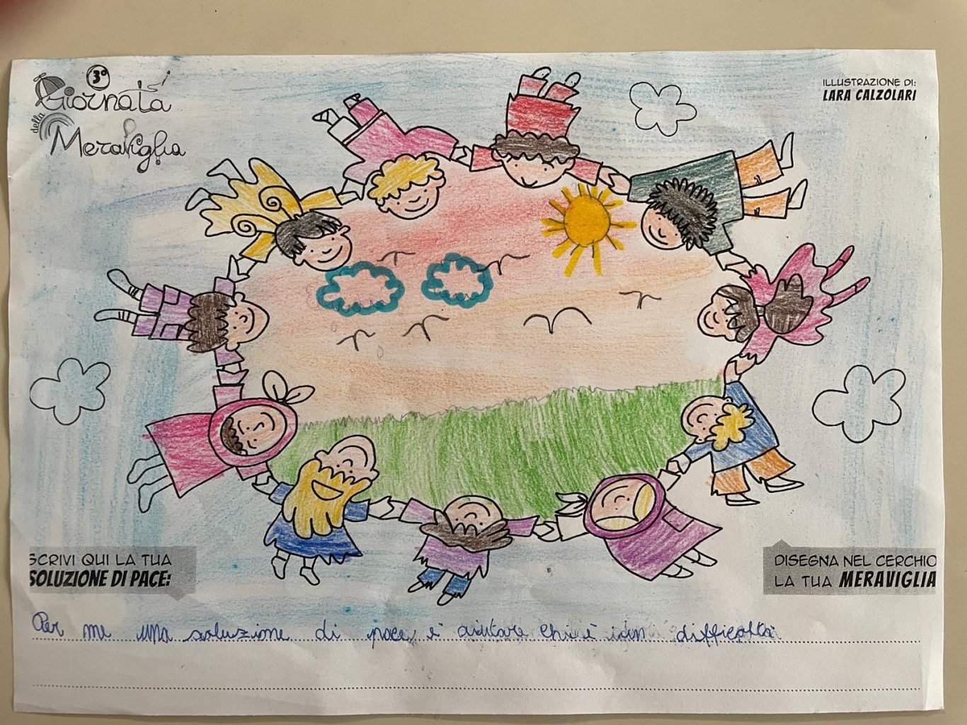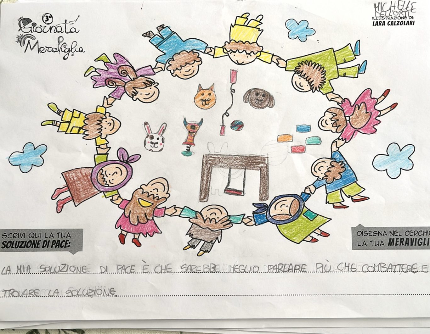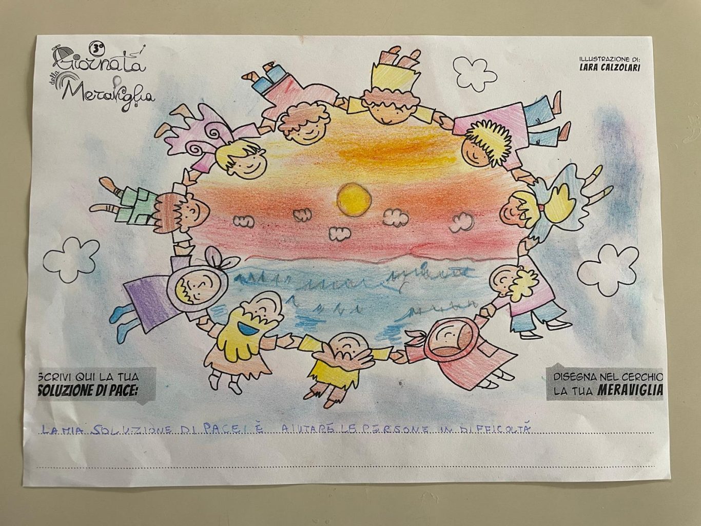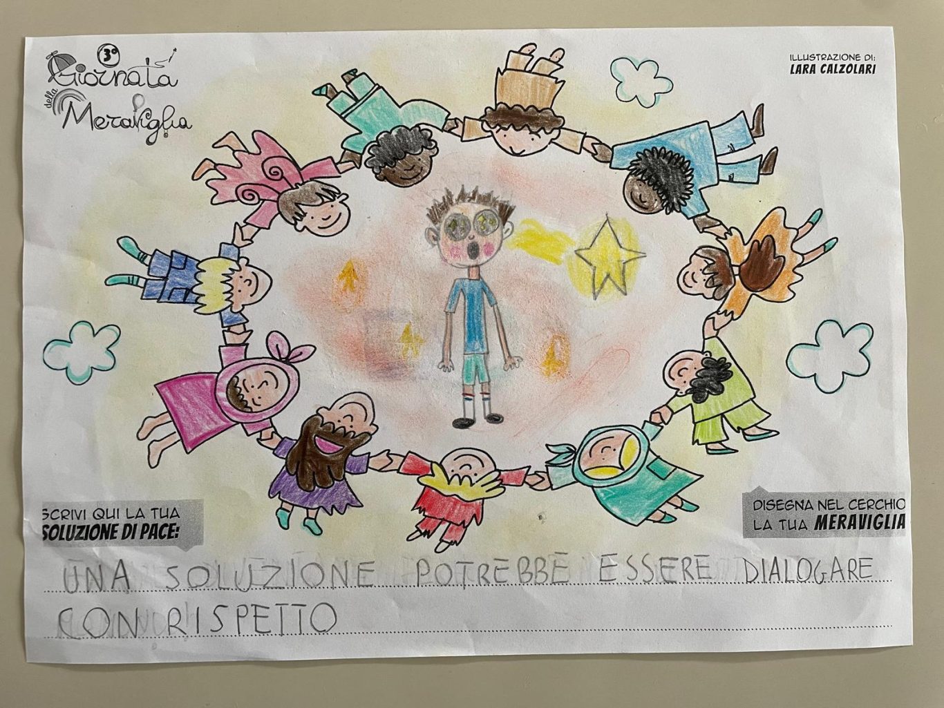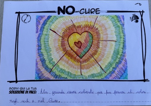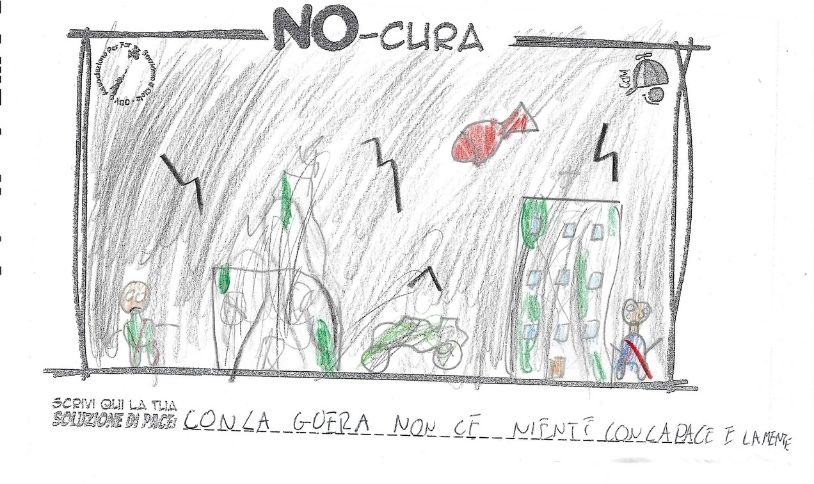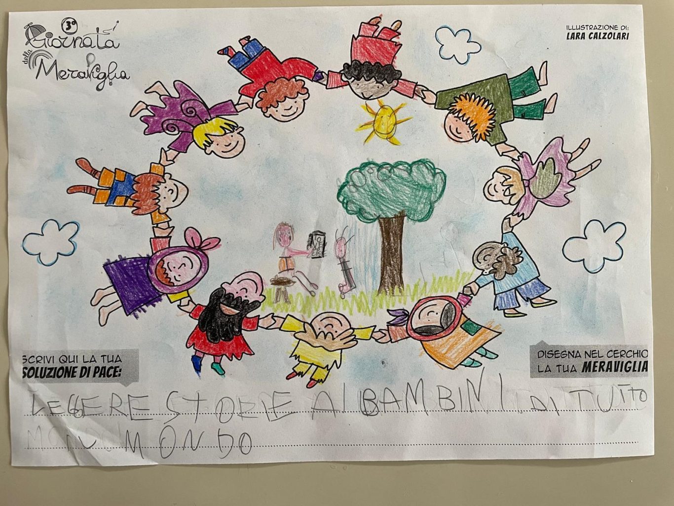 L’opera di sensibilizzazione si si esprime concretamente con la creazione di un DISEGNO DELLA MERAVIGLIA che andrà ad aiutare una delle 12 fatiche. Allo stesso modo chiederemo a tutti i partecipanti di andare a scrivere una “Soluzione di Pace” che possa aiutare anch’essa una delle 12 fatiche dei Bambini della guerra.
