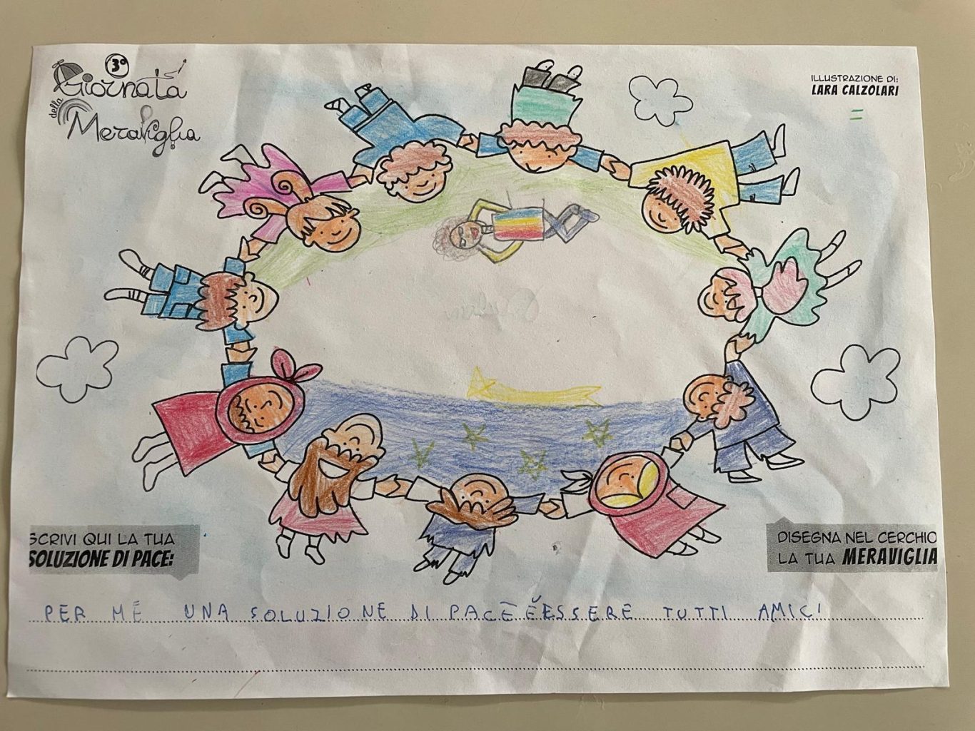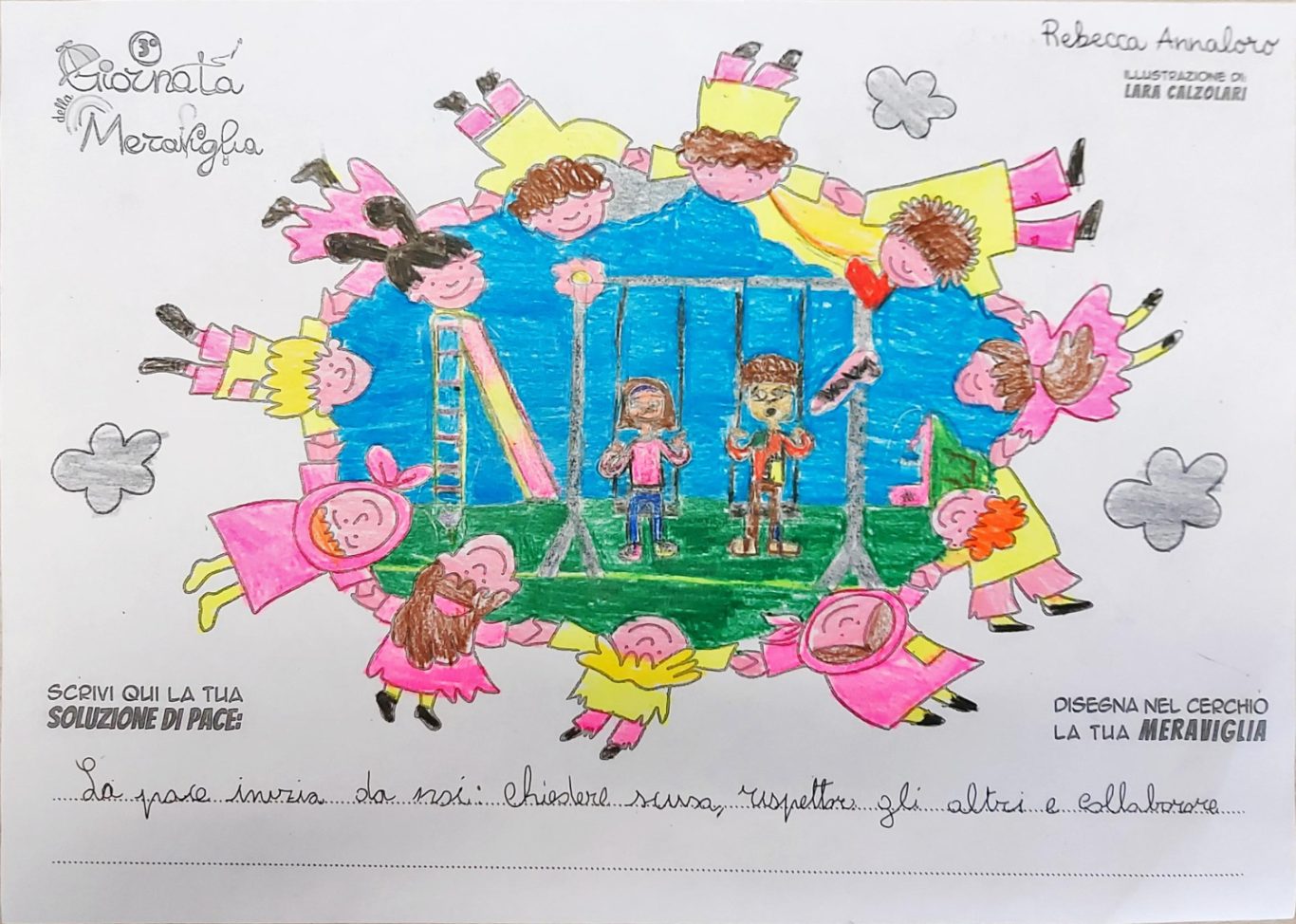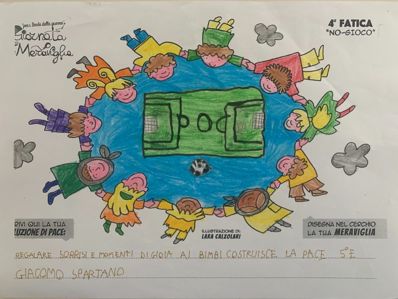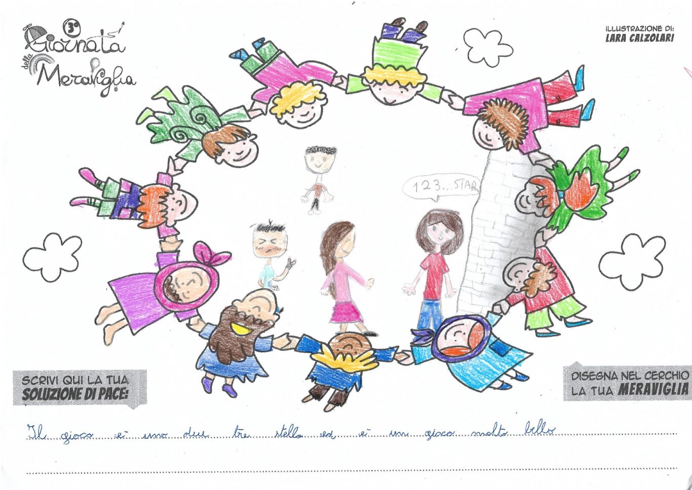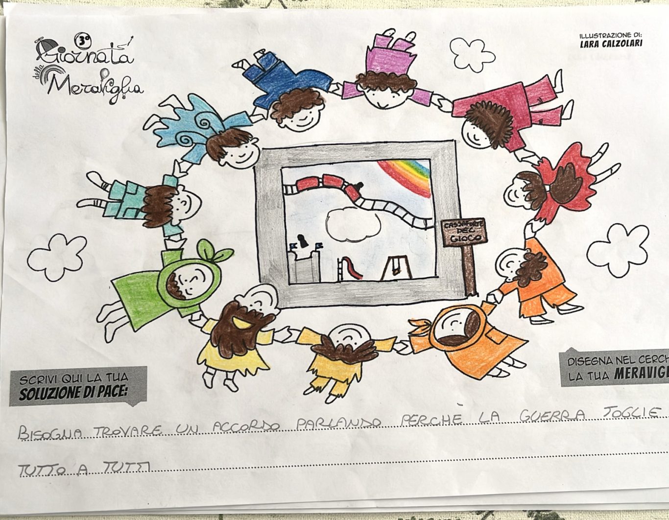 L’opera di sensibilizzazione si si esprime concretamente con la creazione di un DISEGNO DELLA MERAVIGLIA che andrà ad aiutare una delle 12 fatiche. Allo stesso modo chiederemo a tutti i partecipanti di andare a scrivere una “Soluzione di Pace” che possa aiutare anch’essa una delle 12 fatiche dei Bambini della guerra.
