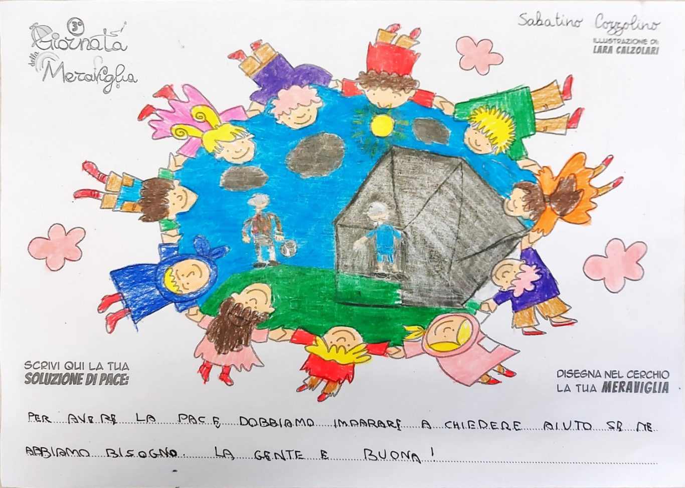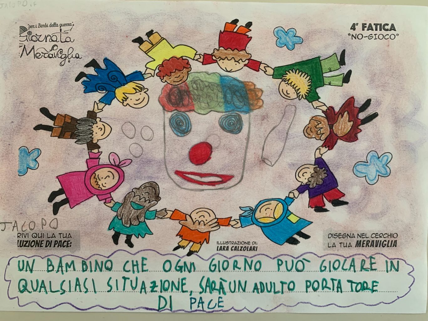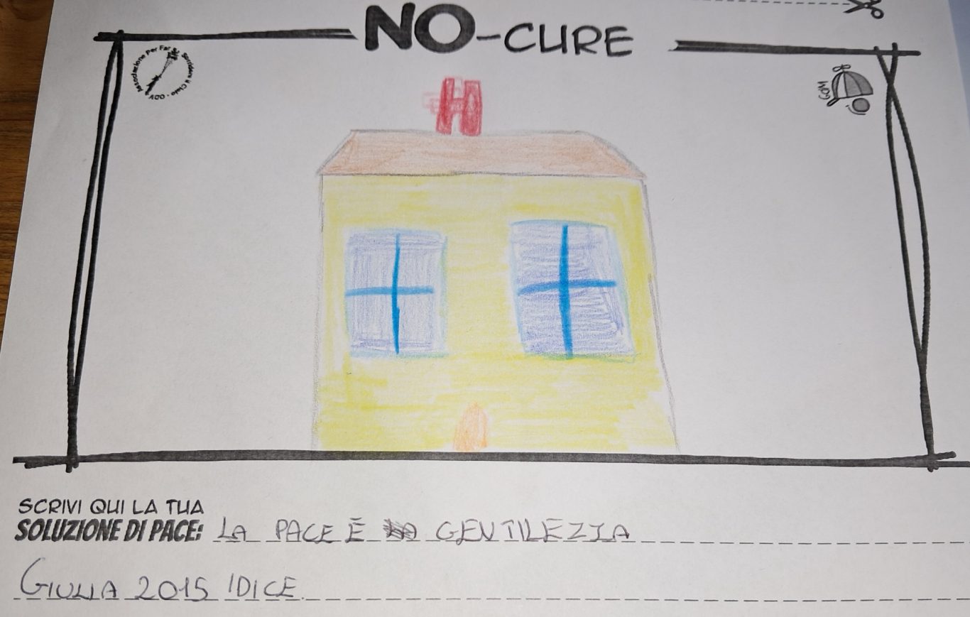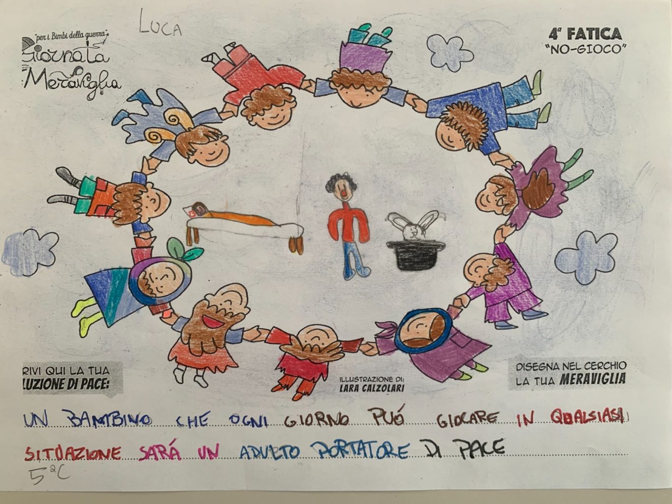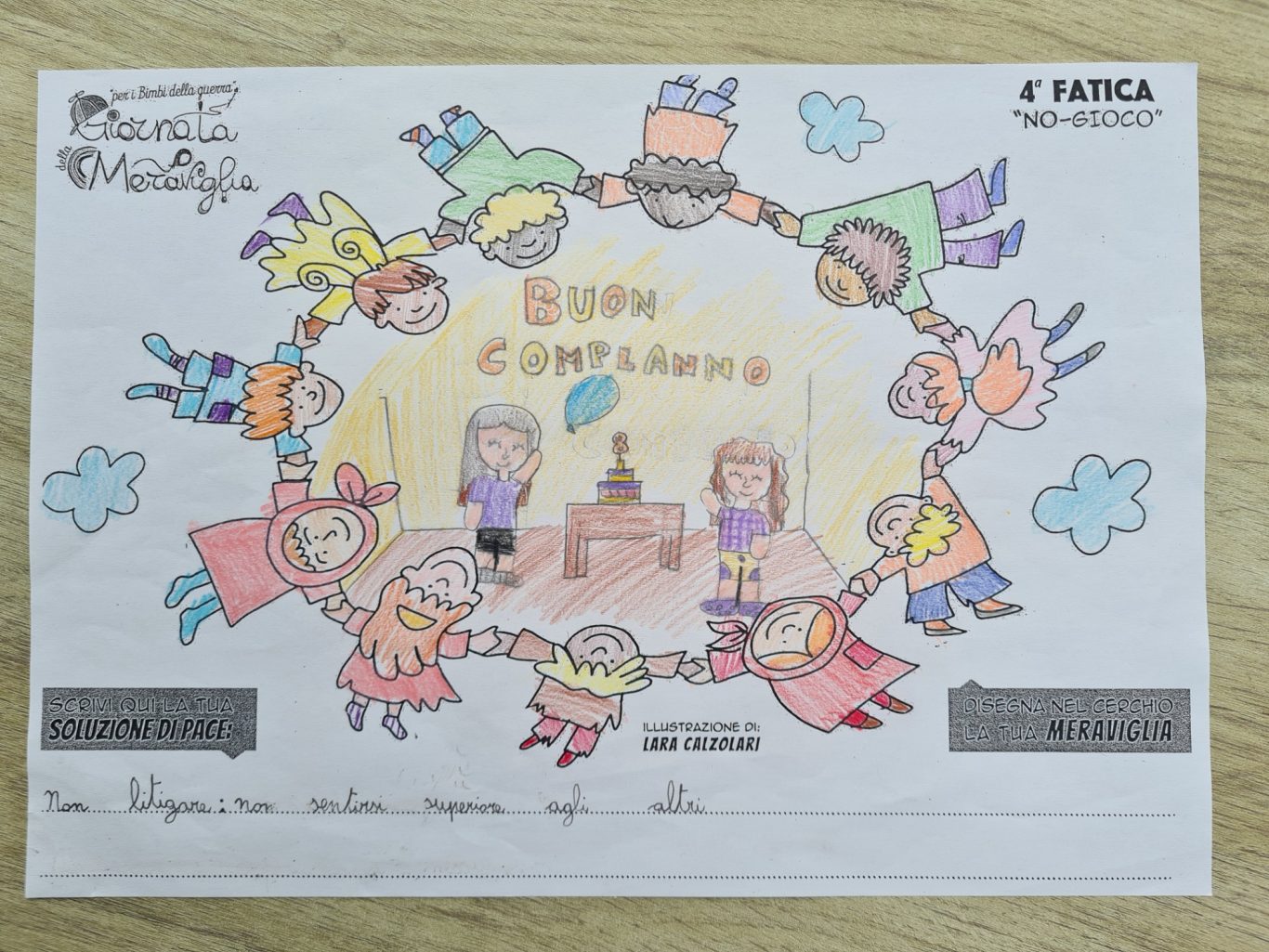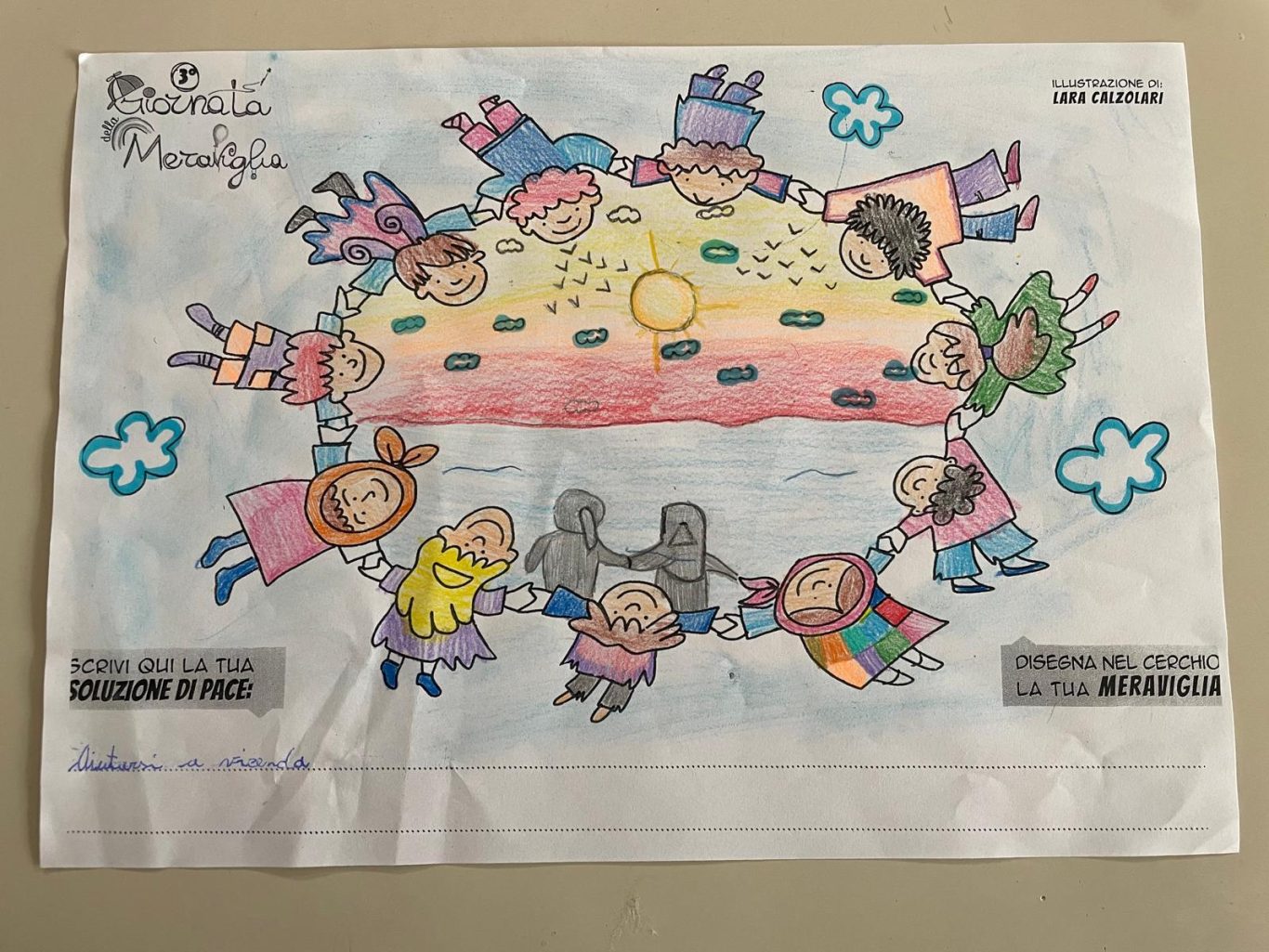 L’opera di sensibilizzazione si si esprime concretamente con la creazione di un DISEGNO DELLA MERAVIGLIA che andrà ad aiutare una delle 12 fatiche. Allo stesso modo chiederemo a tutti i partecipanti di andare a scrivere una “Soluzione di Pace” che possa aiutare anch’essa una delle 12 fatiche dei Bambini della guerra.