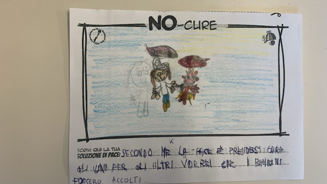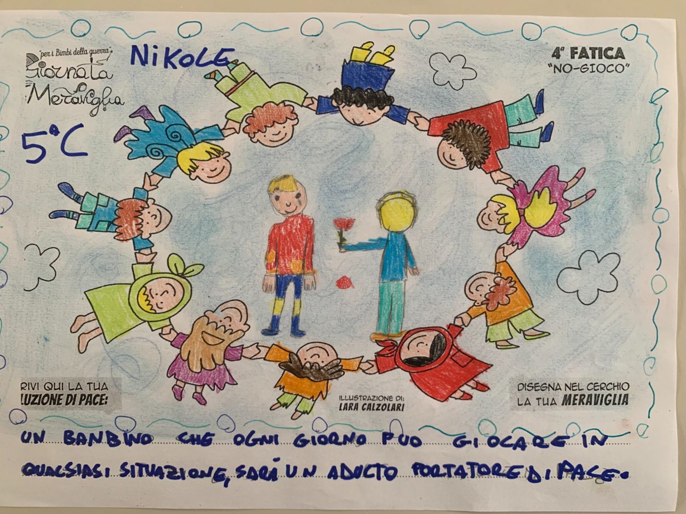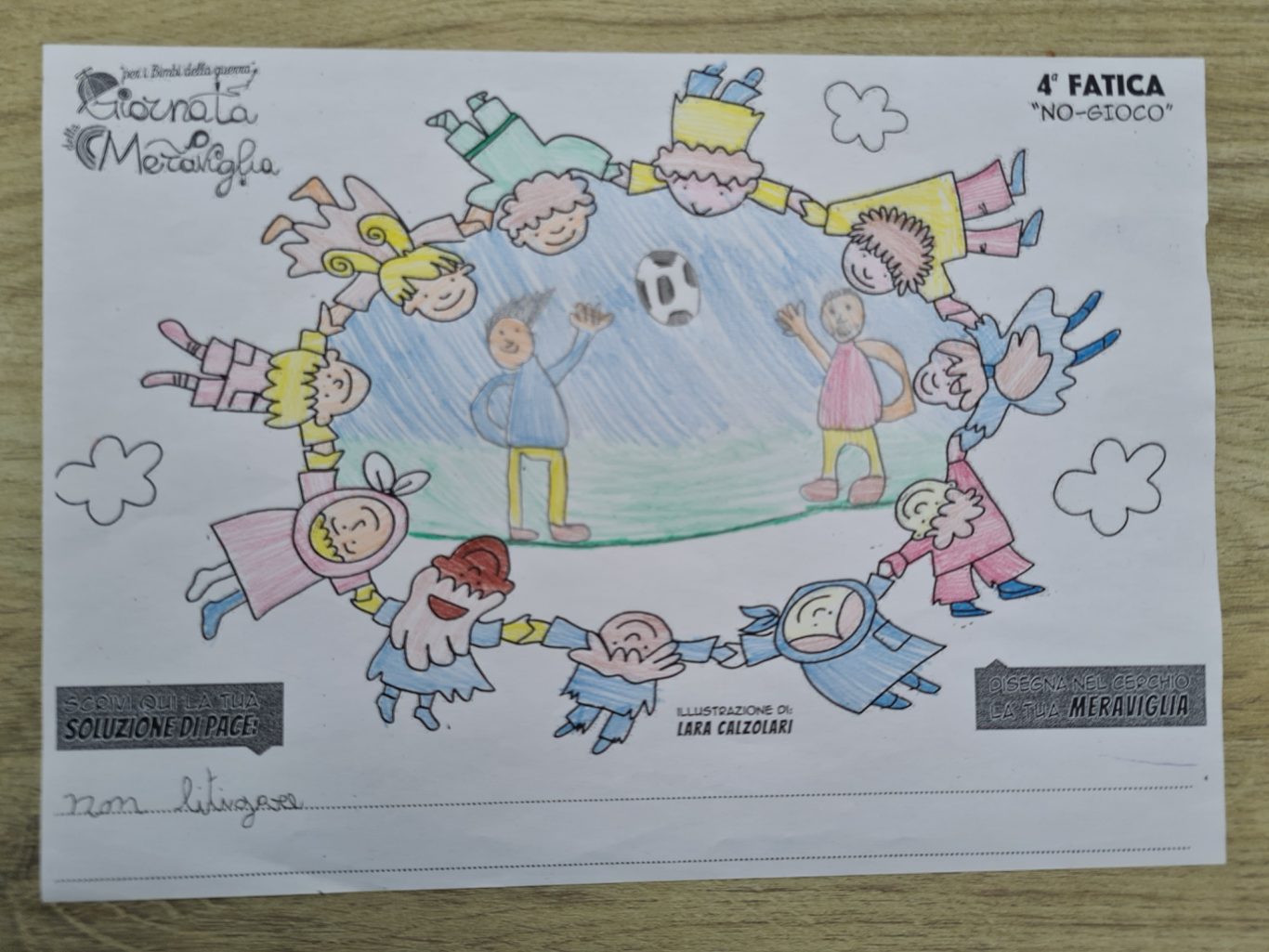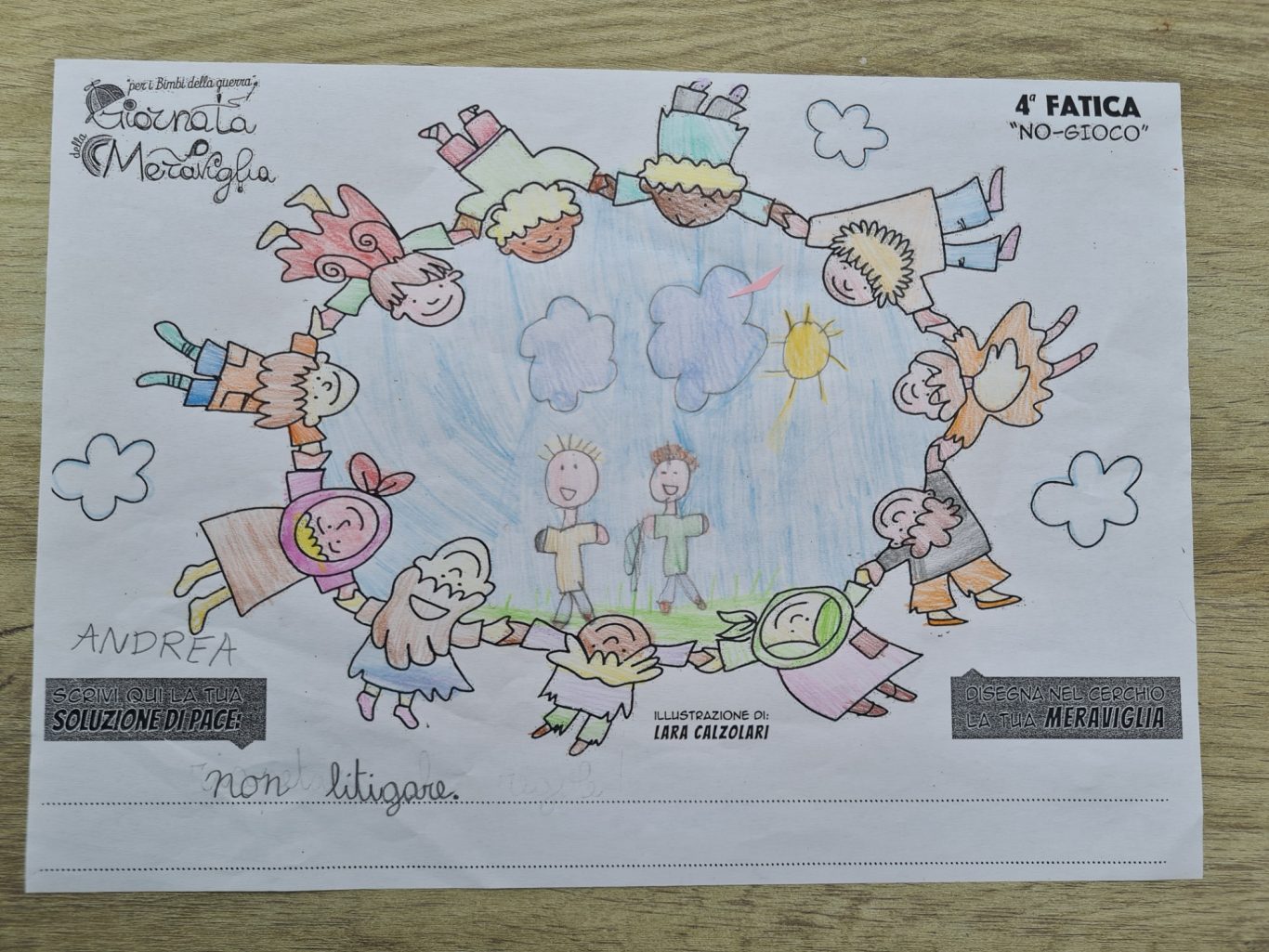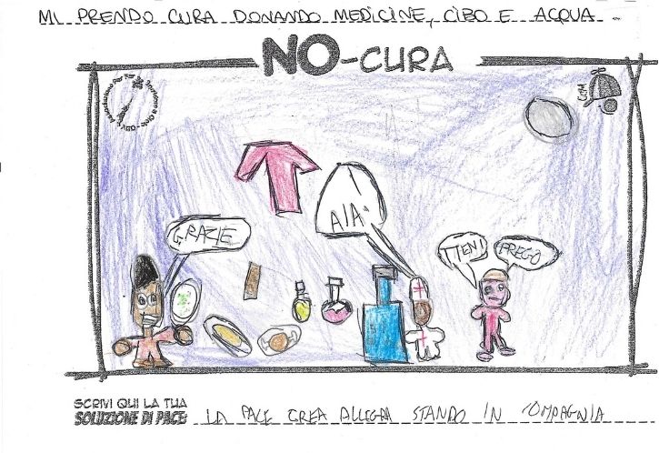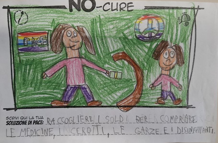 L’opera di sensibilizzazione si si esprime concretamente con la creazione di un DISEGNO DELLA MERAVIGLIA che andrà ad aiutare una delle 12 fatiche. Allo stesso modo chiederemo a tutti i partecipanti di andare a scrivere una “Soluzione di Pace” che possa aiutare anch’essa una delle 12 fatiche dei Bambini della guerra.