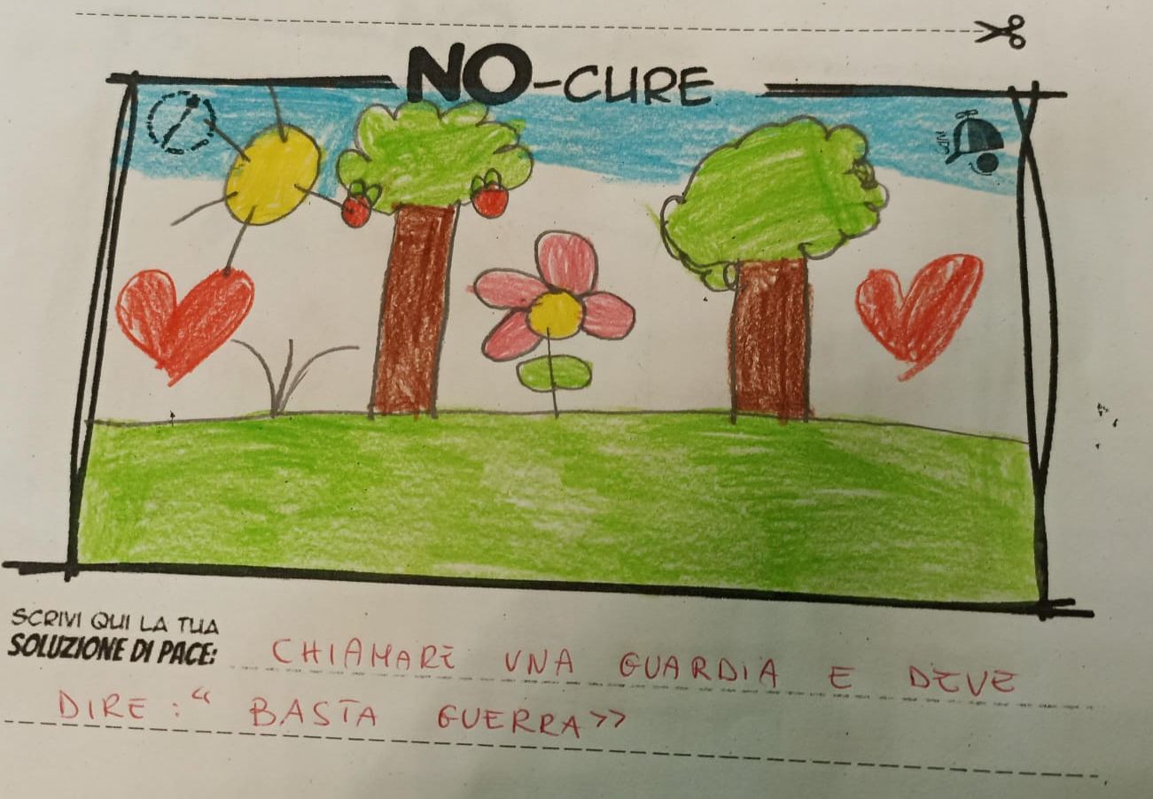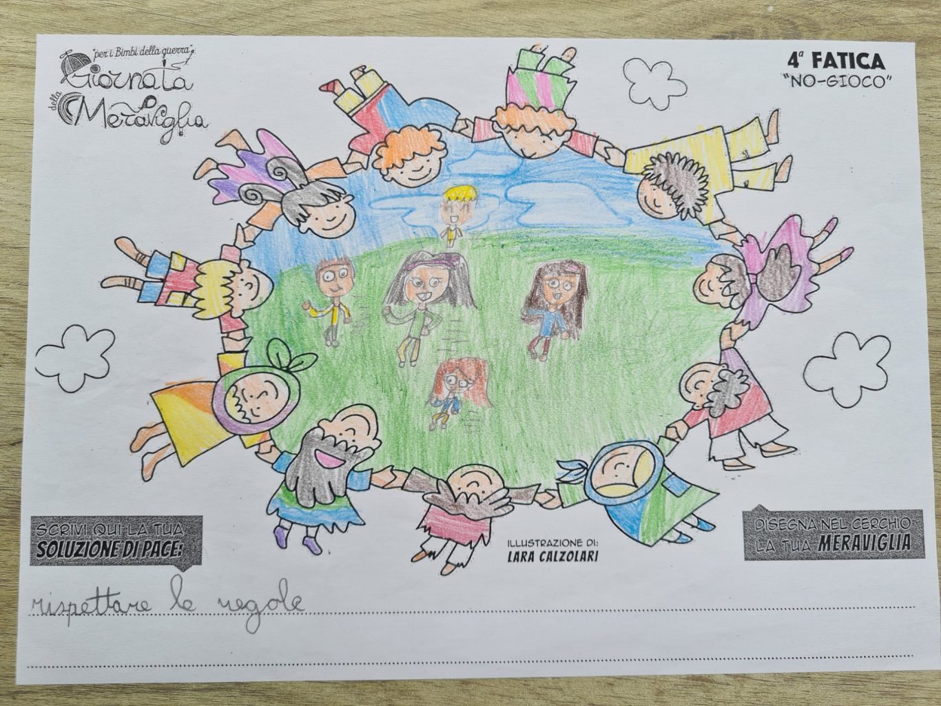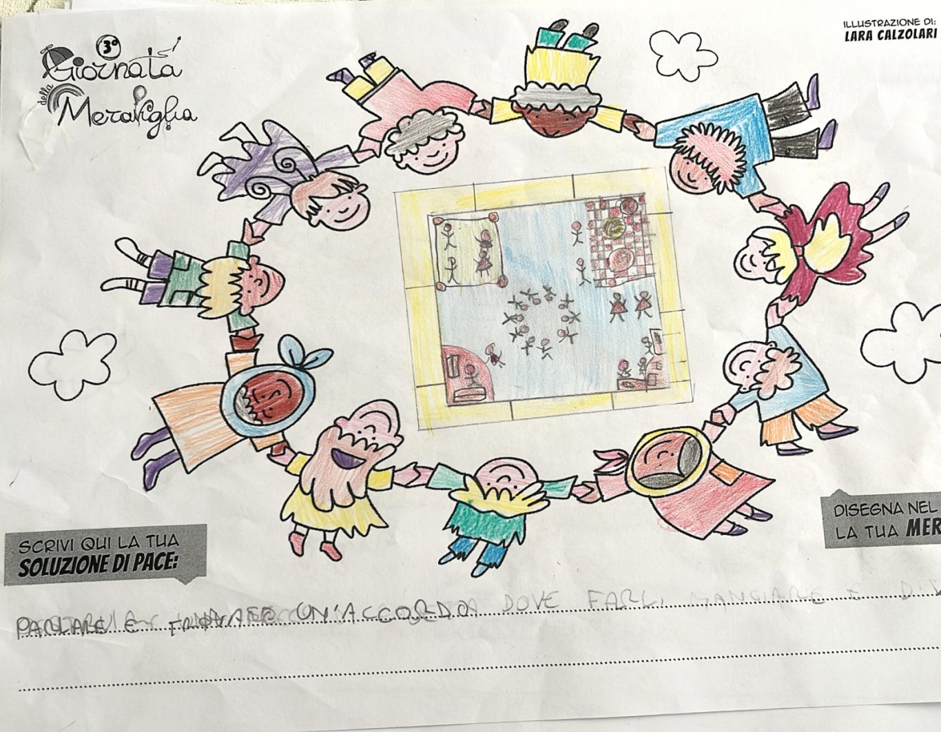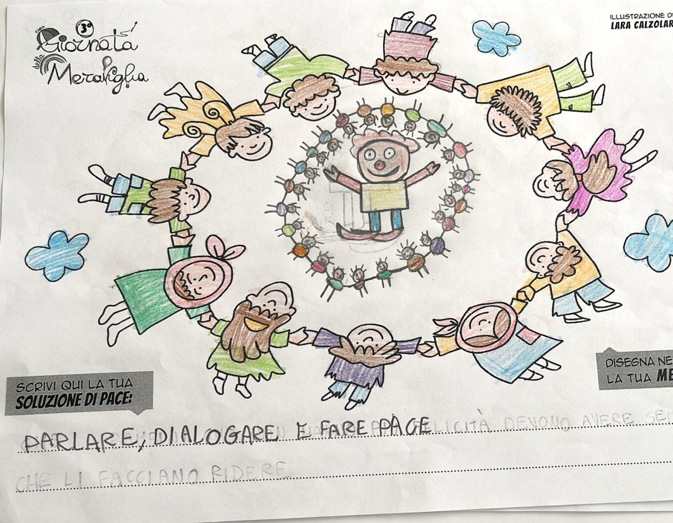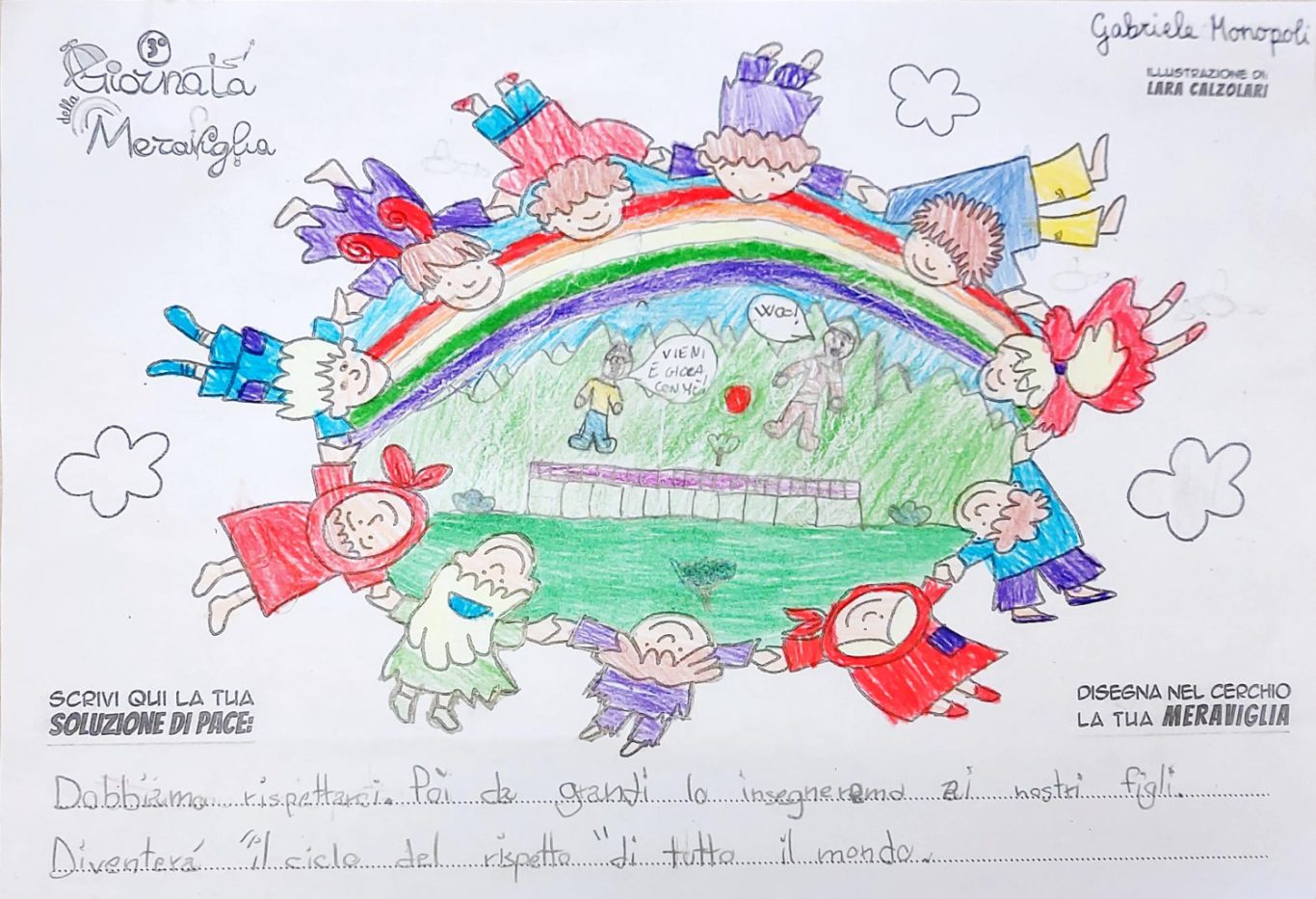 L’opera di sensibilizzazione si si esprime concretamente con la creazione di un DISEGNO DELLA MERAVIGLIA che andrà ad aiutare una delle 12 fatiche. Allo stesso modo chiederemo a tutti i partecipanti di andare a scrivere una “Soluzione di Pace” che possa aiutare anch’essa una delle 12 fatiche dei Bambini della guerra.