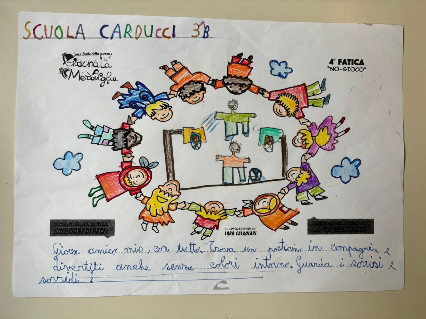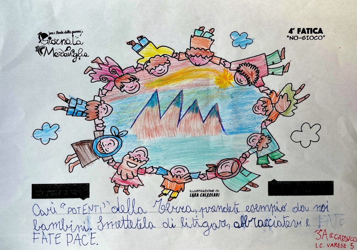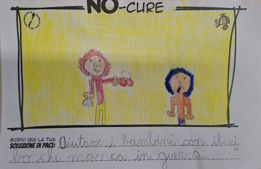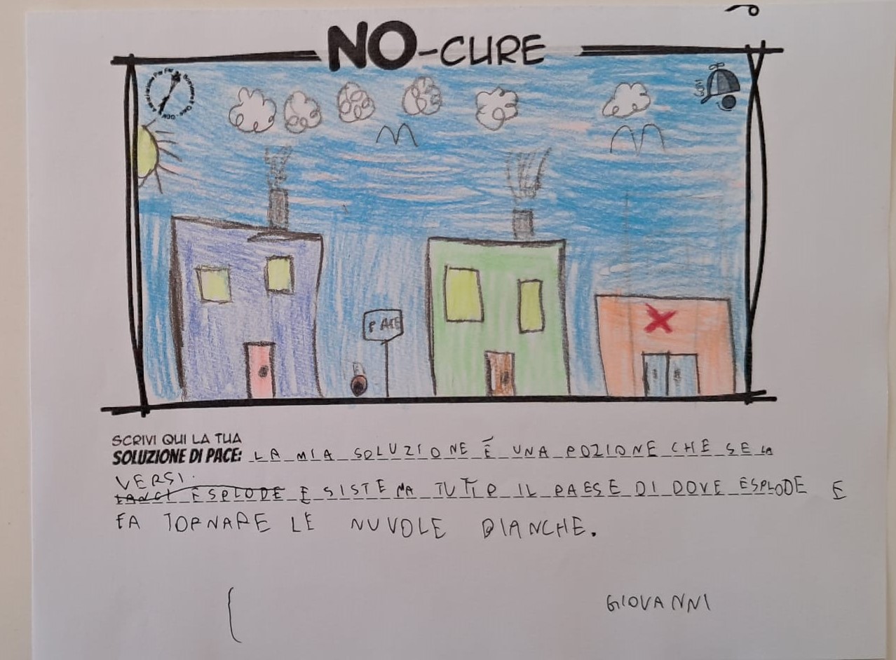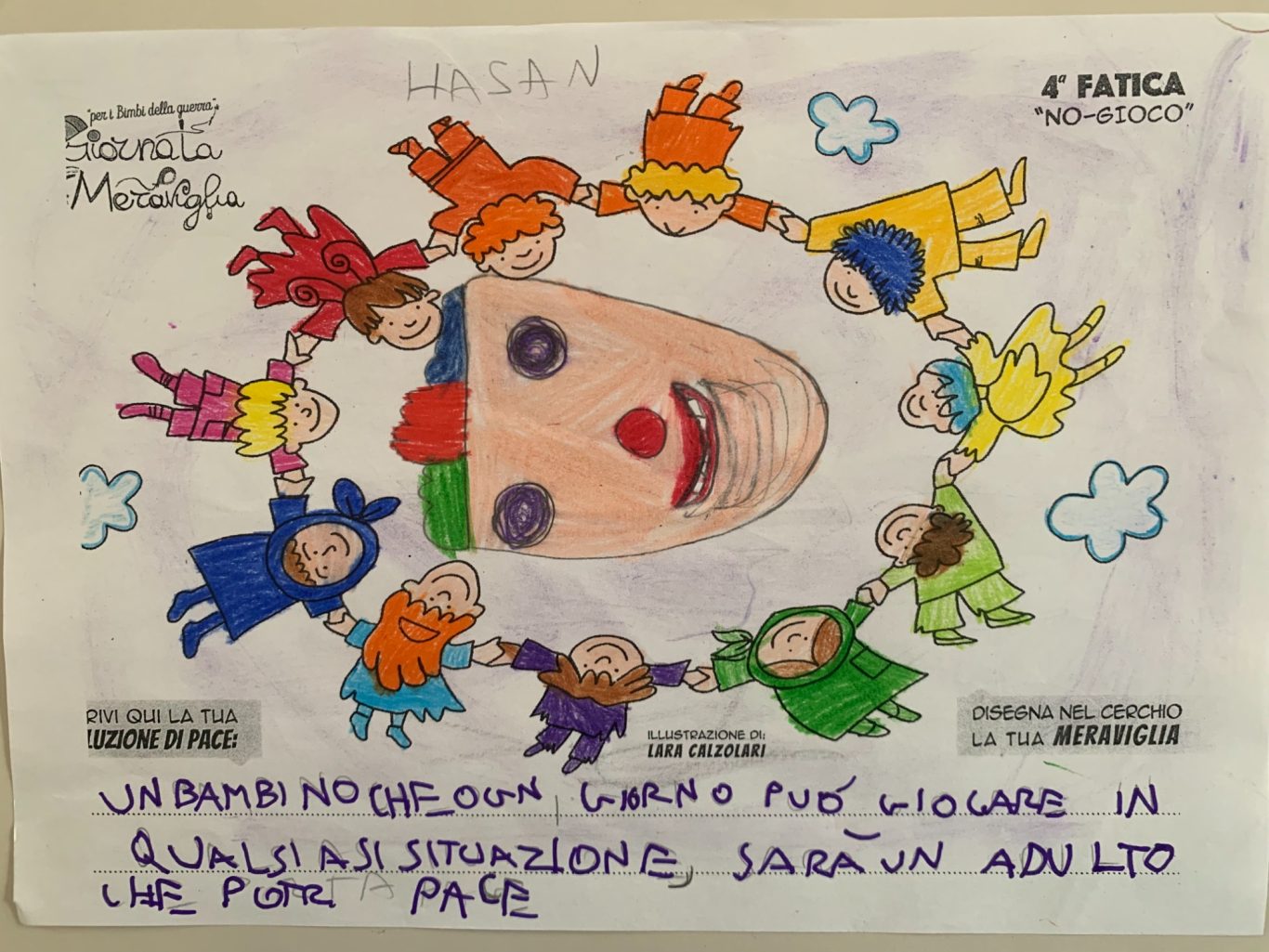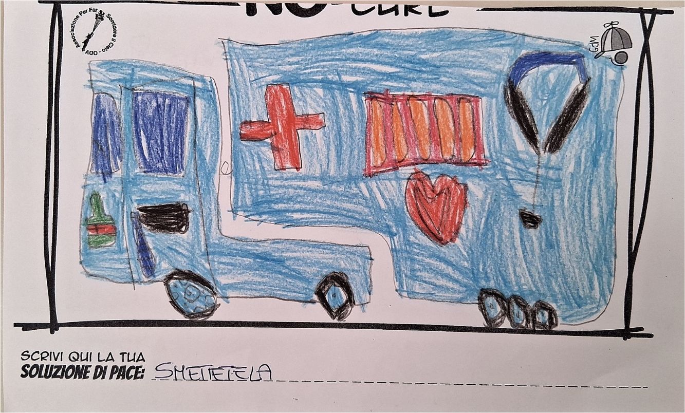 L’opera di sensibilizzazione si si esprime concretamente con la creazione di un DISEGNO DELLA MERAVIGLIA che andrà ad aiutare una delle 12 fatiche. Allo stesso modo chiederemo a tutti i partecipanti di andare a scrivere una “Soluzione di Pace” che possa aiutare anch’essa una delle 12 fatiche dei Bambini della guerra.