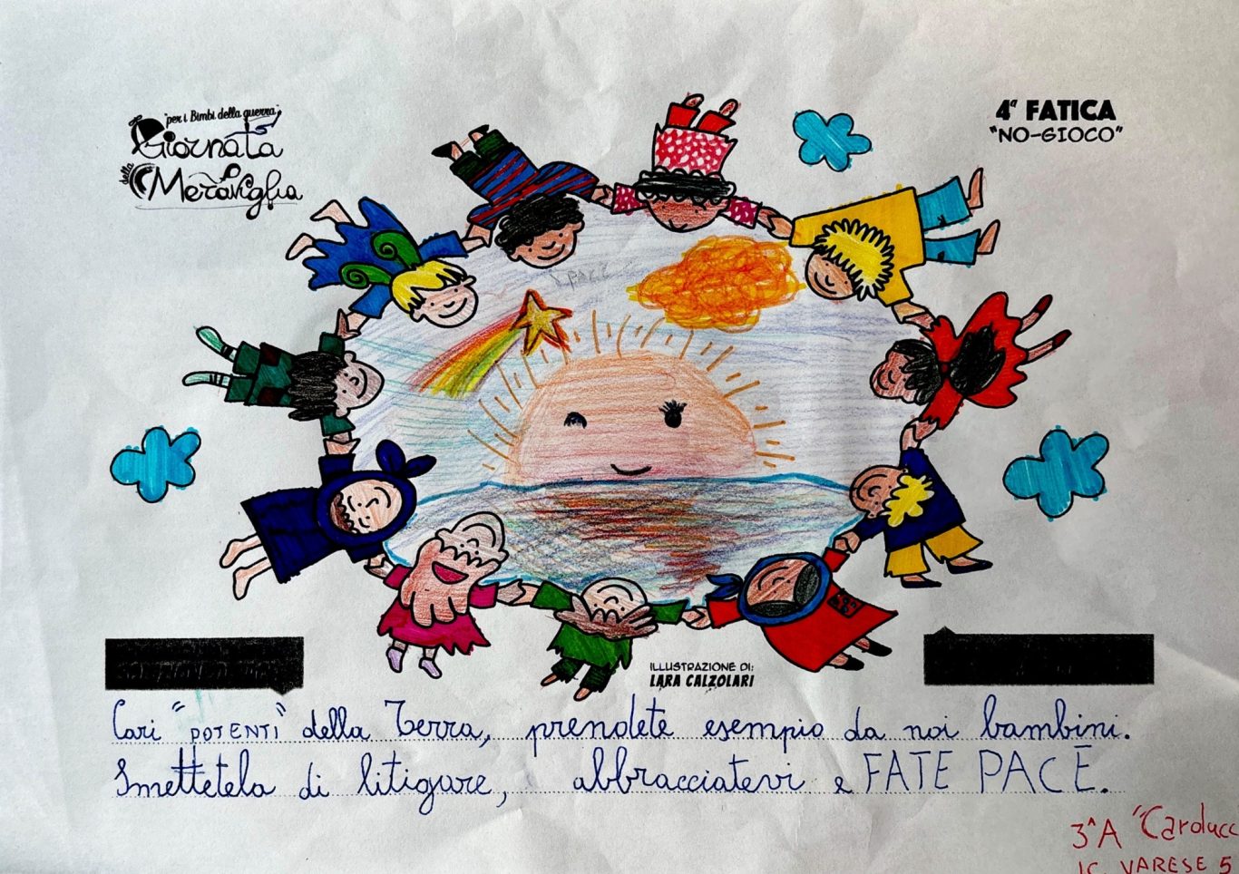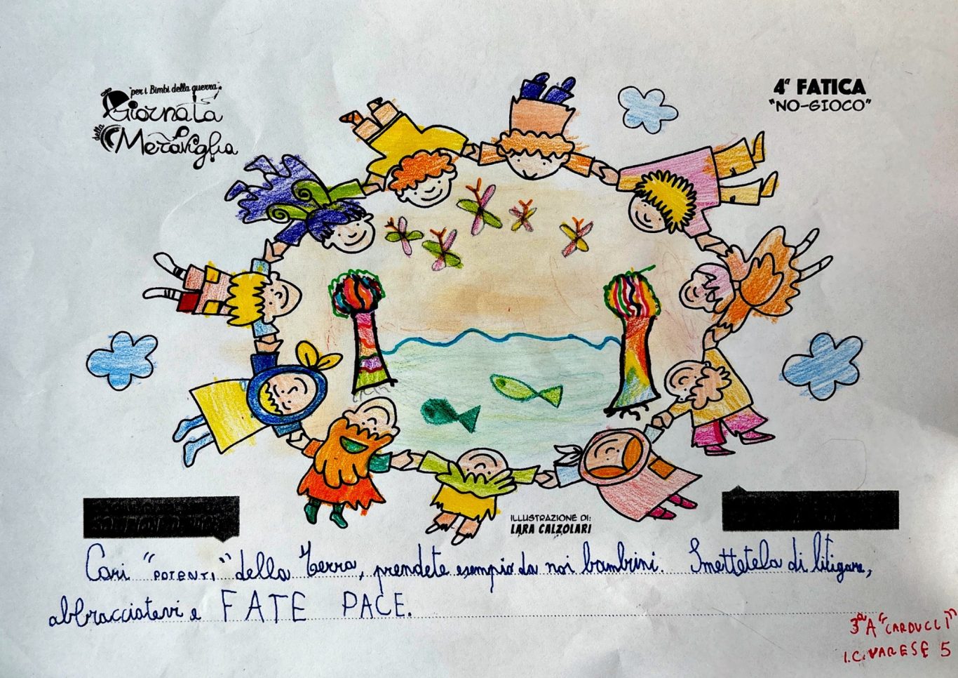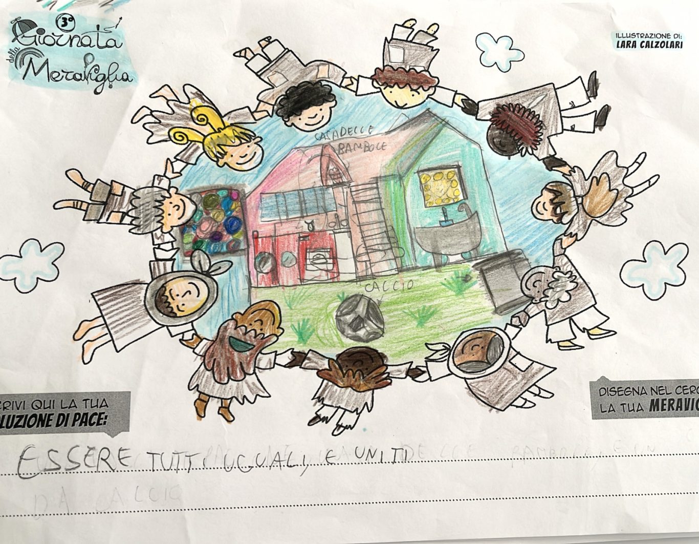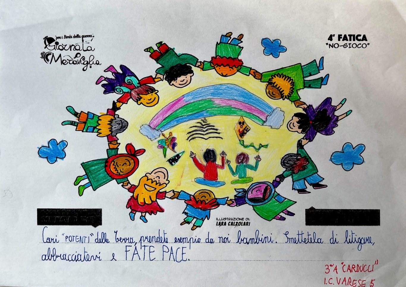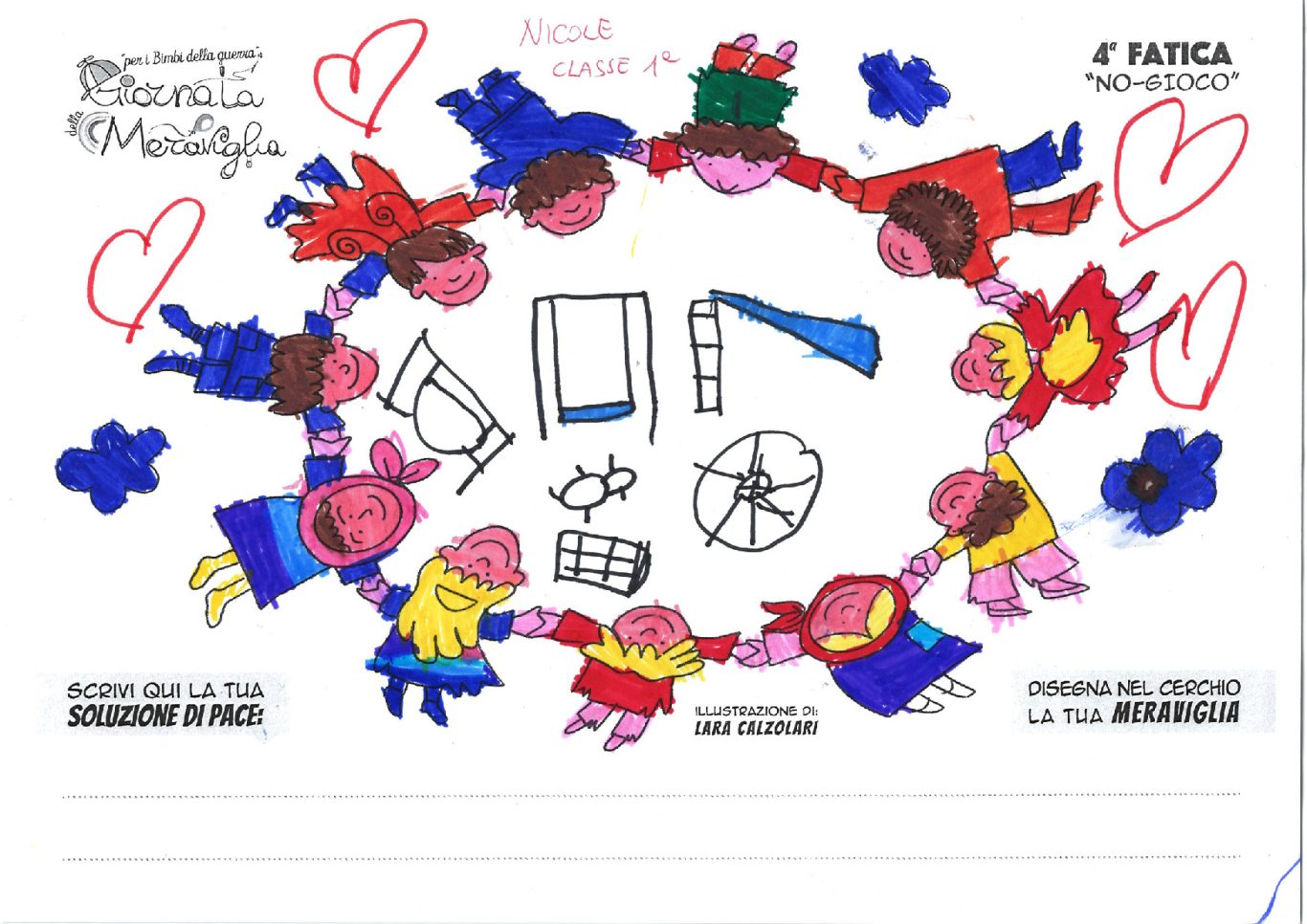 L’opera di sensibilizzazione si si esprime concretamente con la creazione di un DISEGNO DELLA MERAVIGLIA che andrà ad aiutare una delle 12 fatiche. Allo stesso modo chiederemo a tutti i partecipanti di andare a scrivere una “Soluzione di Pace” che possa aiutare anch’essa una delle 12 fatiche dei Bambini della guerra.