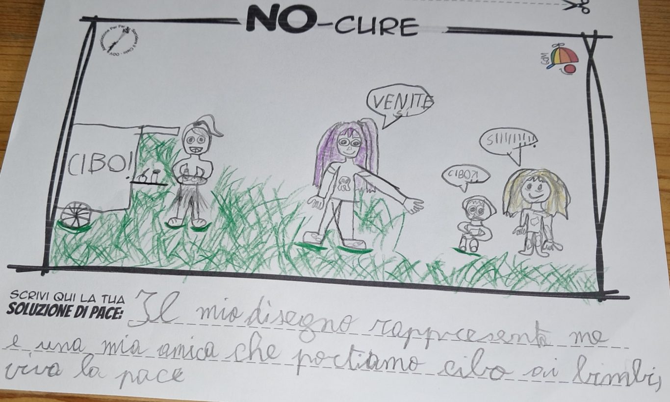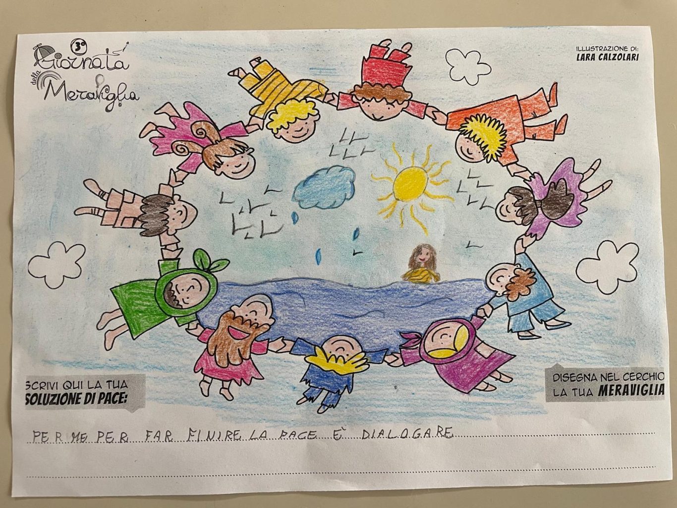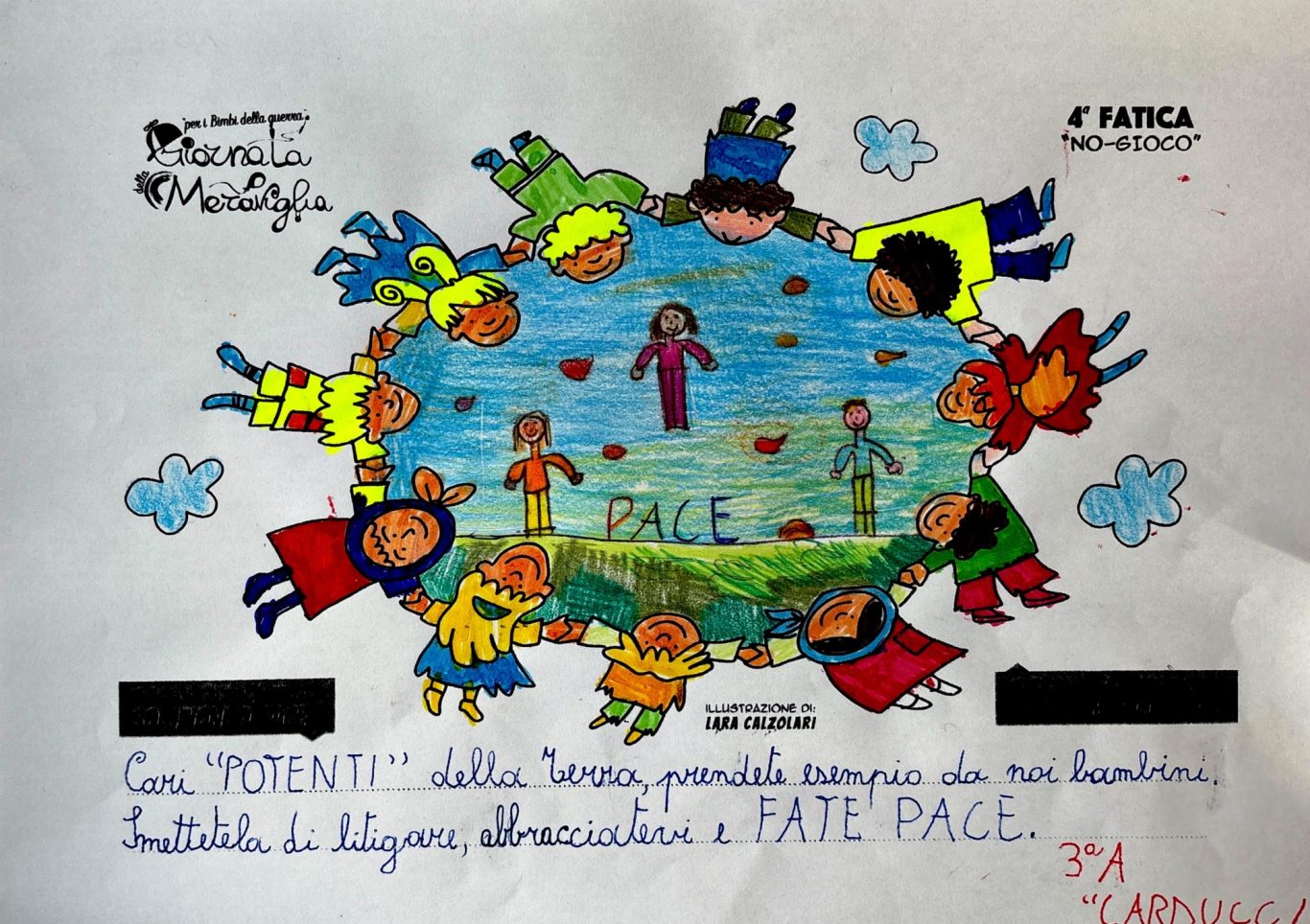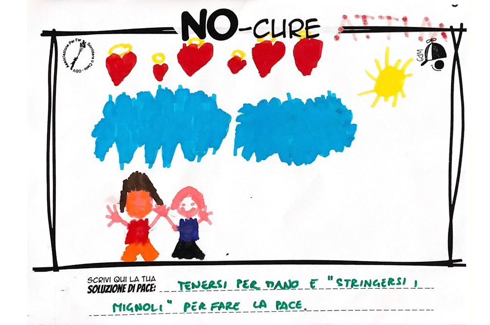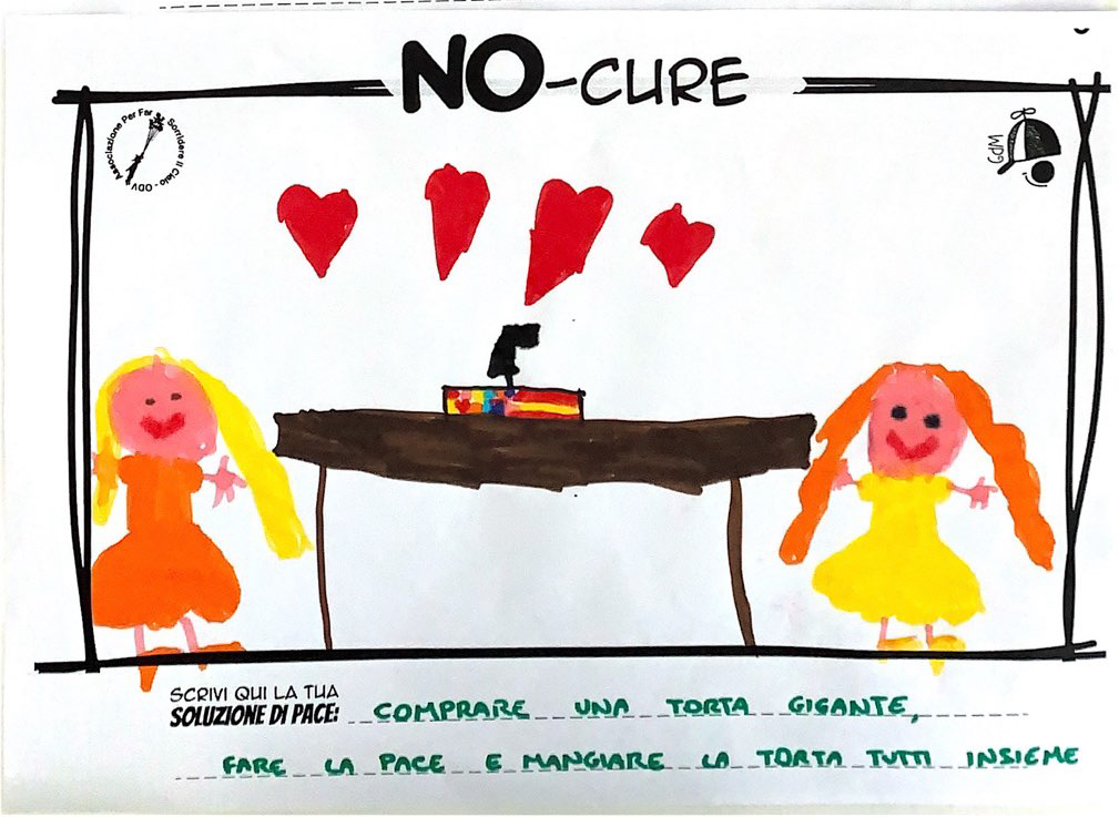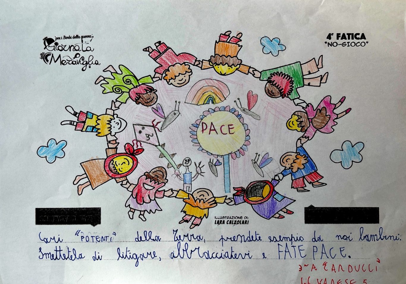 L’opera di sensibilizzazione si si esprime concretamente con la creazione di un DISEGNO DELLA MERAVIGLIA che andrà ad aiutare una delle 12 fatiche. Allo stesso modo chiederemo a tutti i partecipanti di andare a scrivere una “Soluzione di Pace” che possa aiutare anch’essa una delle 12 fatiche dei Bambini della guerra.