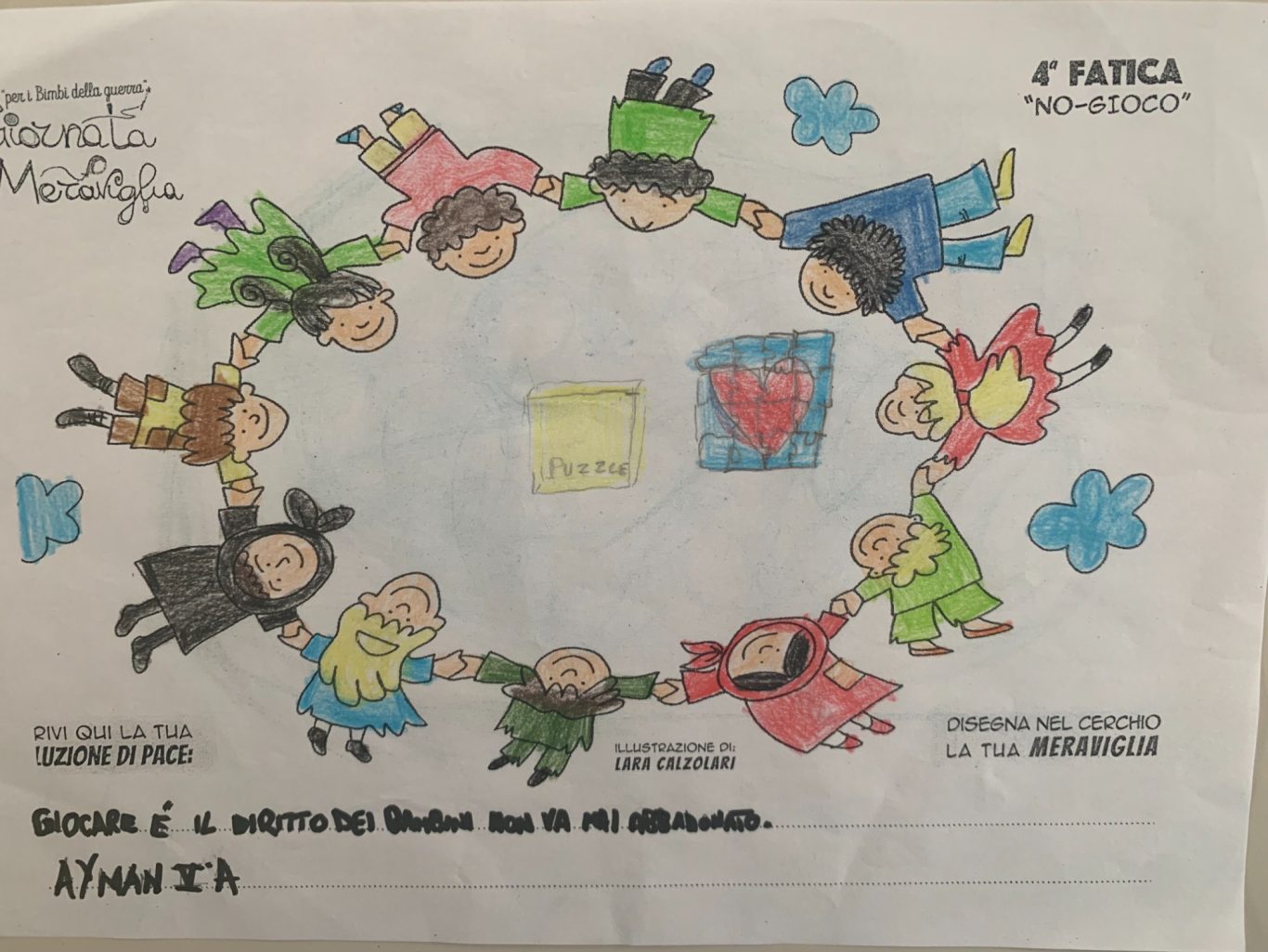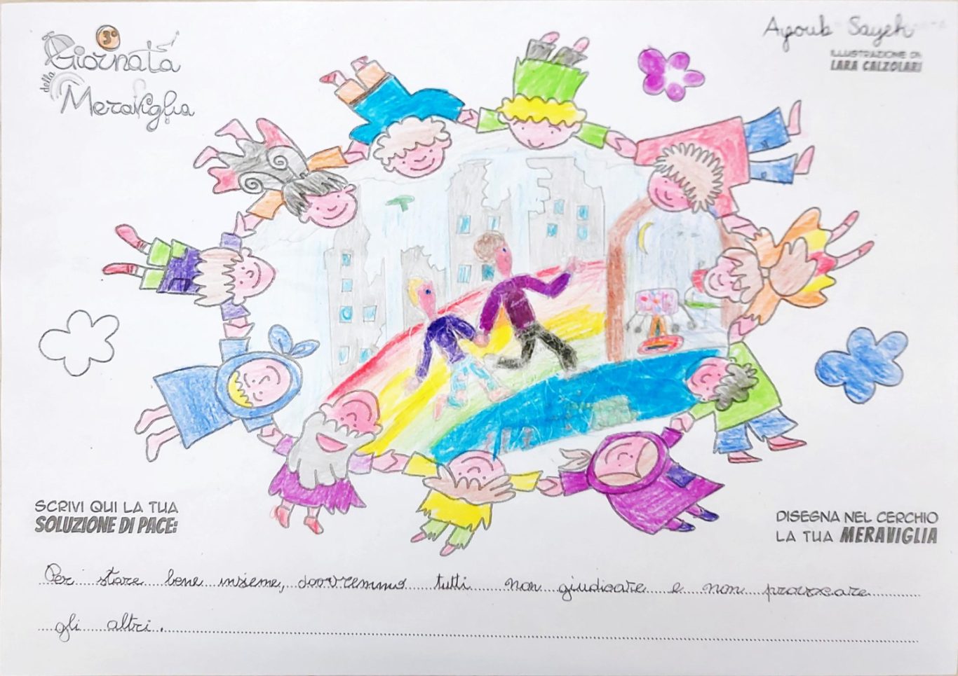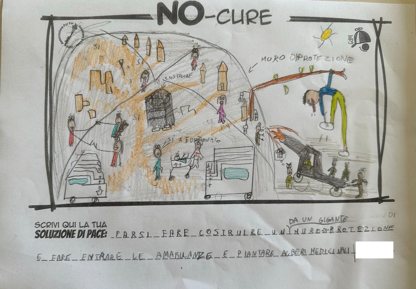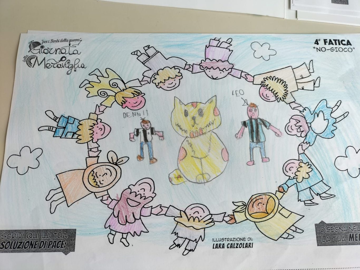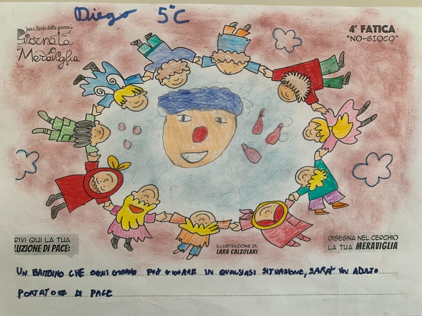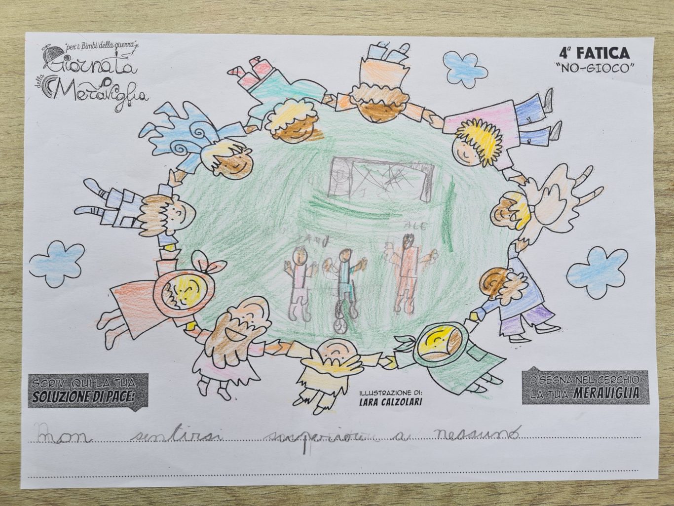L’opera di sensibilizzazione si si esprime concretamente con la creazione di un DISEGNO DELLA MERAVIGLIA che andrà ad aiutare una delle 12 fatiche. Allo stesso modo chiederemo a tutti i partecipanti di andare a scrivere una “Soluzione di Pace” che possa aiutare anch’essa una delle 12 fatiche dei Bambini della guerra.