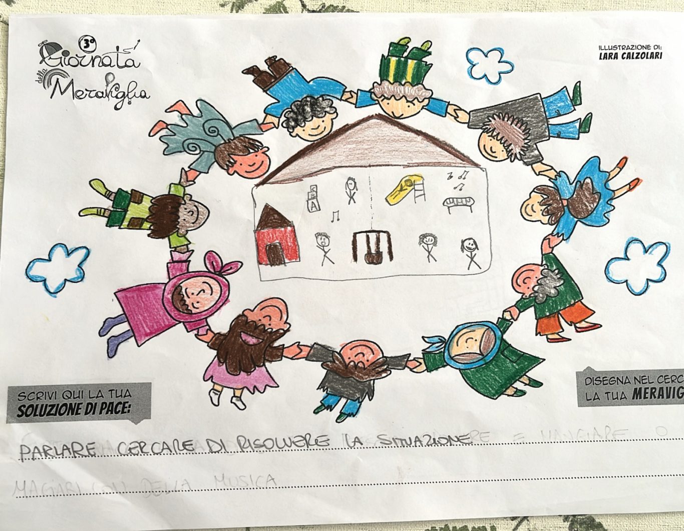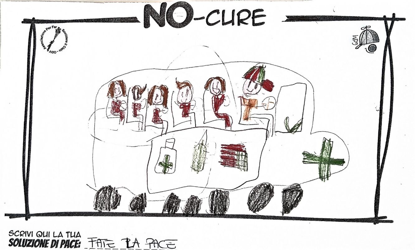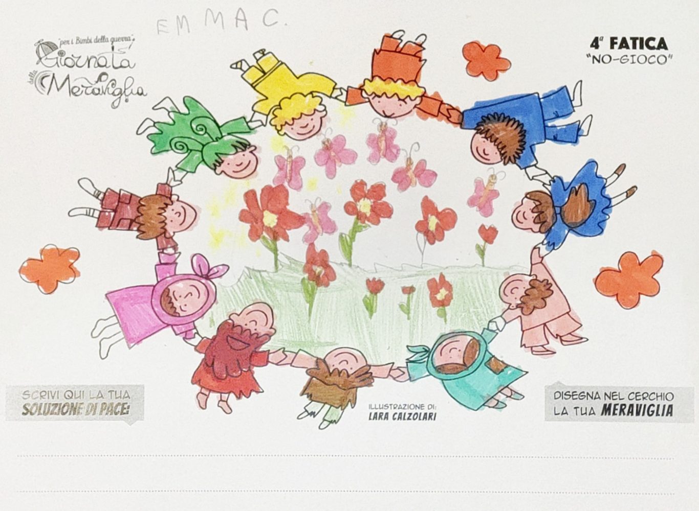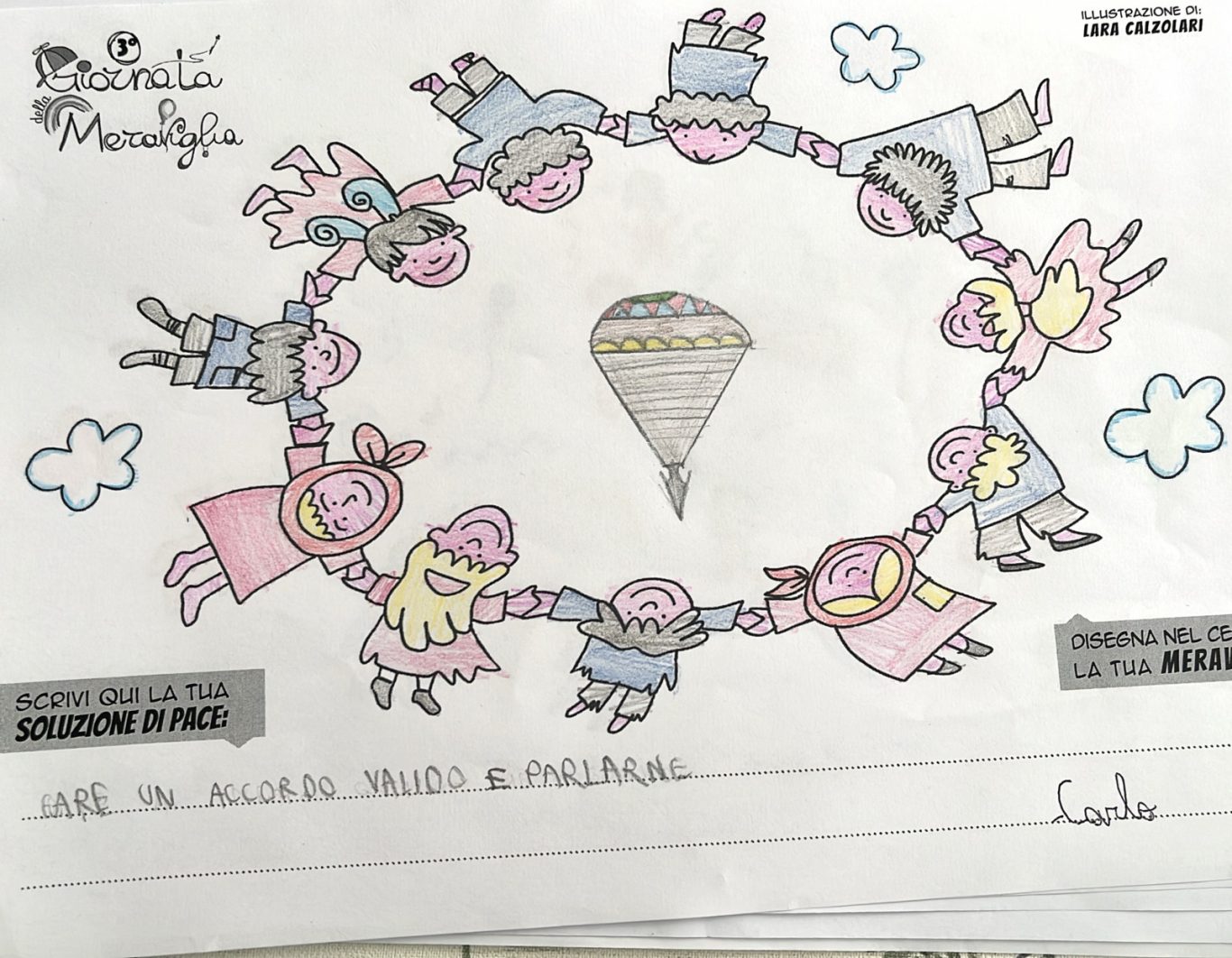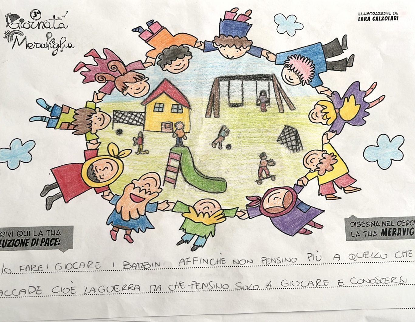 L’opera di sensibilizzazione si si esprime concretamente con la creazione di un DISEGNO DELLA MERAVIGLIA che andrà ad aiutare una delle 12 fatiche. Allo stesso modo chiederemo a tutti i partecipanti di andare a scrivere una “Soluzione di Pace” che possa aiutare anch’essa una delle 12 fatiche dei Bambini della guerra.