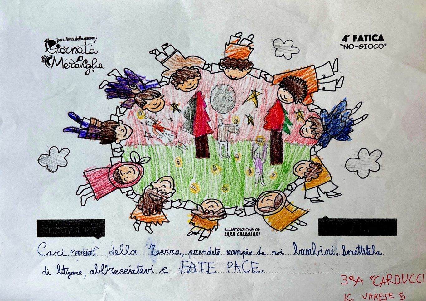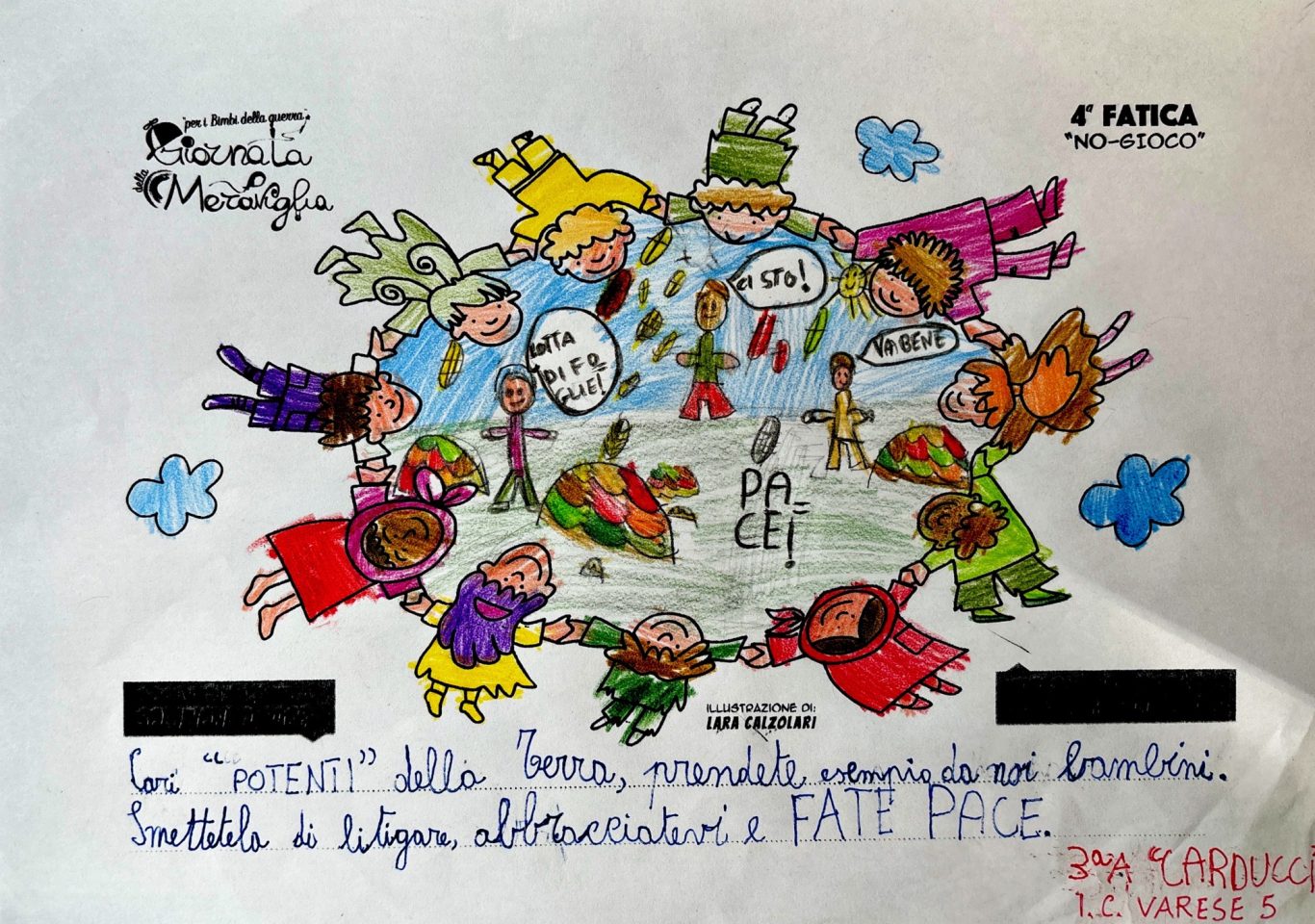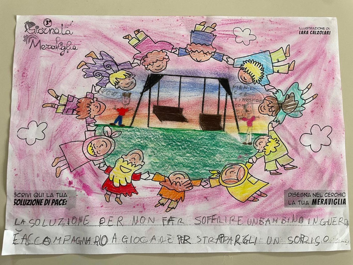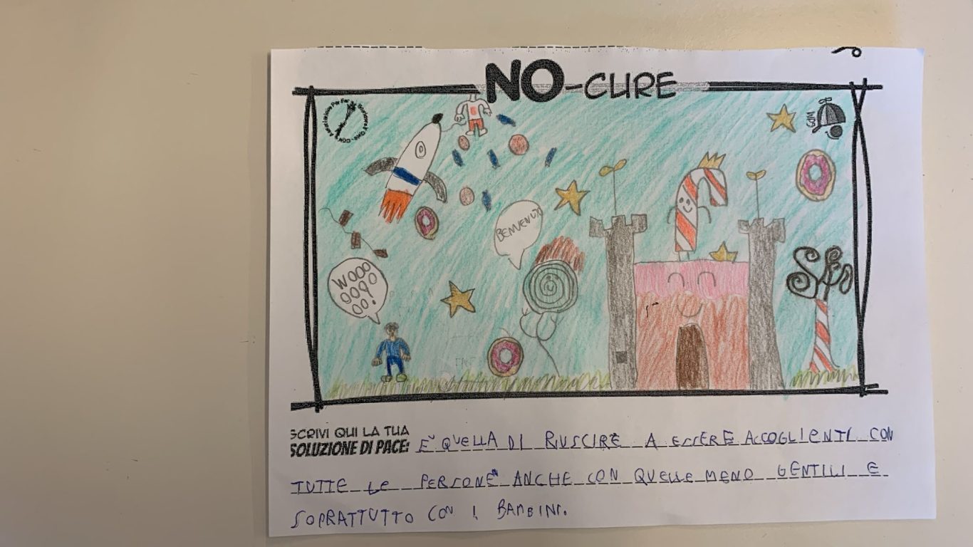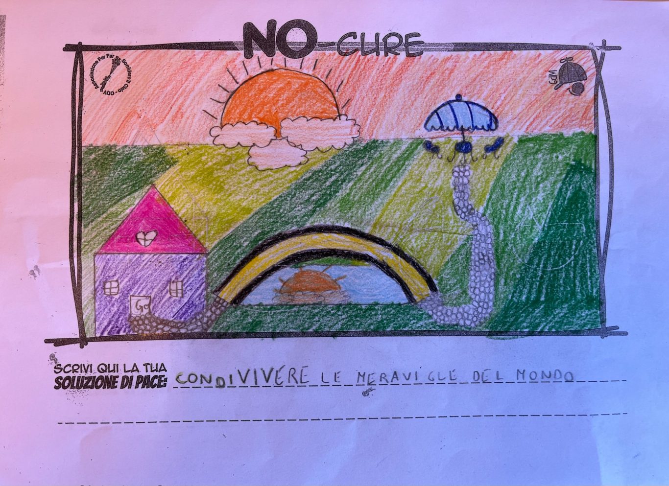 L’opera di sensibilizzazione si si esprime concretamente con la creazione di un DISEGNO DELLA MERAVIGLIA che andrà ad aiutare una delle 12 fatiche. Allo stesso modo chiederemo a tutti i partecipanti di andare a scrivere una “Soluzione di Pace” che possa aiutare anch’essa una delle 12 fatiche dei Bambini della guerra.