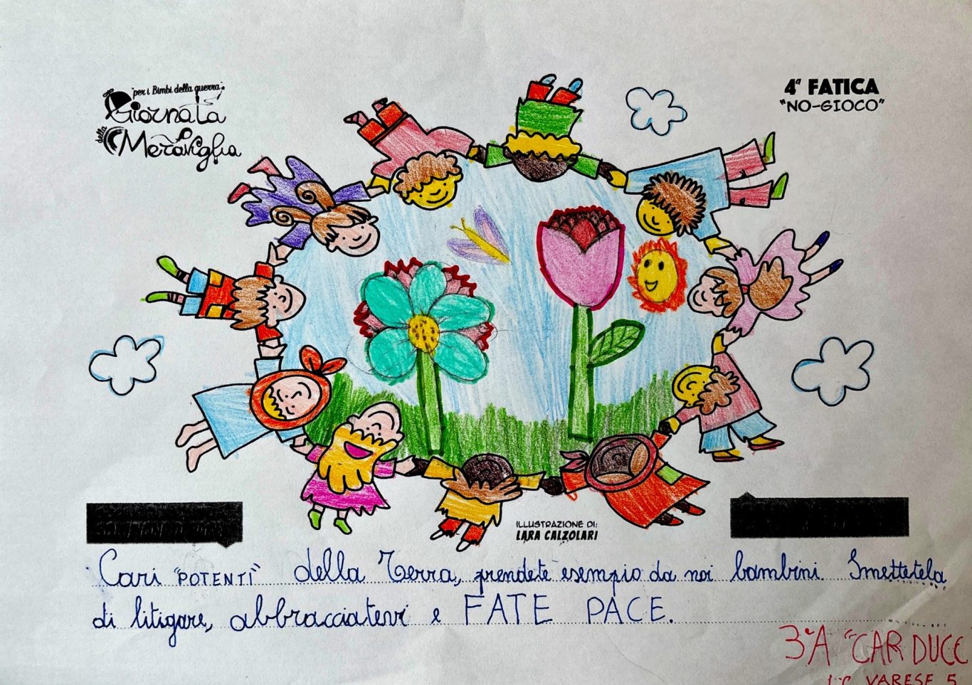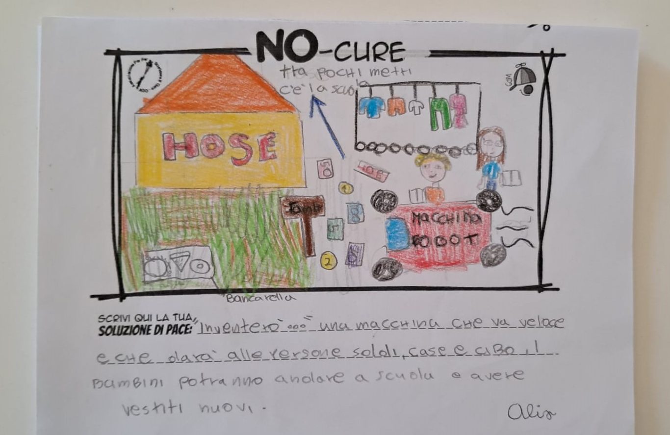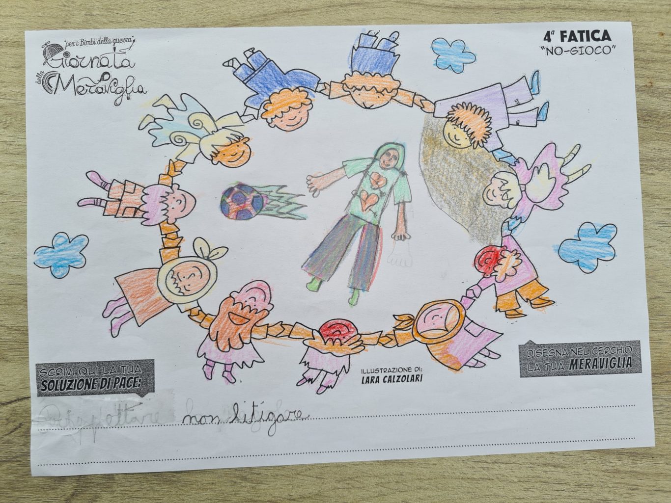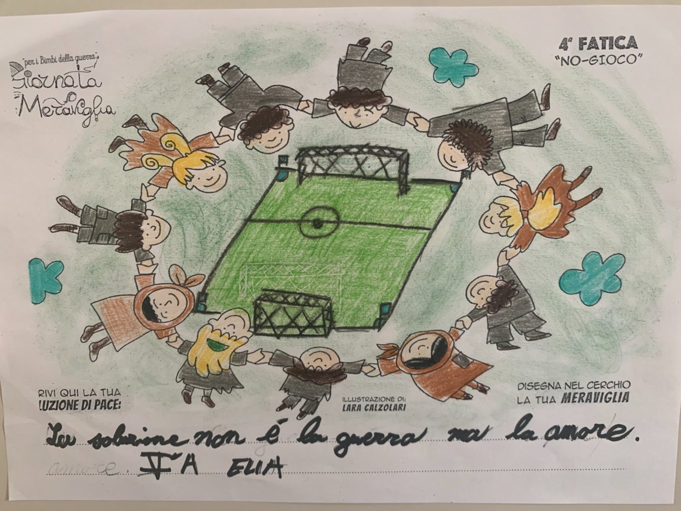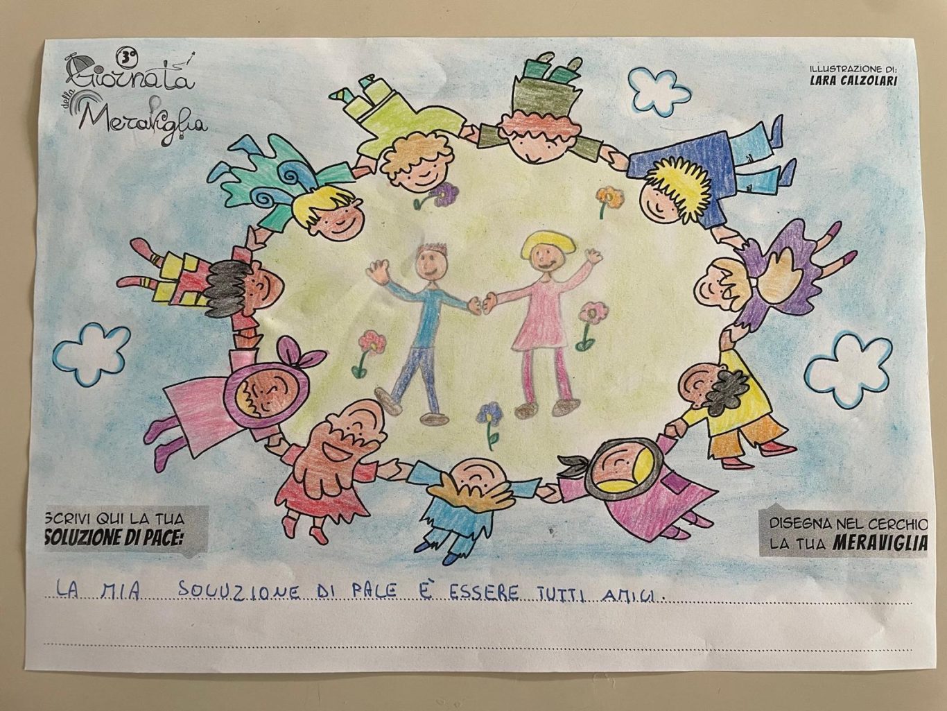 L’opera di sensibilizzazione si si esprime concretamente con la creazione di un DISEGNO DELLA MERAVIGLIA che andrà ad aiutare una delle 12 fatiche. Allo stesso modo chiederemo a tutti i partecipanti di andare a scrivere una “Soluzione di Pace” che possa aiutare anch’essa una delle 12 fatiche dei Bambini della guerra.