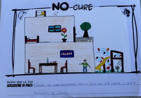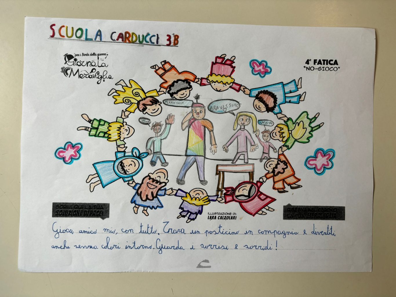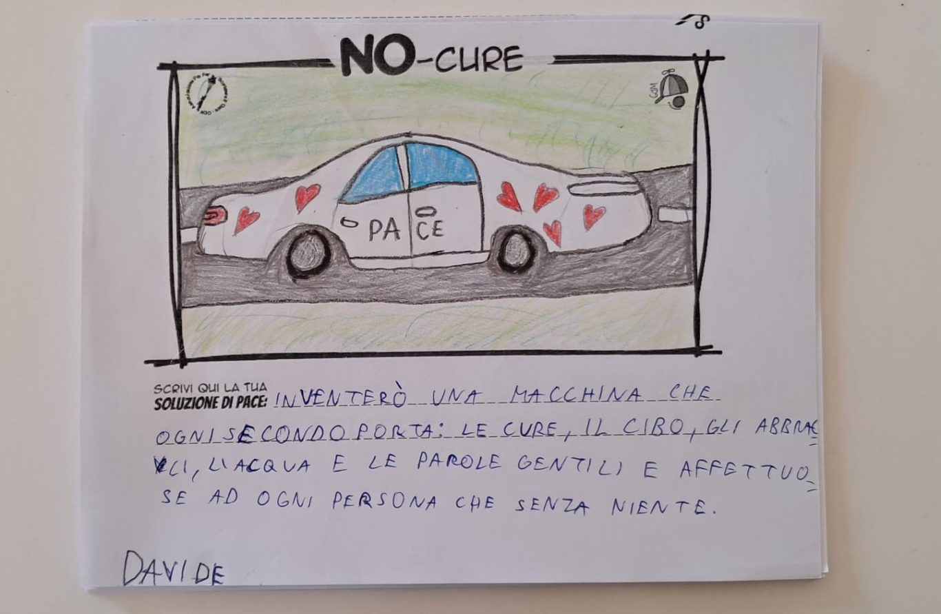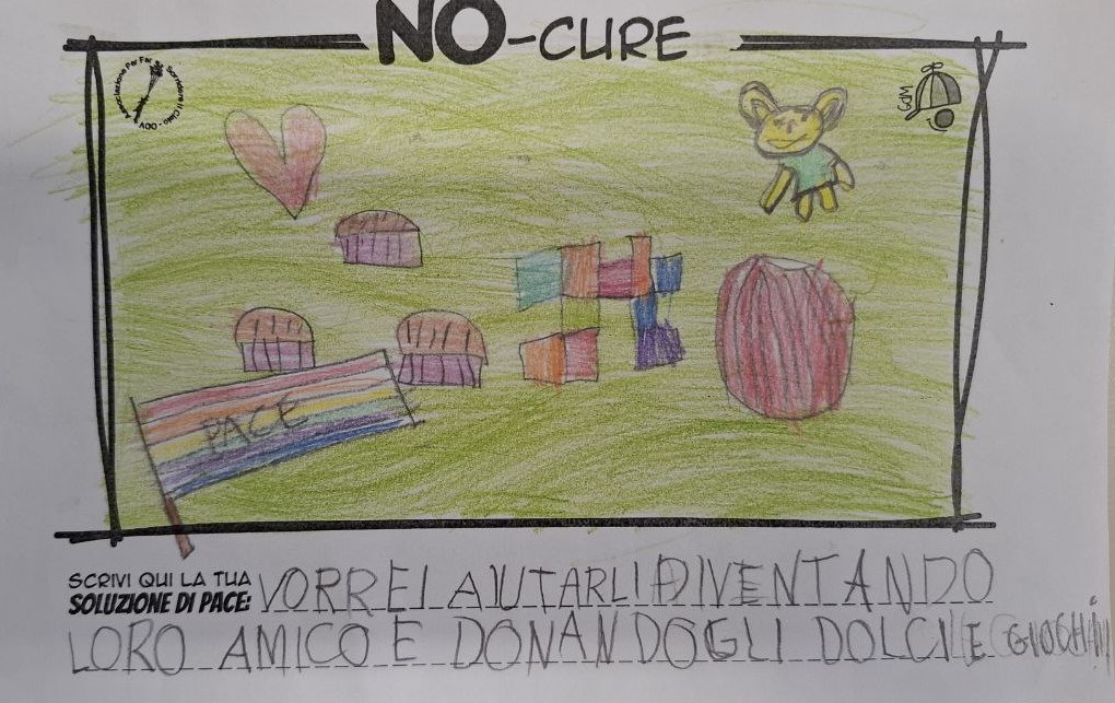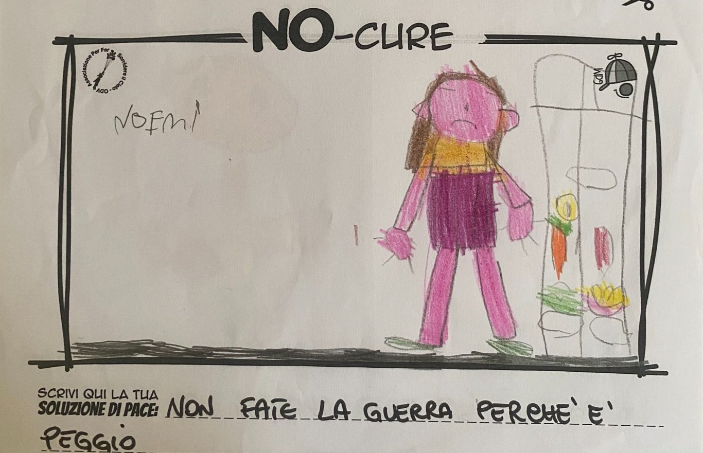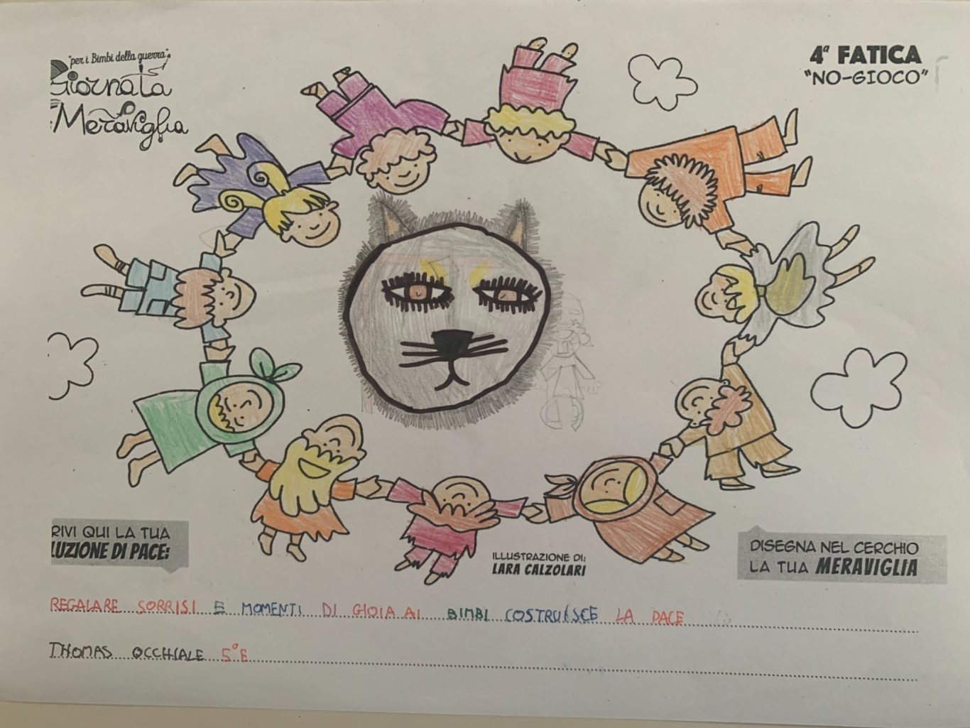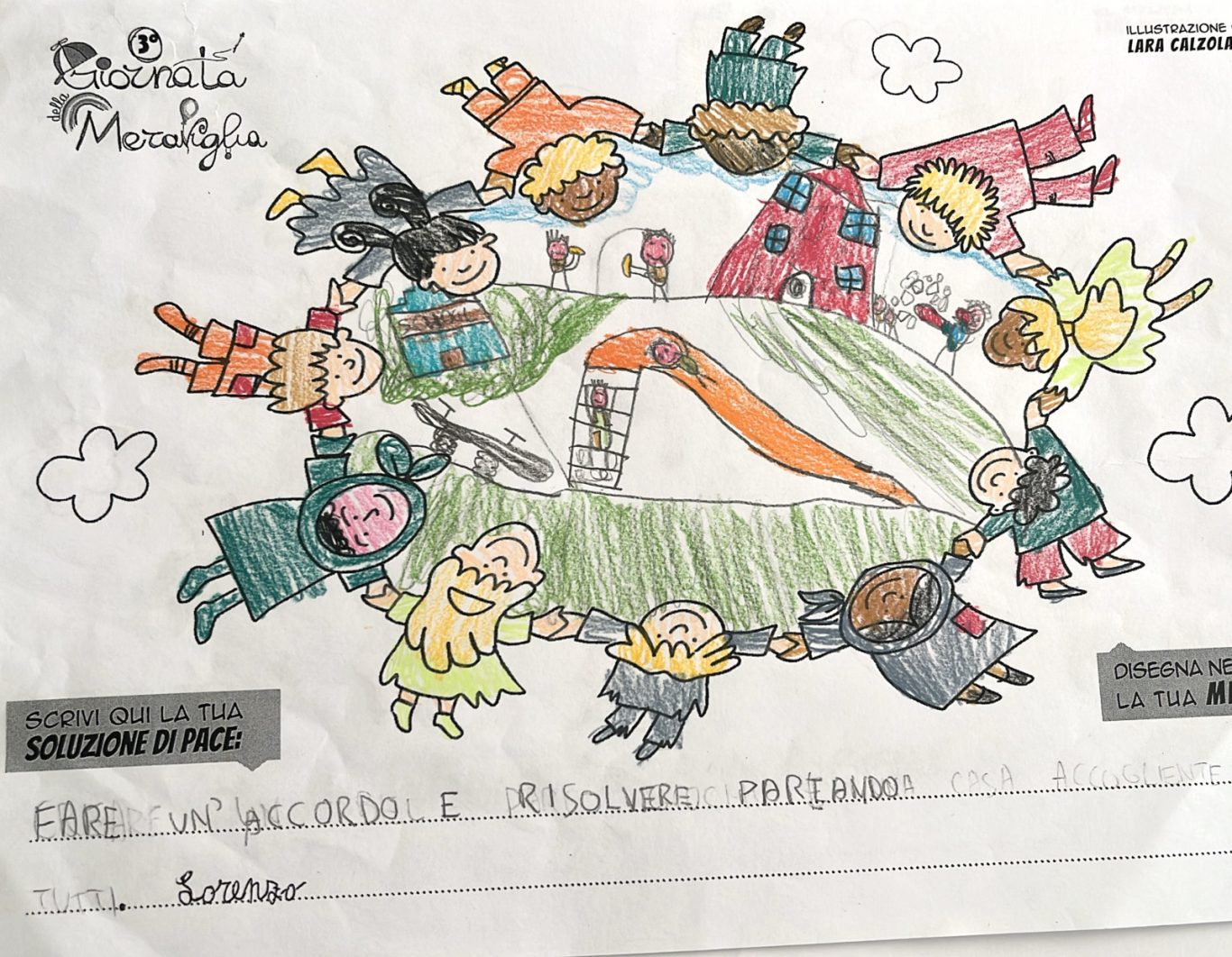 L’opera di sensibilizzazione si si esprime concretamente con la creazione di un DISEGNO DELLA MERAVIGLIA che andrà ad aiutare una delle 12 fatiche. Allo stesso modo chiederemo a tutti i partecipanti di andare a scrivere una “Soluzione di Pace” che possa aiutare anch’essa una delle 12 fatiche dei Bambini della guerra.