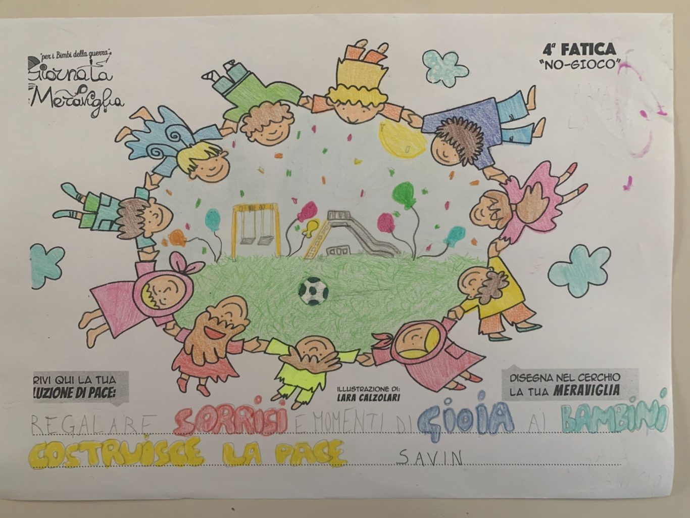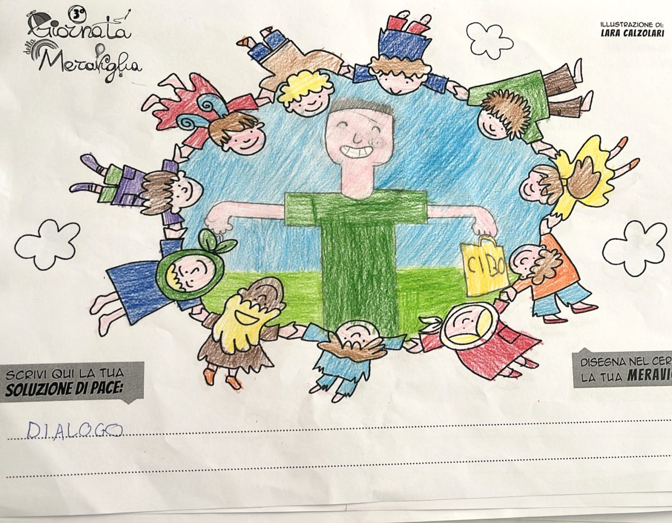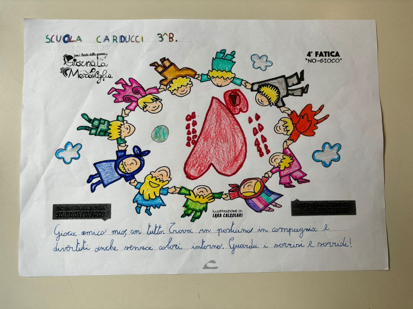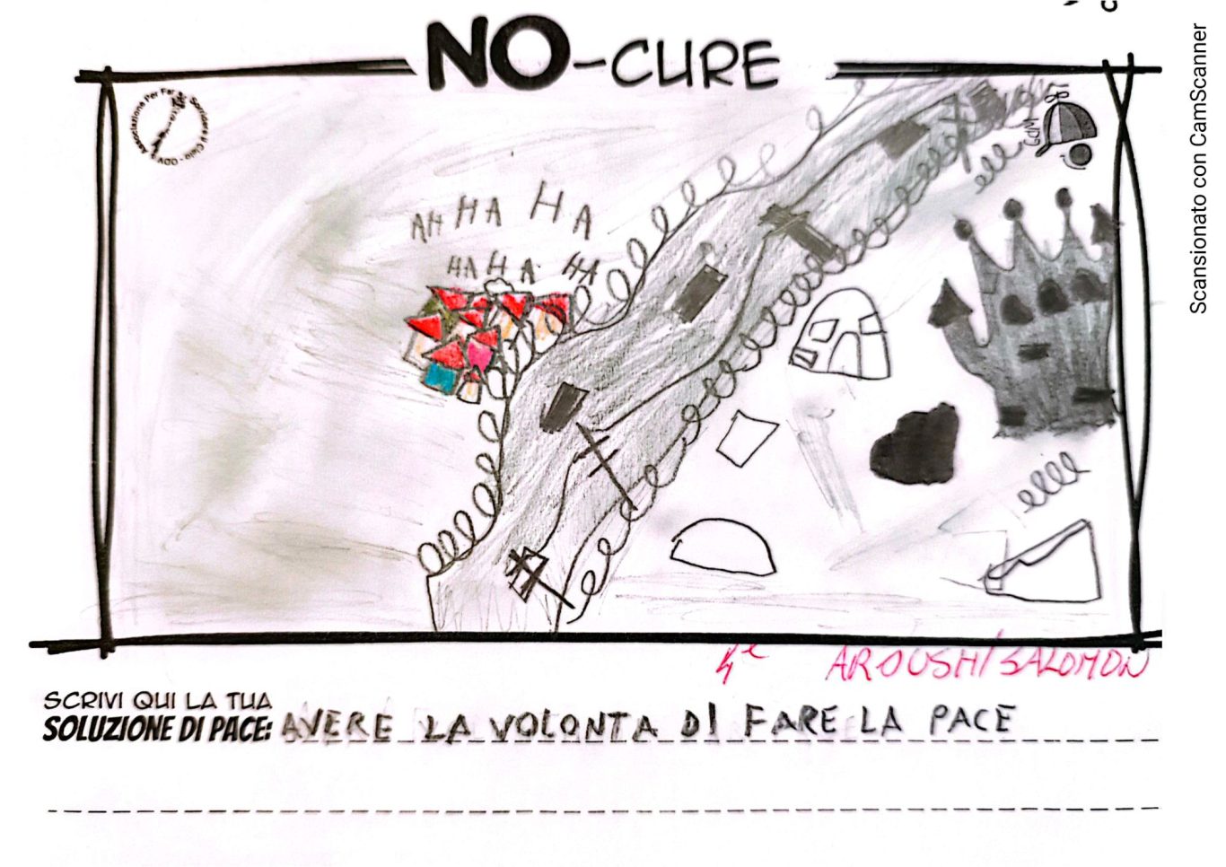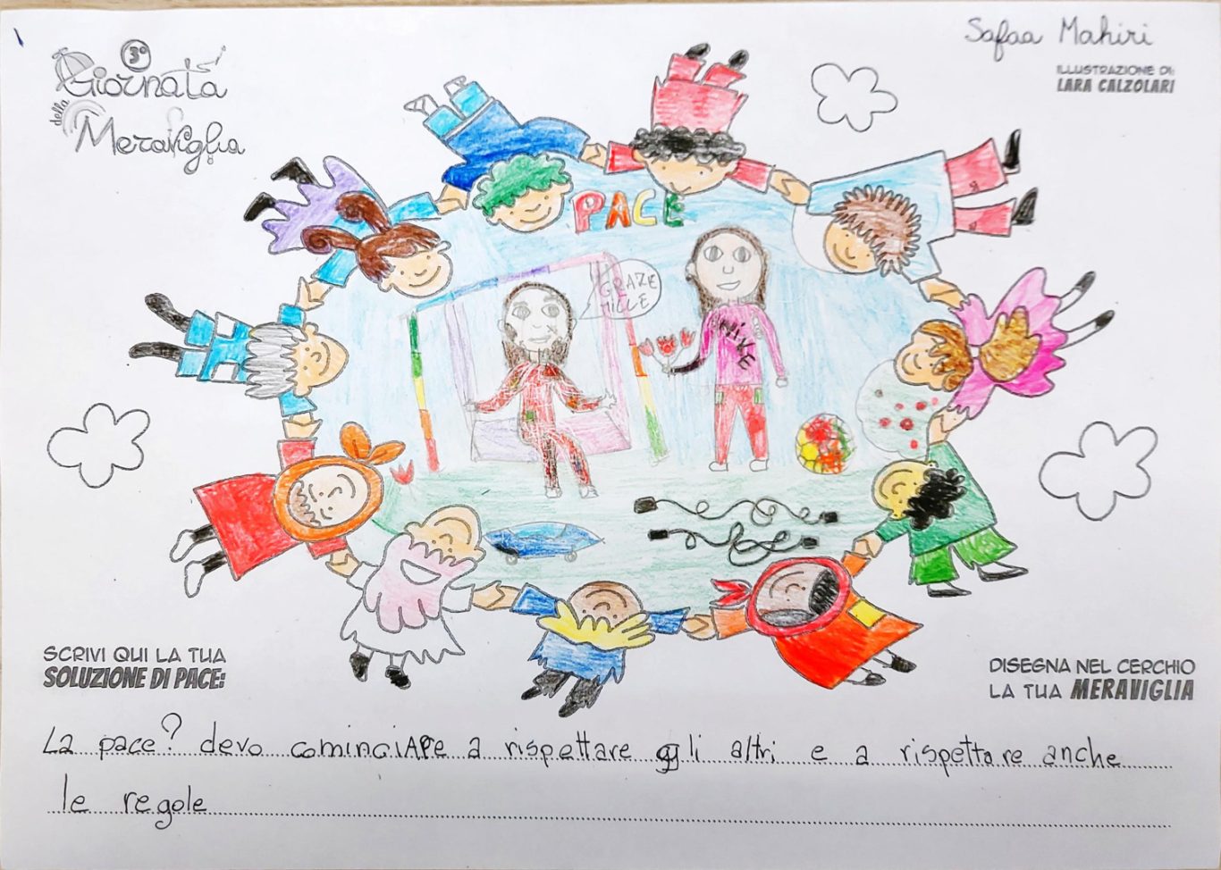 L’opera di sensibilizzazione si si esprime concretamente con la creazione di un DISEGNO DELLA MERAVIGLIA che andrà ad aiutare una delle 12 fatiche. Allo stesso modo chiederemo a tutti i partecipanti di andare a scrivere una “Soluzione di Pace” che possa aiutare anch’essa una delle 12 fatiche dei Bambini della guerra.