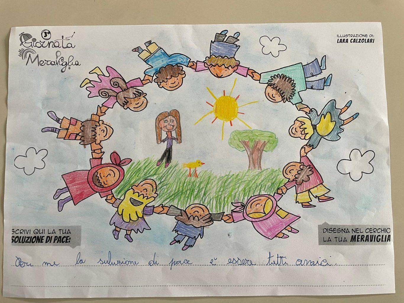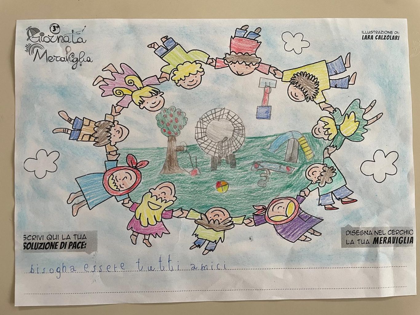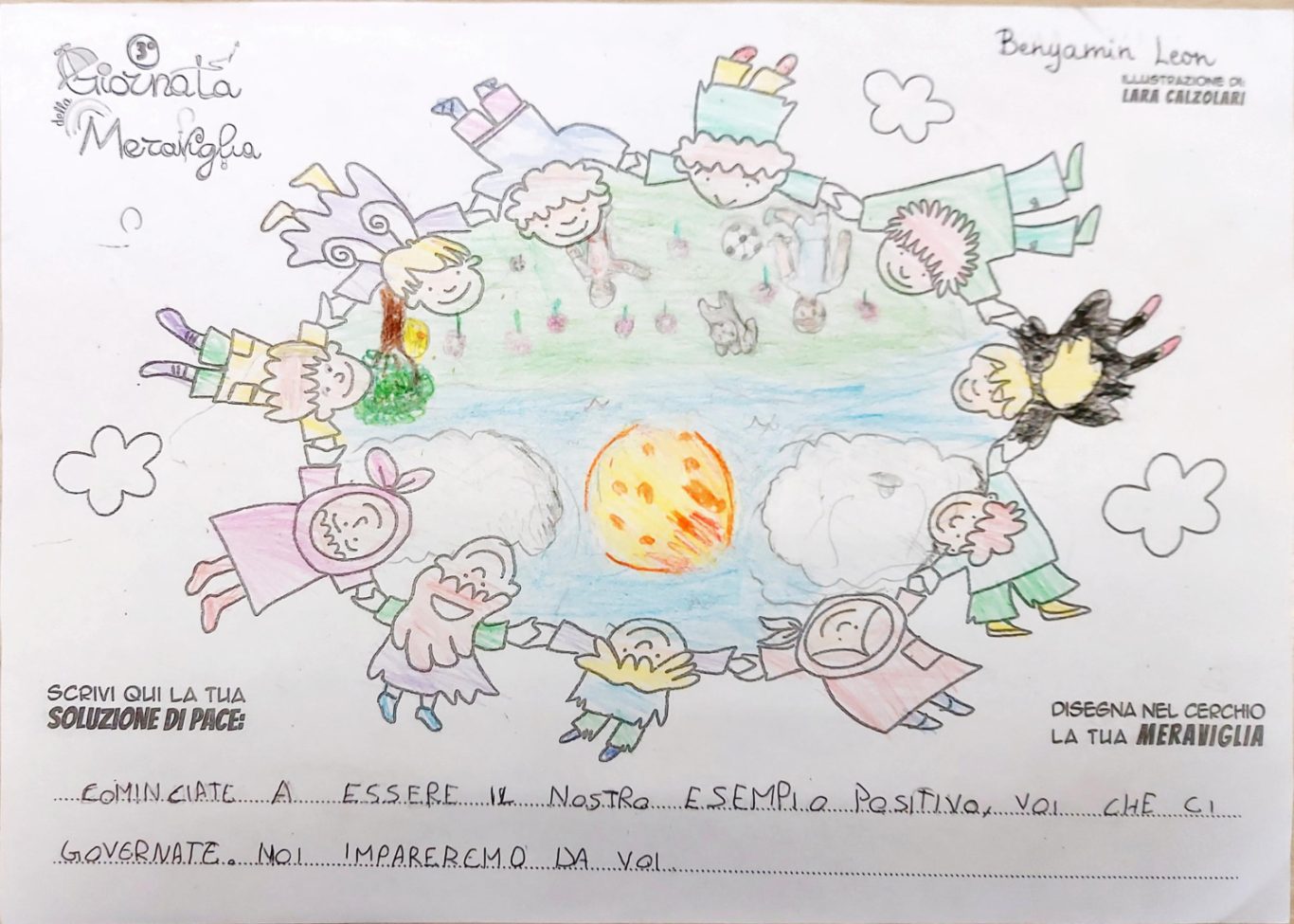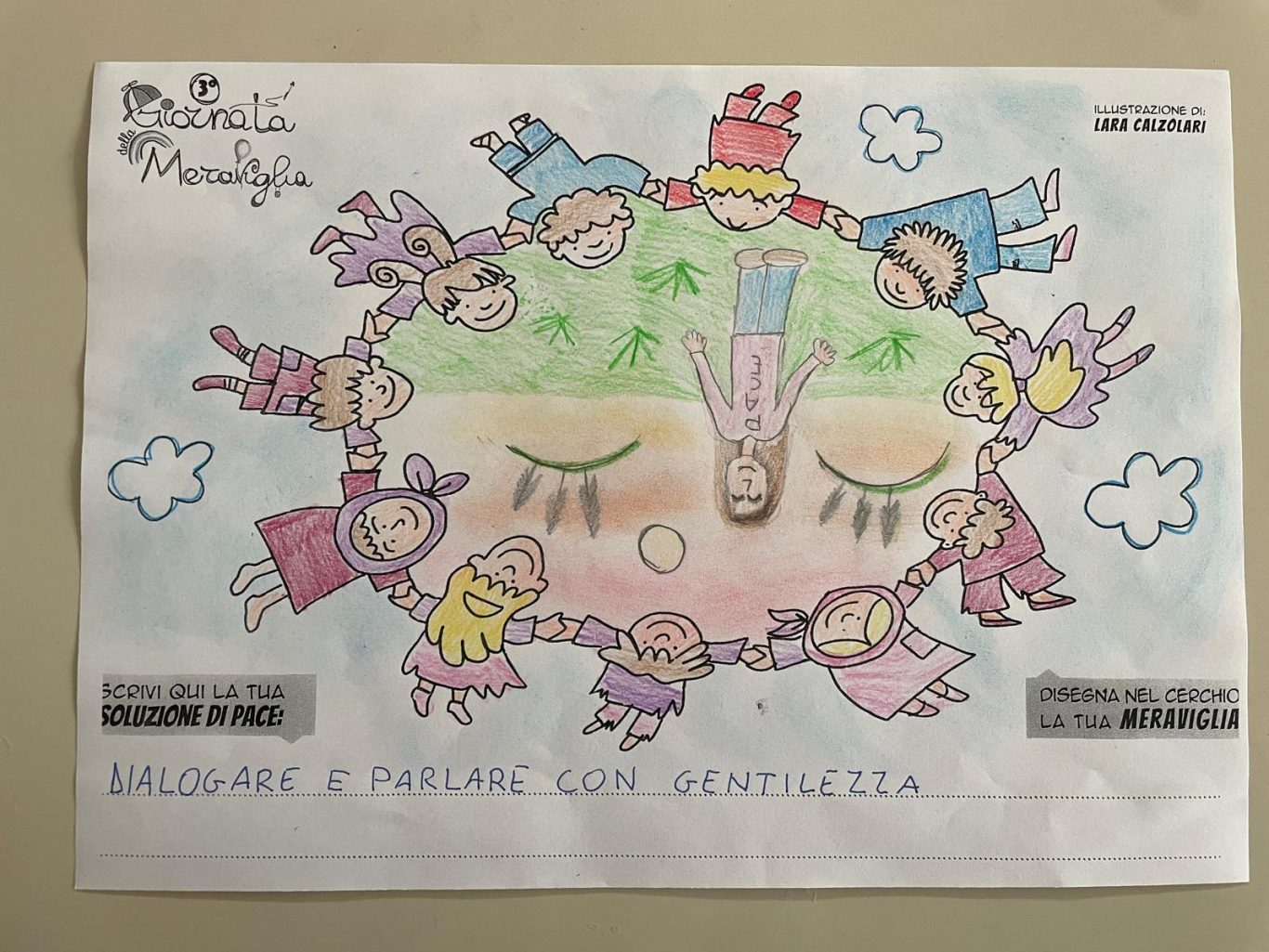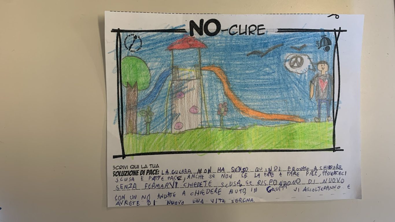 L’opera di sensibilizzazione si si esprime concretamente con la creazione di un DISEGNO DELLA MERAVIGLIA che andrà ad aiutare una delle 12 fatiche. Allo stesso modo chiederemo a tutti i partecipanti di andare a scrivere una “Soluzione di Pace” che possa aiutare anch’essa una delle 12 fatiche dei Bambini della guerra.