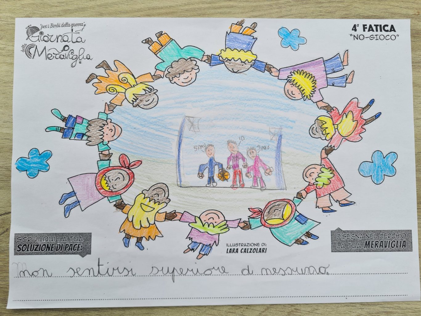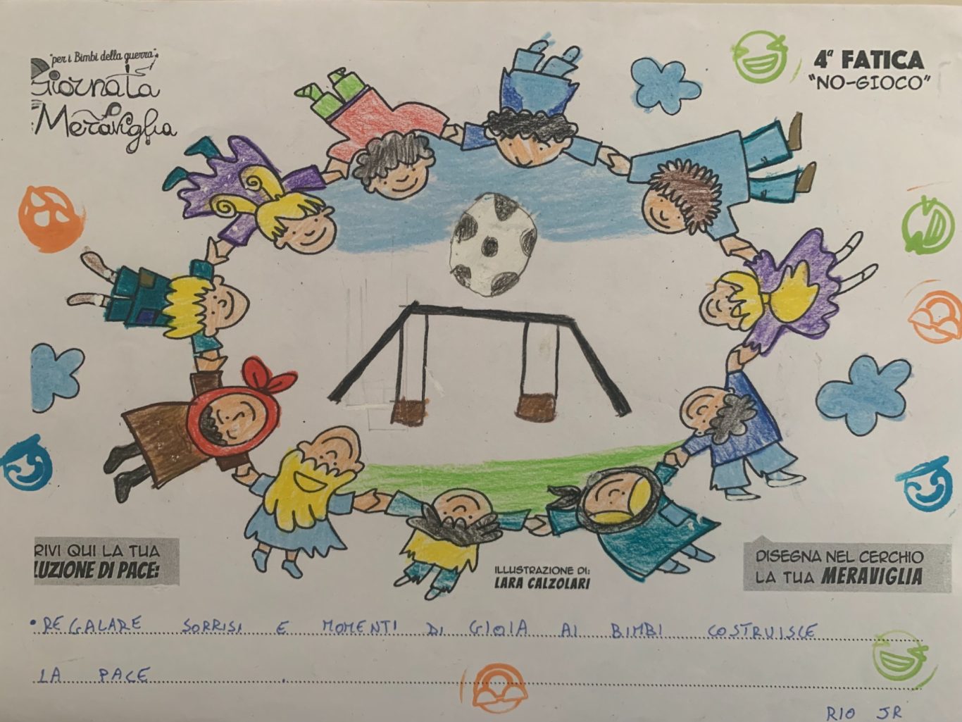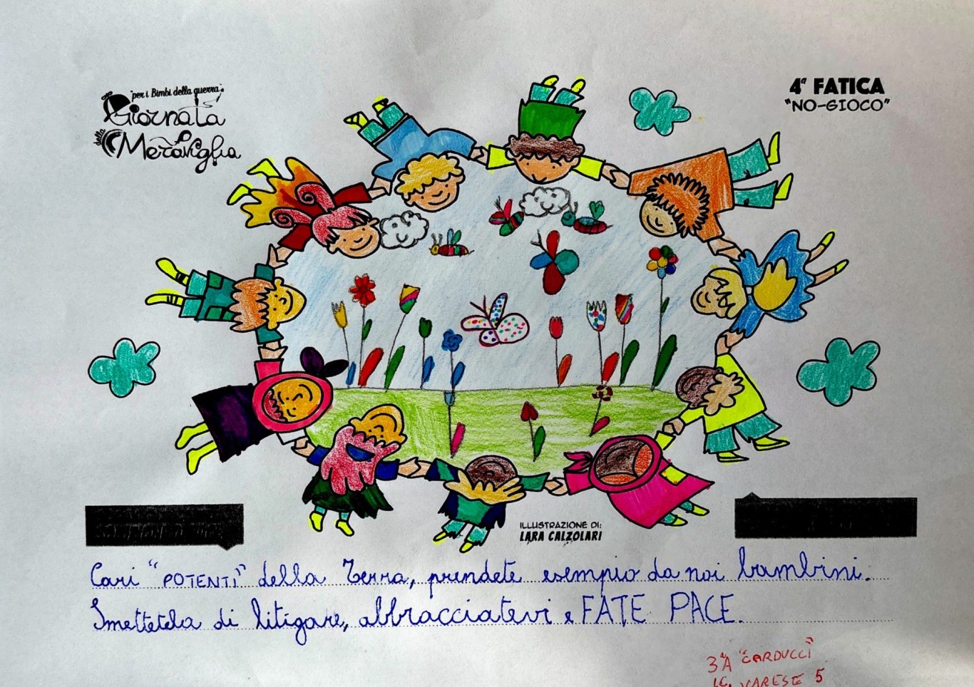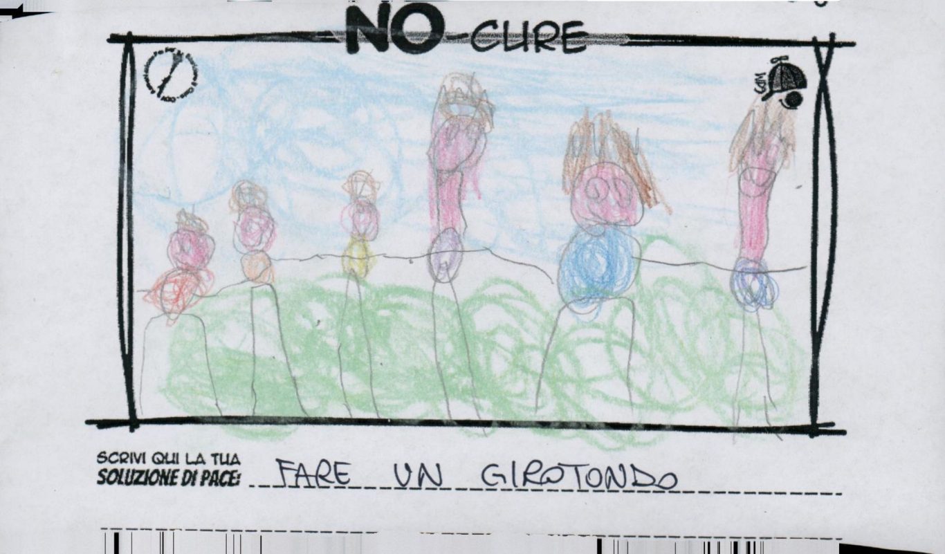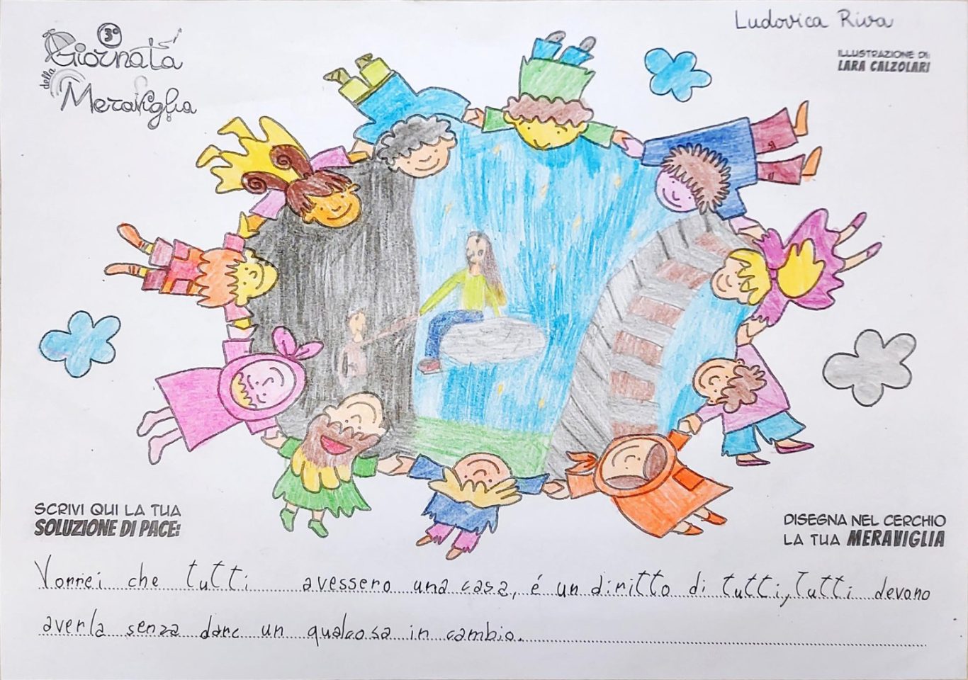L’opera di sensibilizzazione si si esprime concretamente con la creazione di un DISEGNO DELLA MERAVIGLIA che andrà ad aiutare una delle 12 fatiche. Allo stesso modo chiederemo a tutti i partecipanti di andare a scrivere una “Soluzione di Pace” che possa aiutare anch’essa una delle 12 fatiche dei Bambini della guerra.