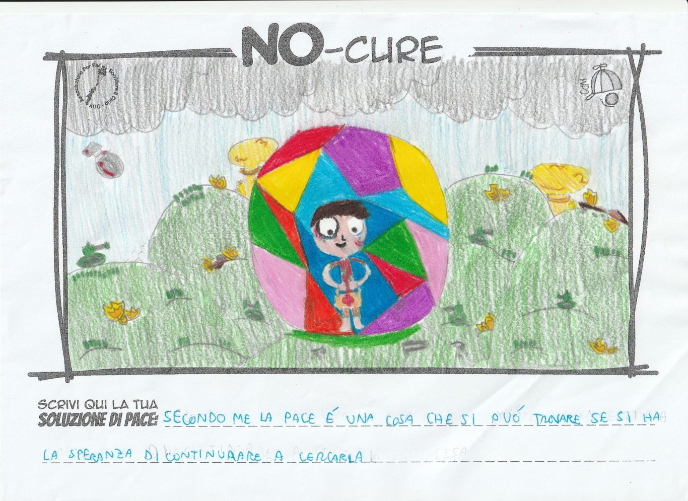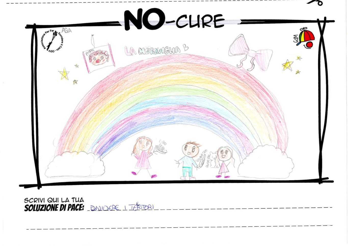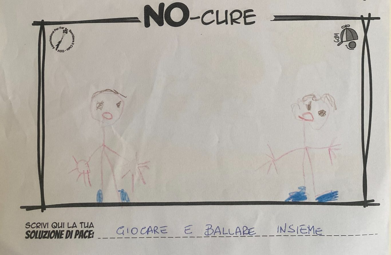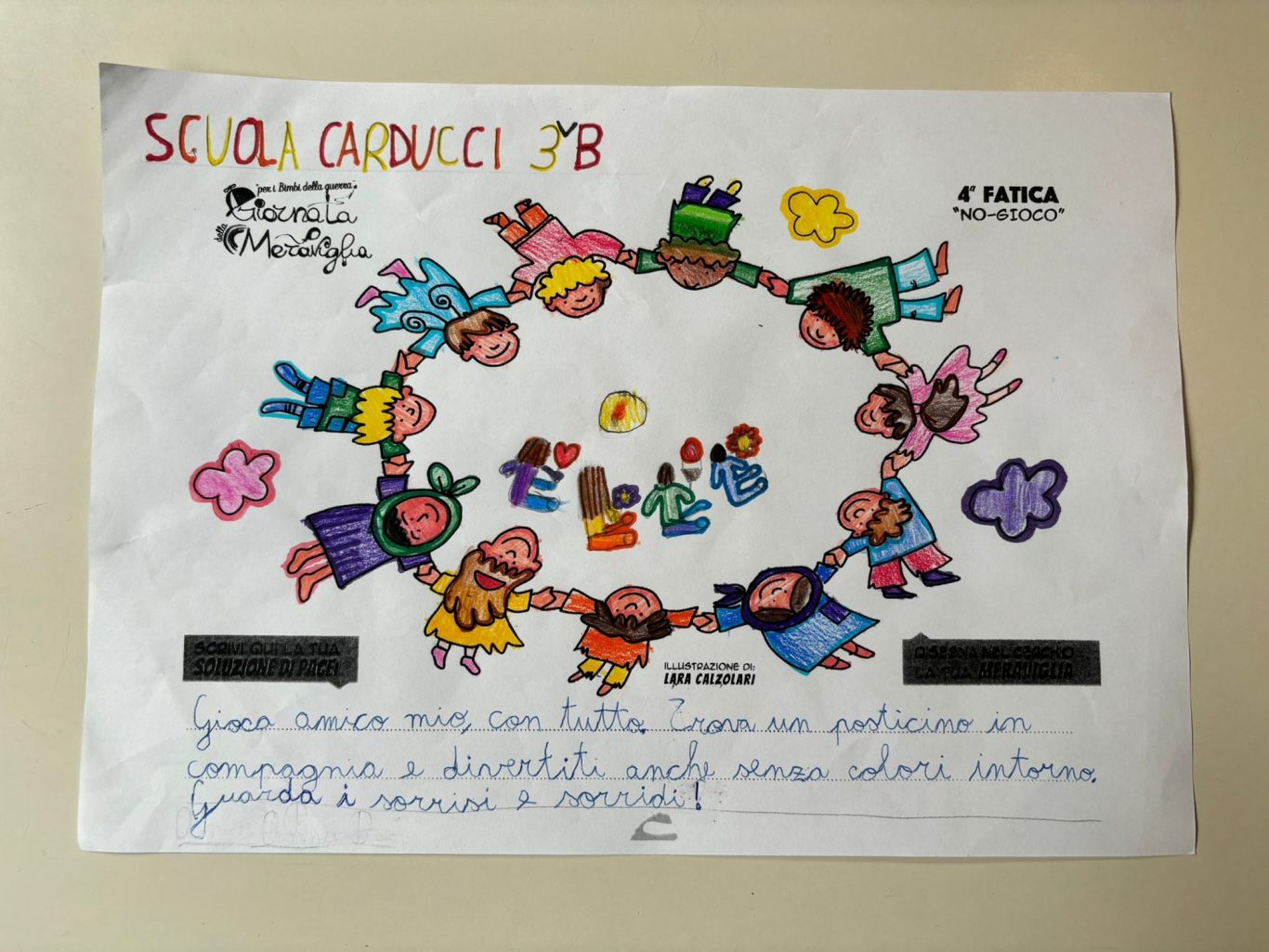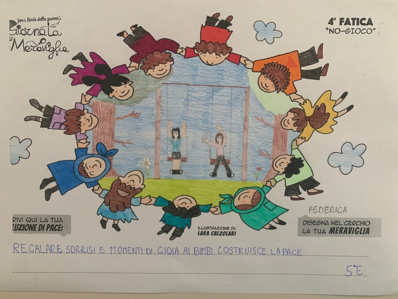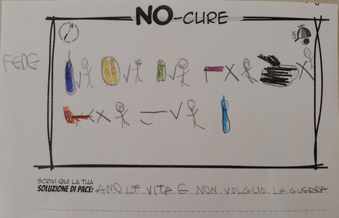 L’opera di sensibilizzazione si si esprime concretamente con la creazione di un DISEGNO DELLA MERAVIGLIA che andrà ad aiutare una delle 12 fatiche. Allo stesso modo chiederemo a tutti i partecipanti di andare a scrivere una “Soluzione di Pace” che possa aiutare anch’essa una delle 12 fatiche dei Bambini della guerra.