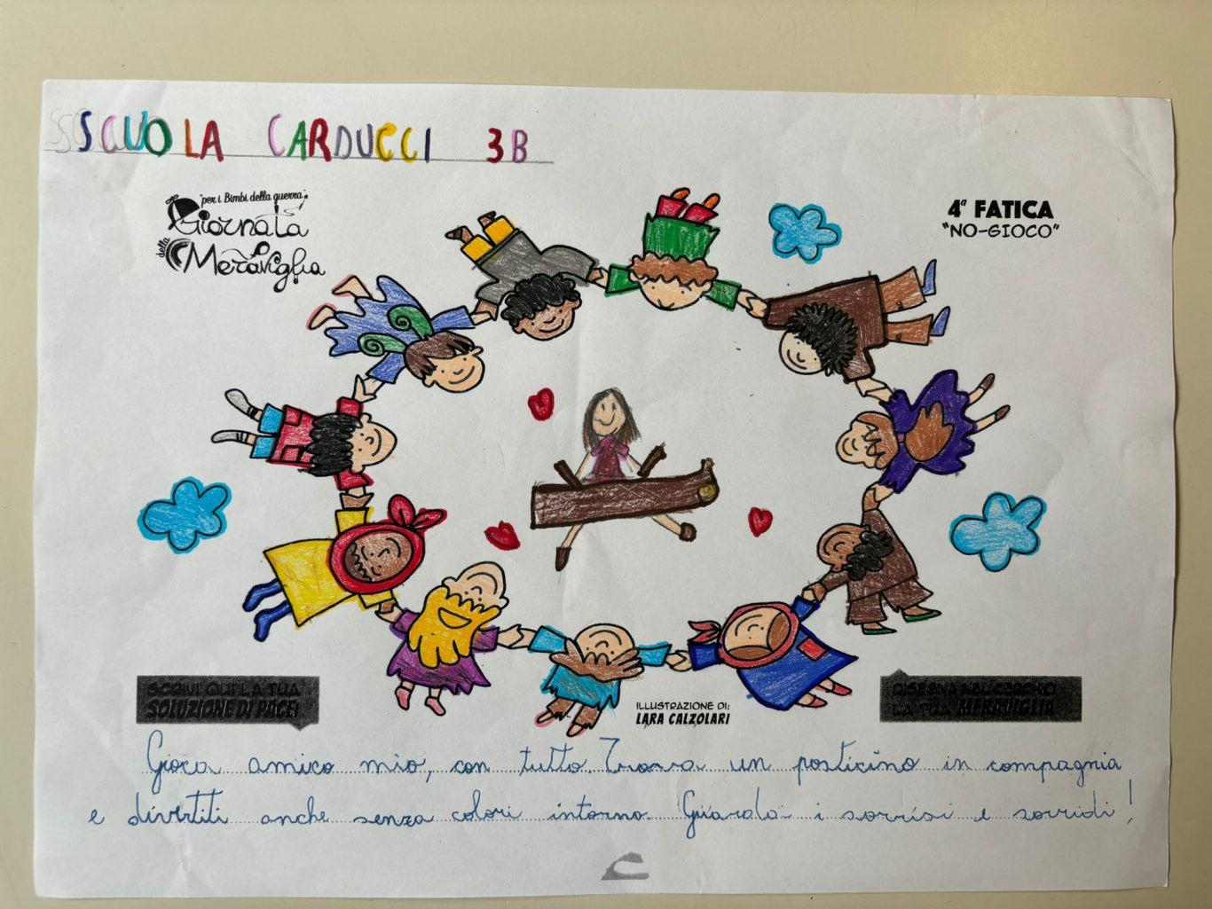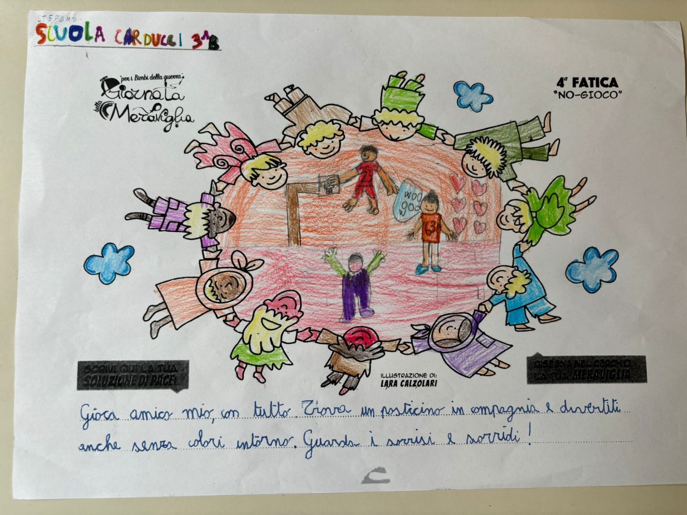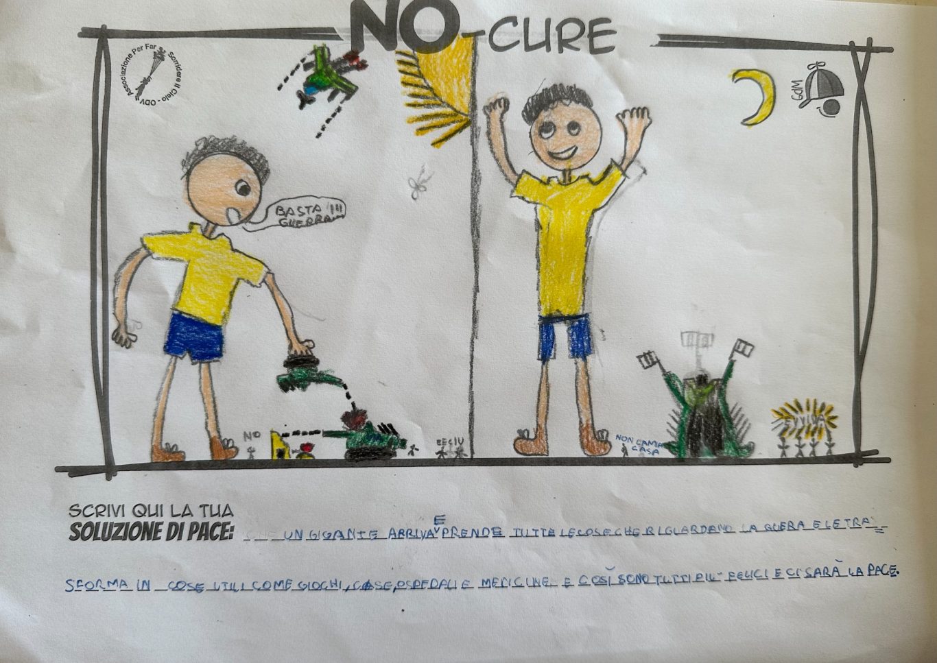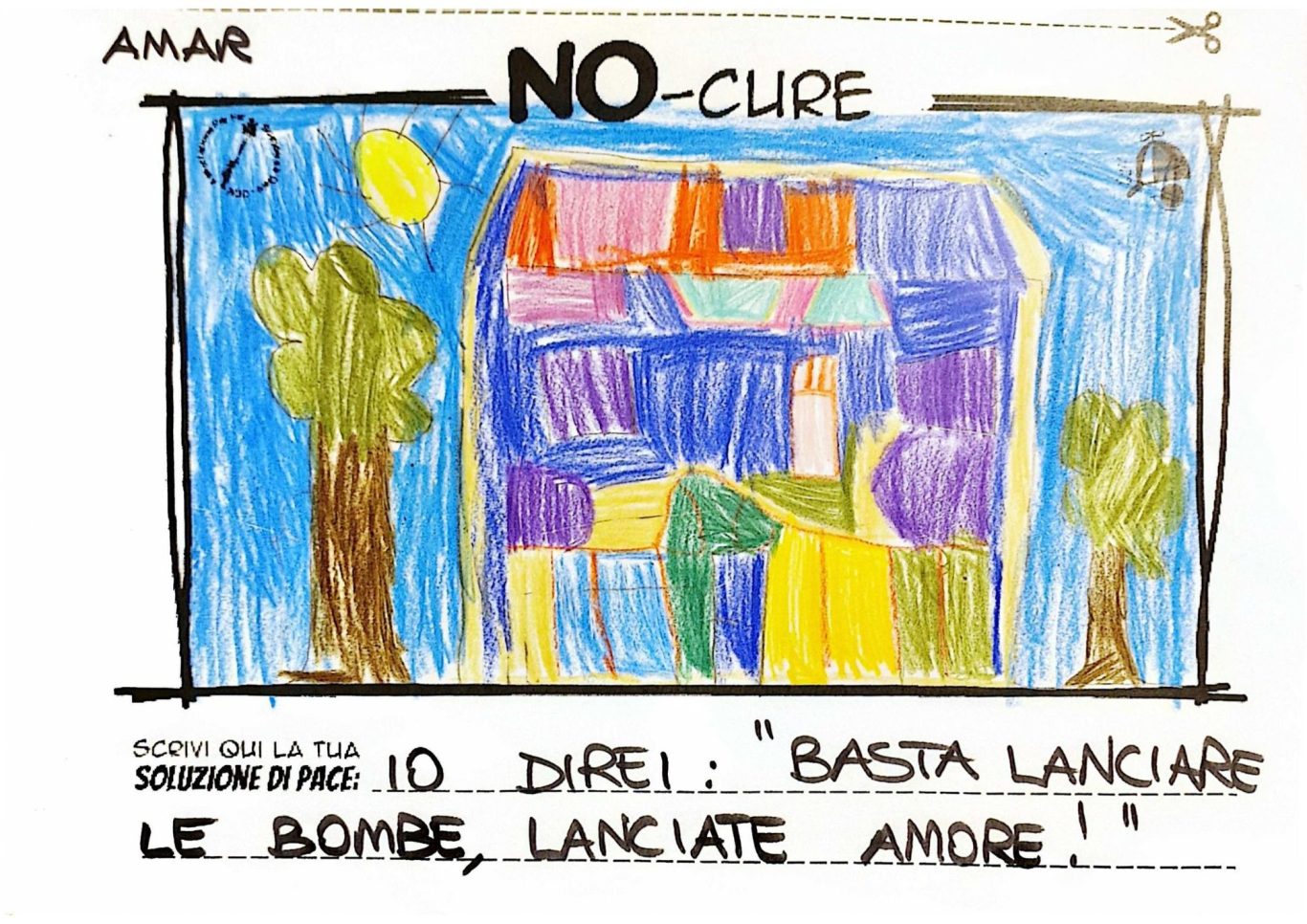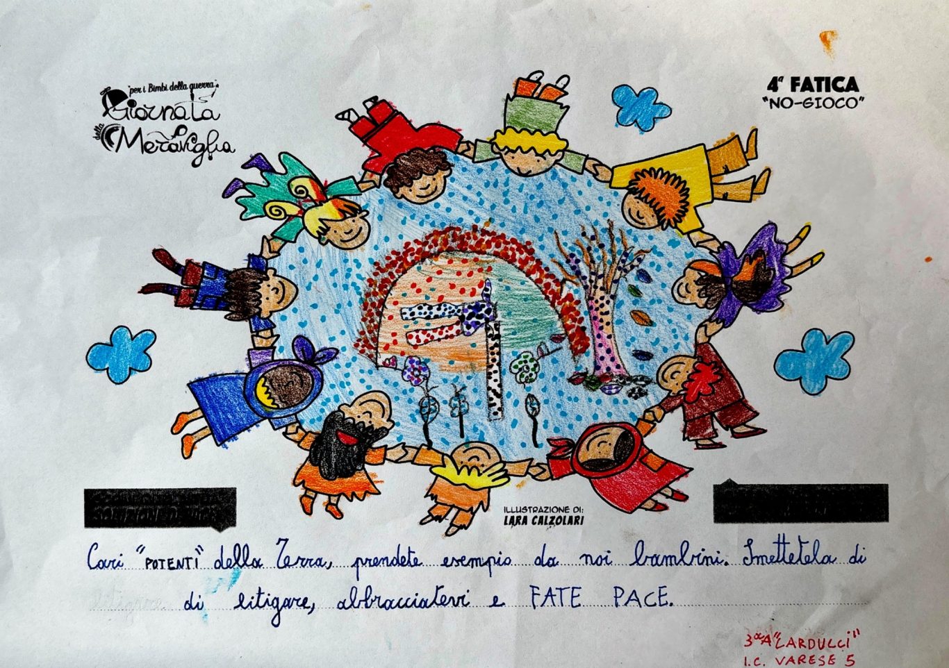 L’opera di sensibilizzazione si si esprime concretamente con la creazione di un DISEGNO DELLA MERAVIGLIA che andrà ad aiutare una delle 12 fatiche. Allo stesso modo chiederemo a tutti i partecipanti di andare a scrivere una “Soluzione di Pace” che possa aiutare anch’essa una delle 12 fatiche dei Bambini della guerra.