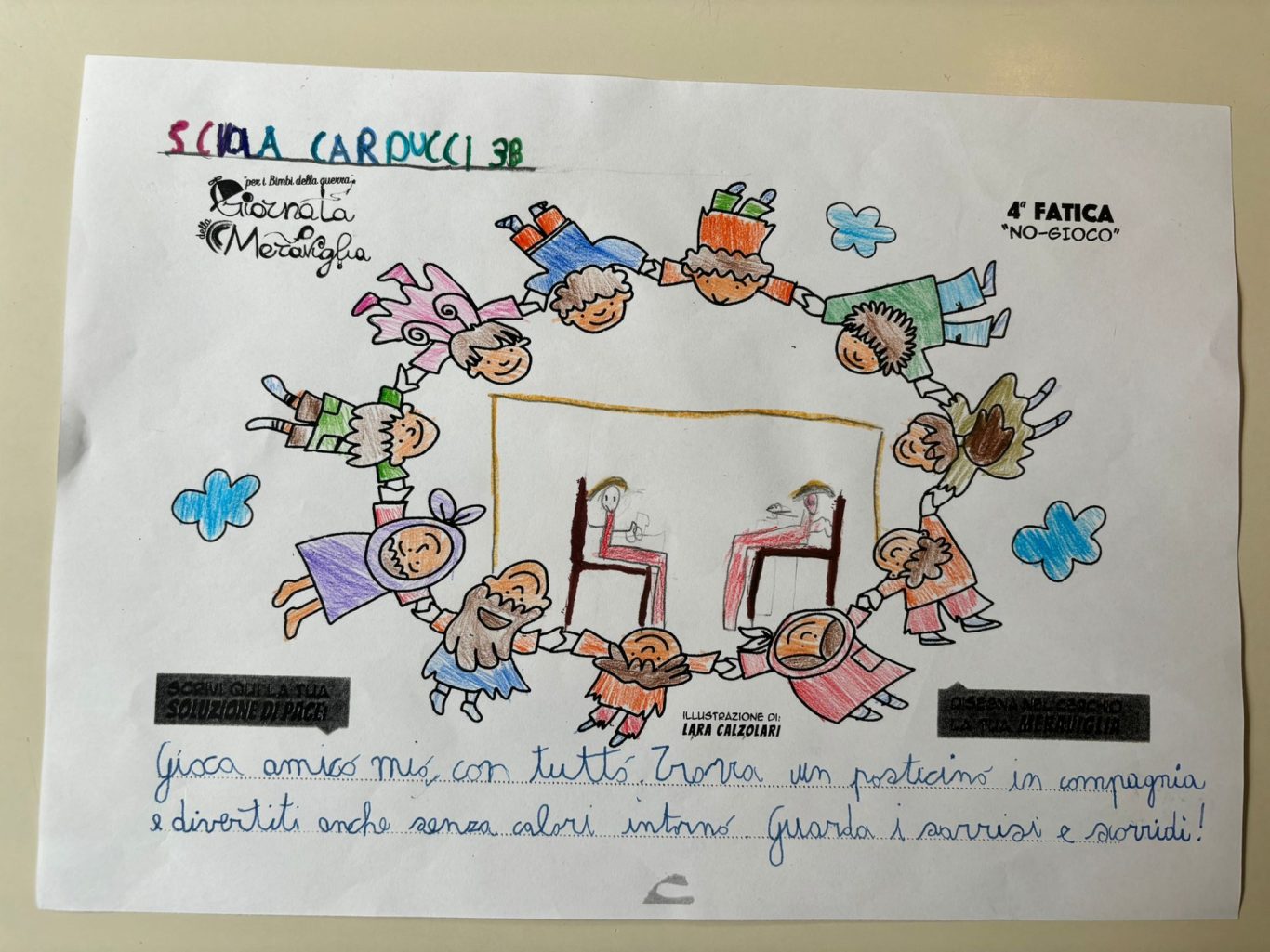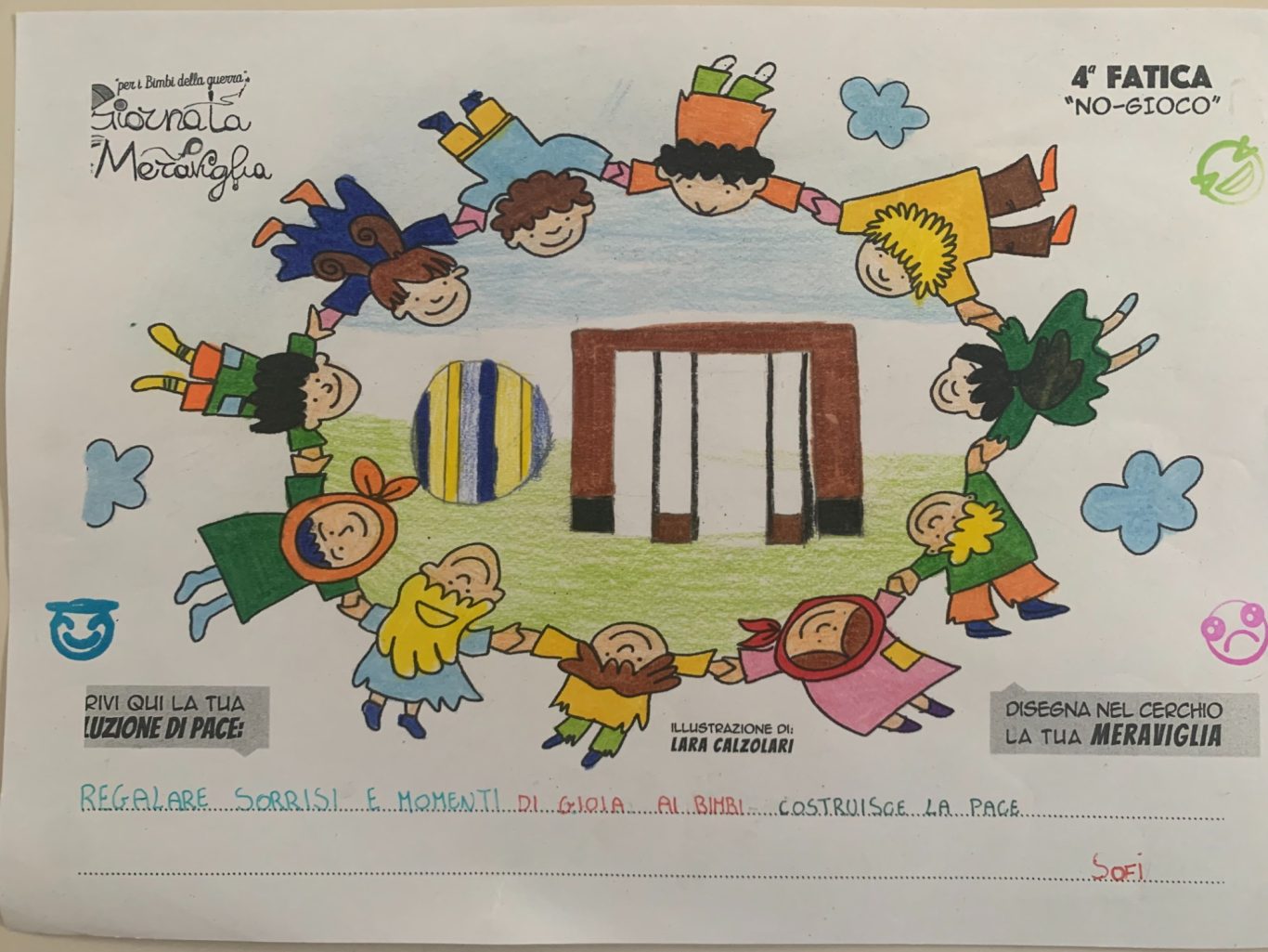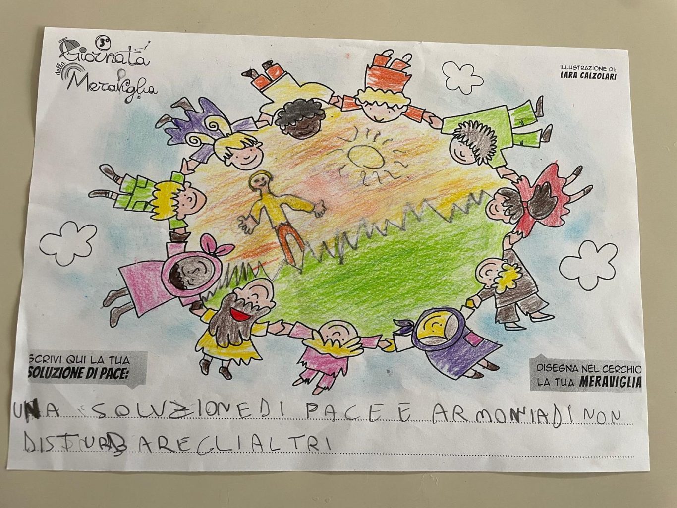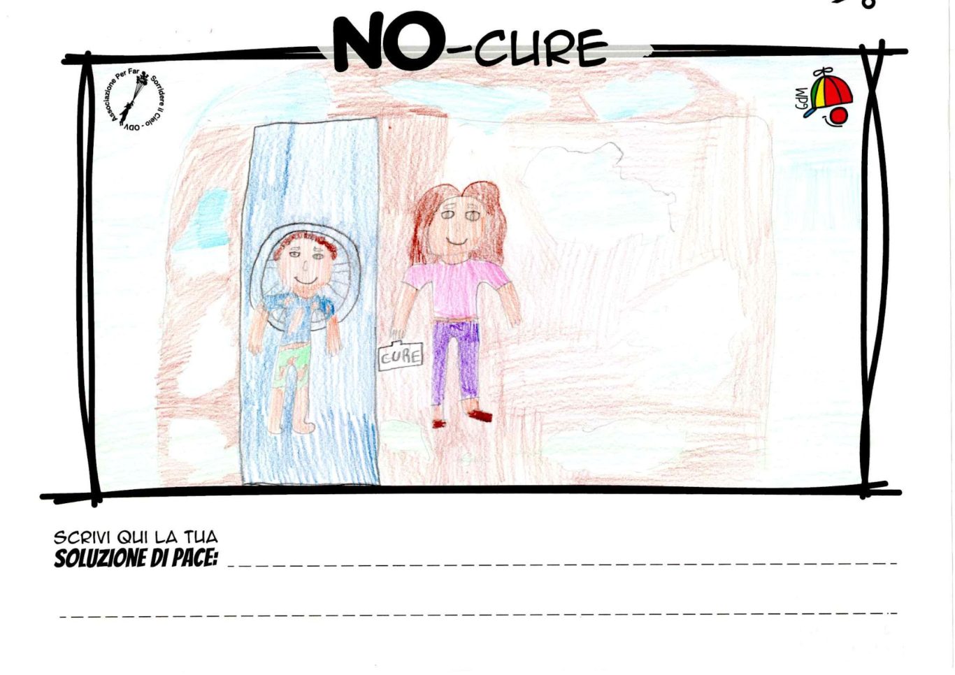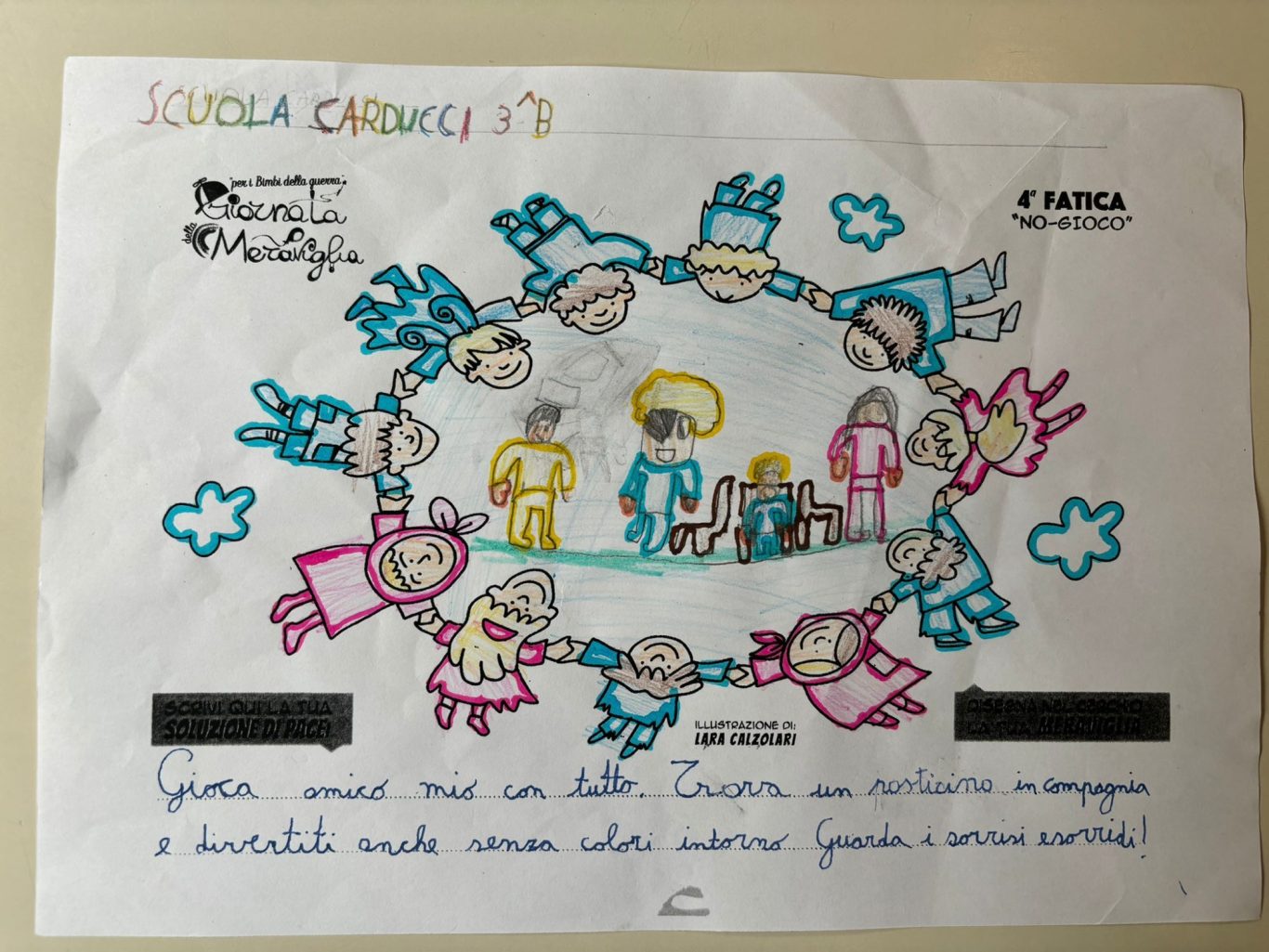 L’opera di sensibilizzazione si si esprime concretamente con la creazione di un DISEGNO DELLA MERAVIGLIA che andrà ad aiutare una delle 12 fatiche. Allo stesso modo chiederemo a tutti i partecipanti di andare a scrivere una “Soluzione di Pace” che possa aiutare anch’essa una delle 12 fatiche dei Bambini della guerra.