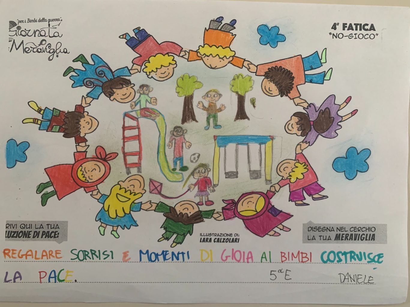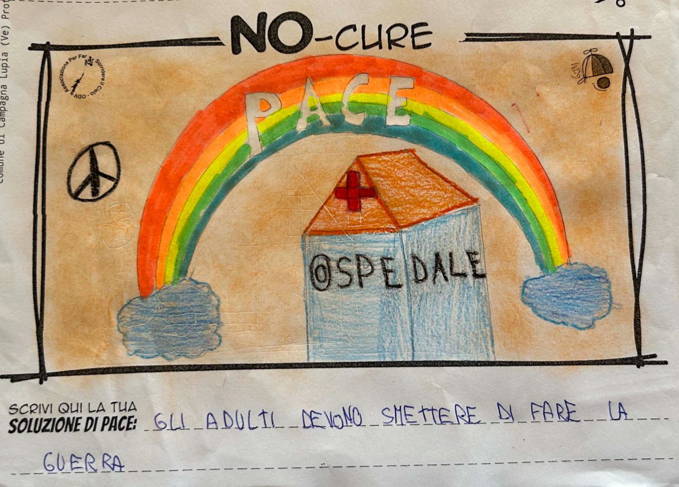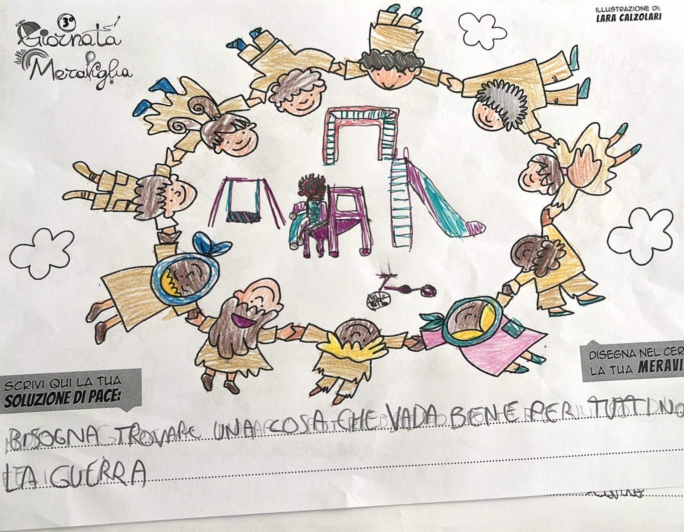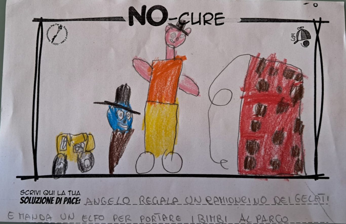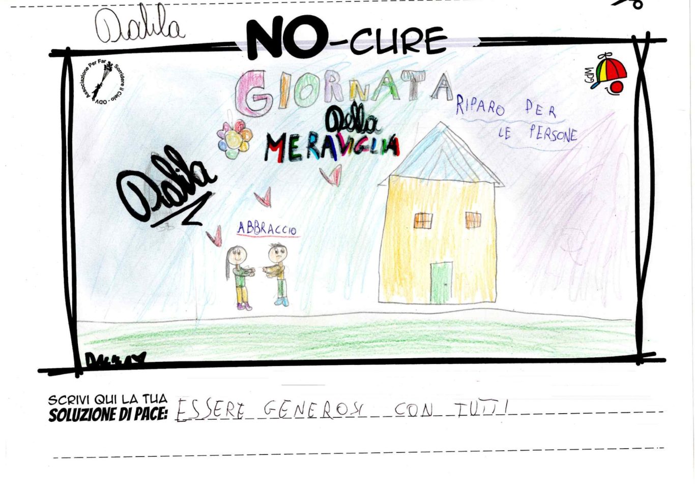 L’opera di sensibilizzazione si si esprime concretamente con la creazione di un DISEGNO DELLA MERAVIGLIA che andrà ad aiutare una delle 12 fatiche. Allo stesso modo chiederemo a tutti i partecipanti di andare a scrivere una “Soluzione di Pace” che possa aiutare anch’essa una delle 12 fatiche dei Bambini della guerra.