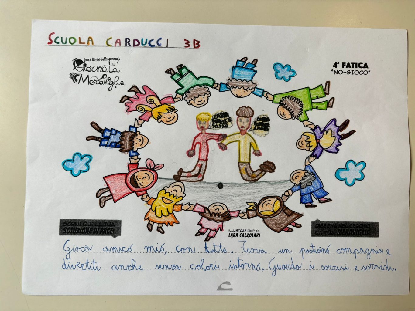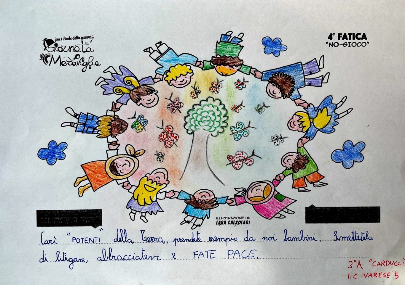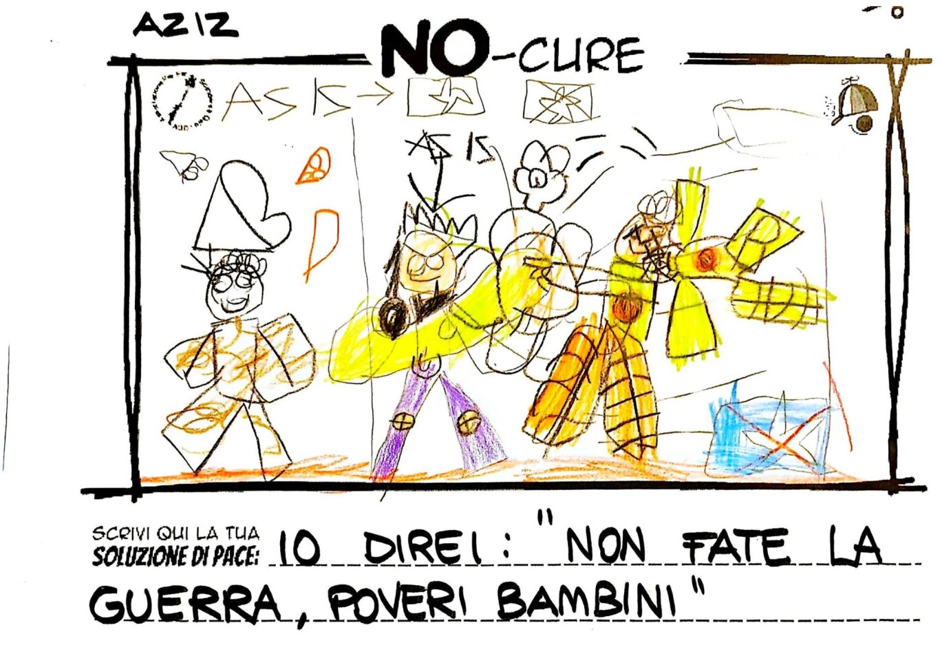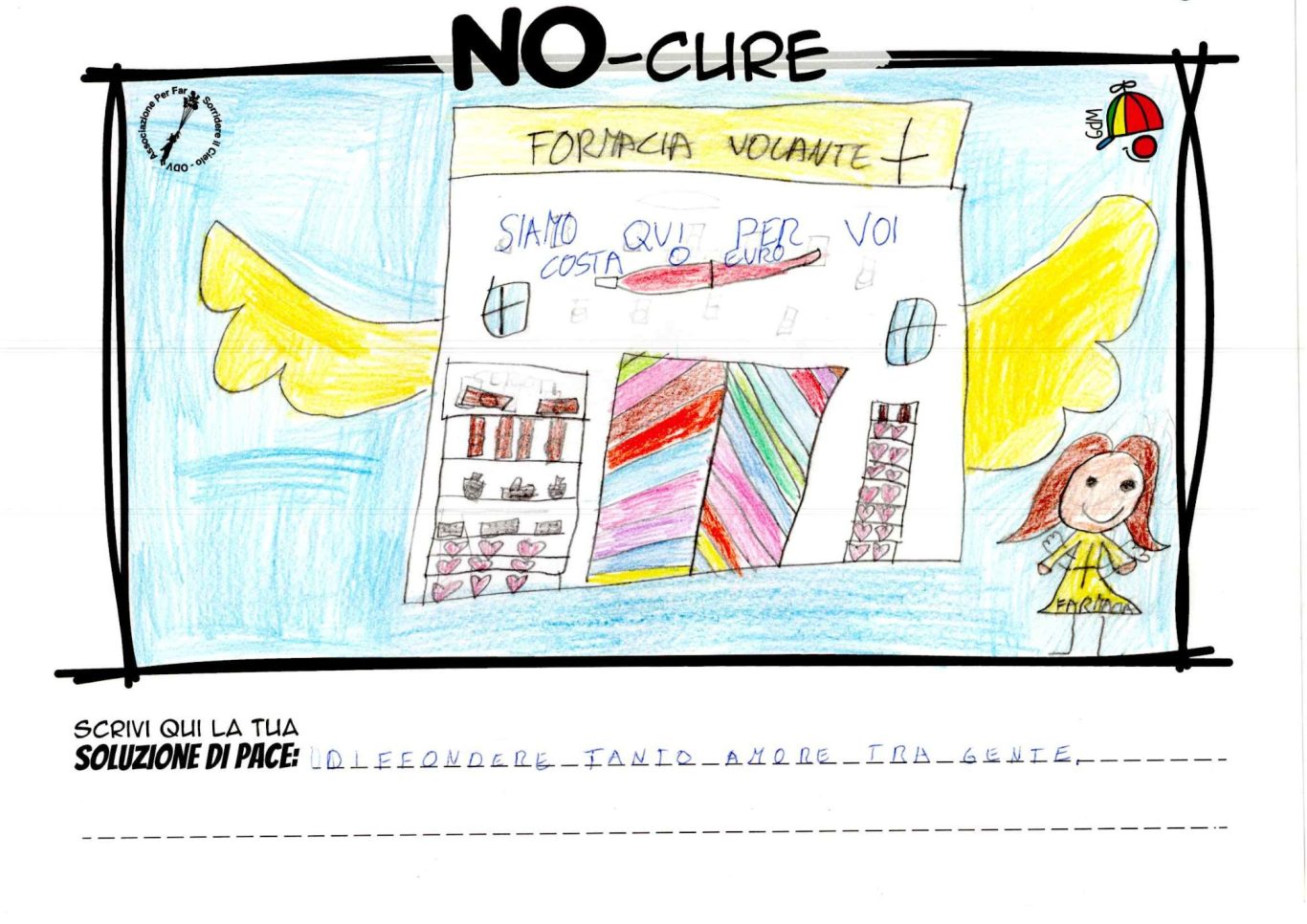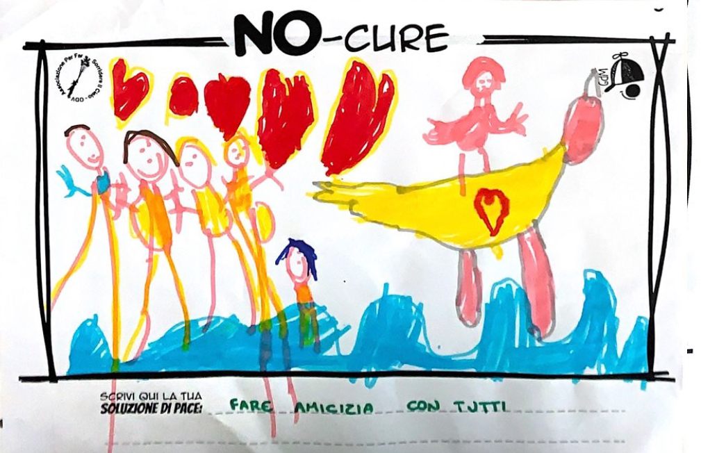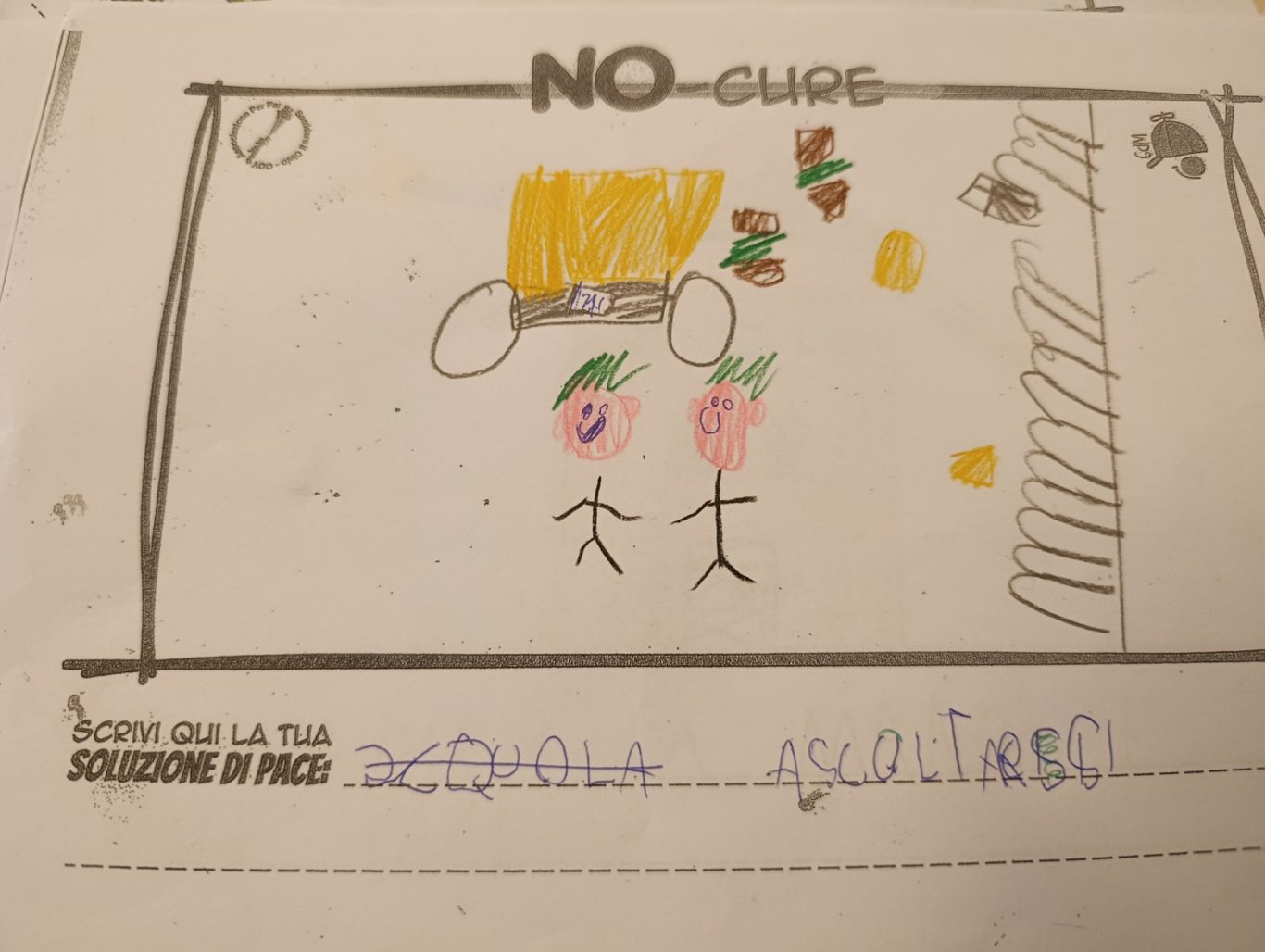 L’opera di sensibilizzazione si si esprime concretamente con la creazione di un DISEGNO DELLA MERAVIGLIA che andrà ad aiutare una delle 12 fatiche. Allo stesso modo chiederemo a tutti i partecipanti di andare a scrivere una “Soluzione di Pace” che possa aiutare anch’essa una delle 12 fatiche dei Bambini della guerra.