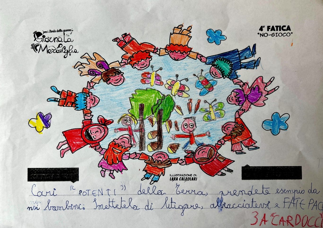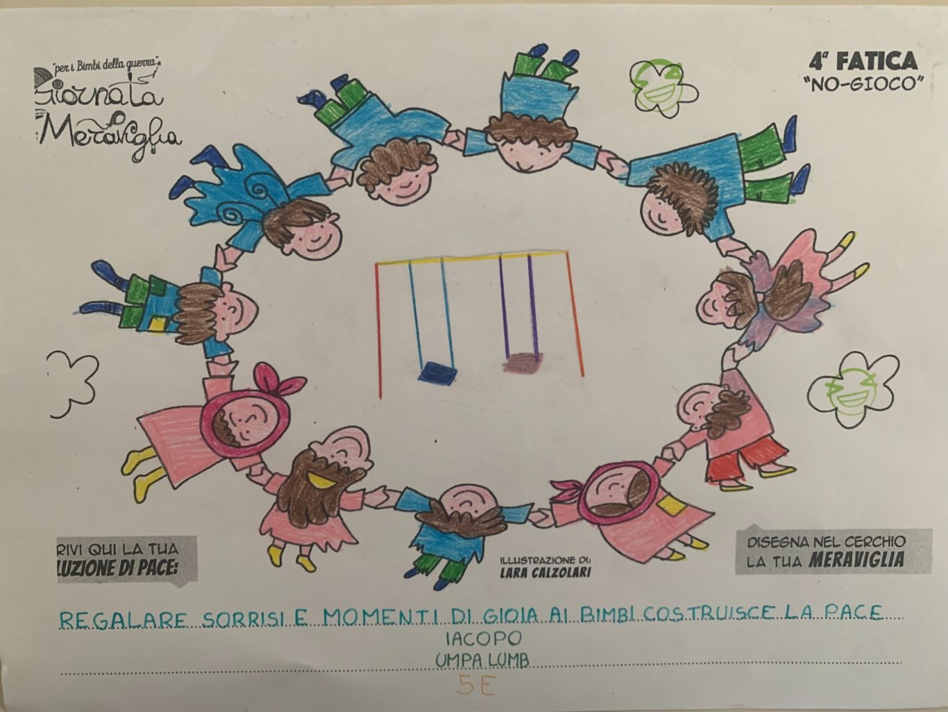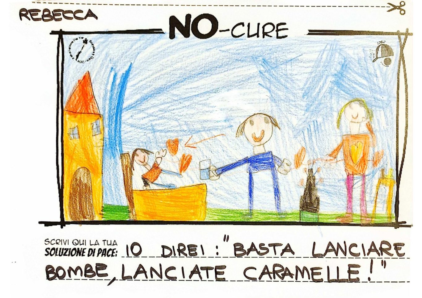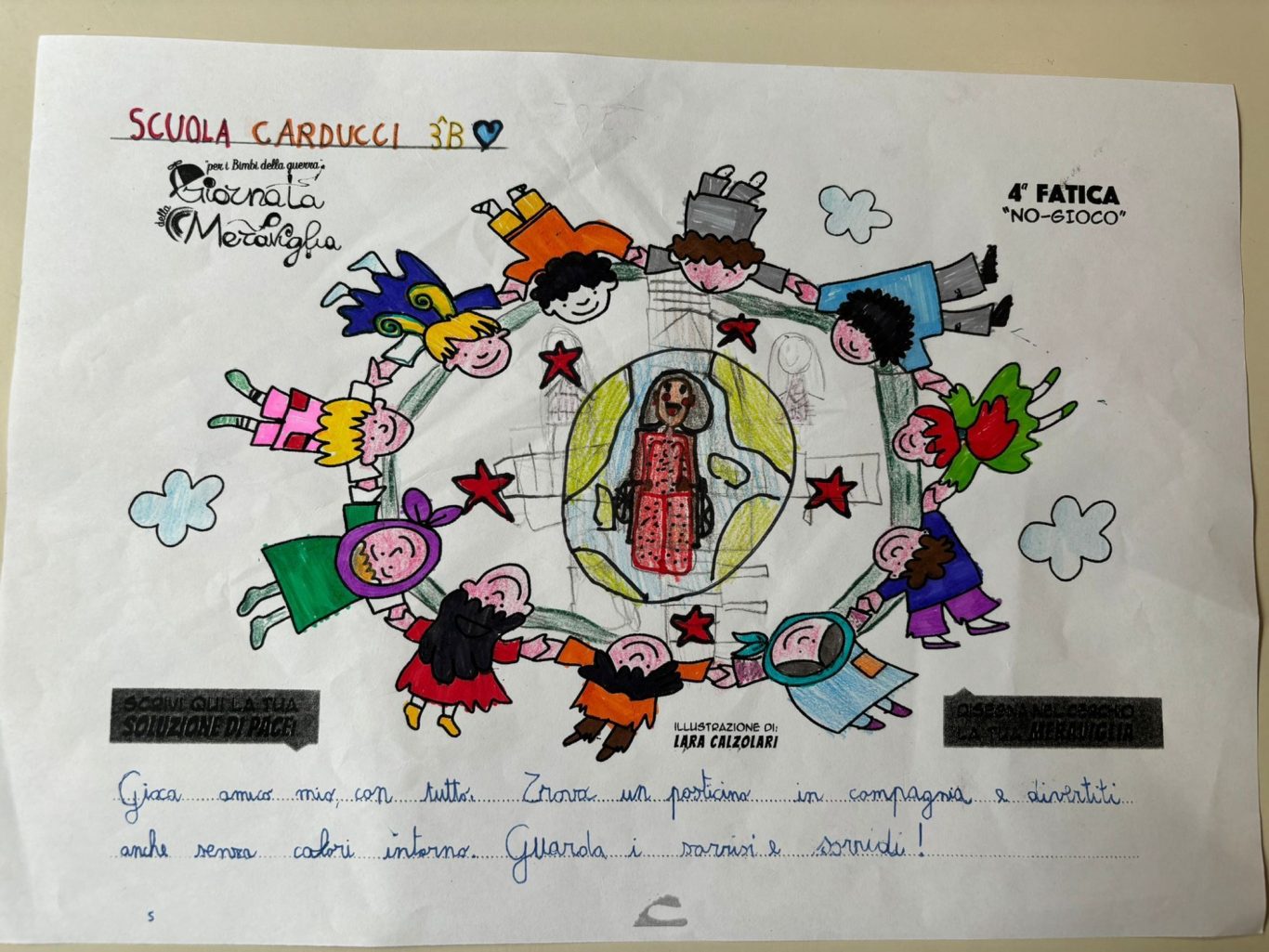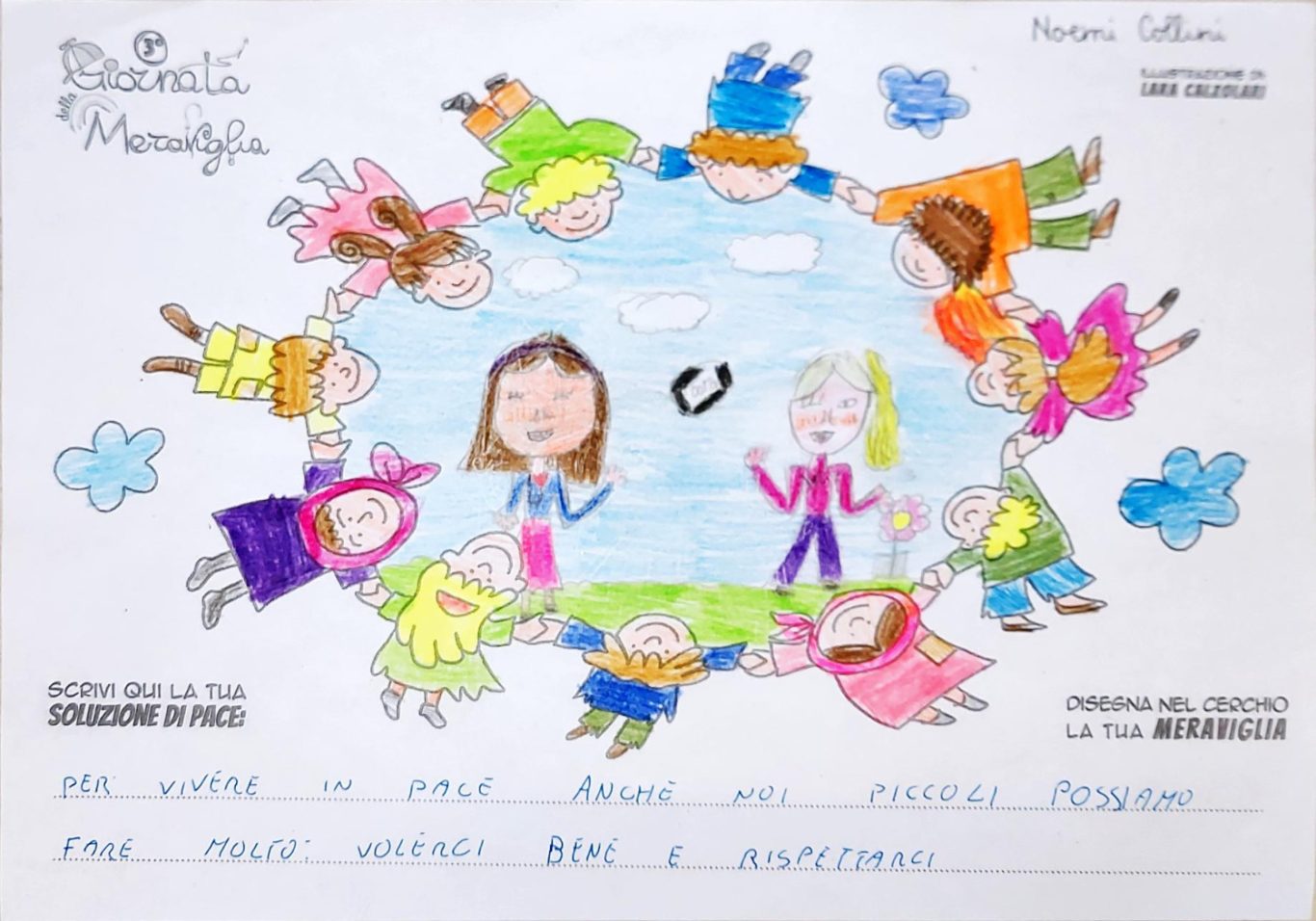 L’opera di sensibilizzazione si si esprime concretamente con la creazione di un DISEGNO DELLA MERAVIGLIA che andrà ad aiutare una delle 12 fatiche. Allo stesso modo chiederemo a tutti i partecipanti di andare a scrivere una “Soluzione di Pace” che possa aiutare anch’essa una delle 12 fatiche dei Bambini della guerra.