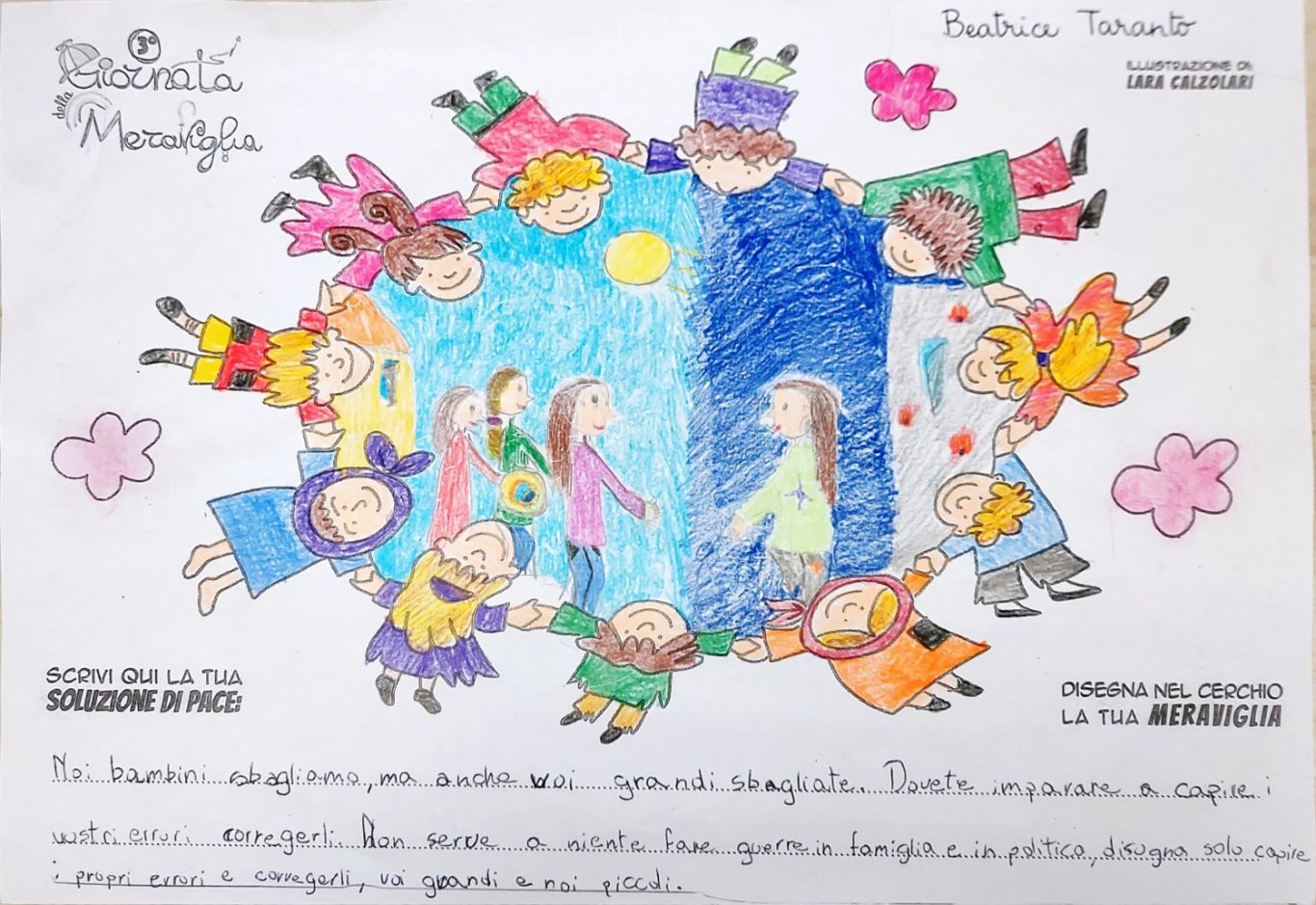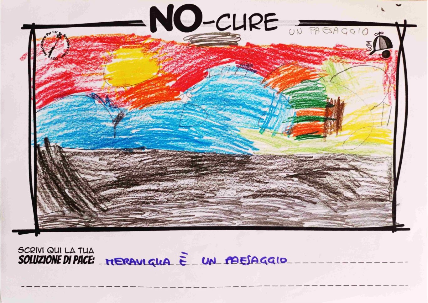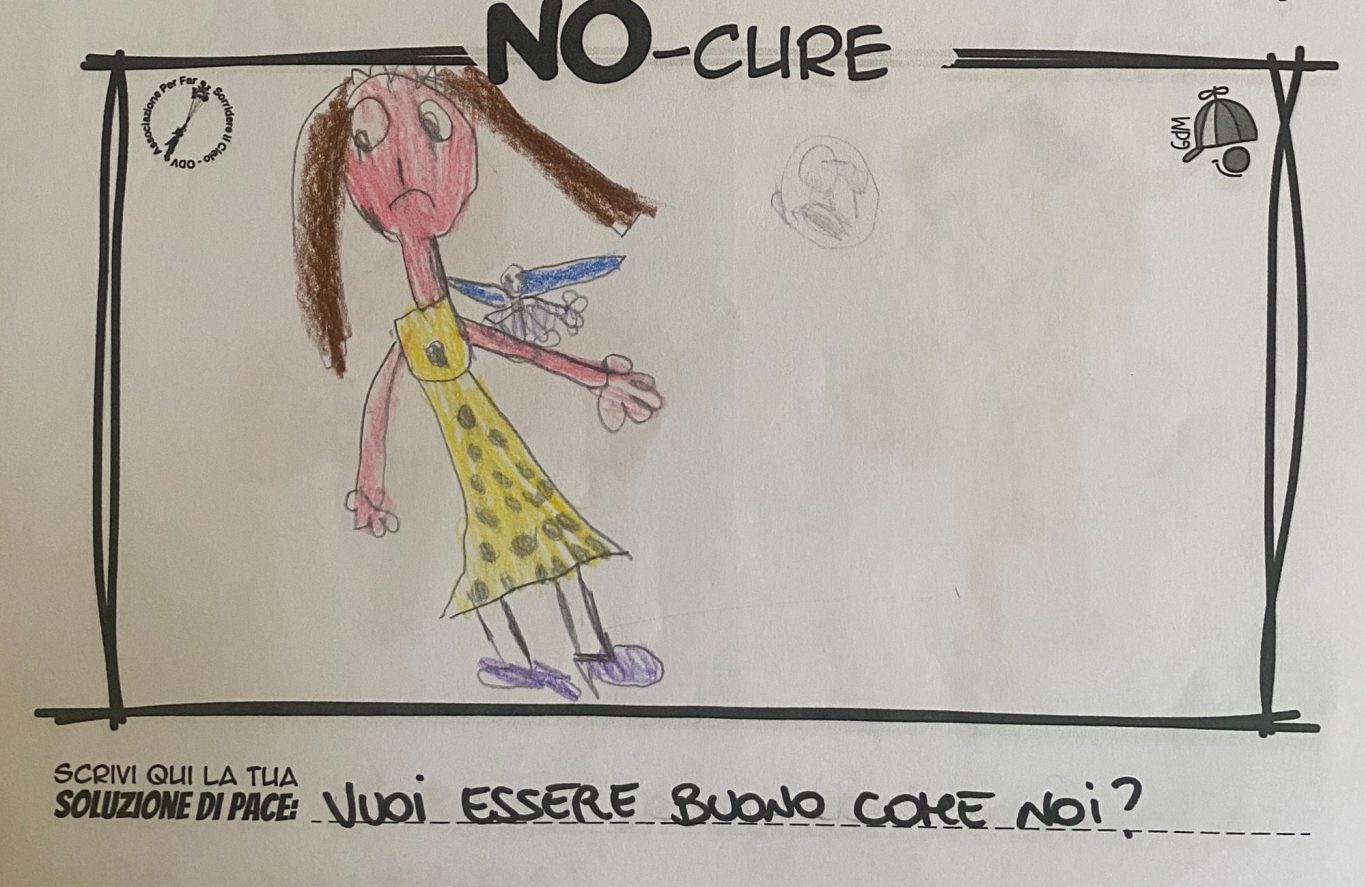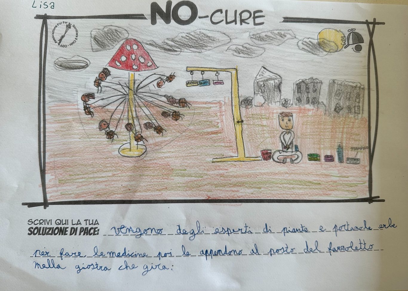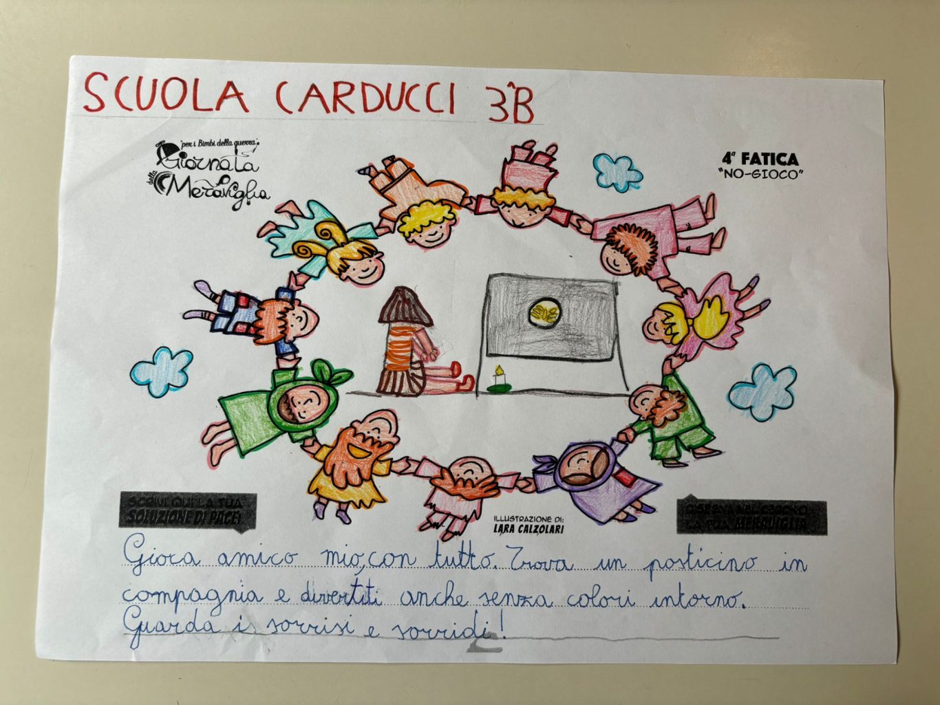L’opera di sensibilizzazione si si esprime concretamente con la creazione di un DISEGNO DELLA MERAVIGLIA che andrà ad aiutare una delle 12 fatiche. Allo stesso modo chiederemo a tutti i partecipanti di andare a scrivere una “Soluzione di Pace” che possa aiutare anch’essa una delle 12 fatiche dei Bambini della guerra.