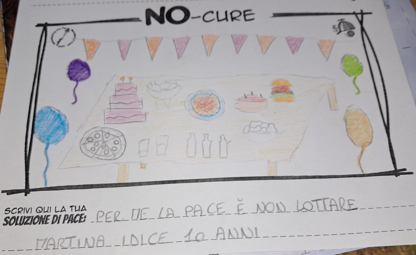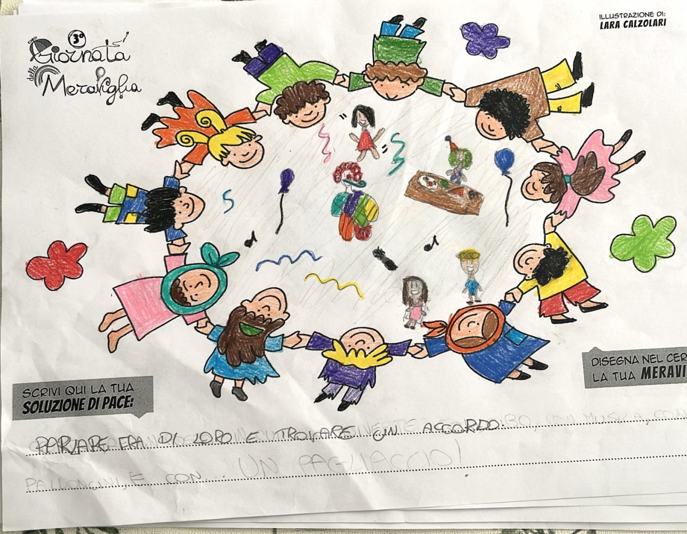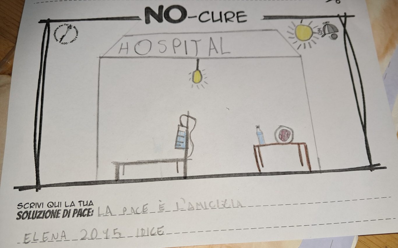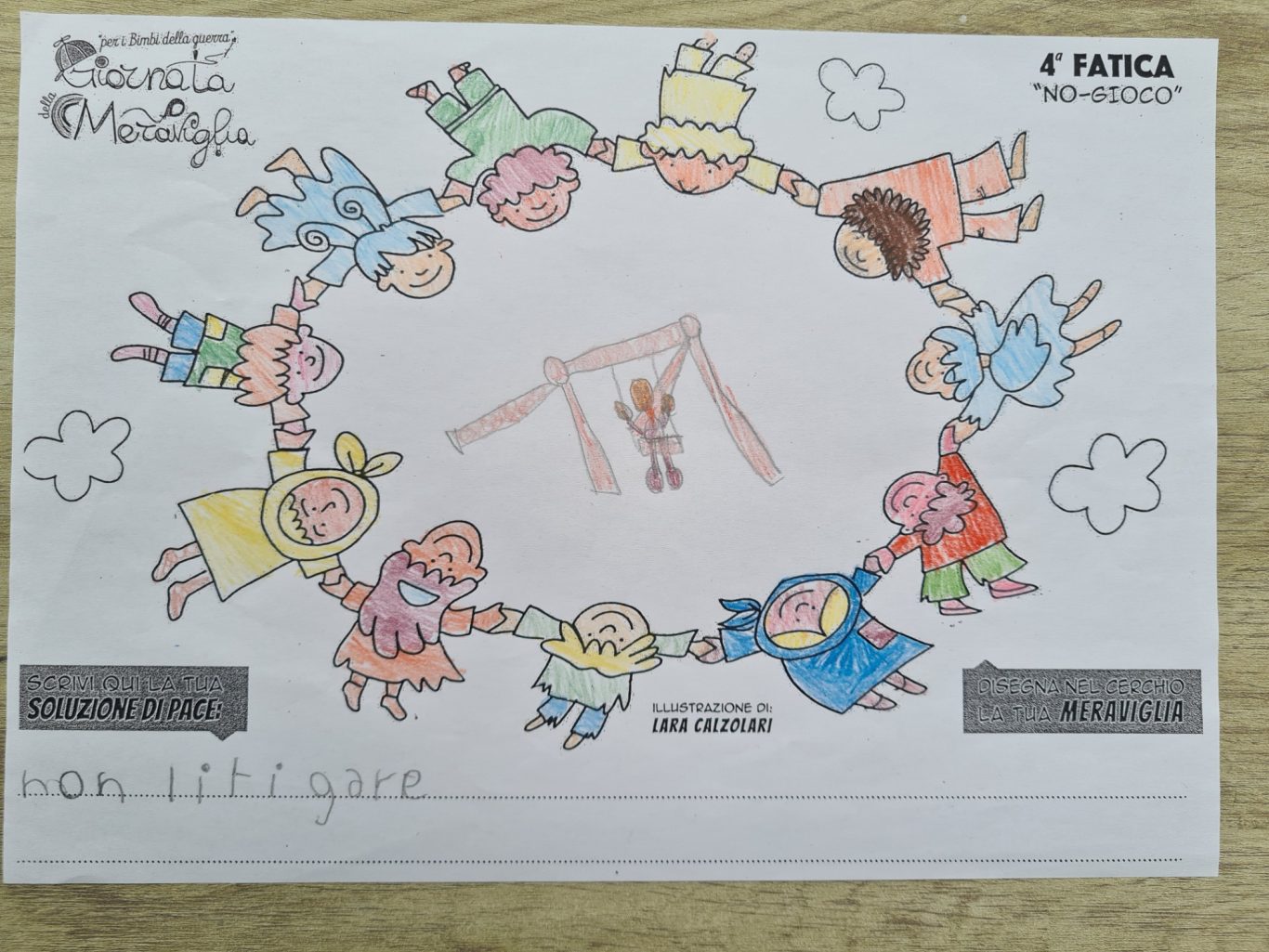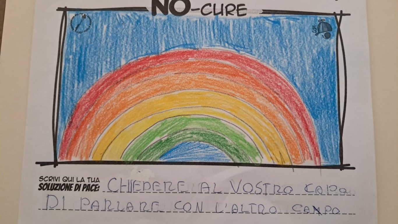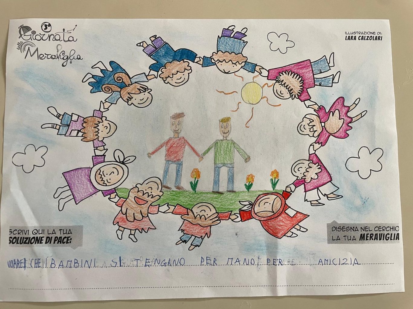 L’opera di sensibilizzazione si si esprime concretamente con la creazione di un DISEGNO DELLA MERAVIGLIA che andrà ad aiutare una delle 12 fatiche. Allo stesso modo chiederemo a tutti i partecipanti di andare a scrivere una “Soluzione di Pace” che possa aiutare anch’essa una delle 12 fatiche dei Bambini della guerra.